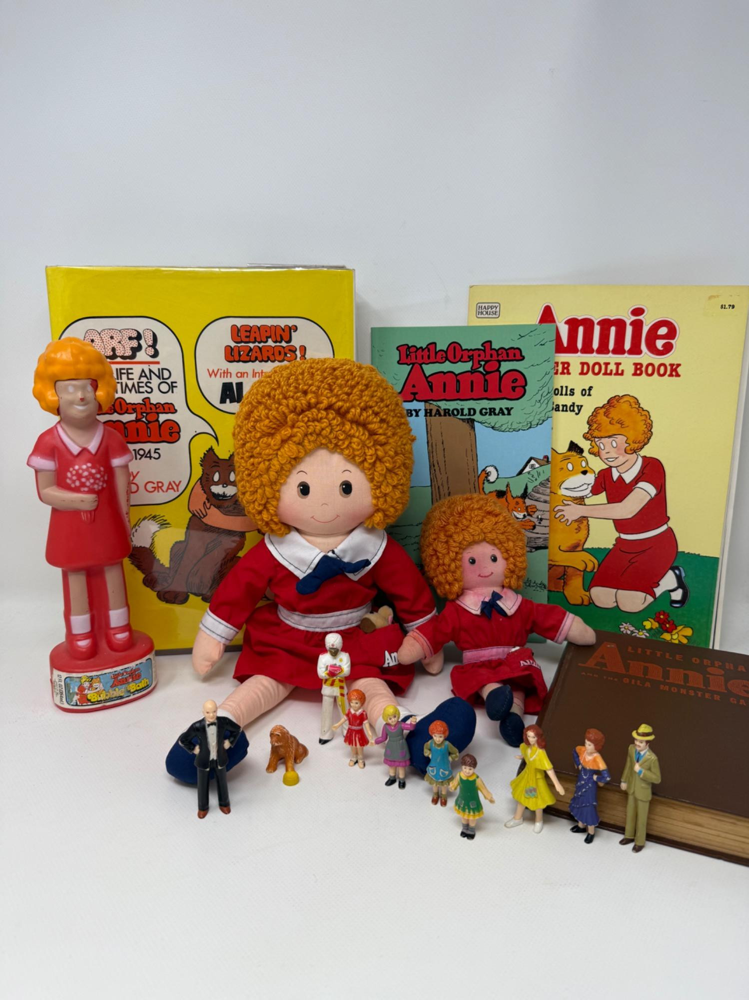 Orphan Annie Memorabilia-Dolls, Figurines and Vintage Reads. Bubble bath bottle, rag dolls, books and miniatures