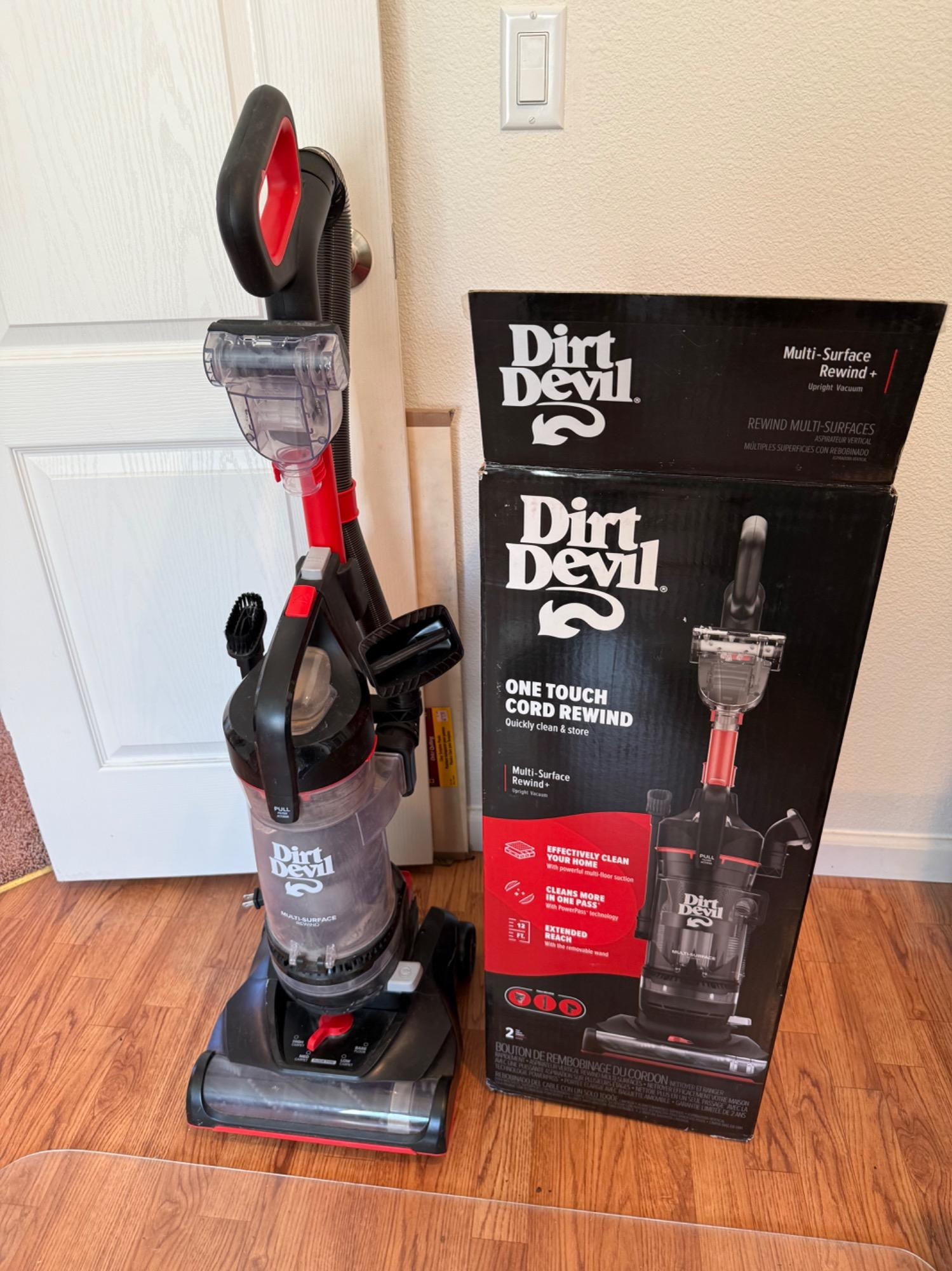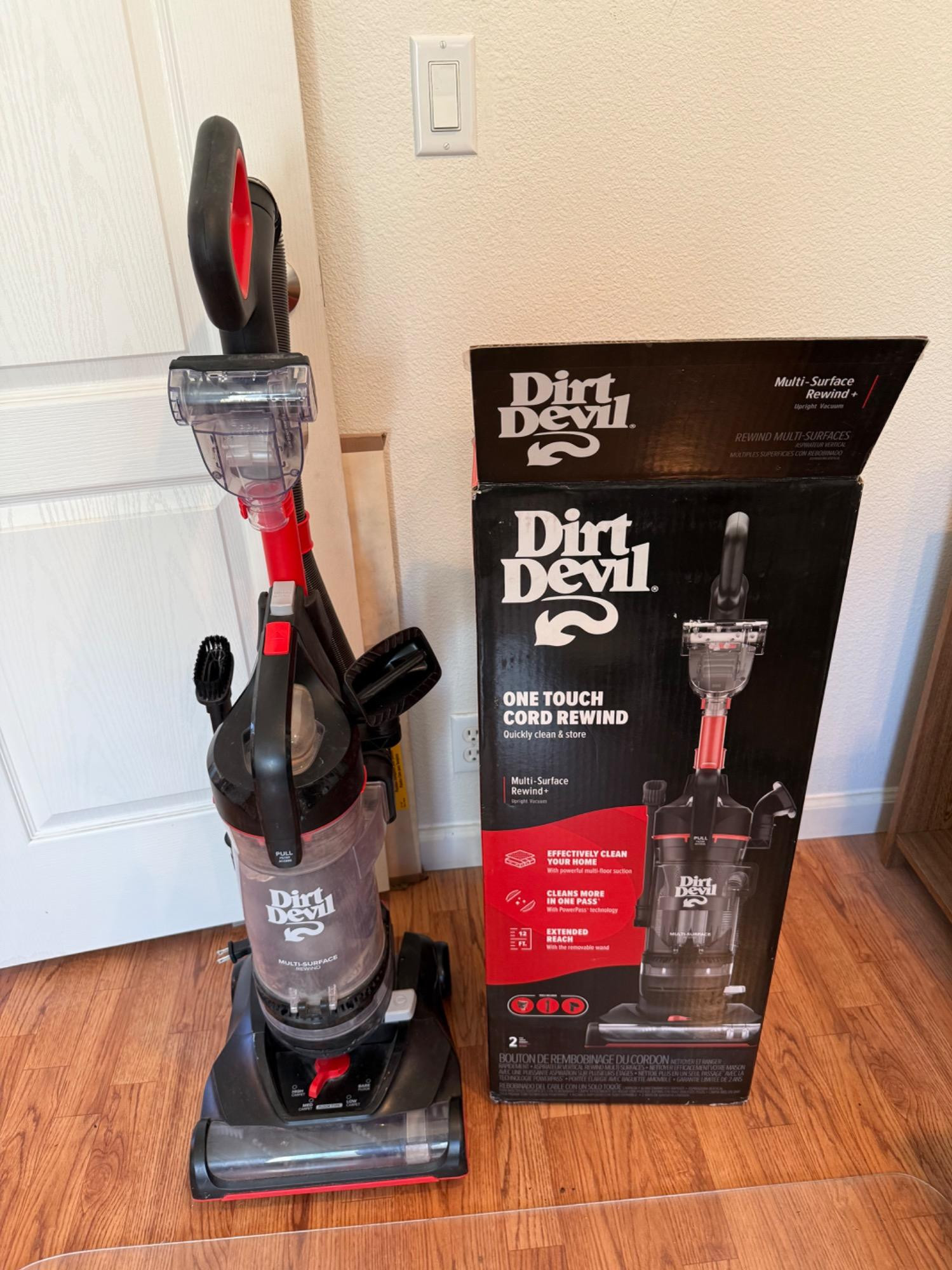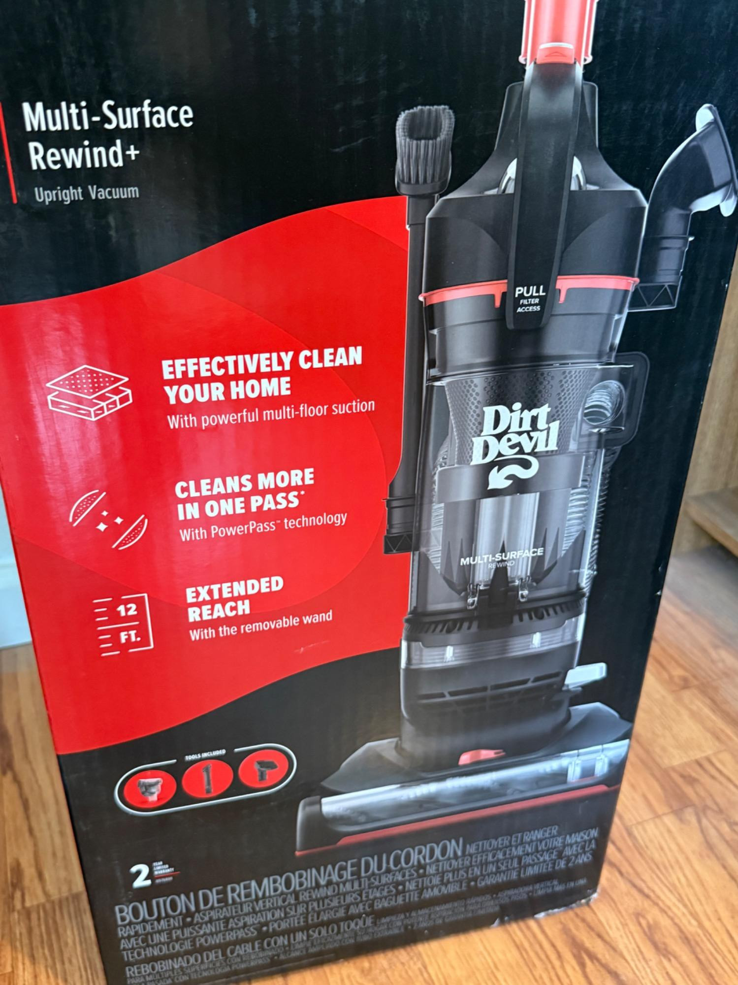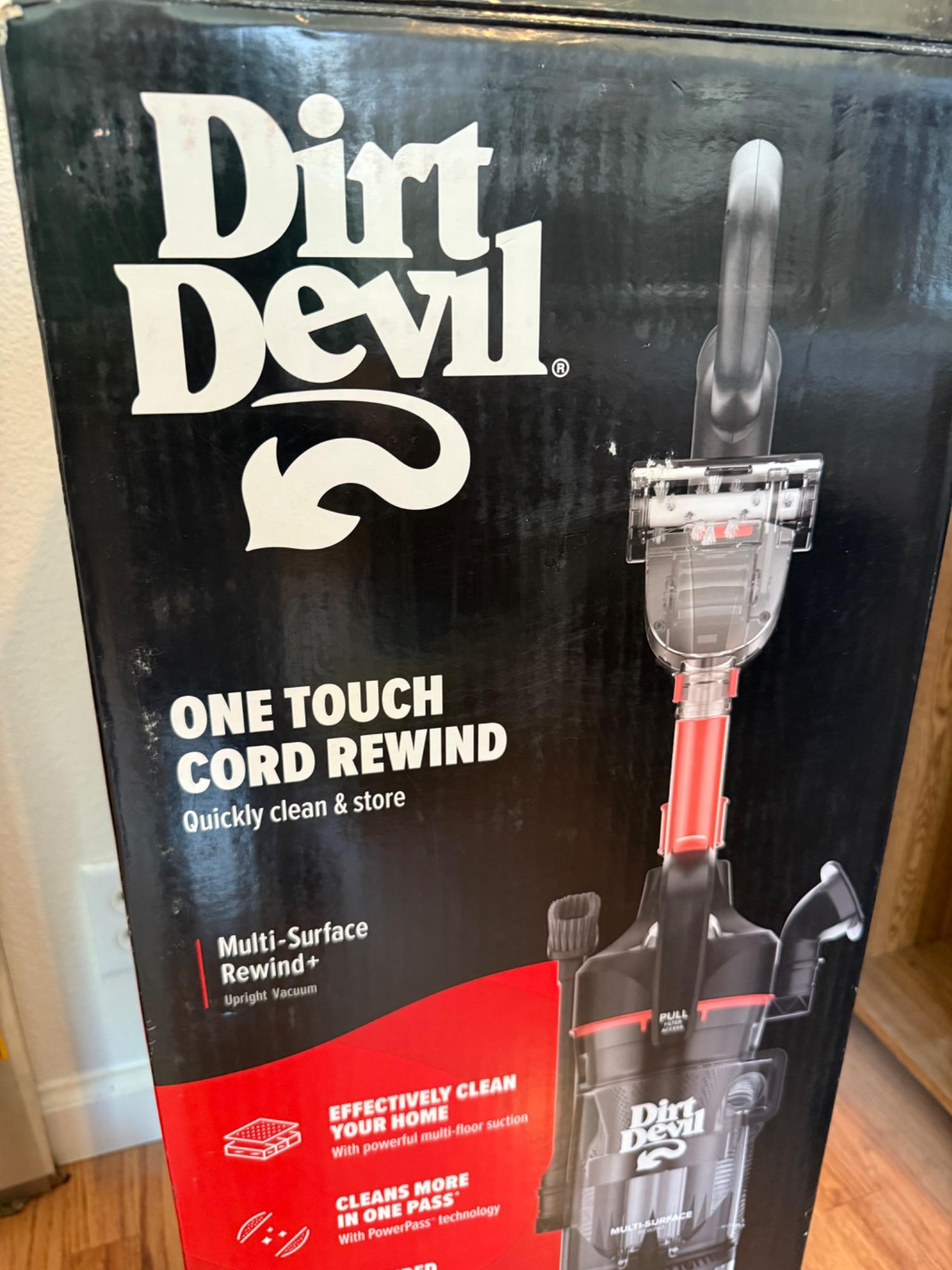 Newer Dirt Devil Vacuum With Original Box. One touch cord rewind. Multi surface feature. Hardly used. Stair and crevice attachments