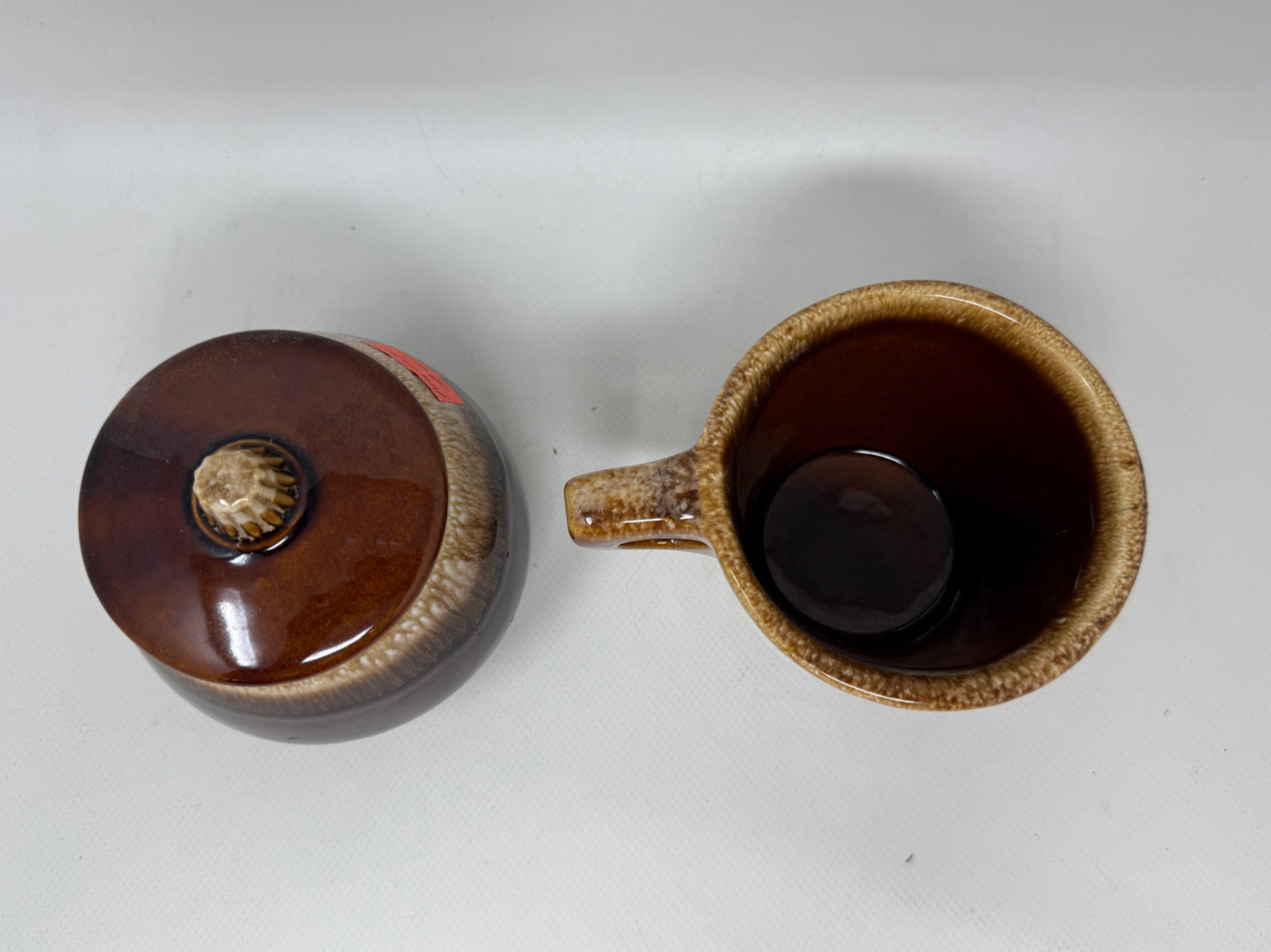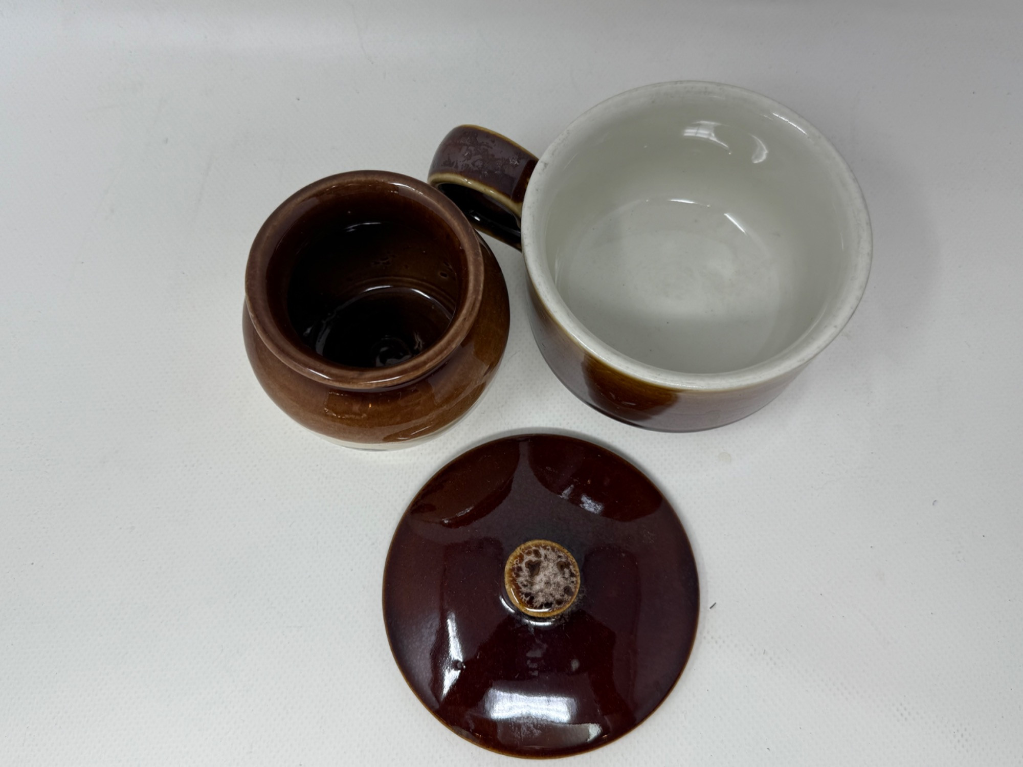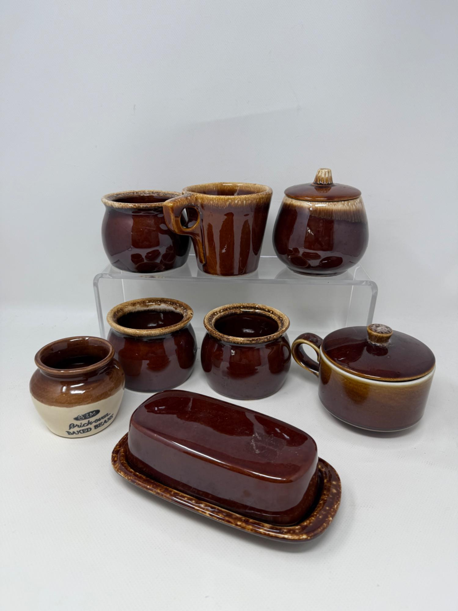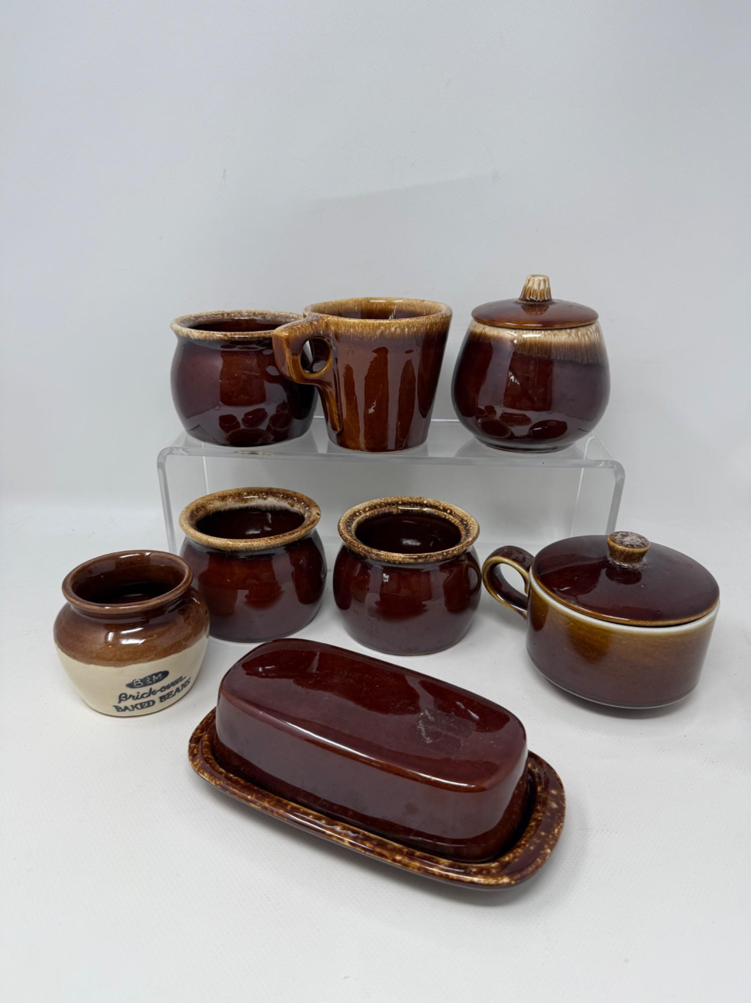 Hull and McCoy Vintage Pottery Dishes-Butter Dish, sugar bowl, mug, bean crock. Soup mug with lid. 3 matching crocks