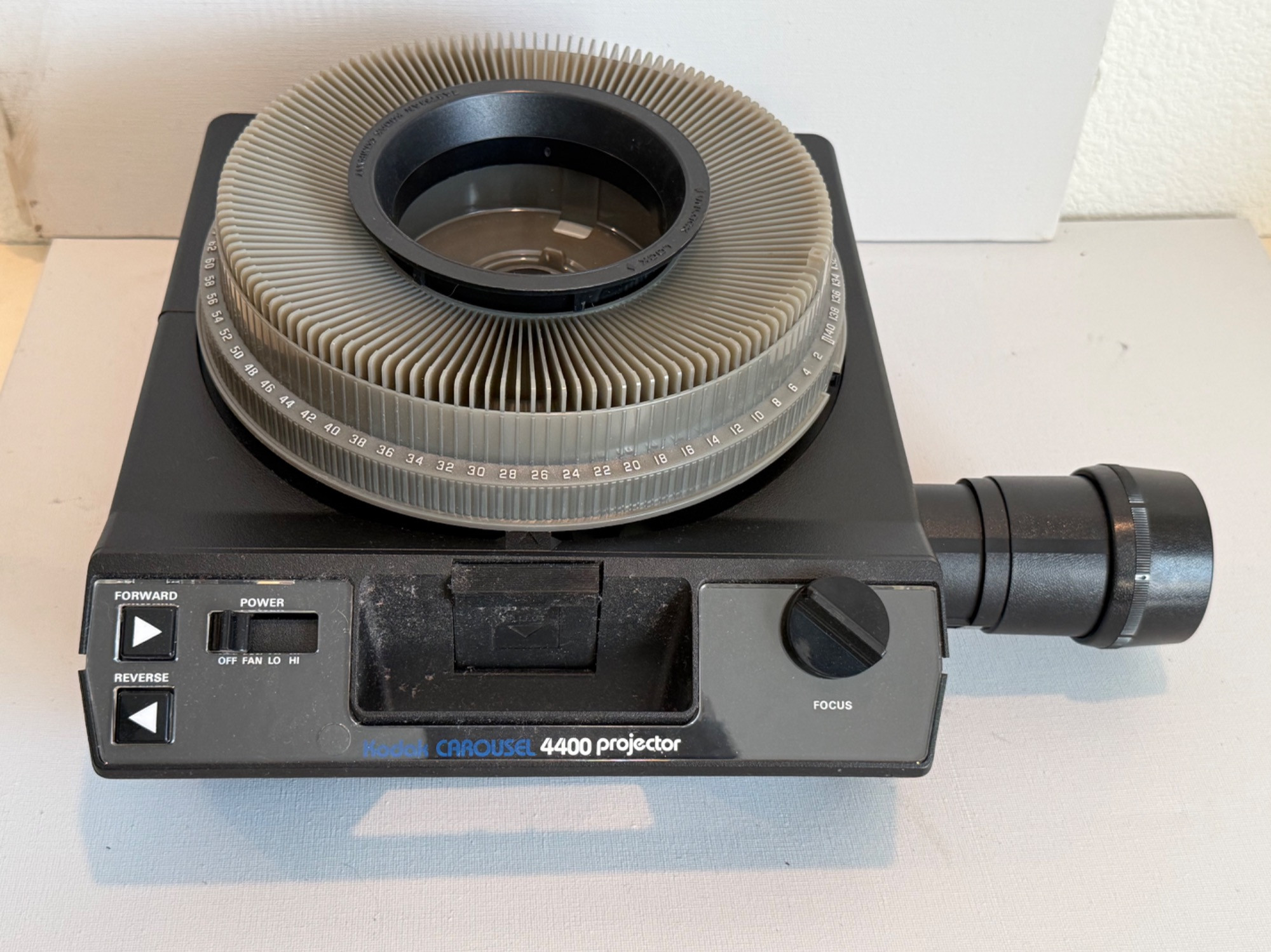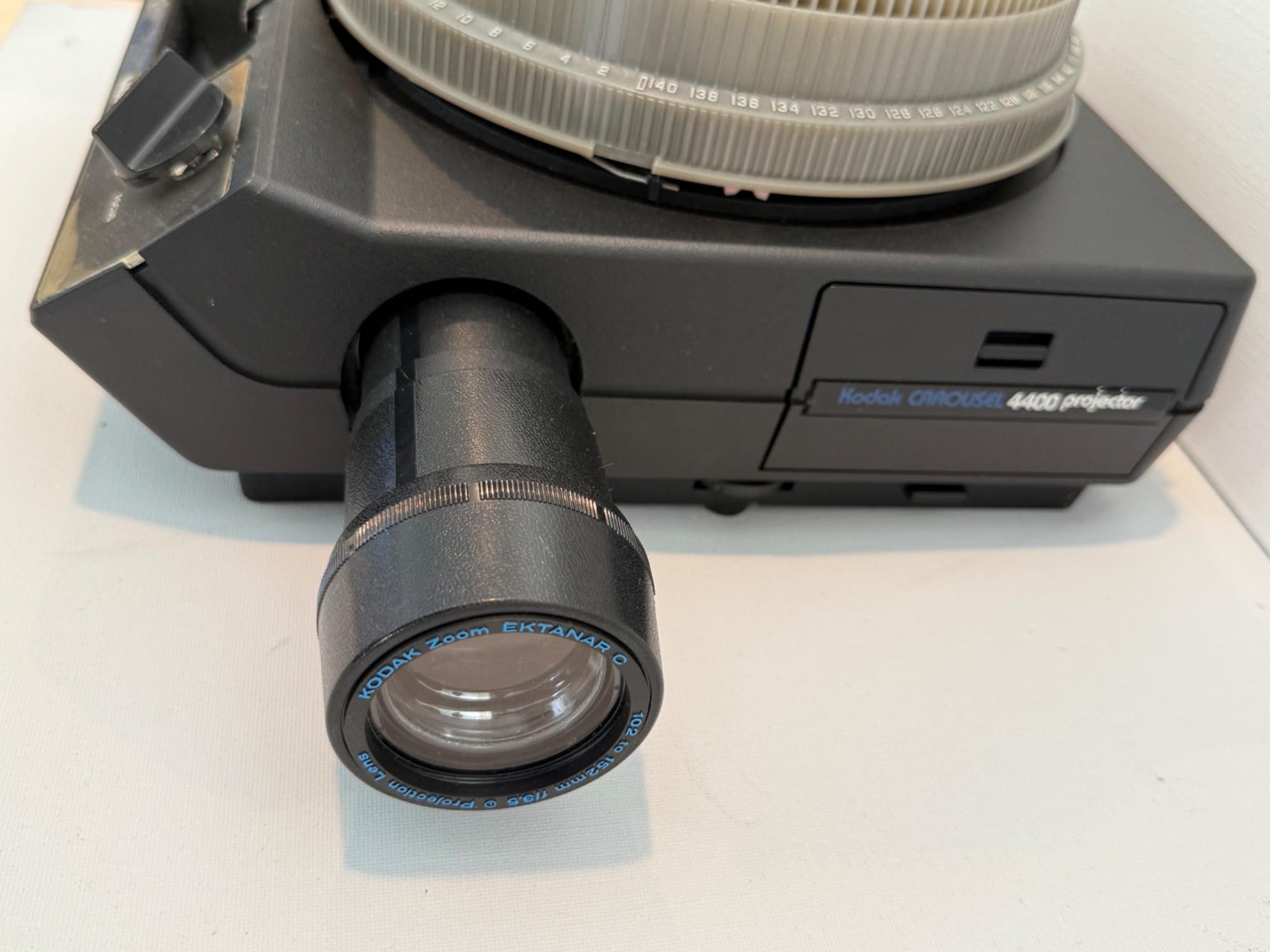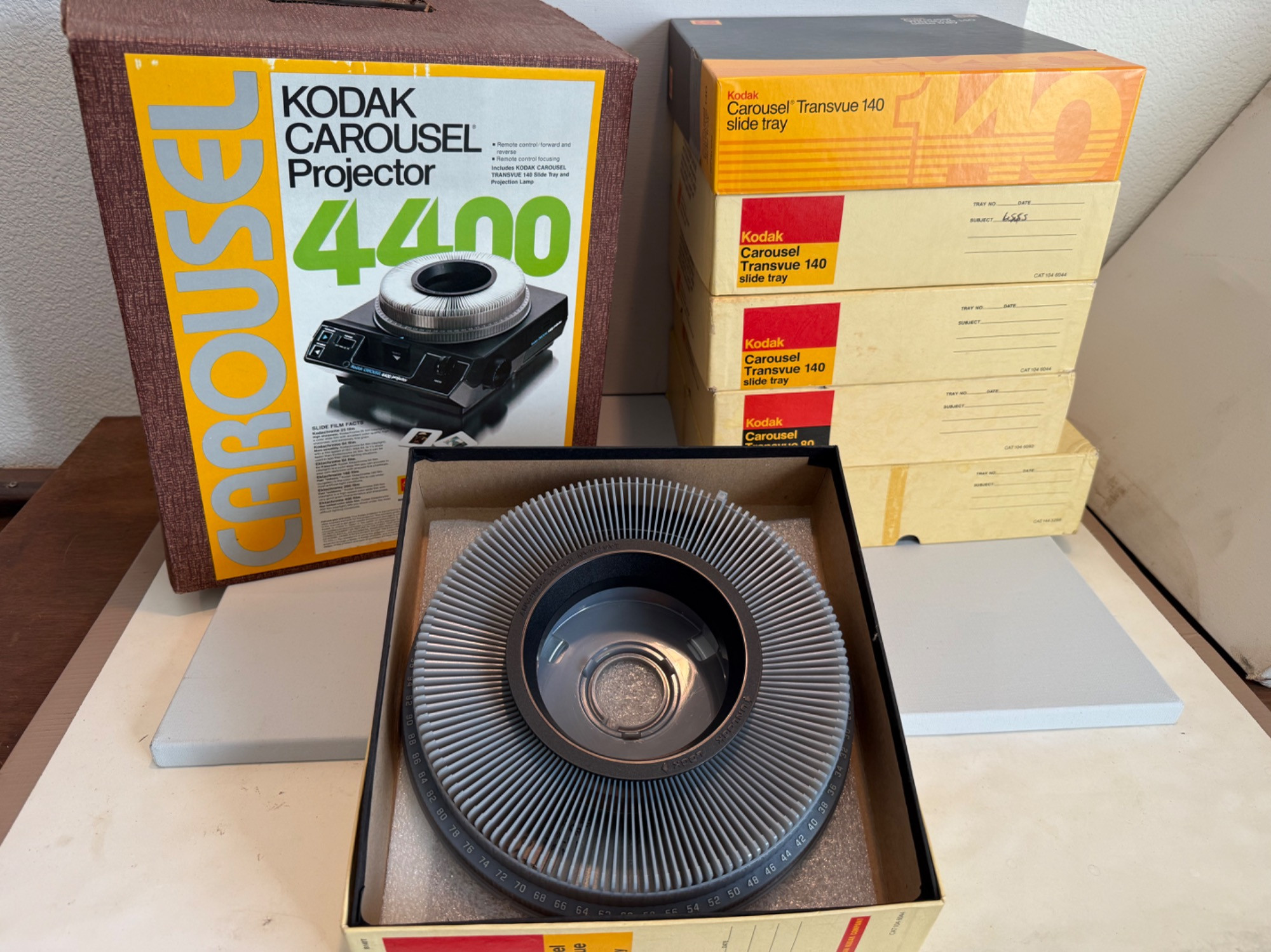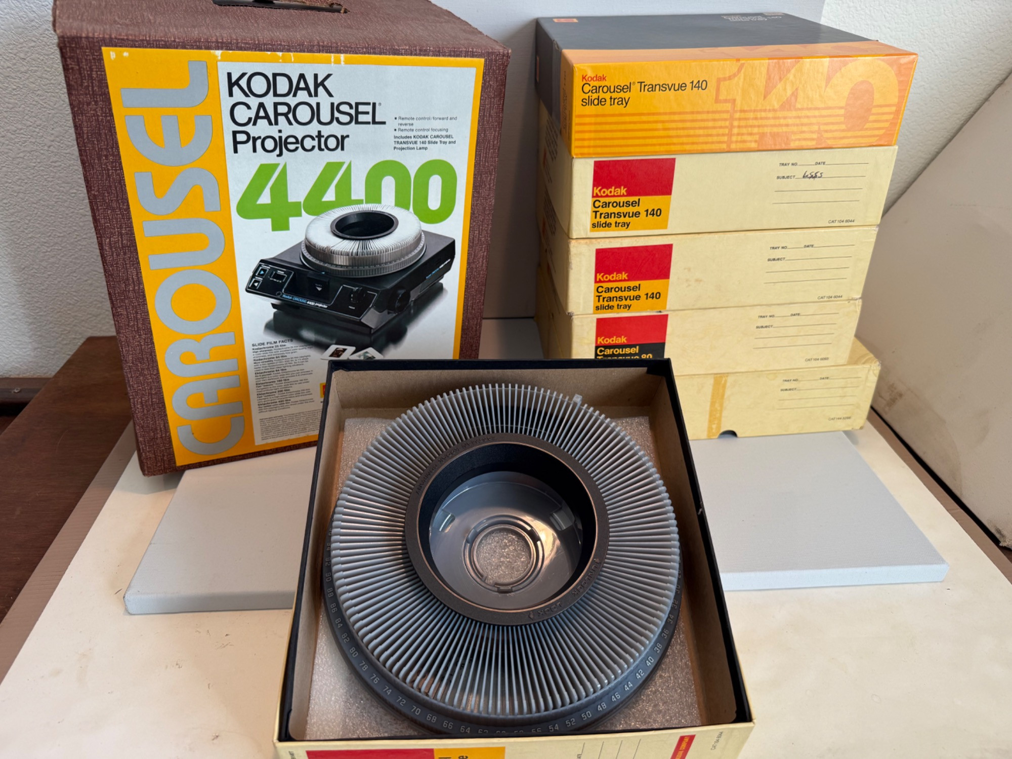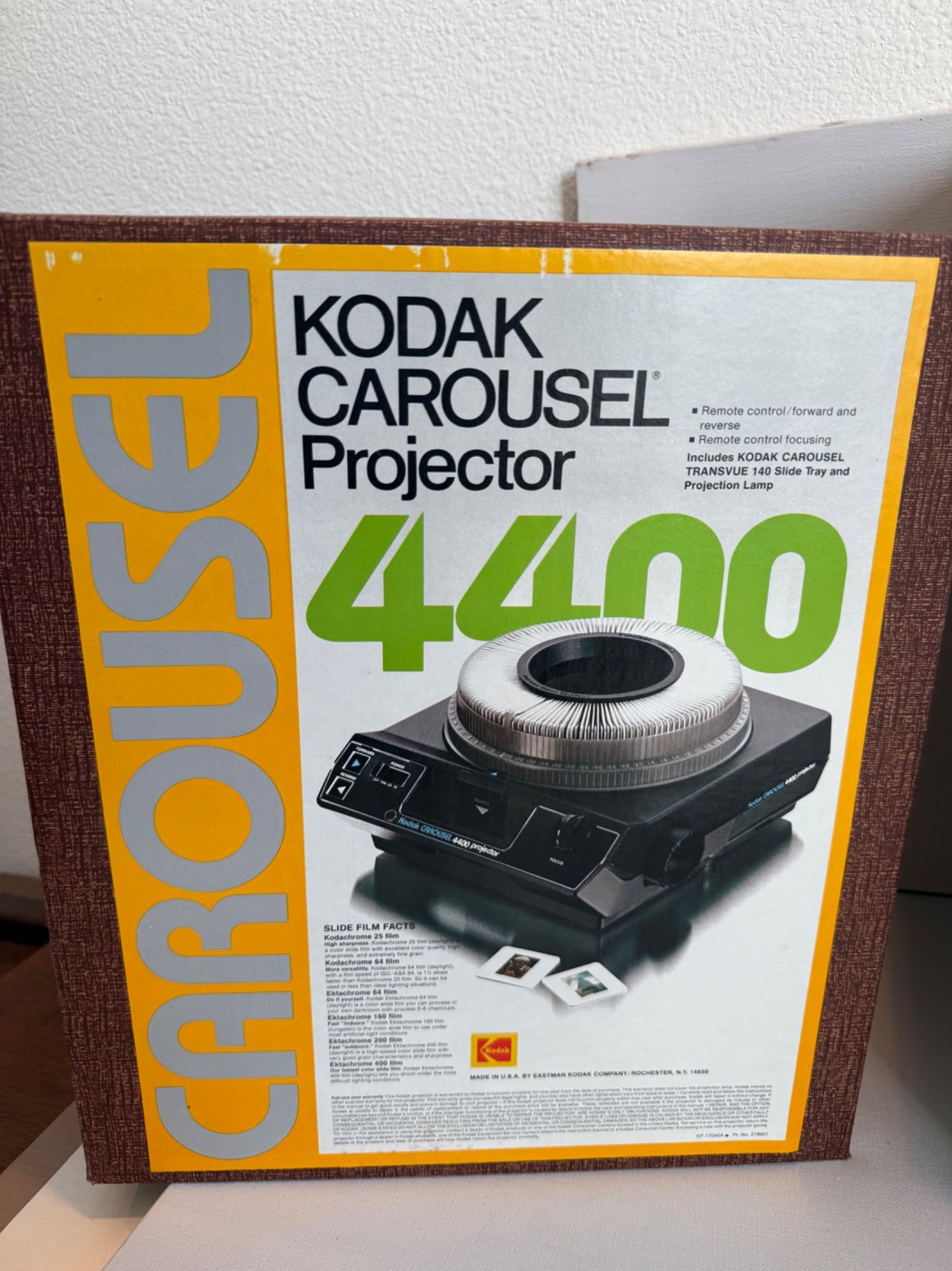Kodak Carousel Projector 4400. Powered up and has several features. Six extra carousel trays.