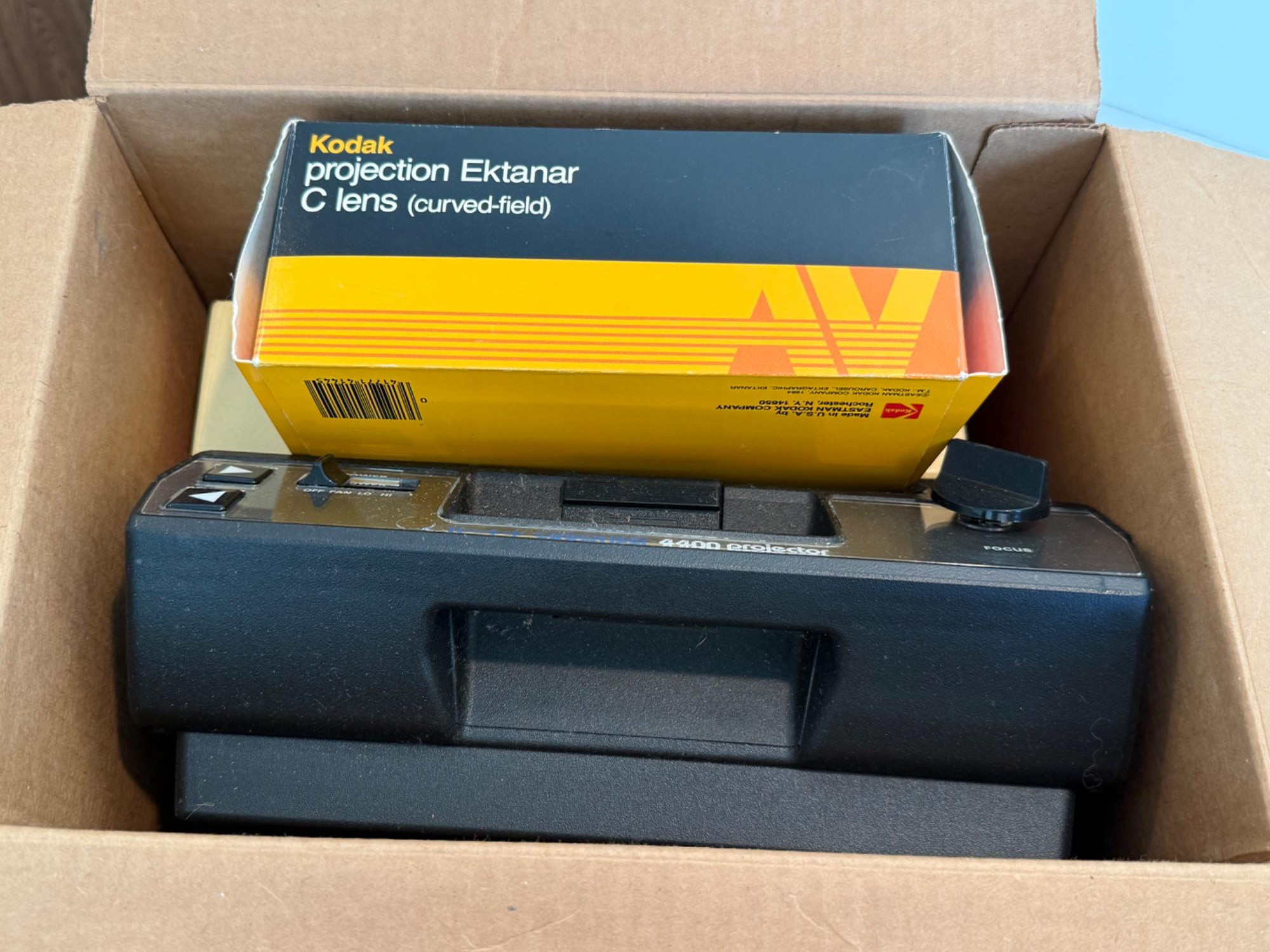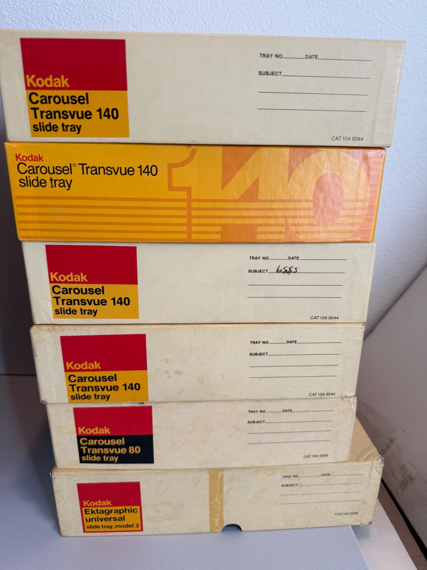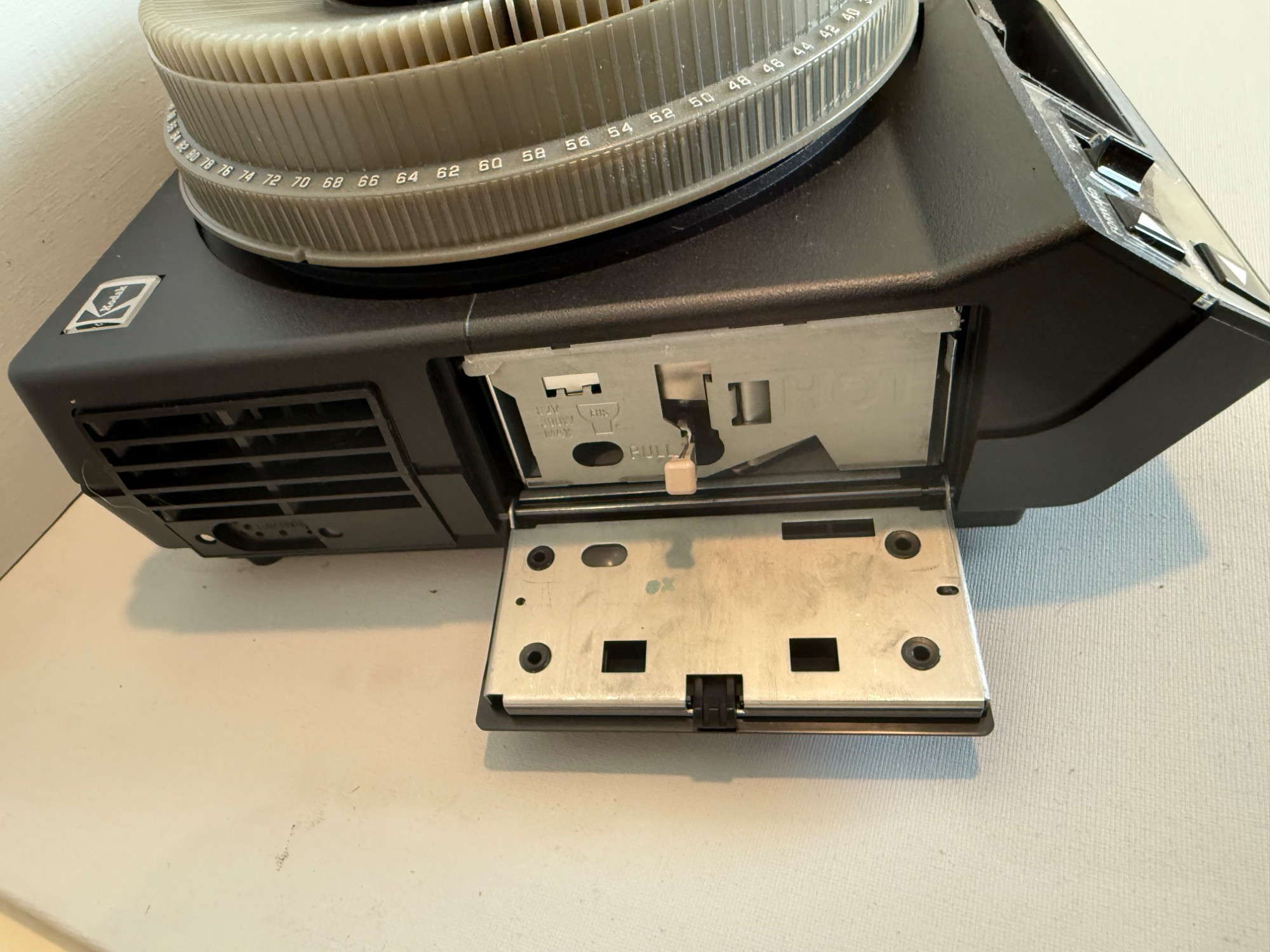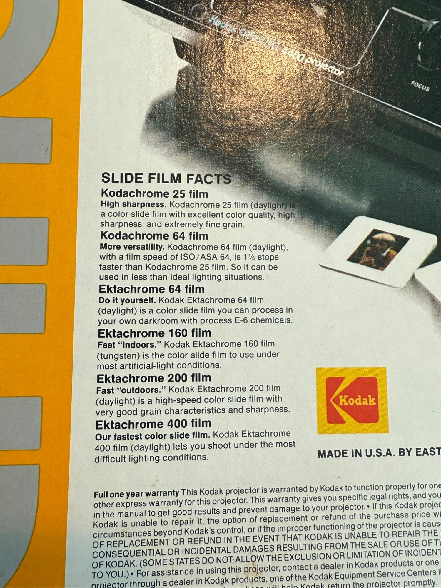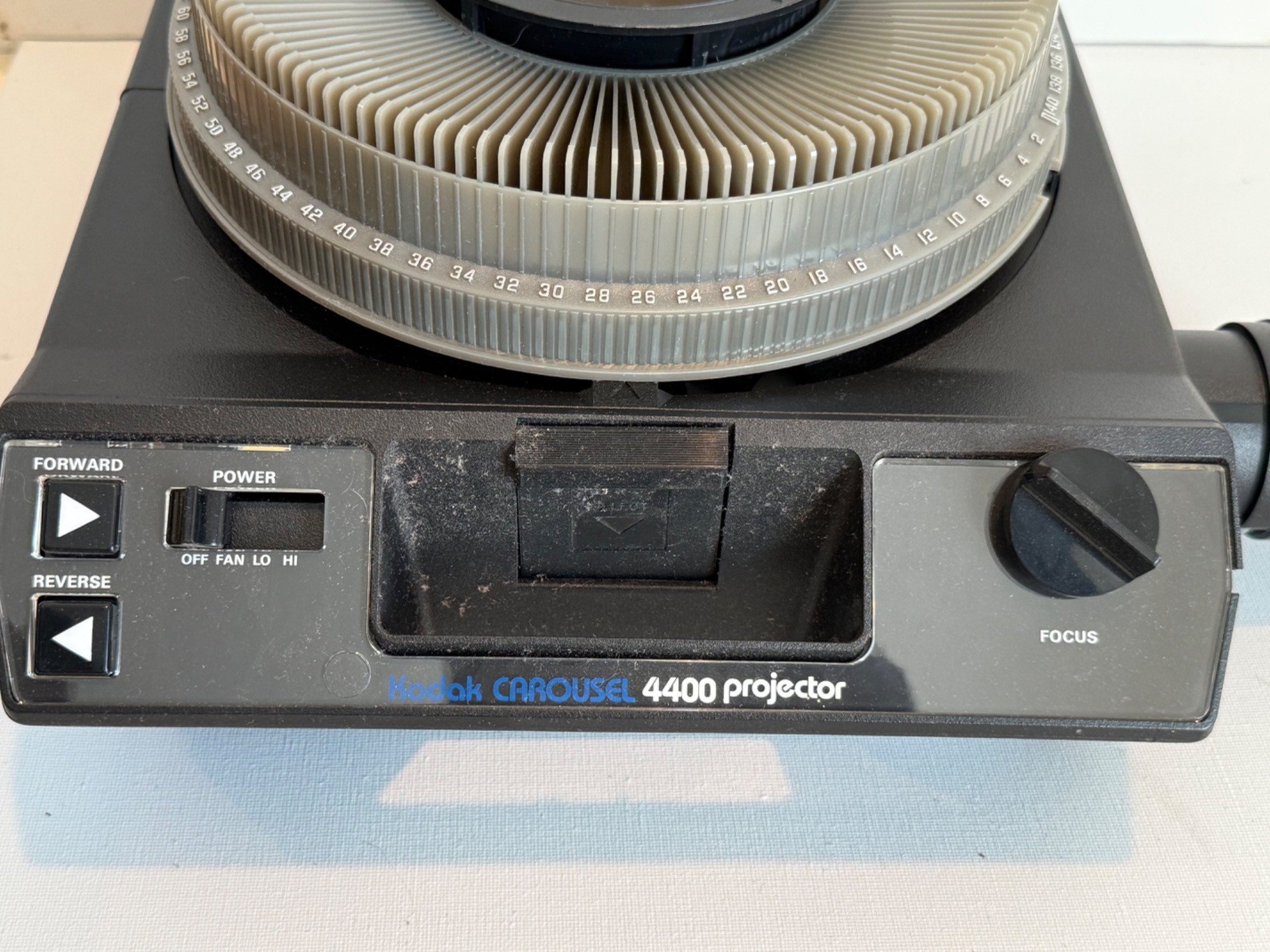 Kodak Carousel Projector 4400. Powered up and has several features. Six extra carousel trays.