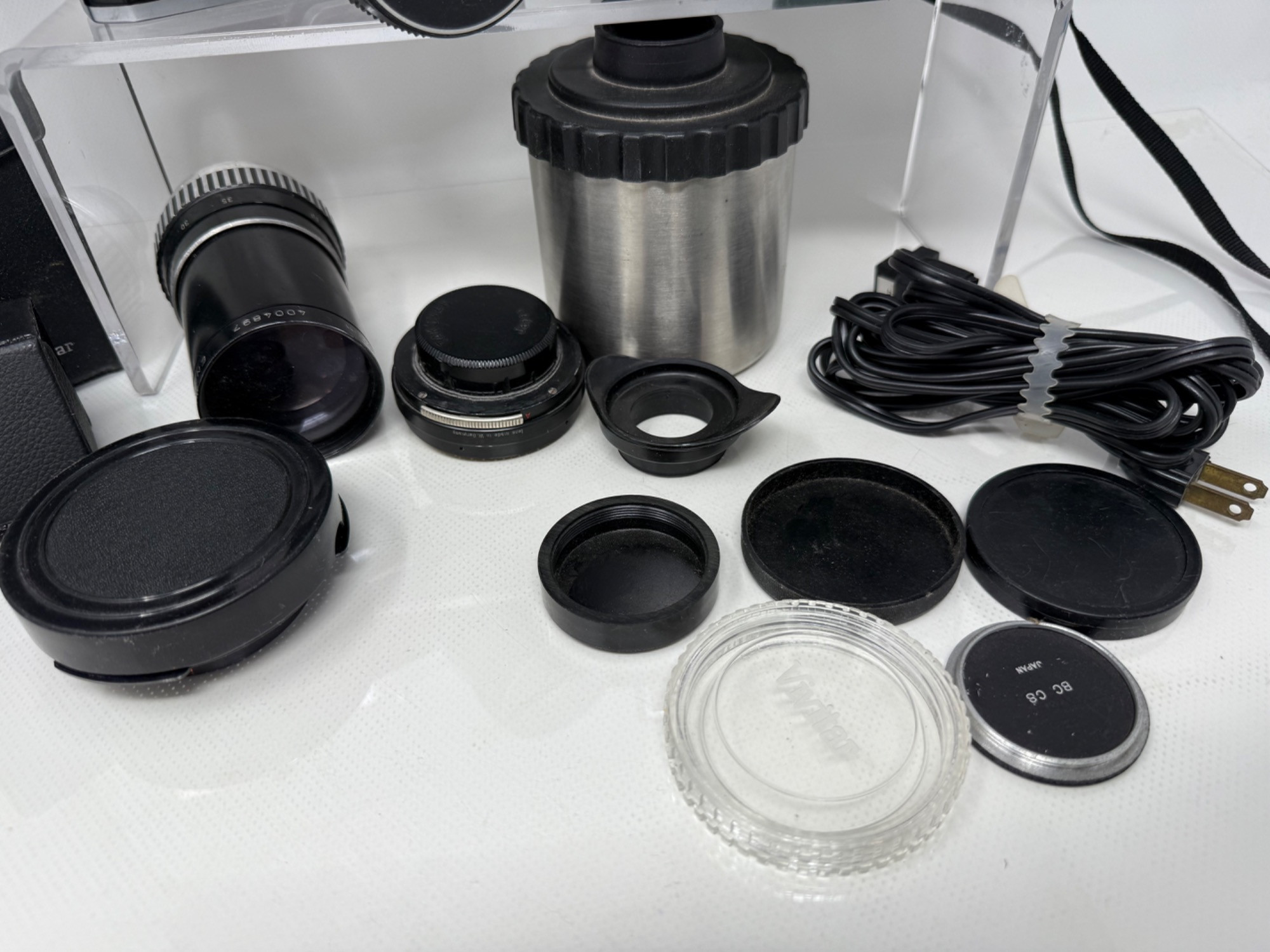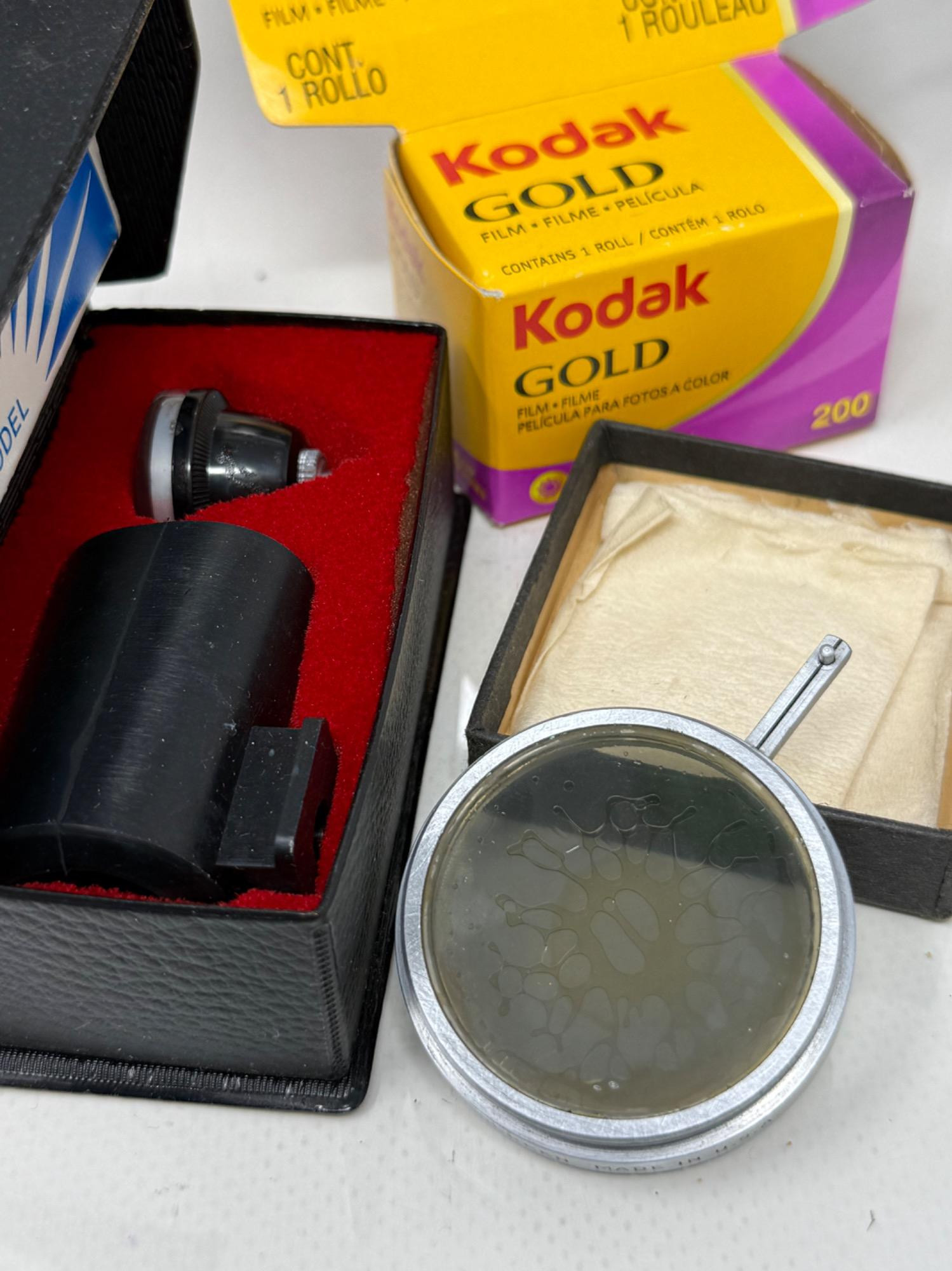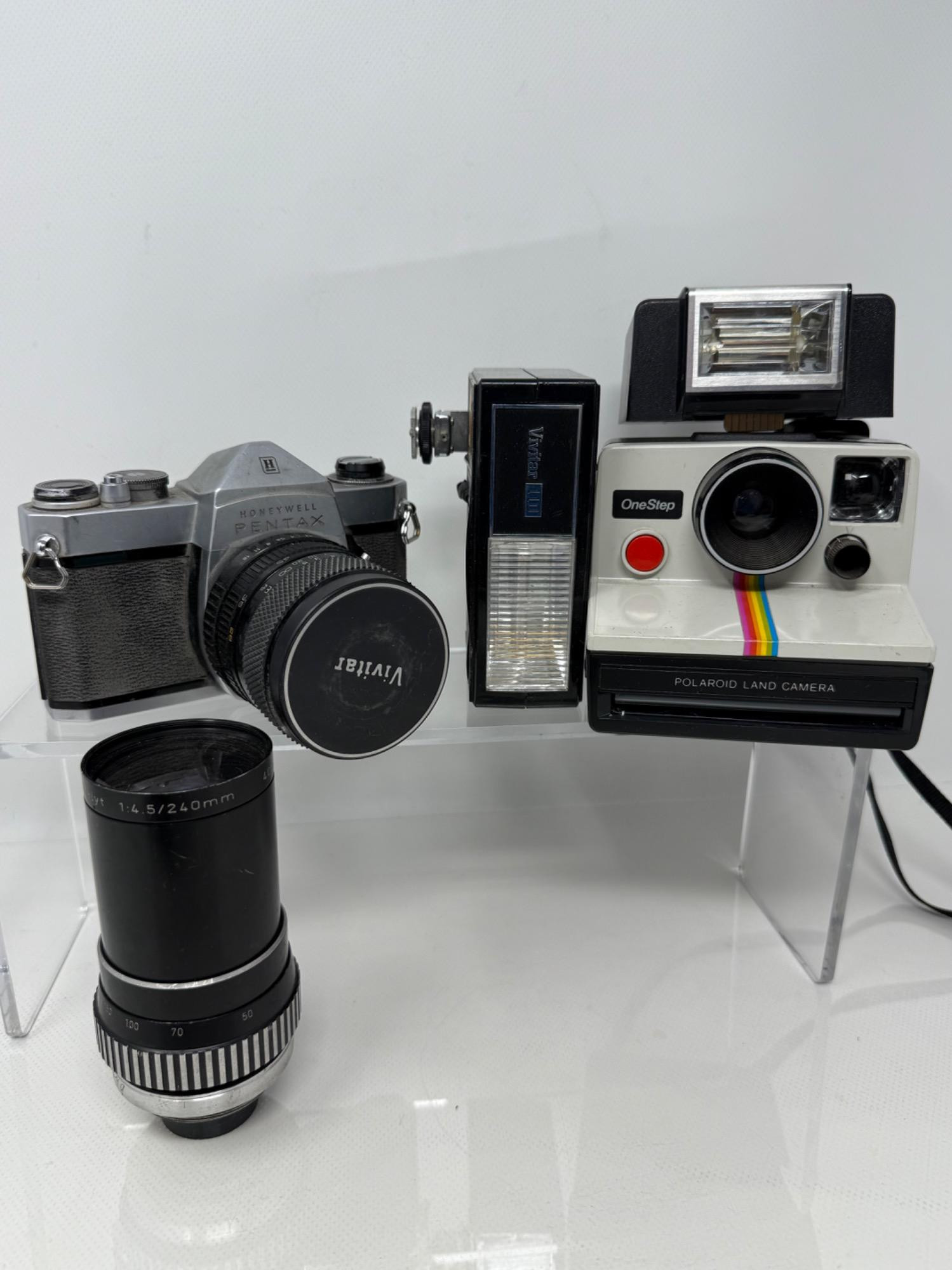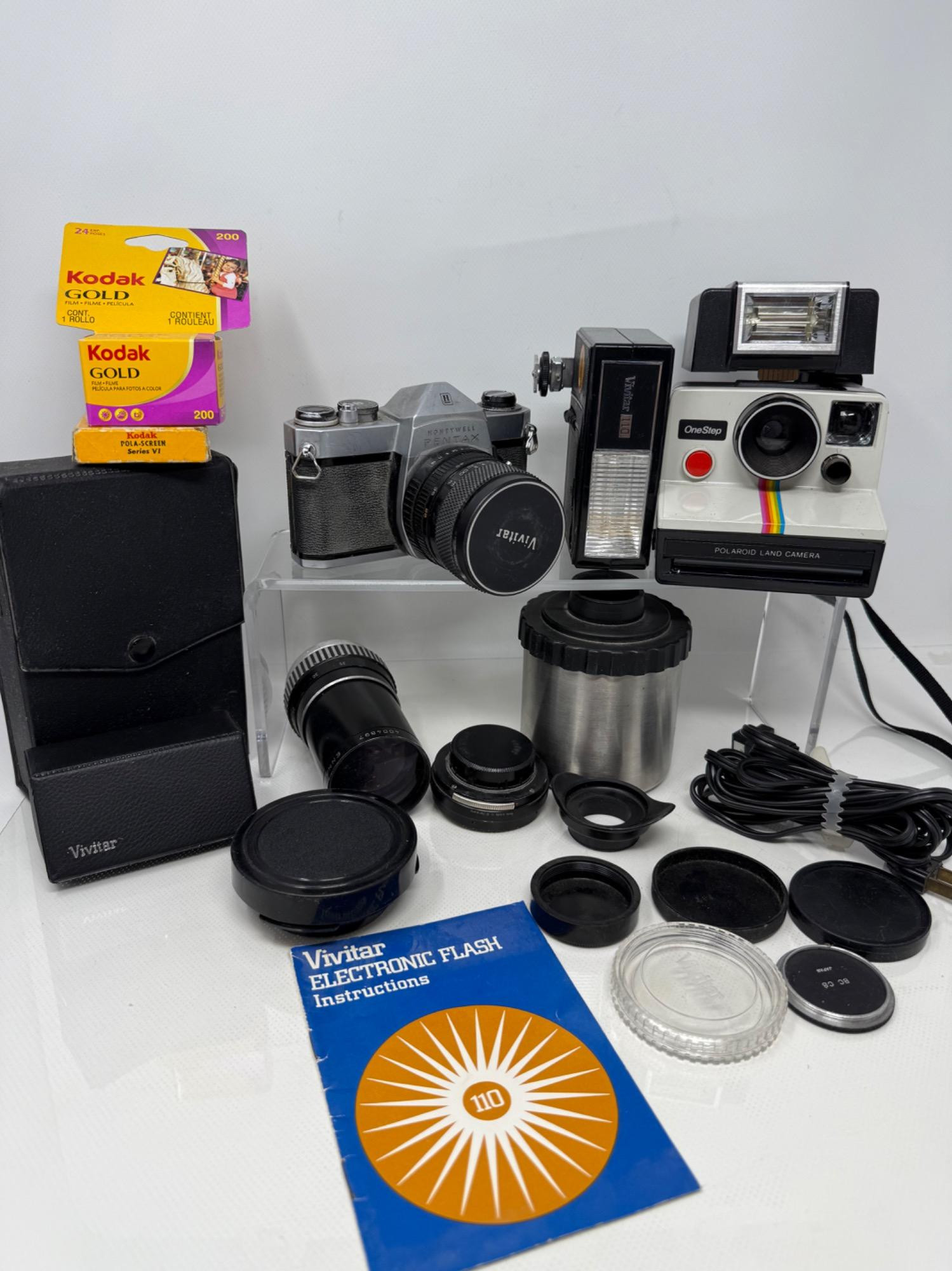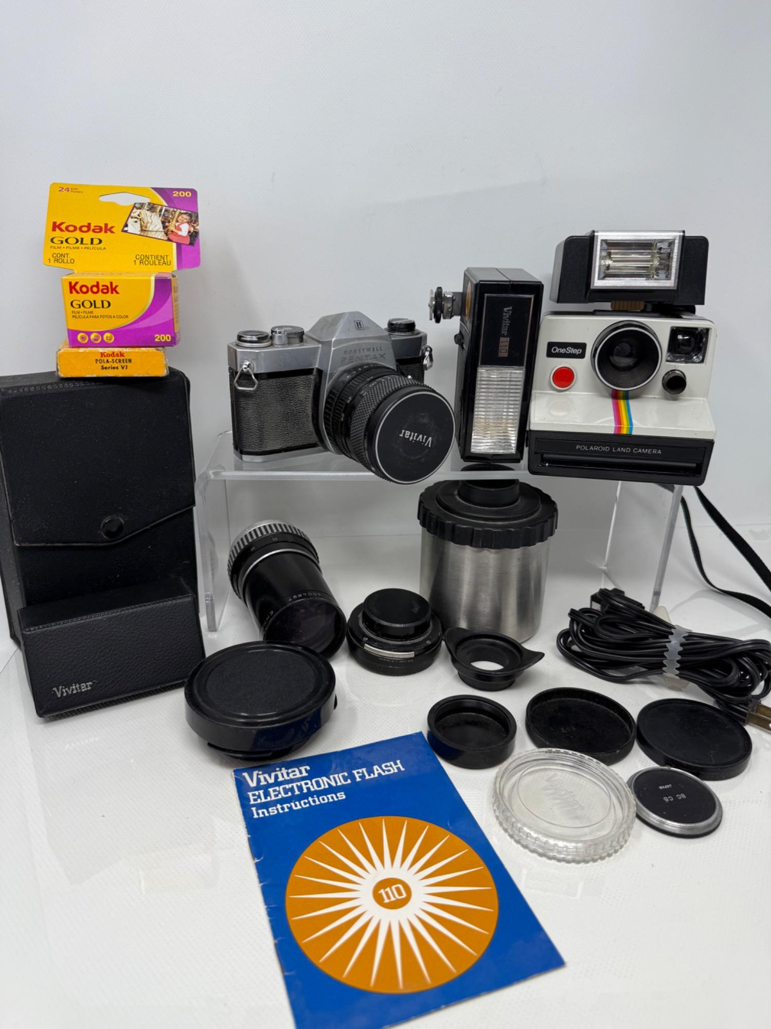 Vintage Poloroid camera. Vivitar camera with extra lenses, filters and accessories. Extra flash attachment.