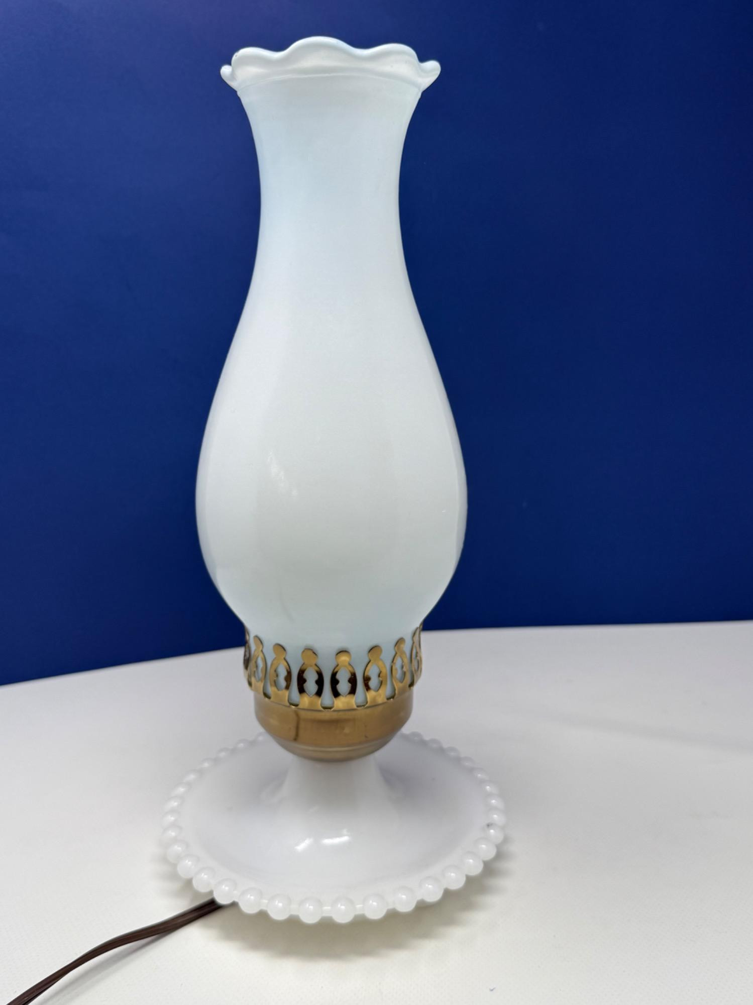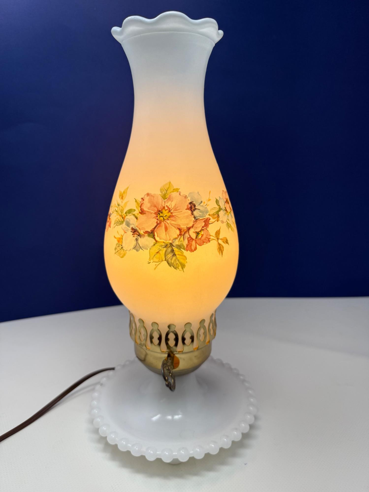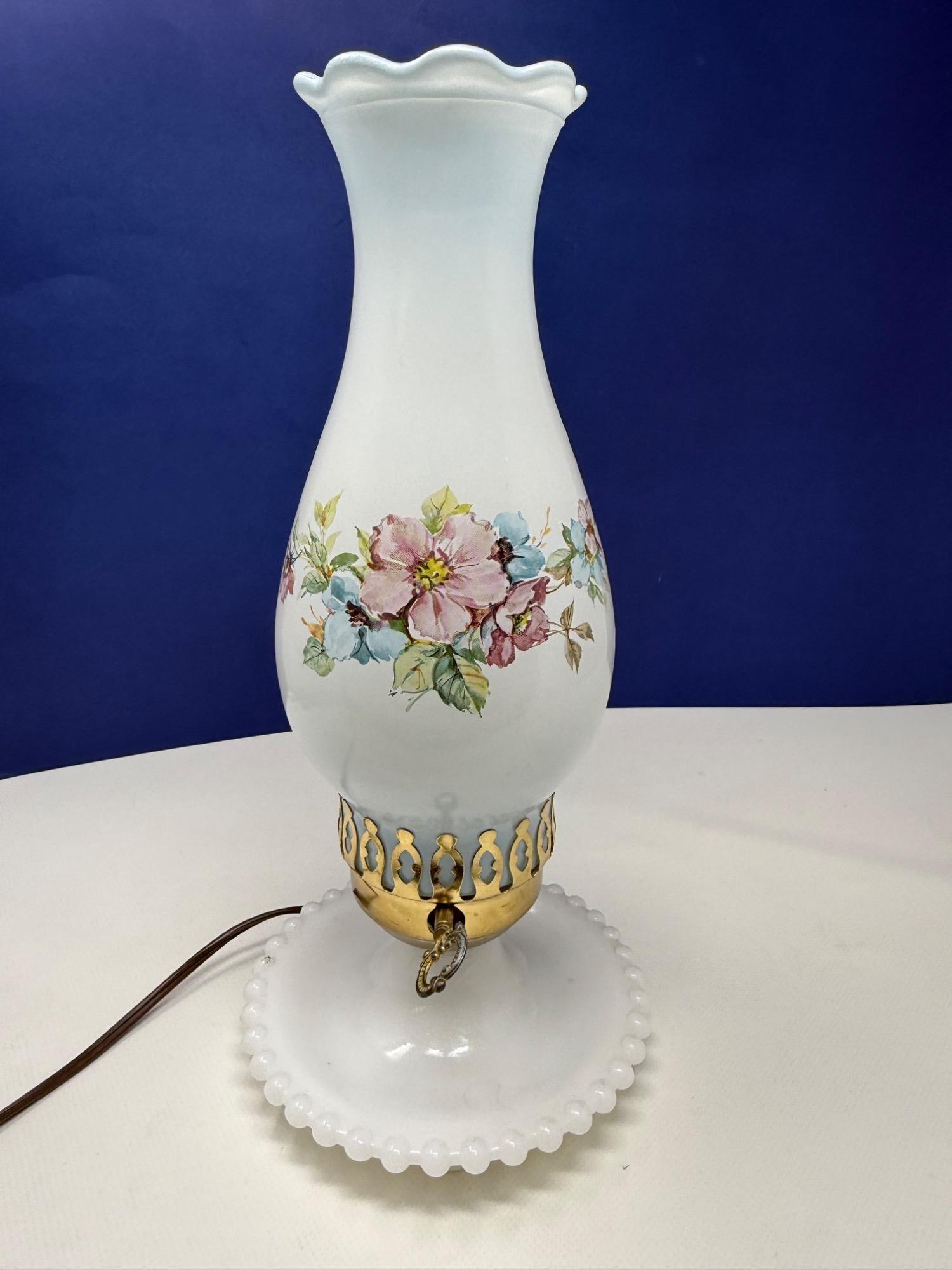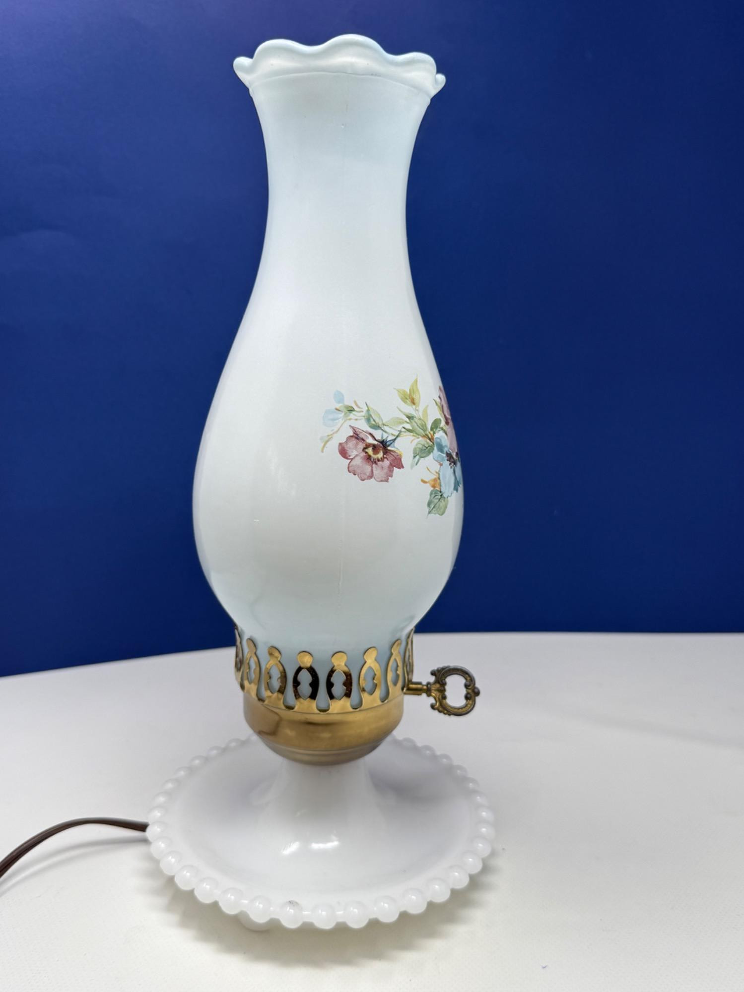 Two Hurricane Lamps-One Hand Painted Electric Lamp Tallest lamp is 18in tall. Extra wick The milk glass lamp is 13.25in tall. Converted to an electric lamp.