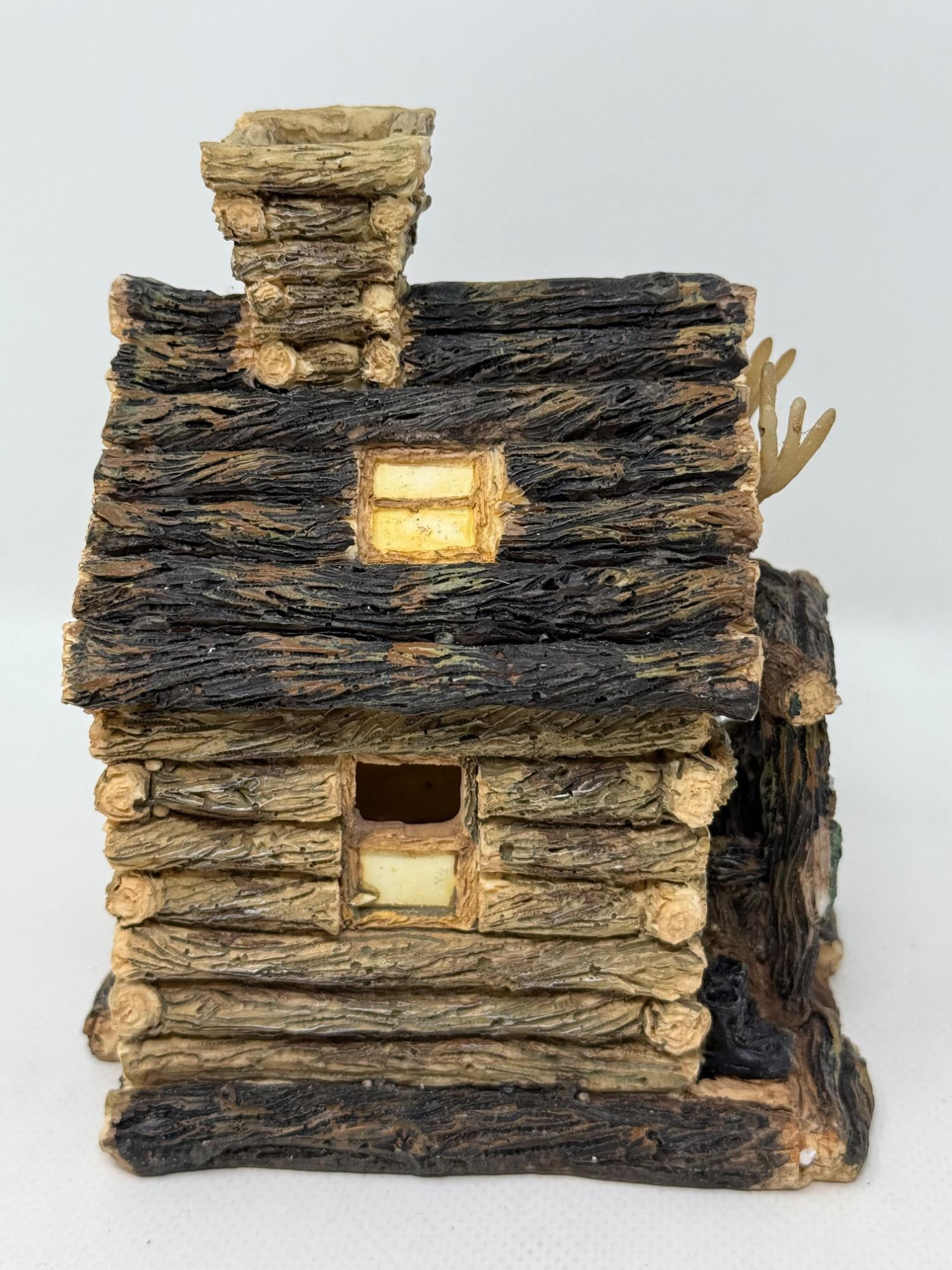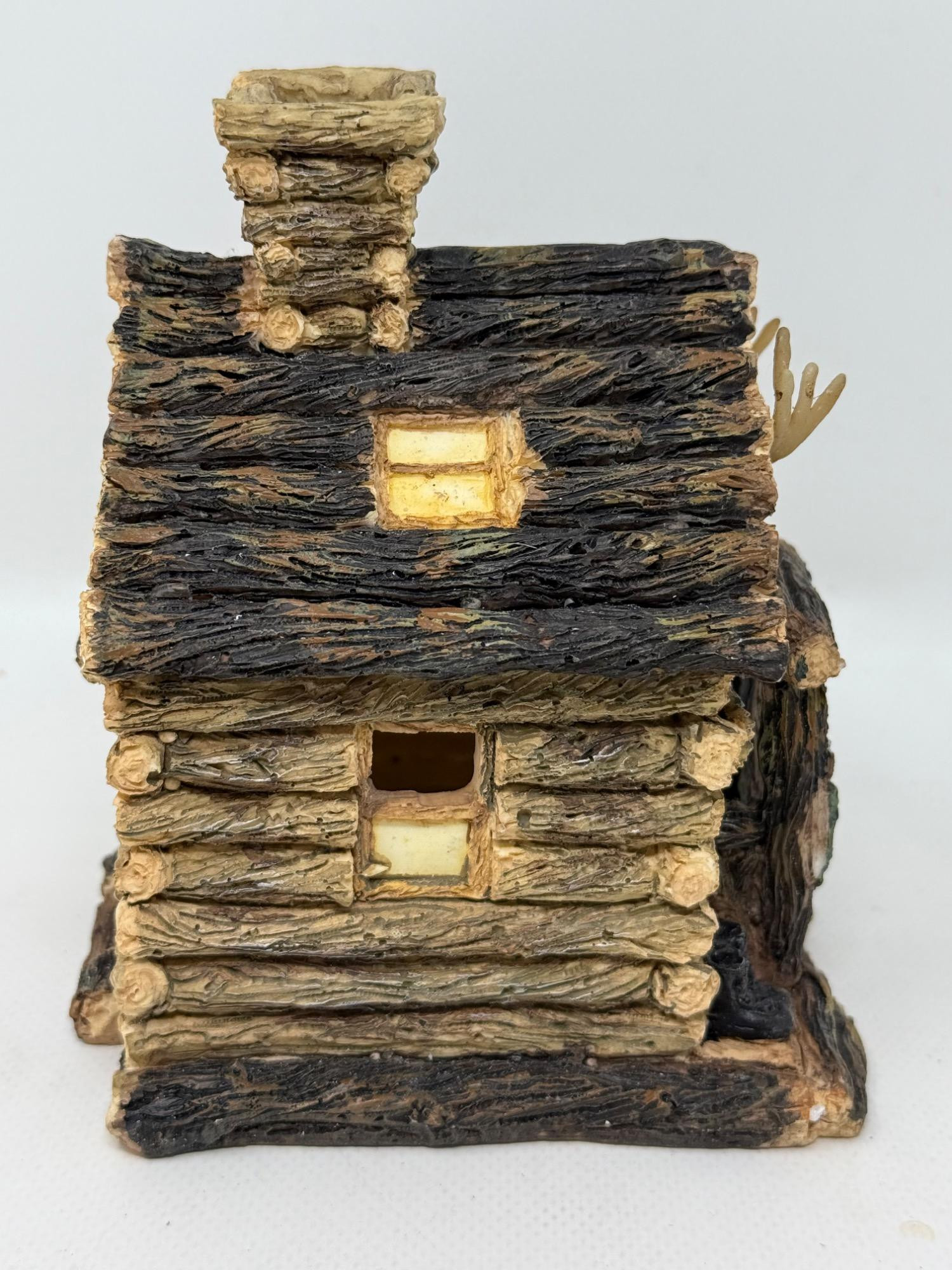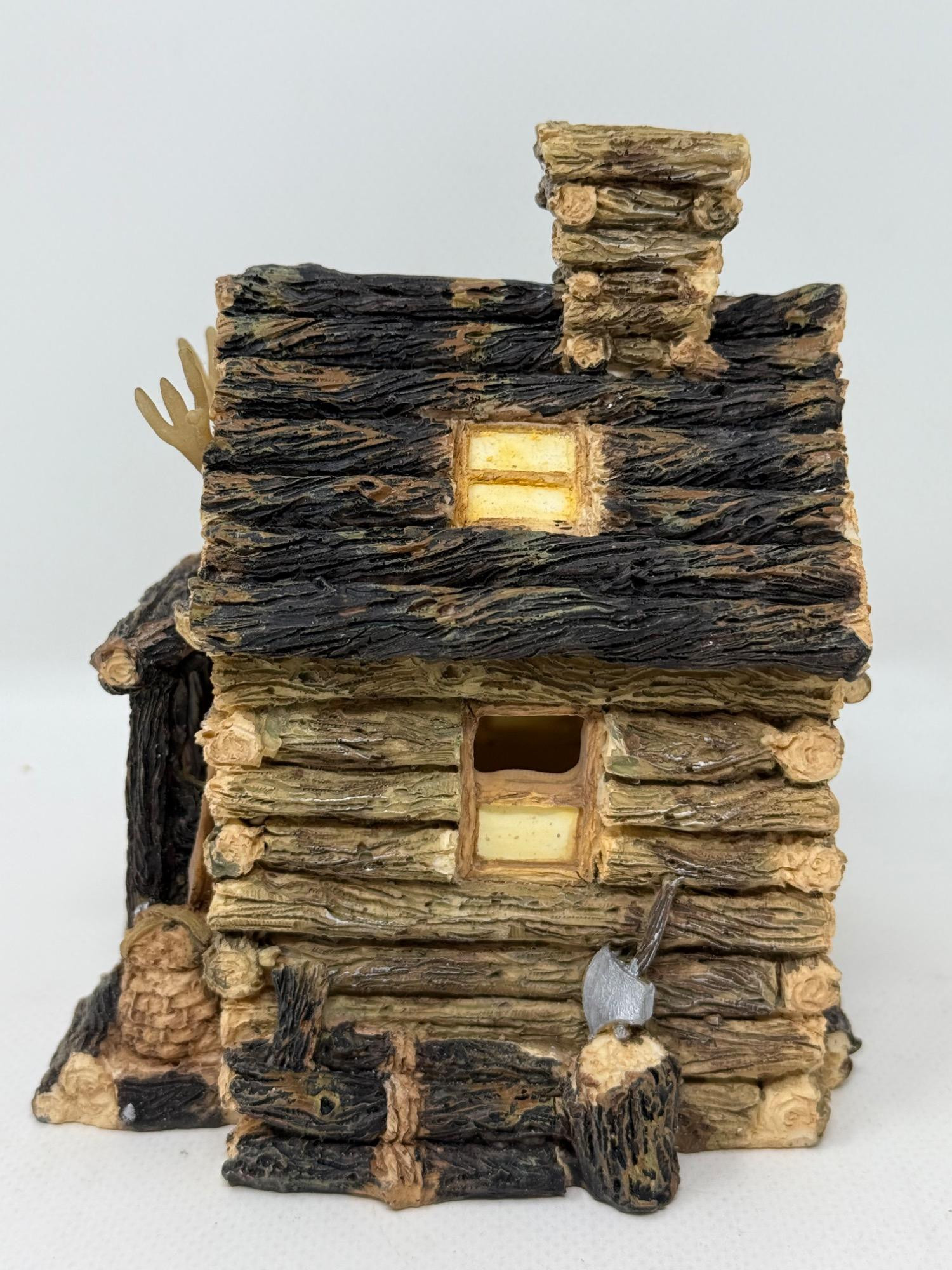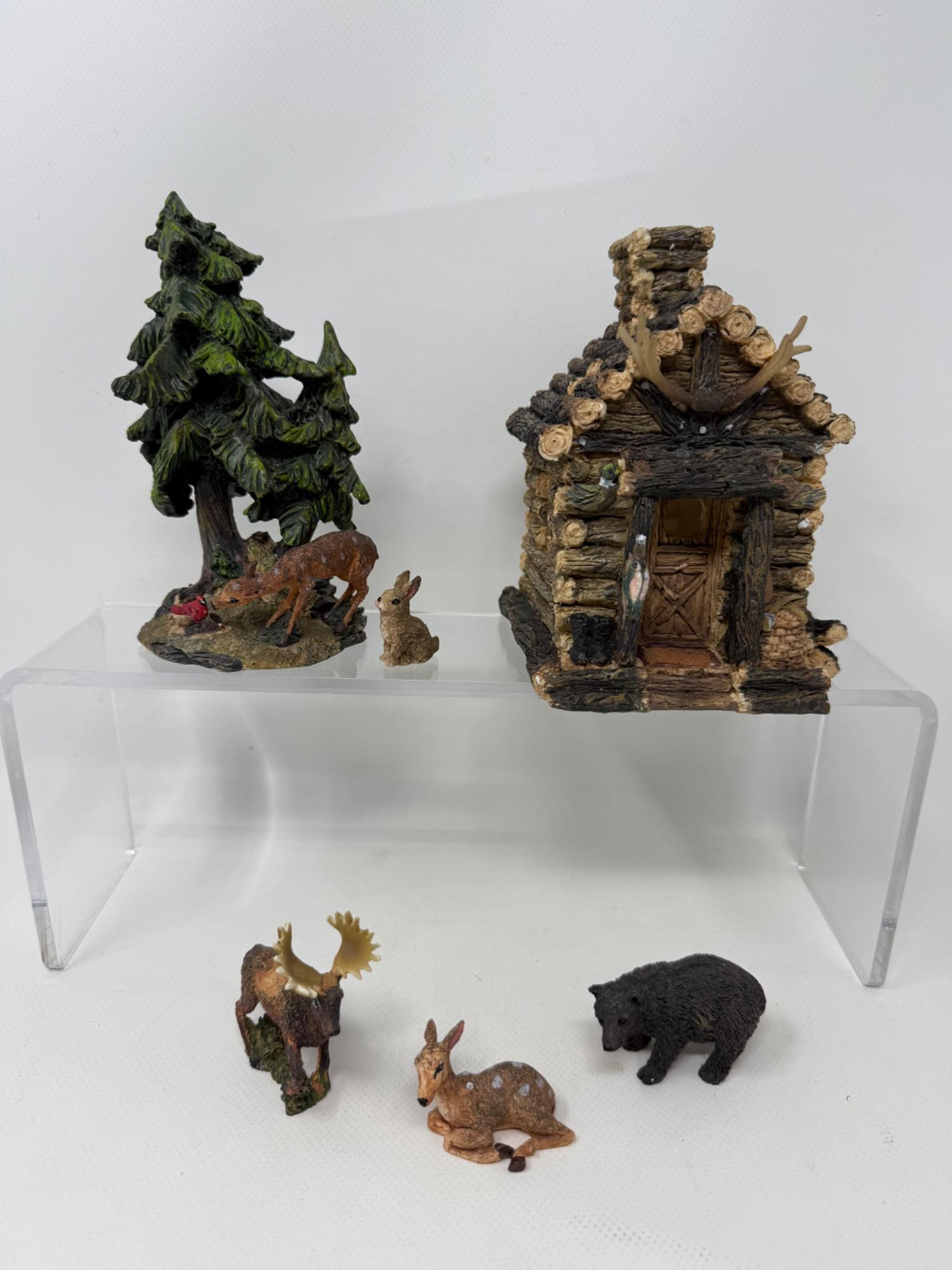 Thomas Clark Collection-Log Cabin, Tree and Animals Resin material hand carved by Thomas Cark. Retired pieces. Log cabin is lamp capable