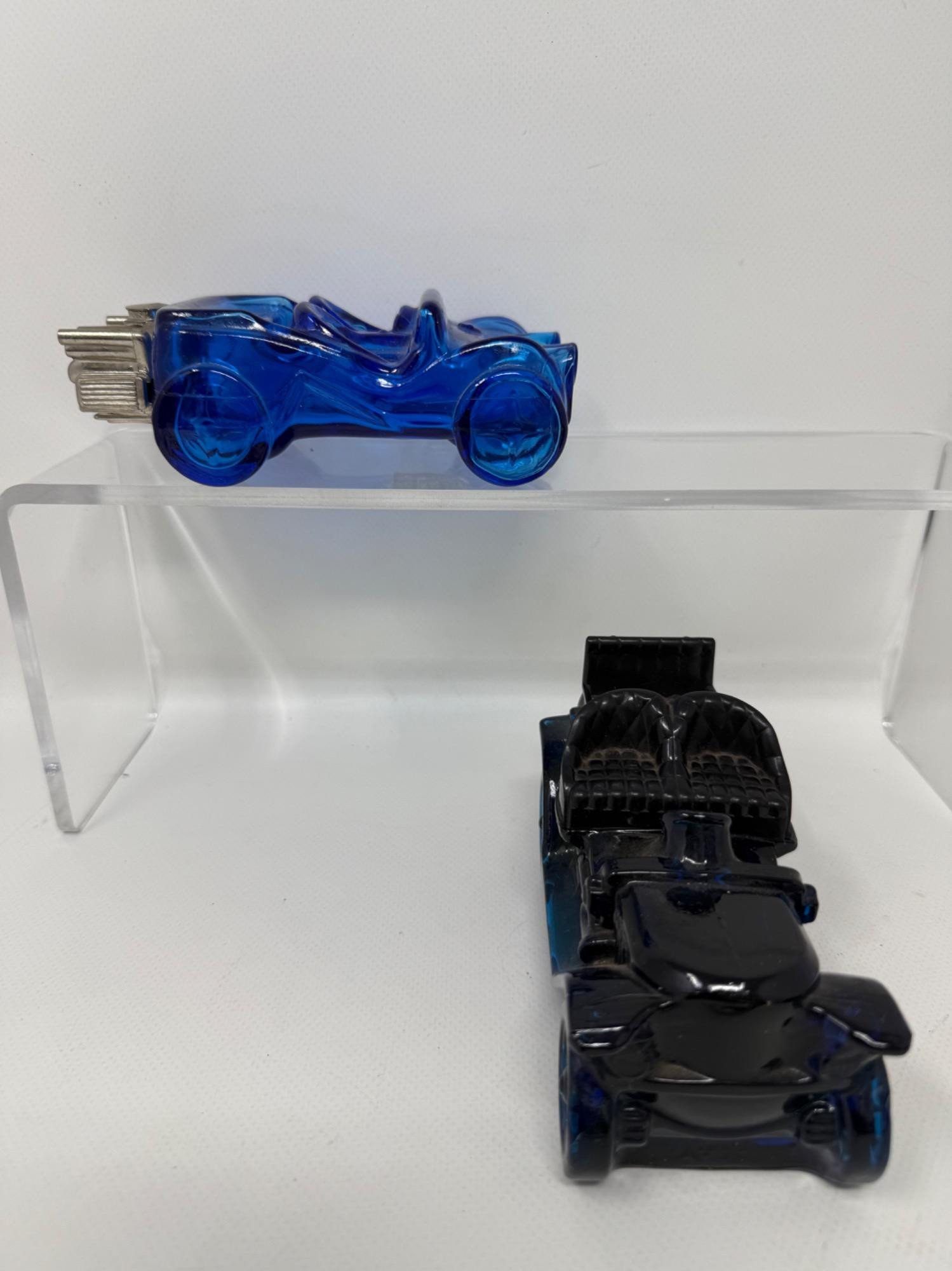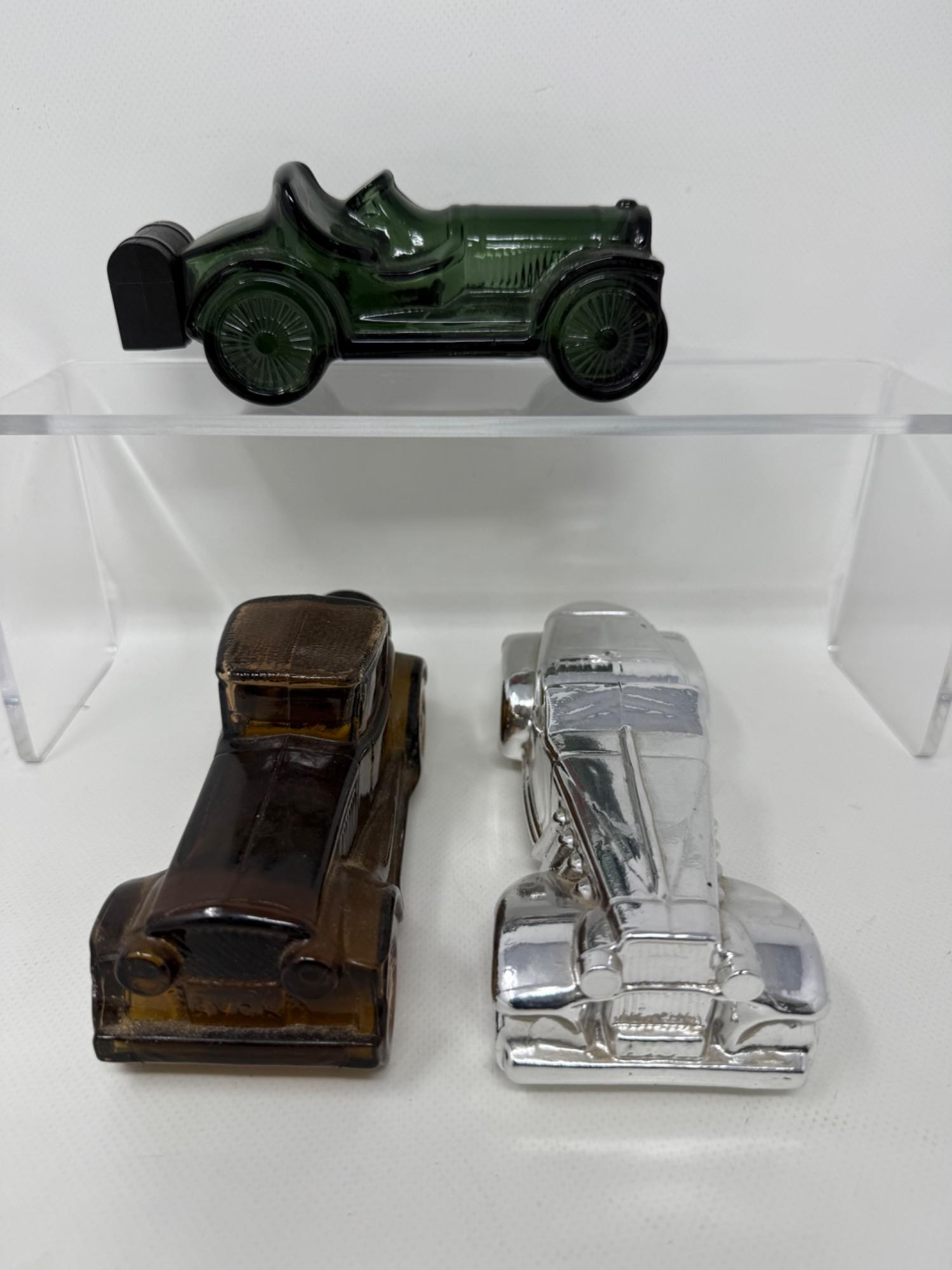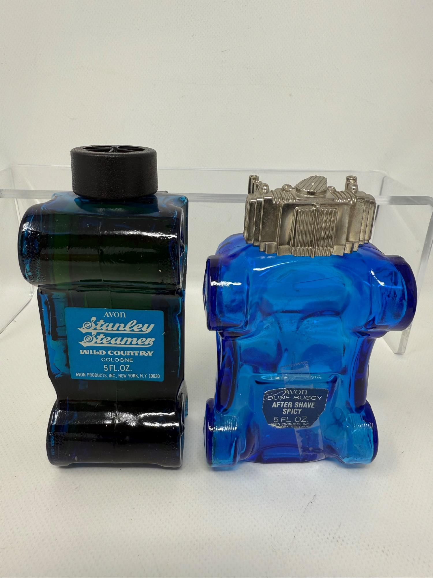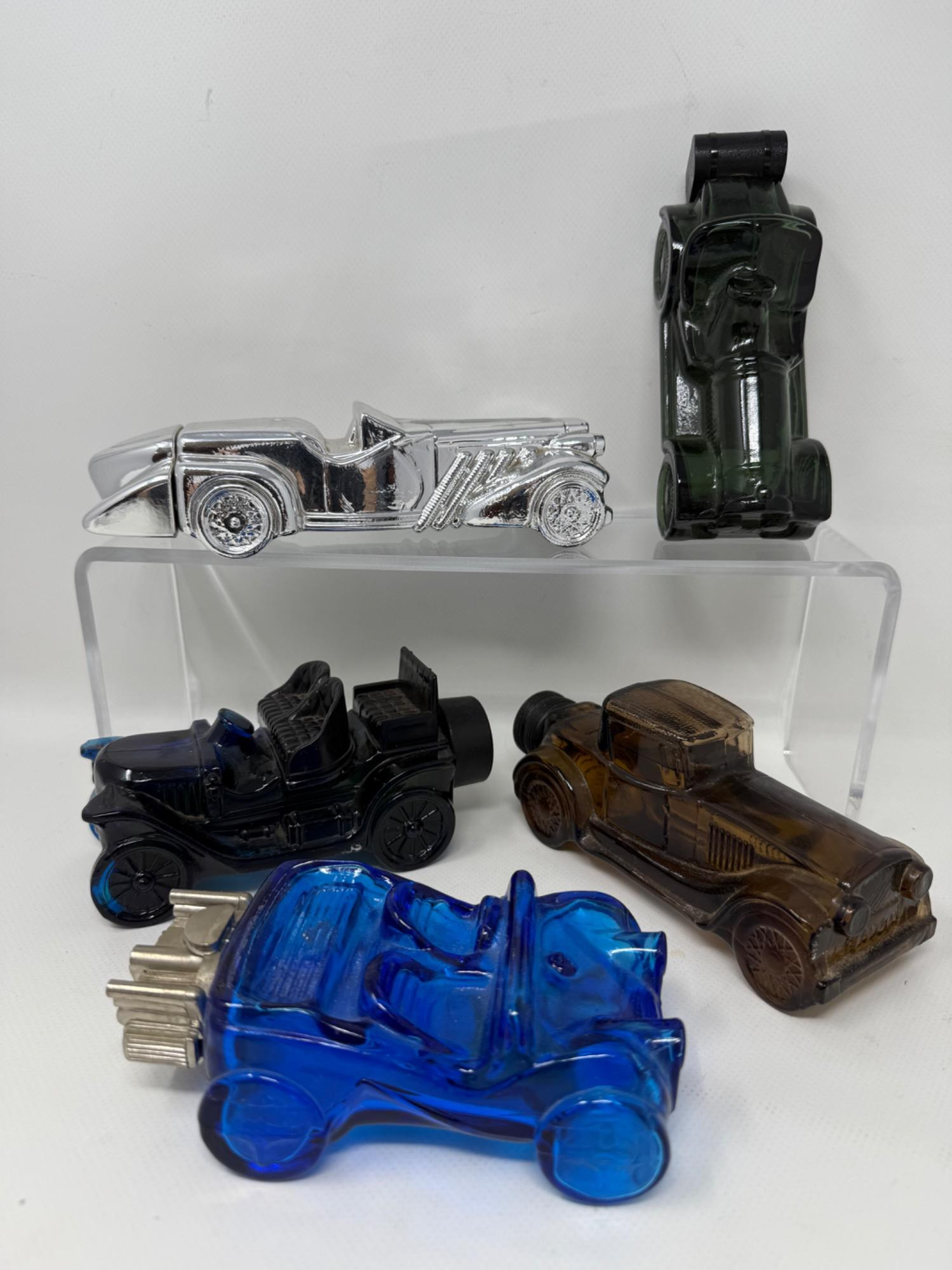 Vintage collection of cologne by Avon Silver Duesenberg is 8in long, Dark green bottle looks black. Brown, electric blue and deep blue glass bottles.