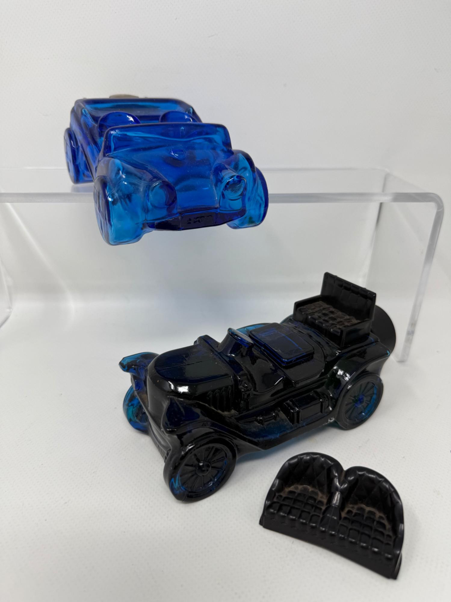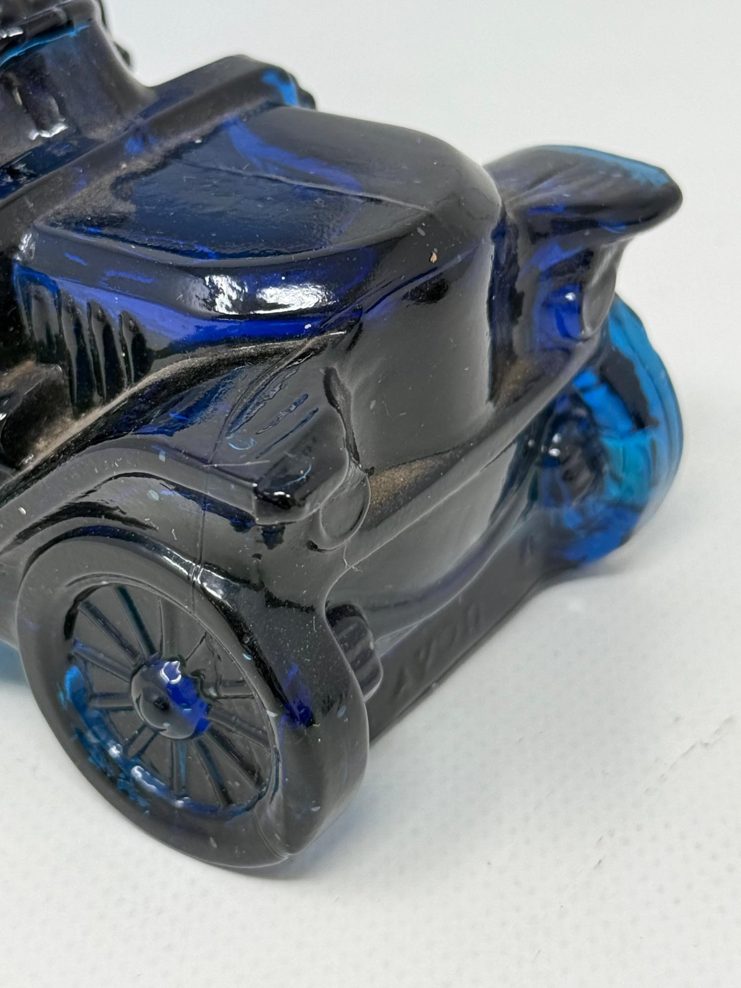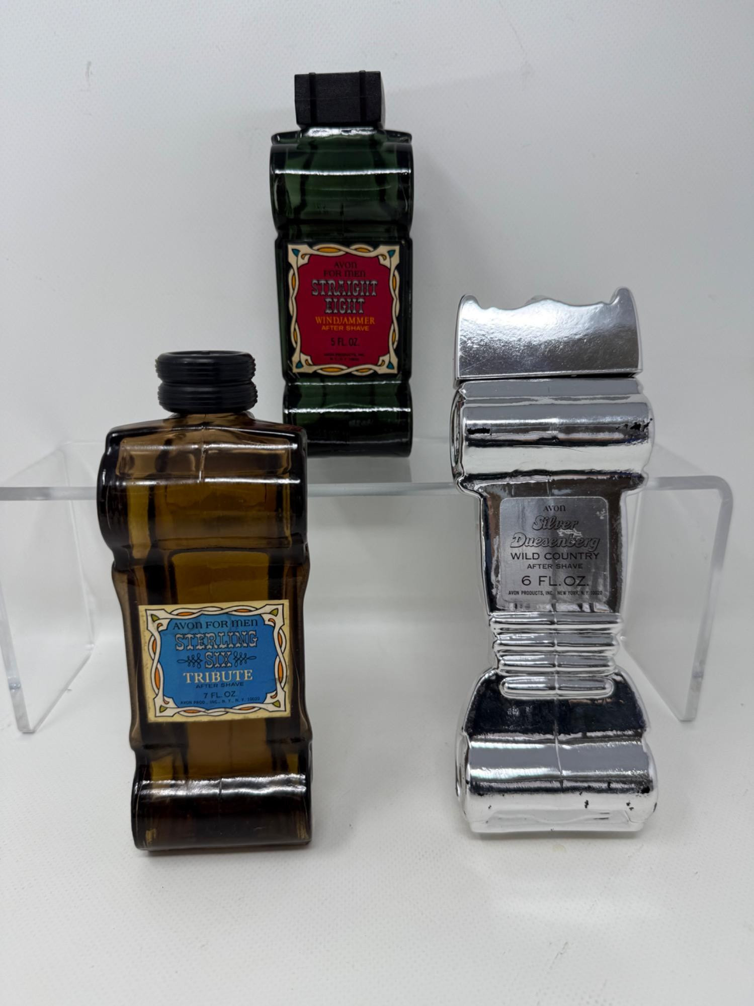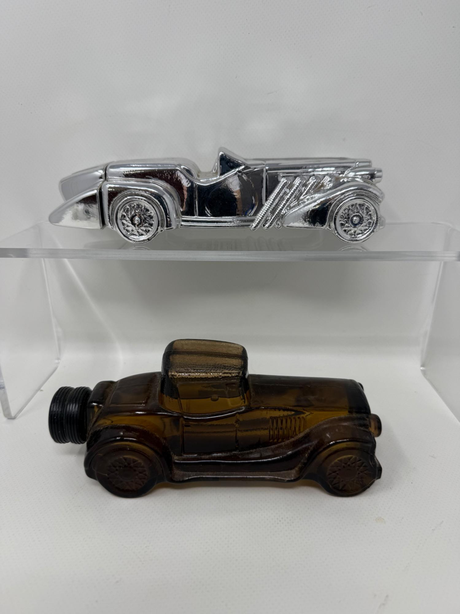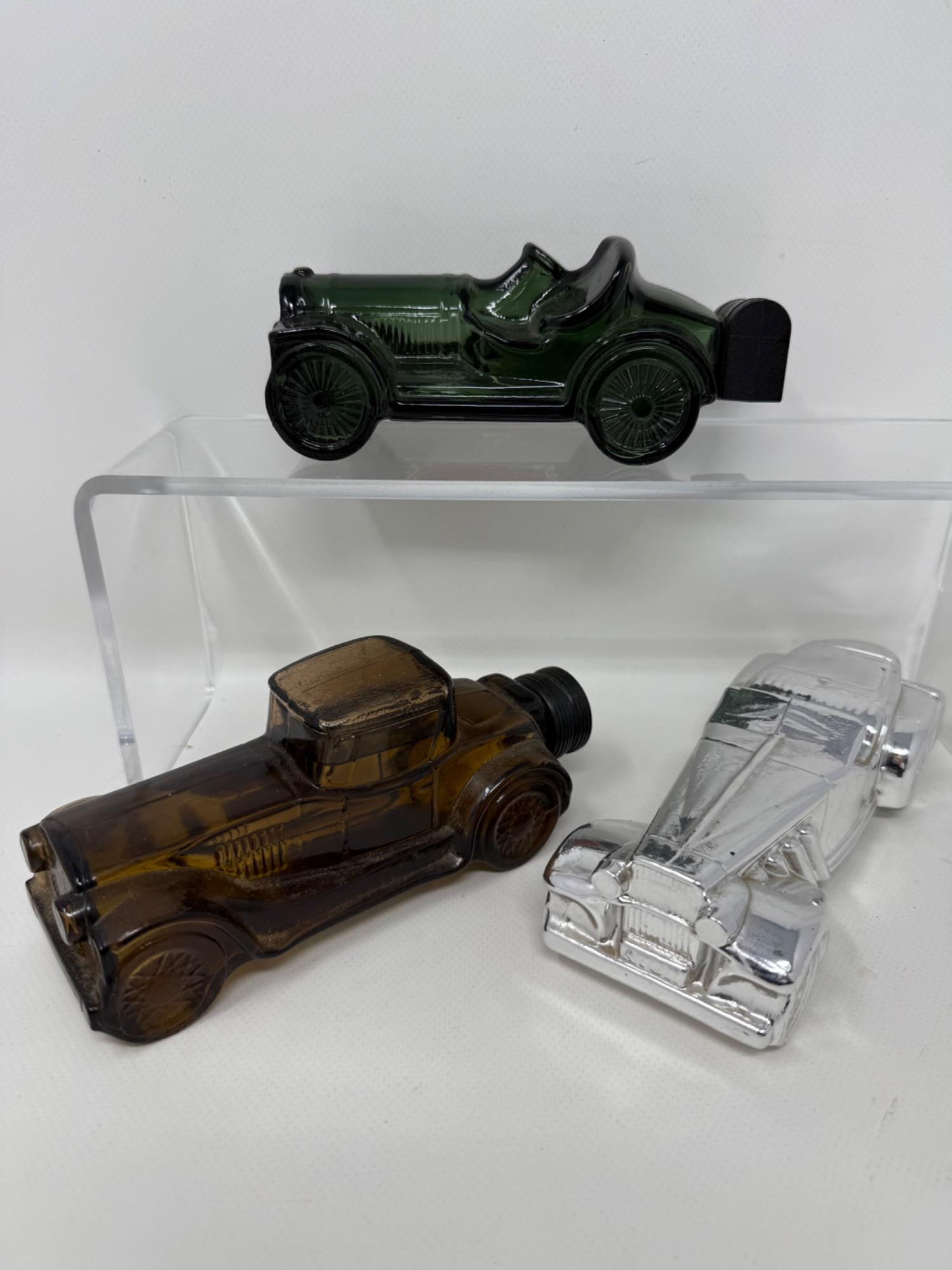 Vintage collection of cologne by Avon Silver Duesenberg is 8in long, Dark green bottle looks black. Brown, electric blue and deep blue glass bottles.