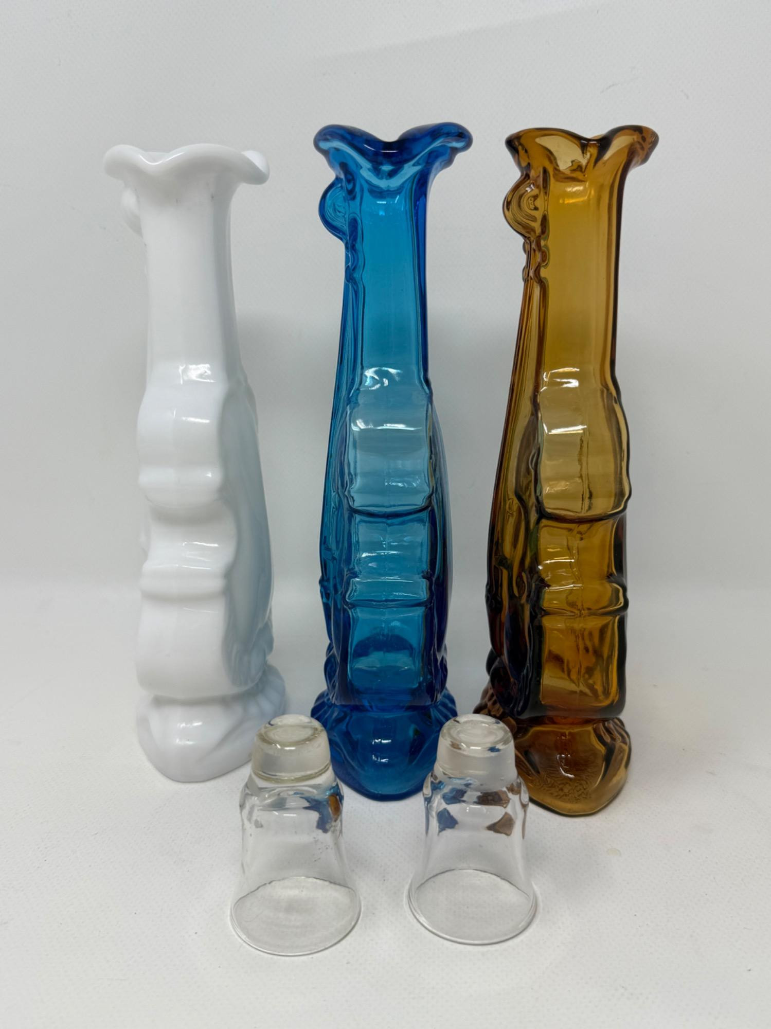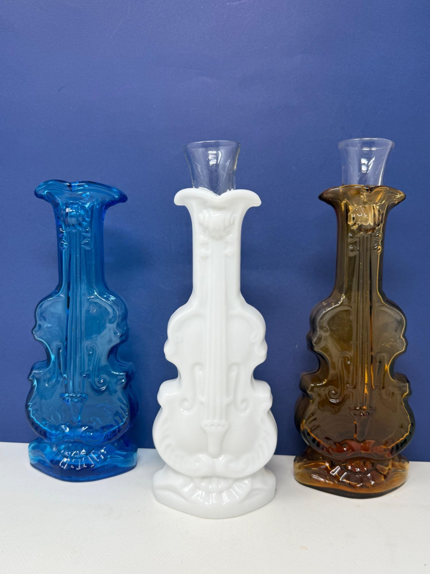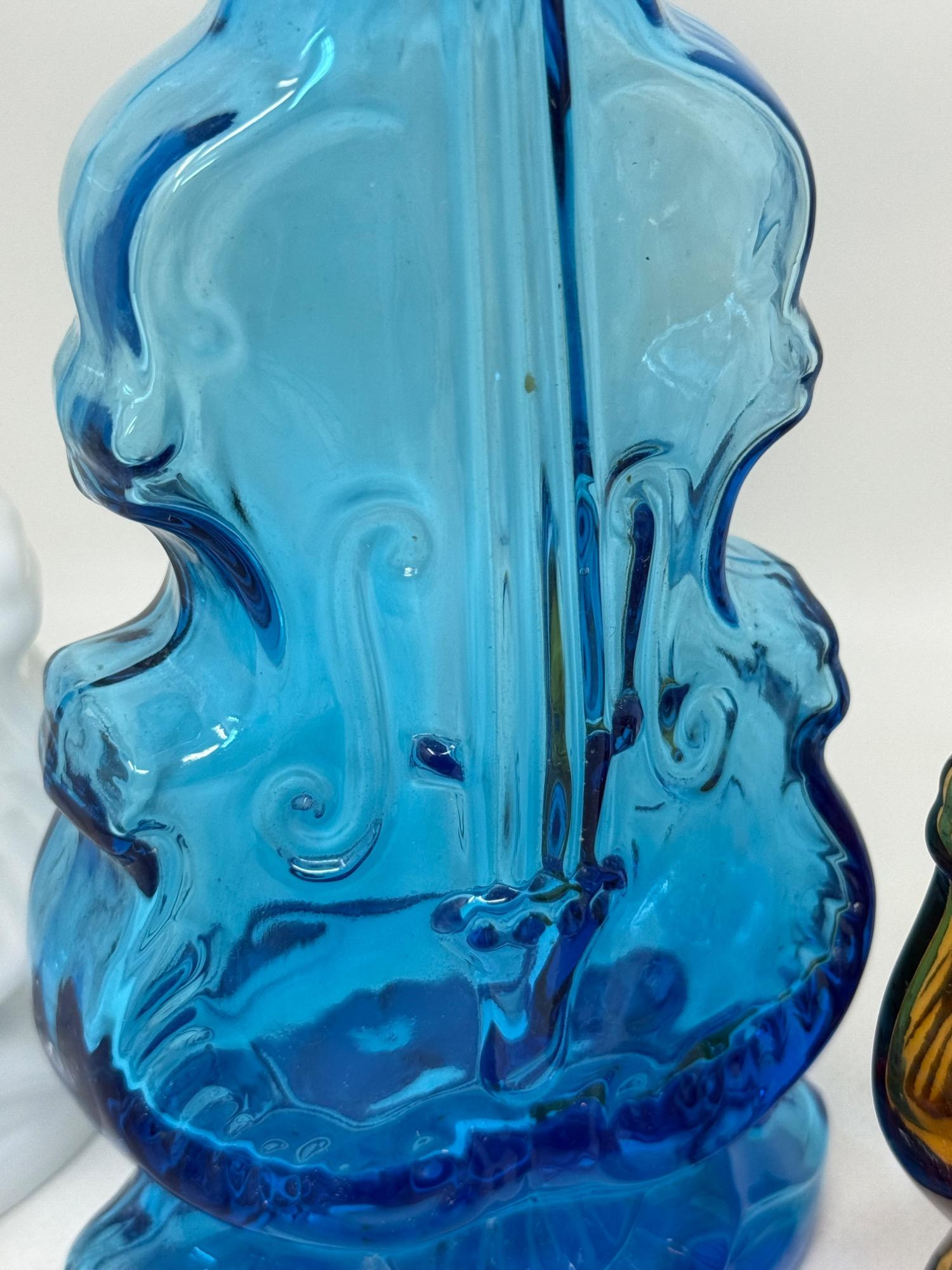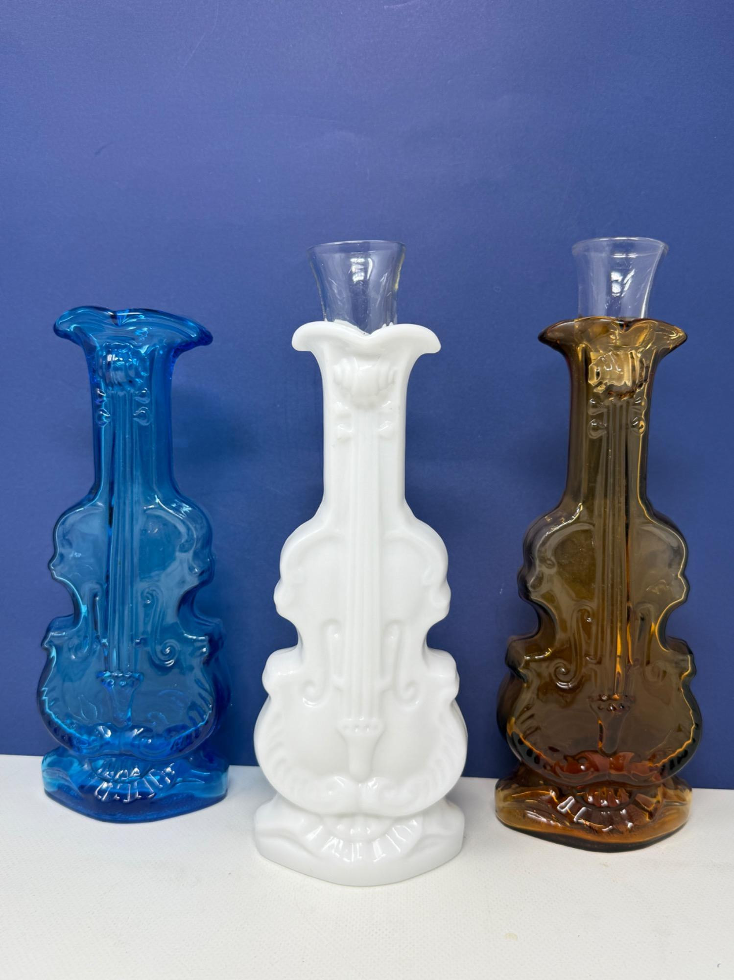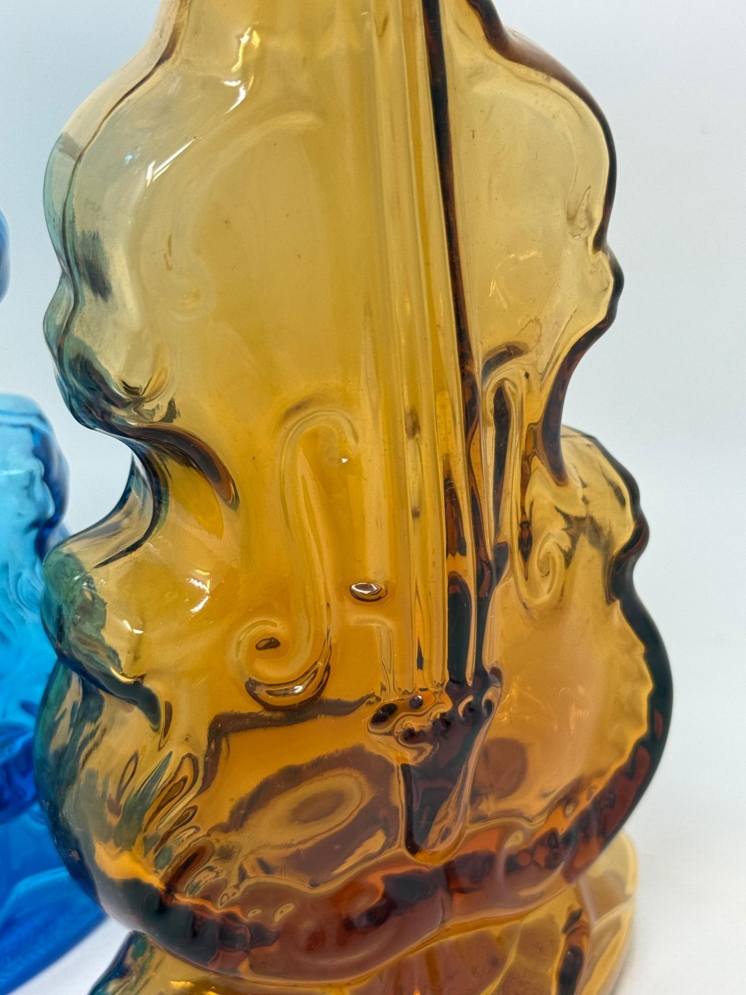 Heavy glass violin bottles. Two with glass caps, shot glass. Milk glass, amber and electric blue. Continental glass company