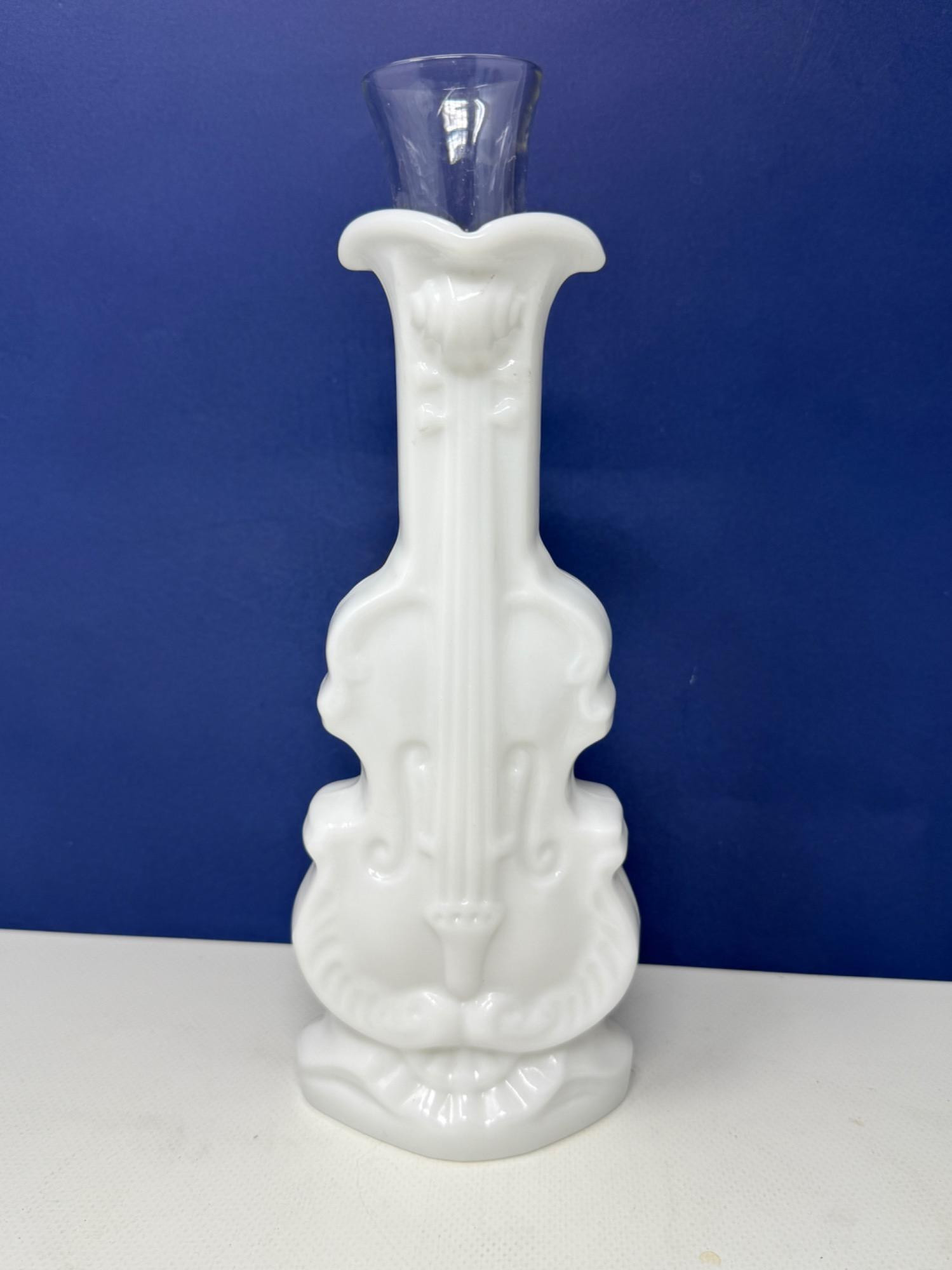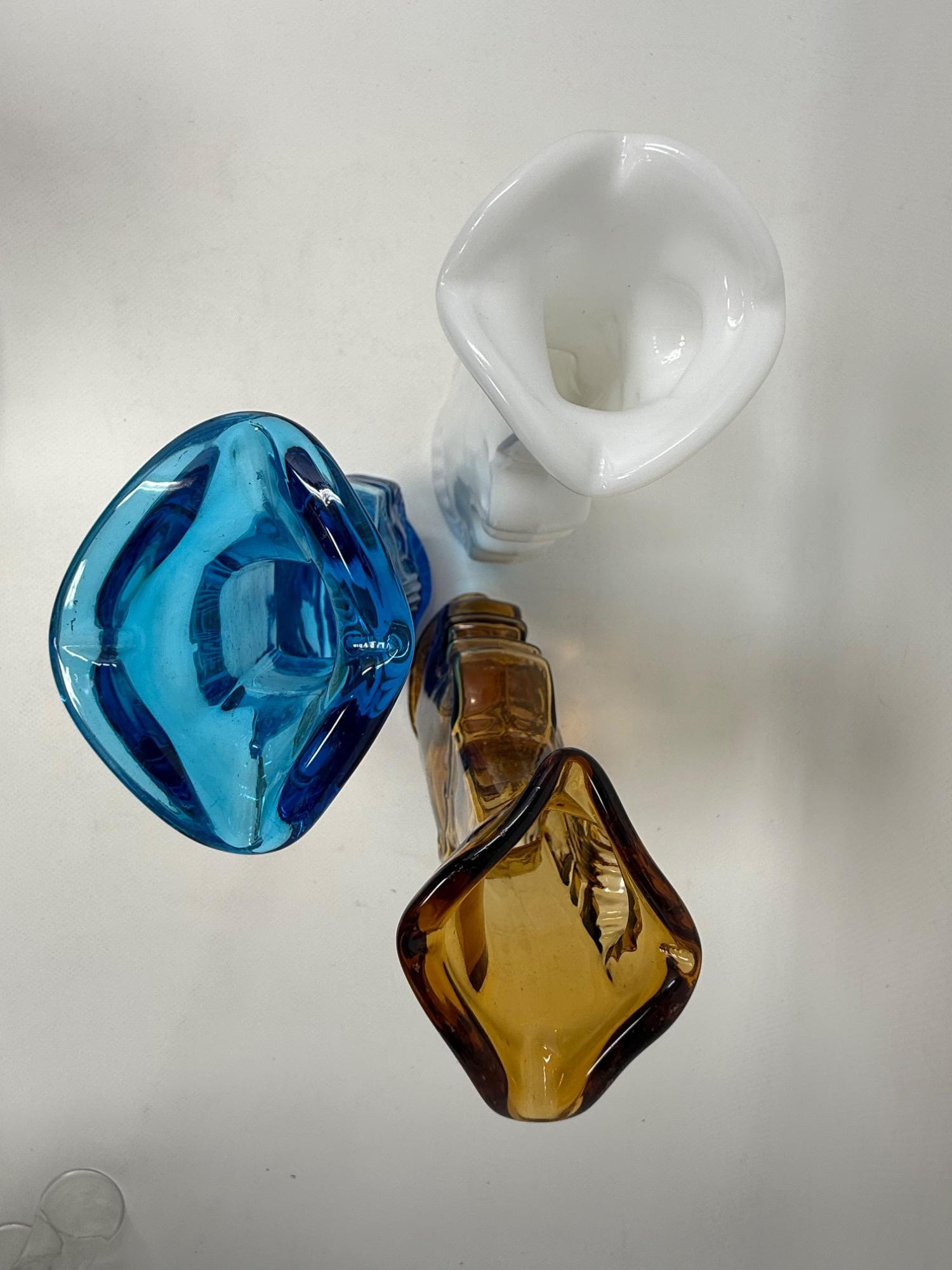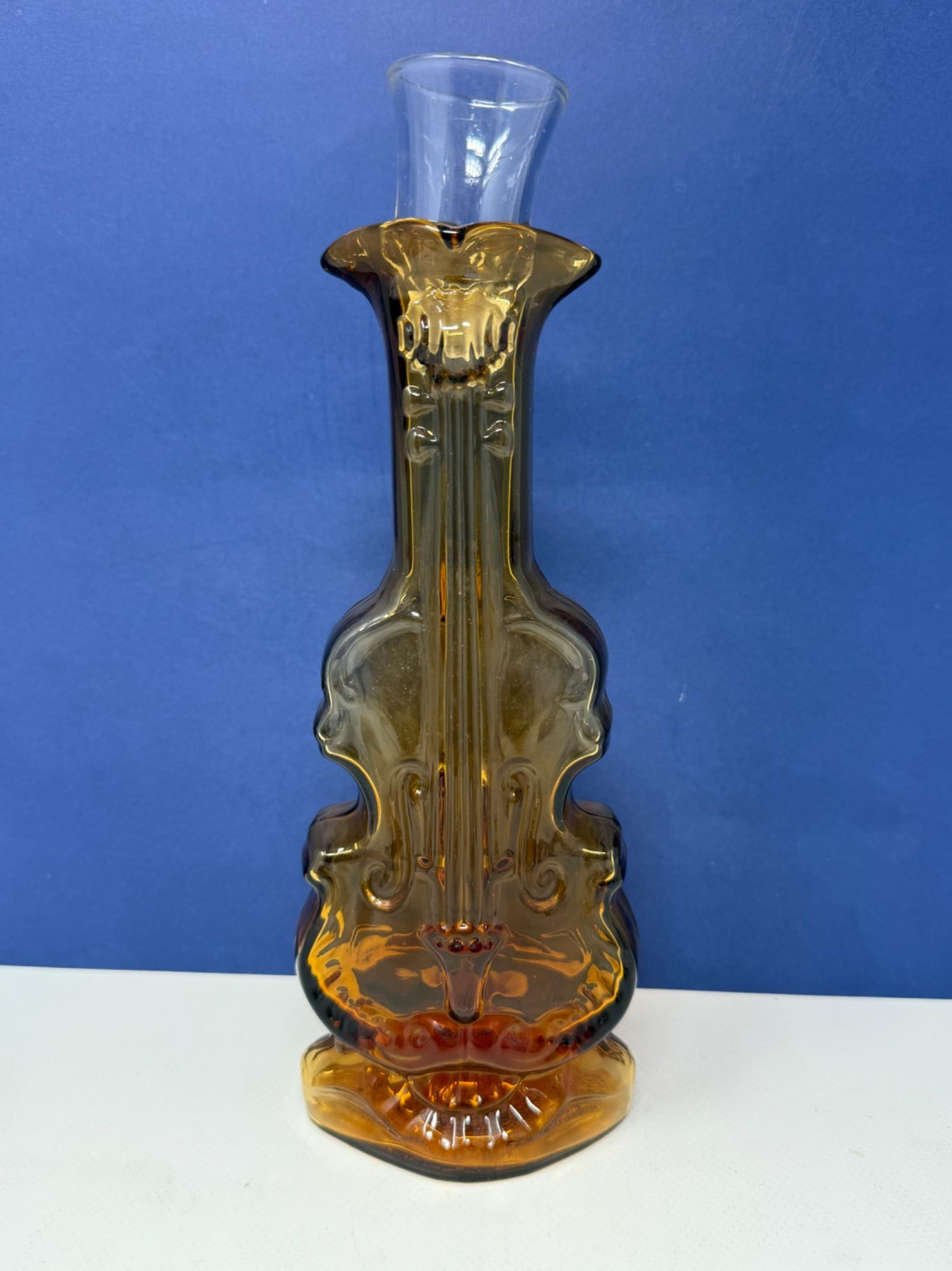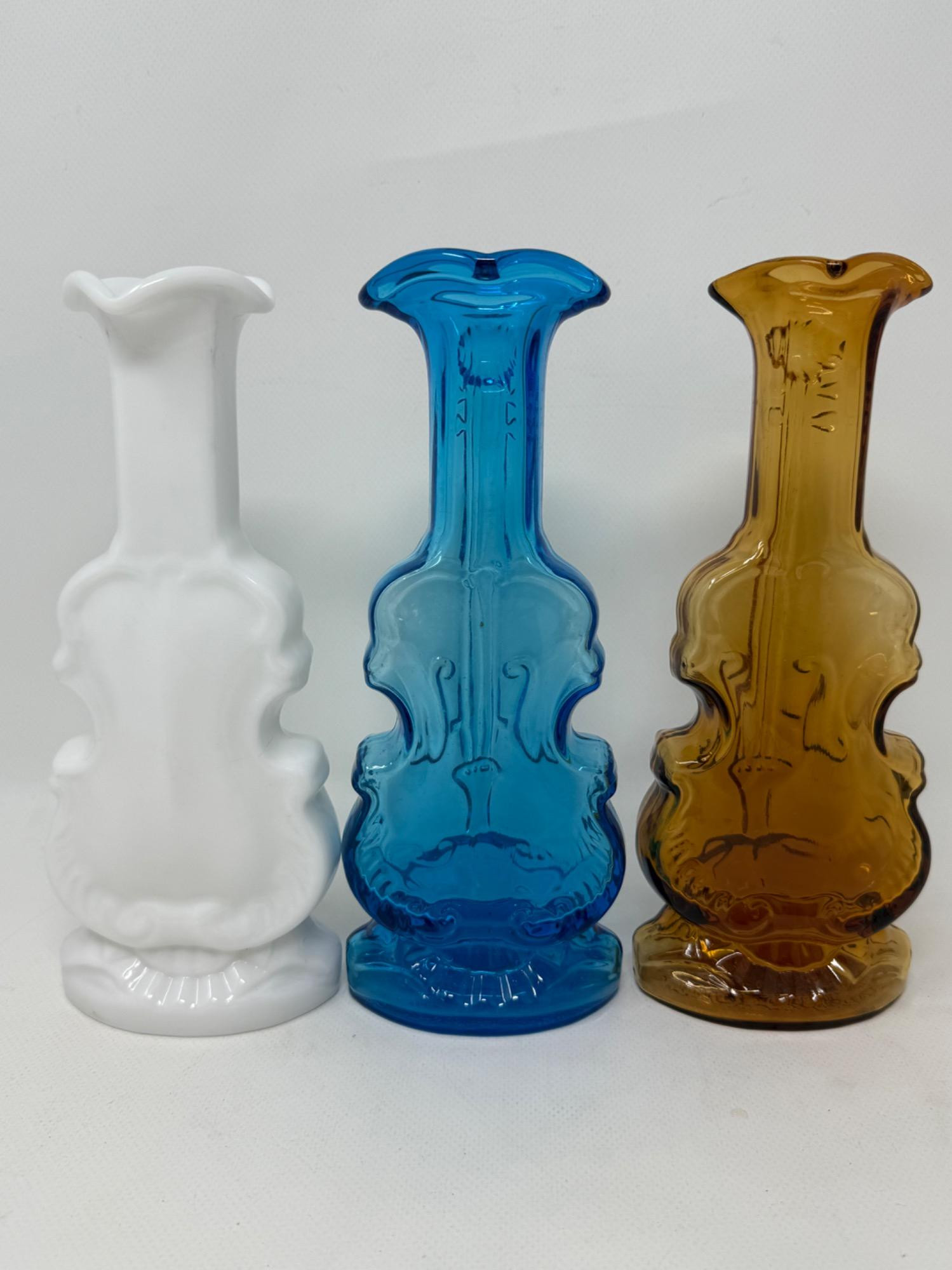 Heavy glass violin bottles. Two with glass caps, shot glass. Milk glass, amber and electric blue. Continental glass company