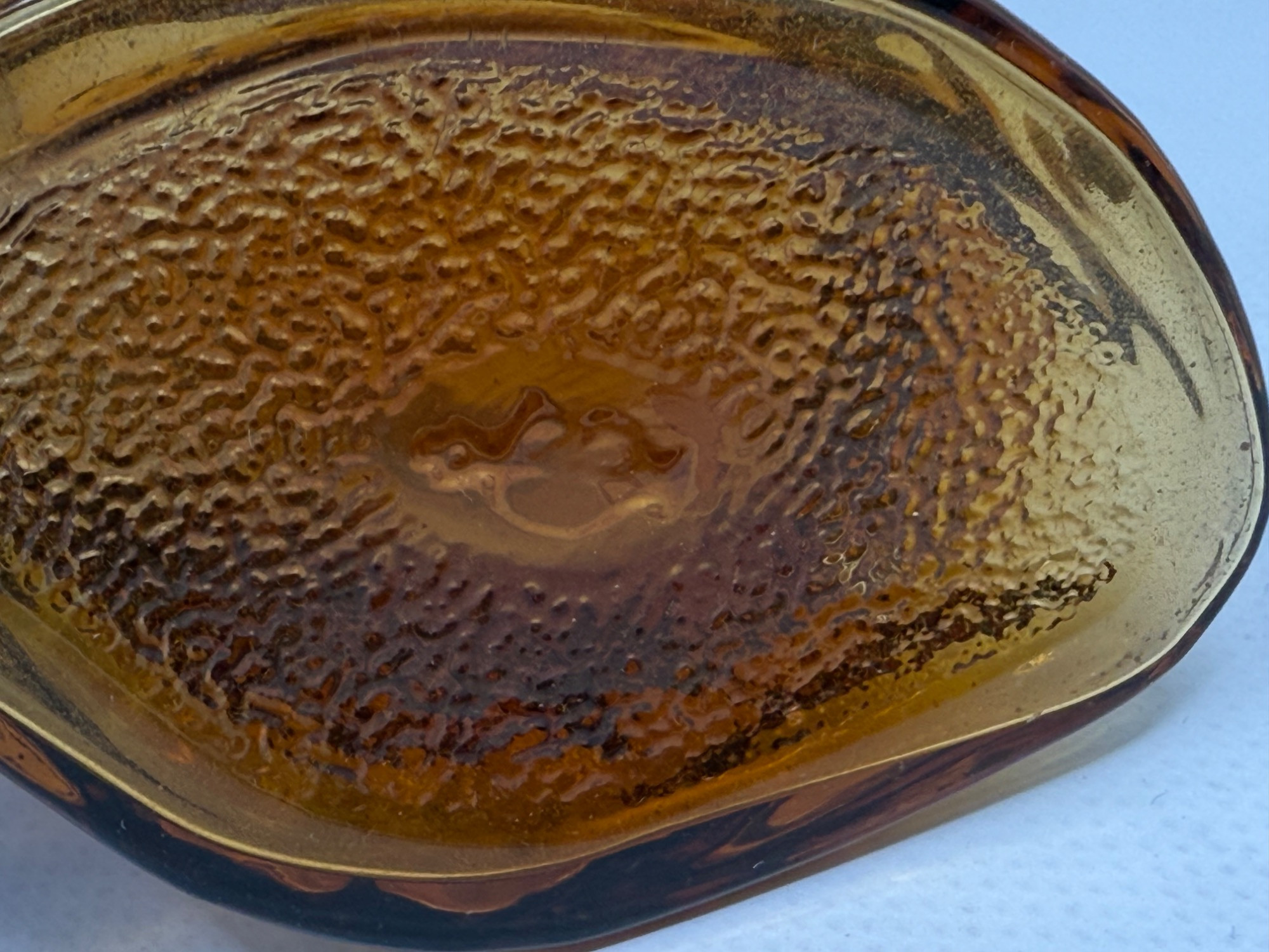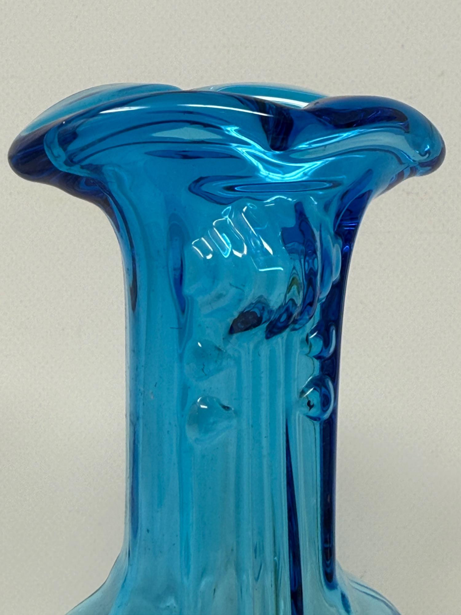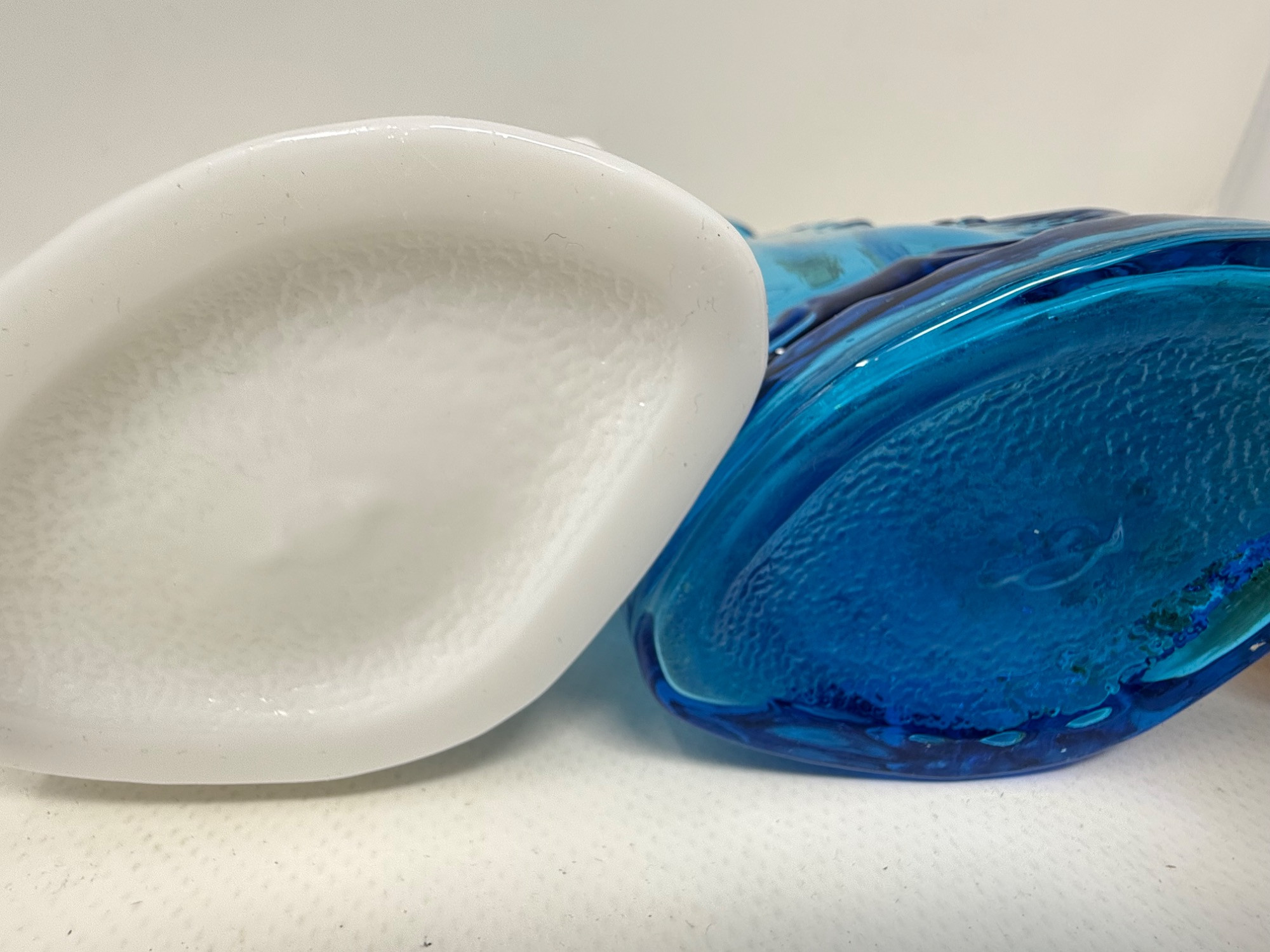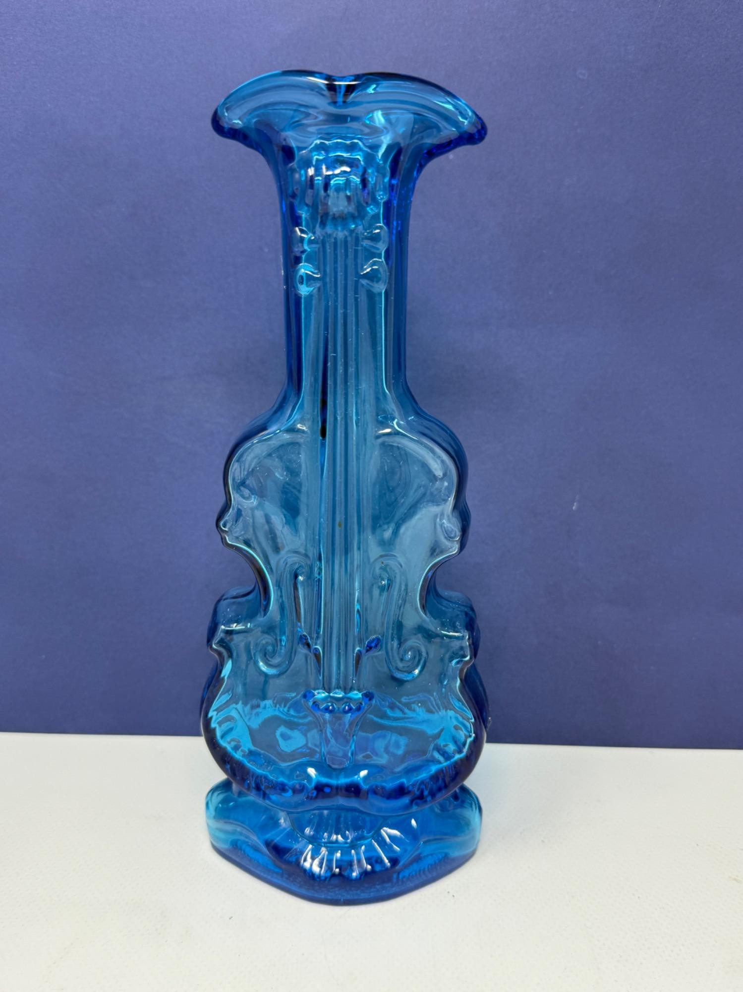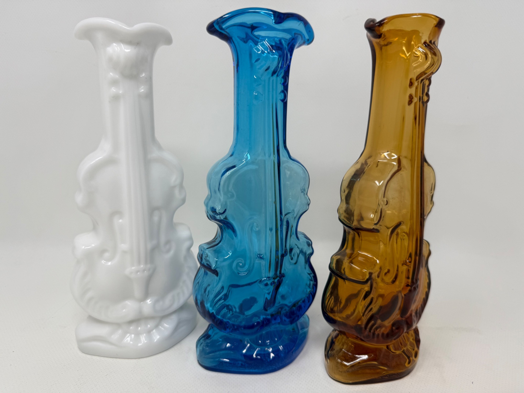 Heavy glass violin bottles. Two with glass caps, shot glass. Milk glass, amber and electric blue. Continental glass company