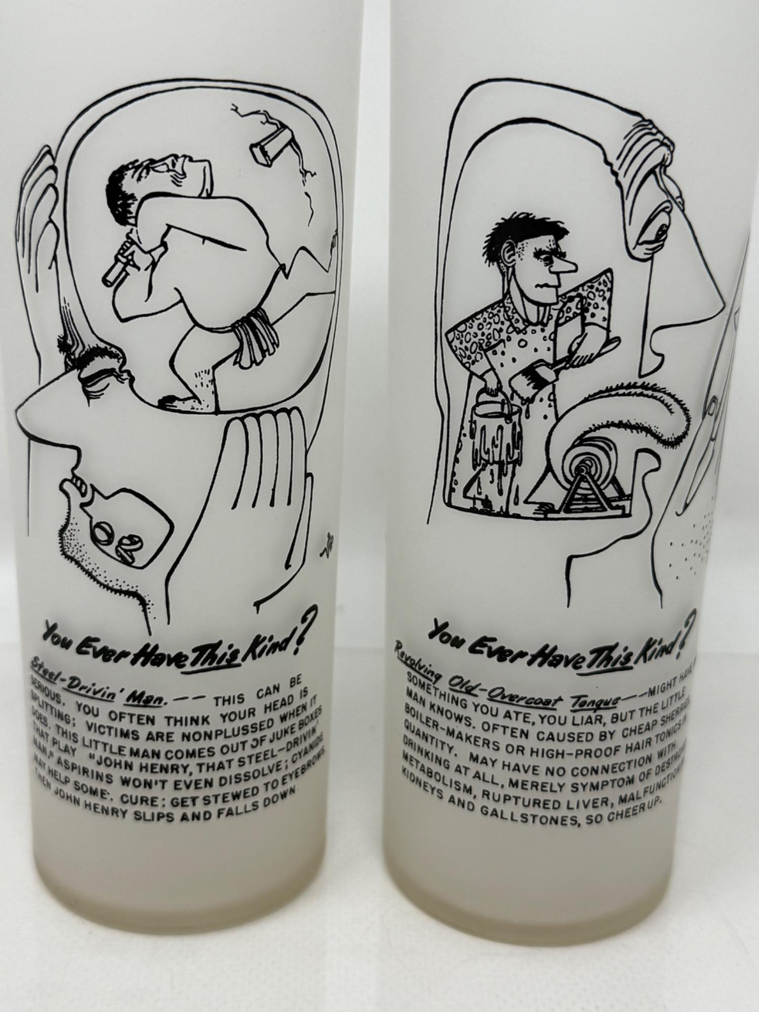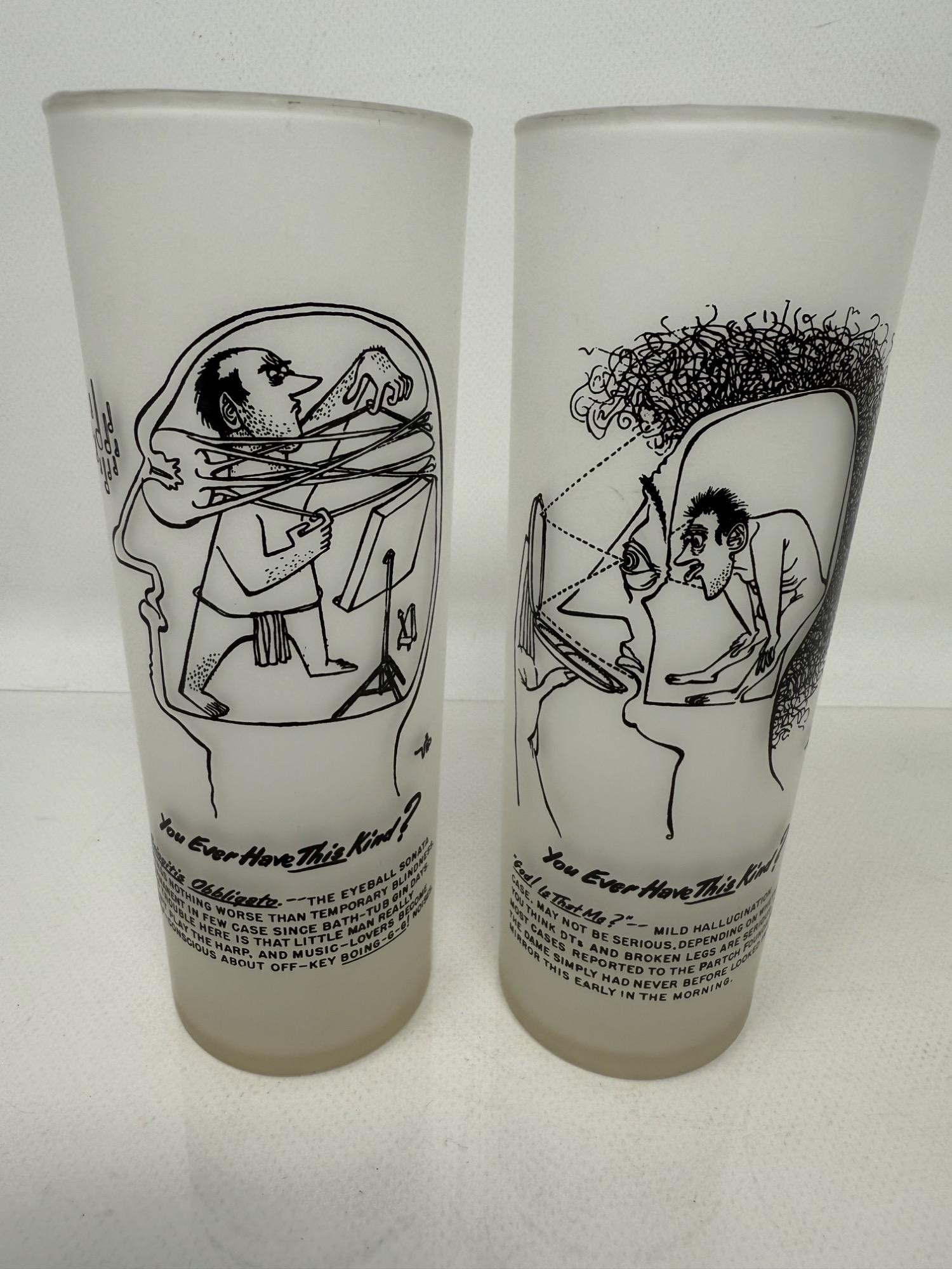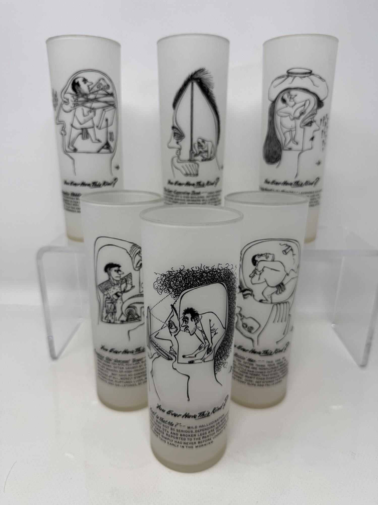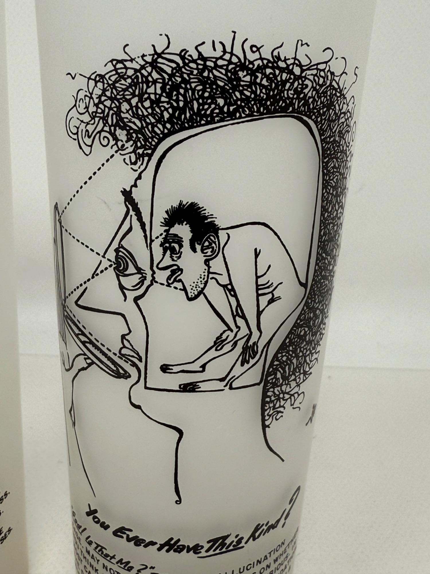 Six Vintage 1950's Virgil Partch Frosted Hiballs "Headache" glasses with graphic art.