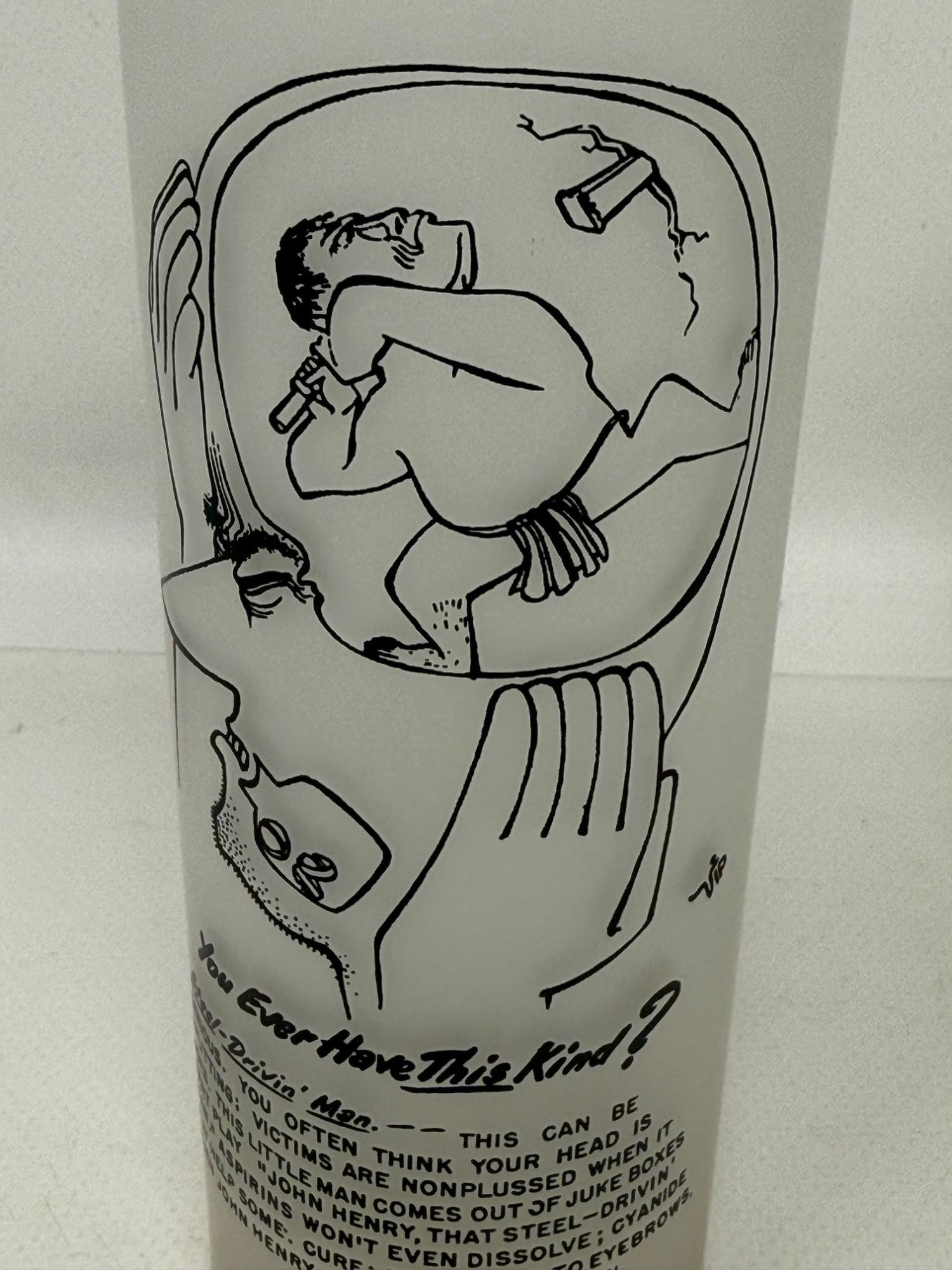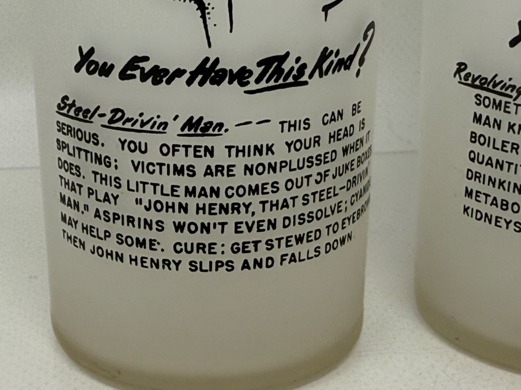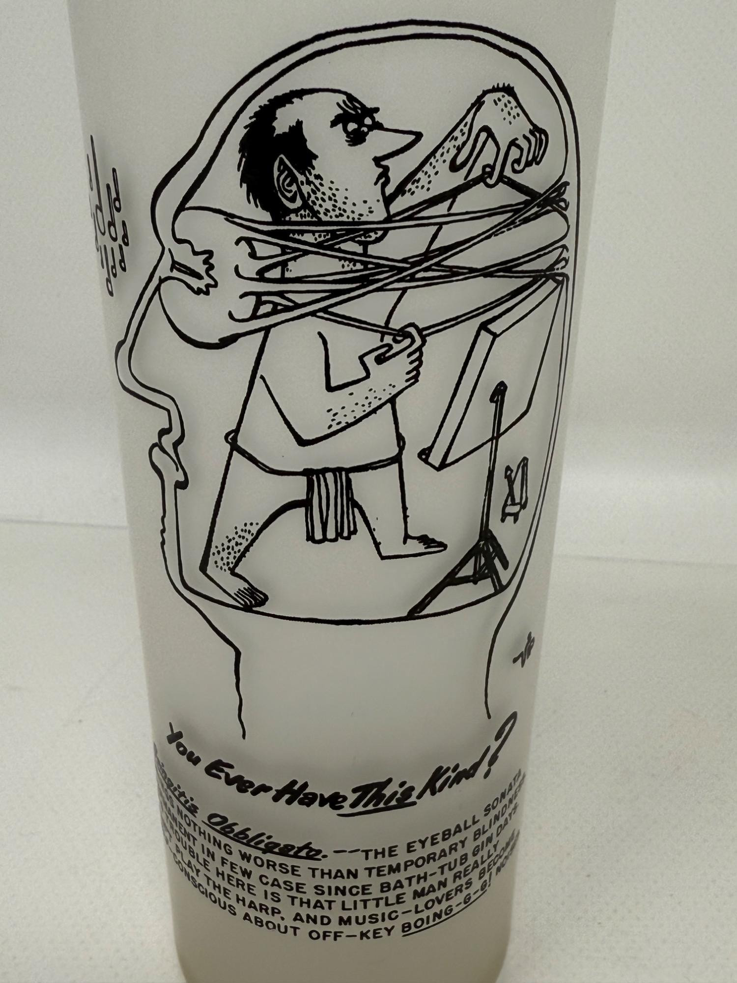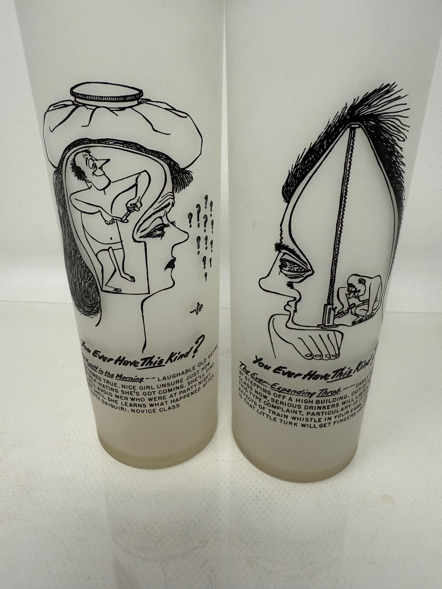 Six Vintage 1950's Virgil Partch Frosted Hiballs "Headache" glasses with graphic art.