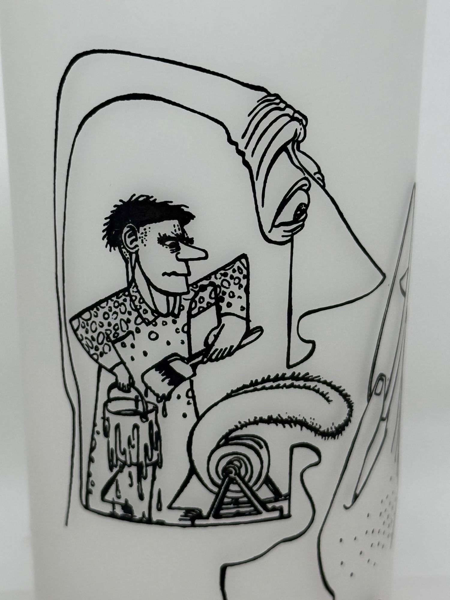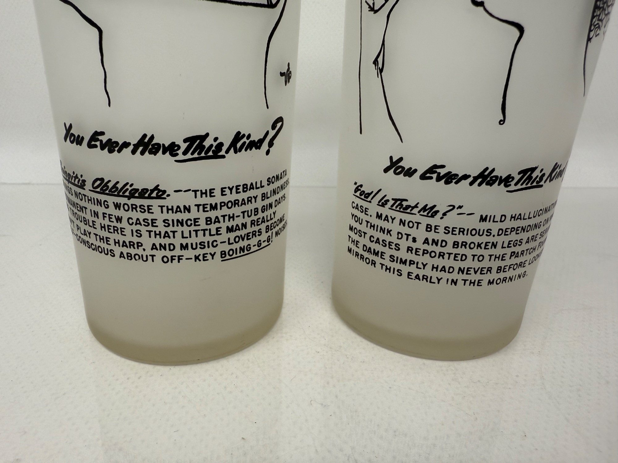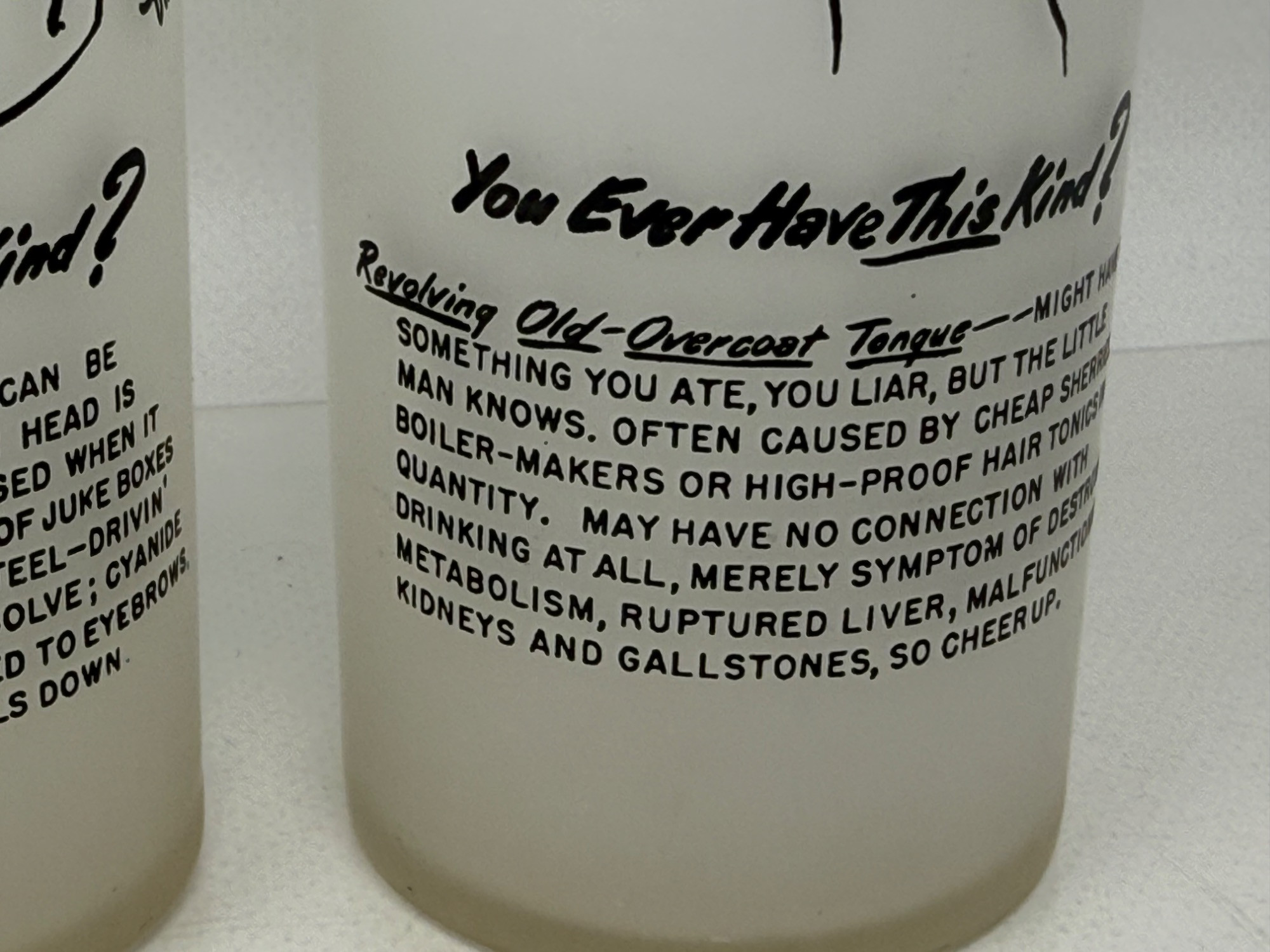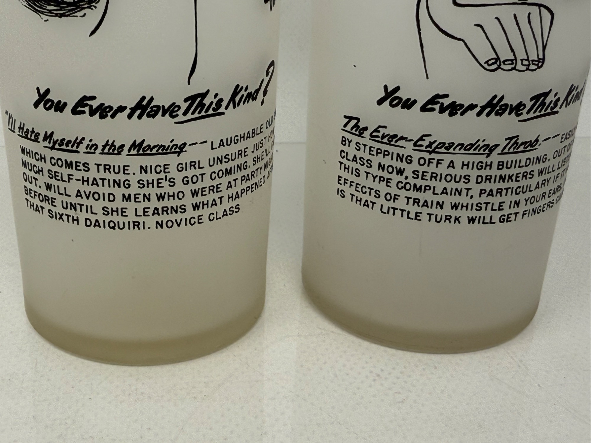 Six Vintage 1950's Virgil Partch Frosted Hiballs "Headache" glasses with graphic art.