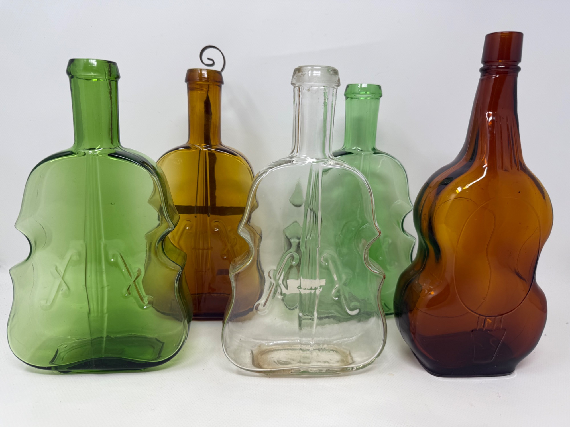 Large violin bottles. Clear, green, amber. One hook included. Average is 11in tall. Vintage styles bottle rims. One is a vintage liqueur bottle