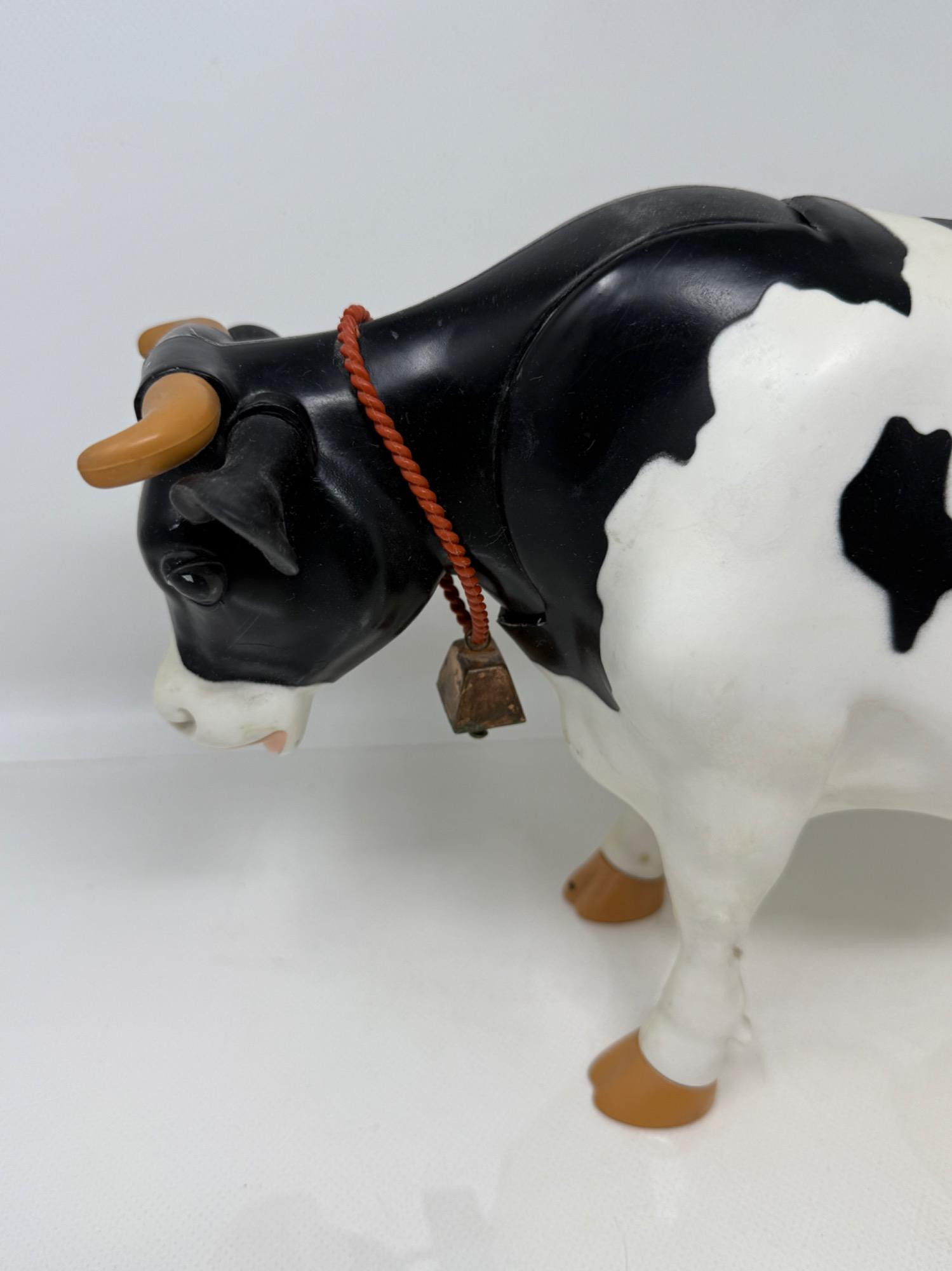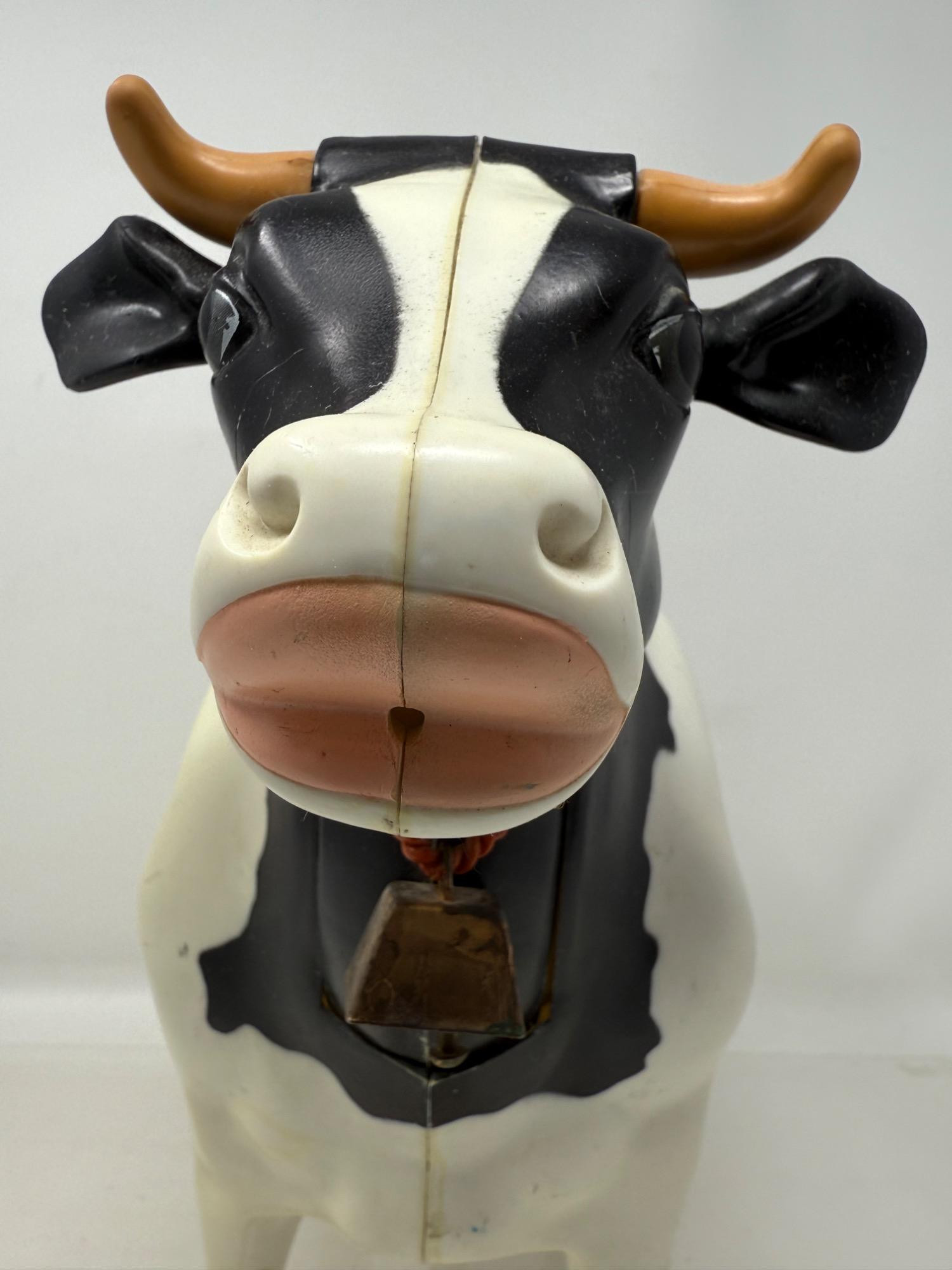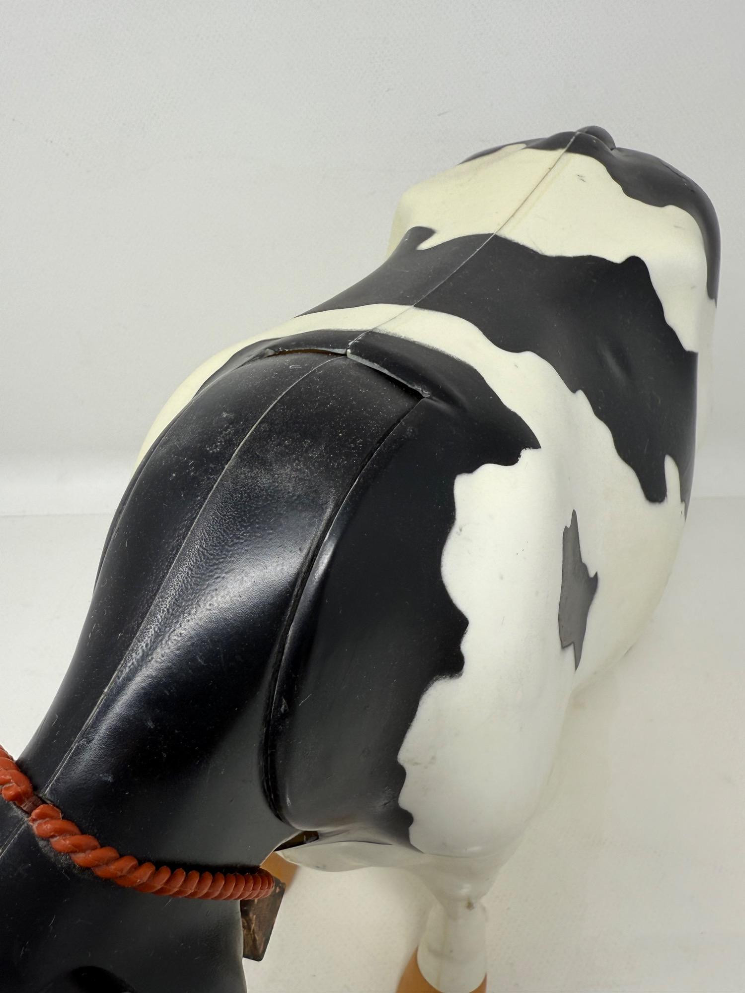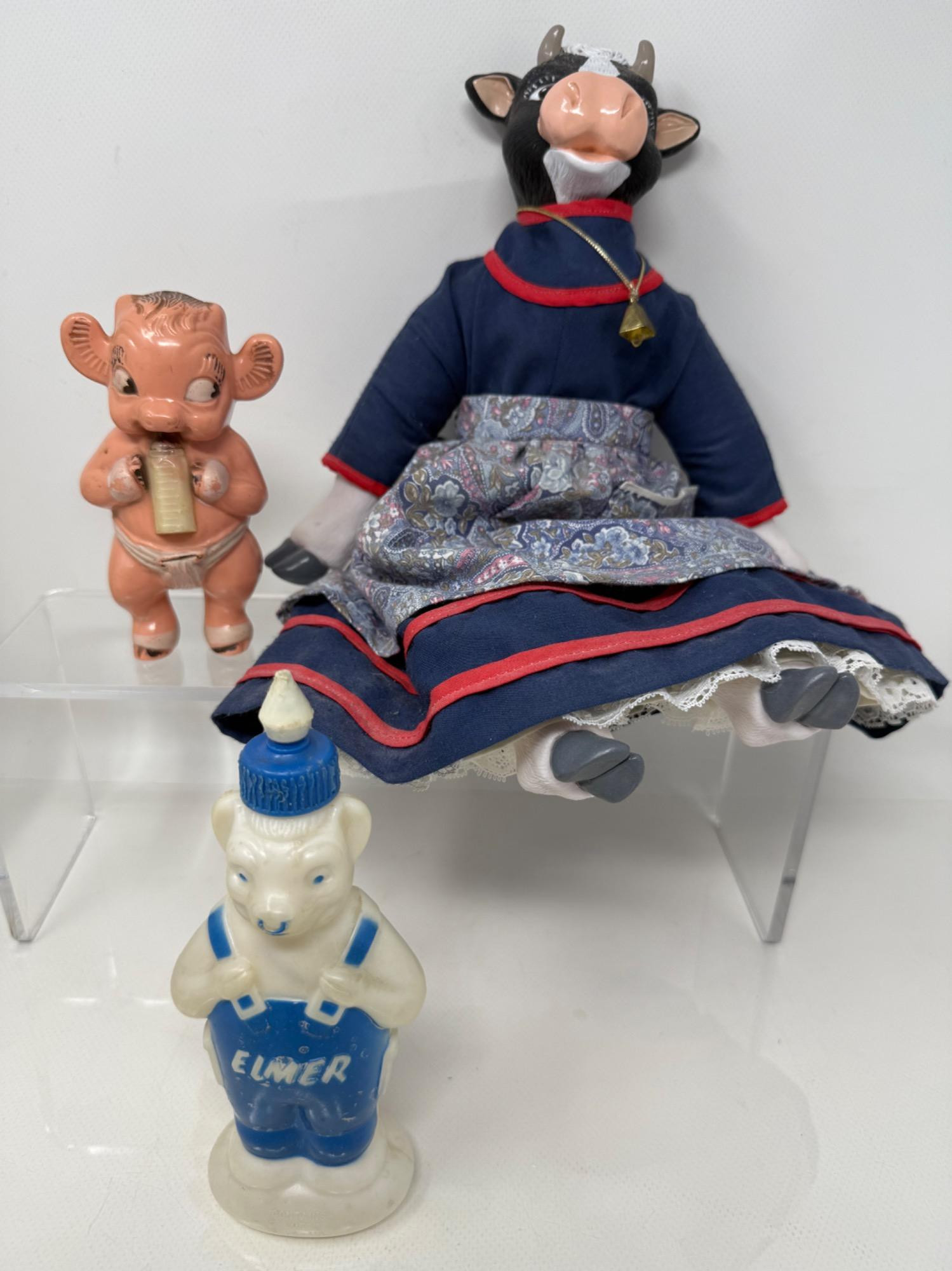 Large plastic milk cow with rubber udders. Appears to replicate milking a cow. Elsie rag doll with plastic face and hoofs. "Irwin" Borden plastic cow with hinged body.