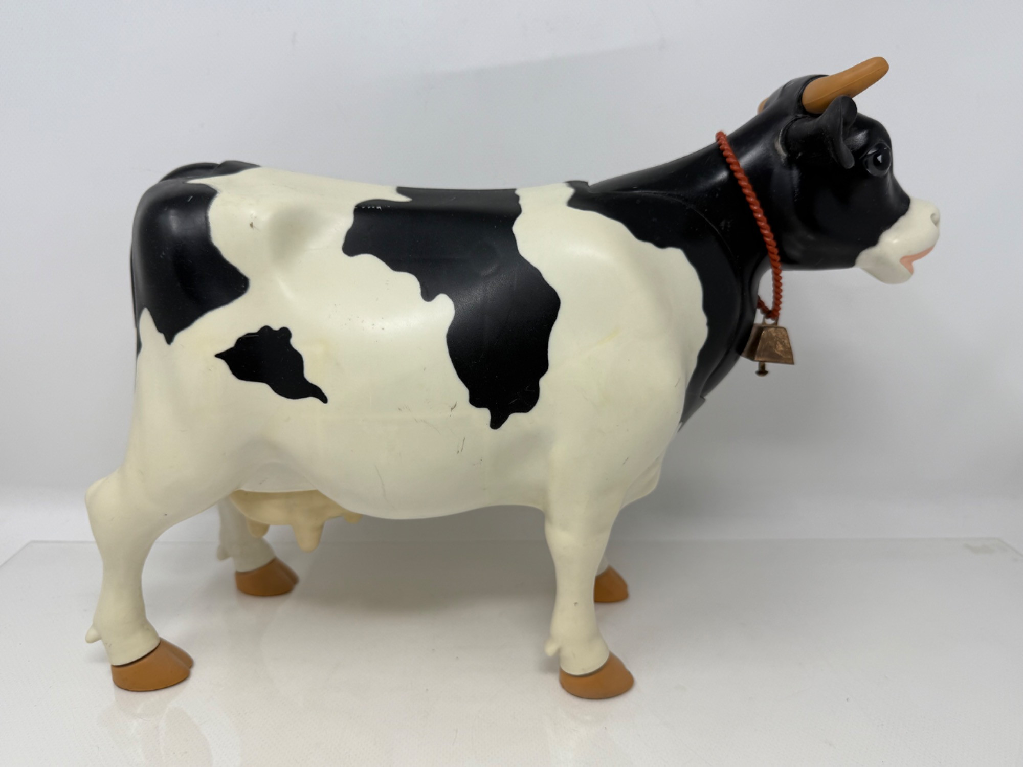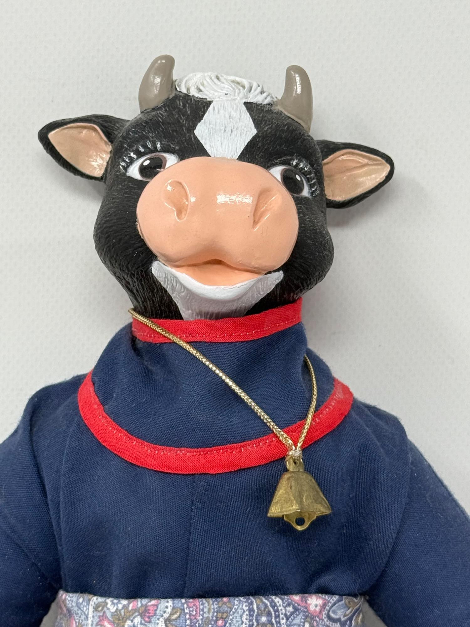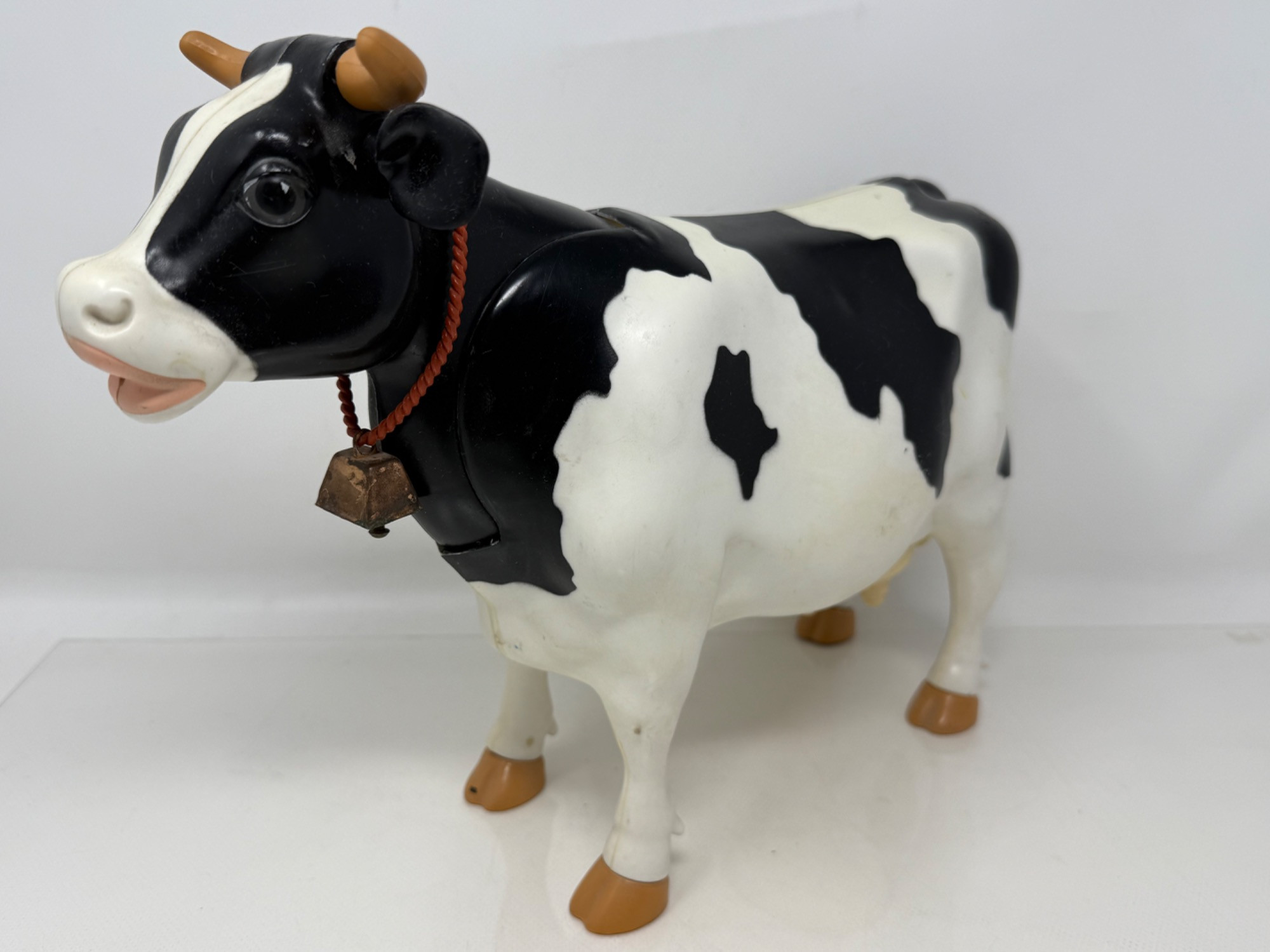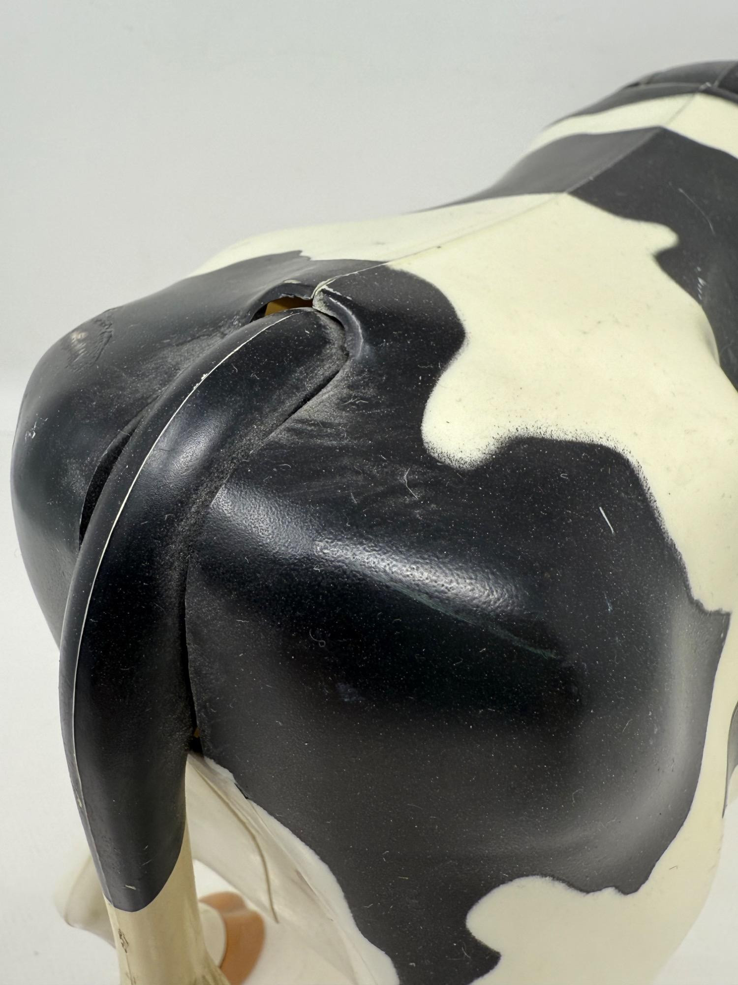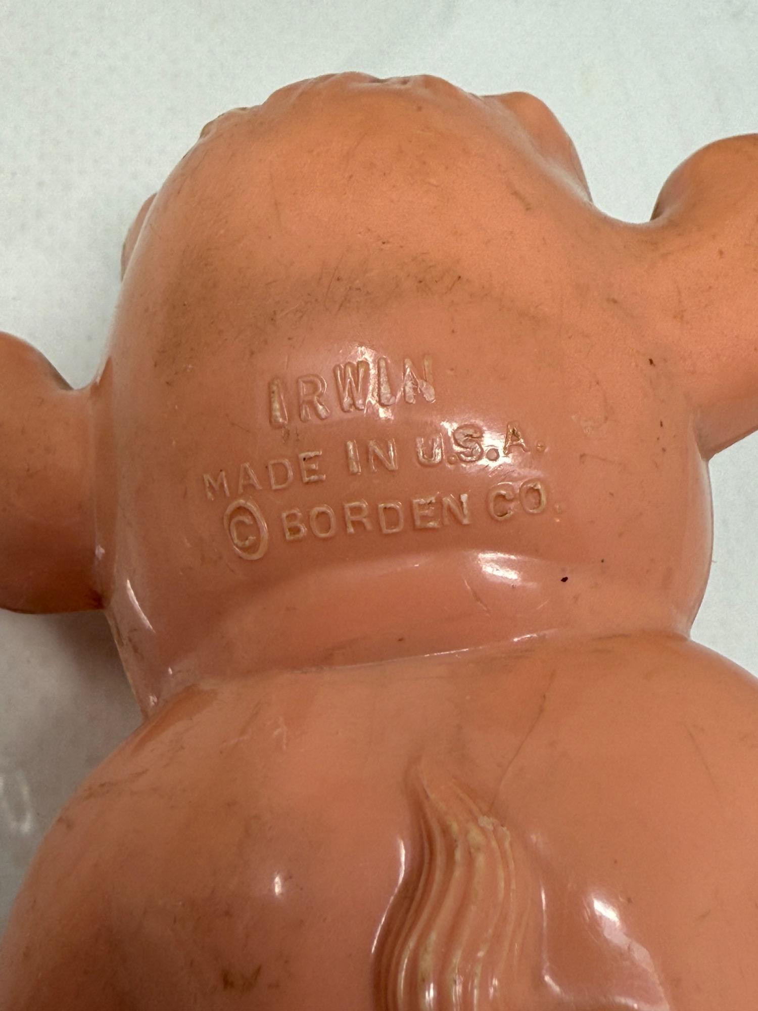 Large plastic milk cow with rubber udders. Appears to replicate milking a cow. Elsie rag doll with plastic face and hoofs. "Irwin" Borden plastic cow with hinged body.