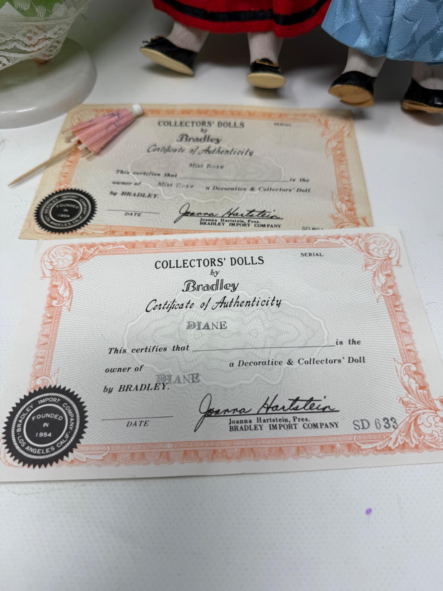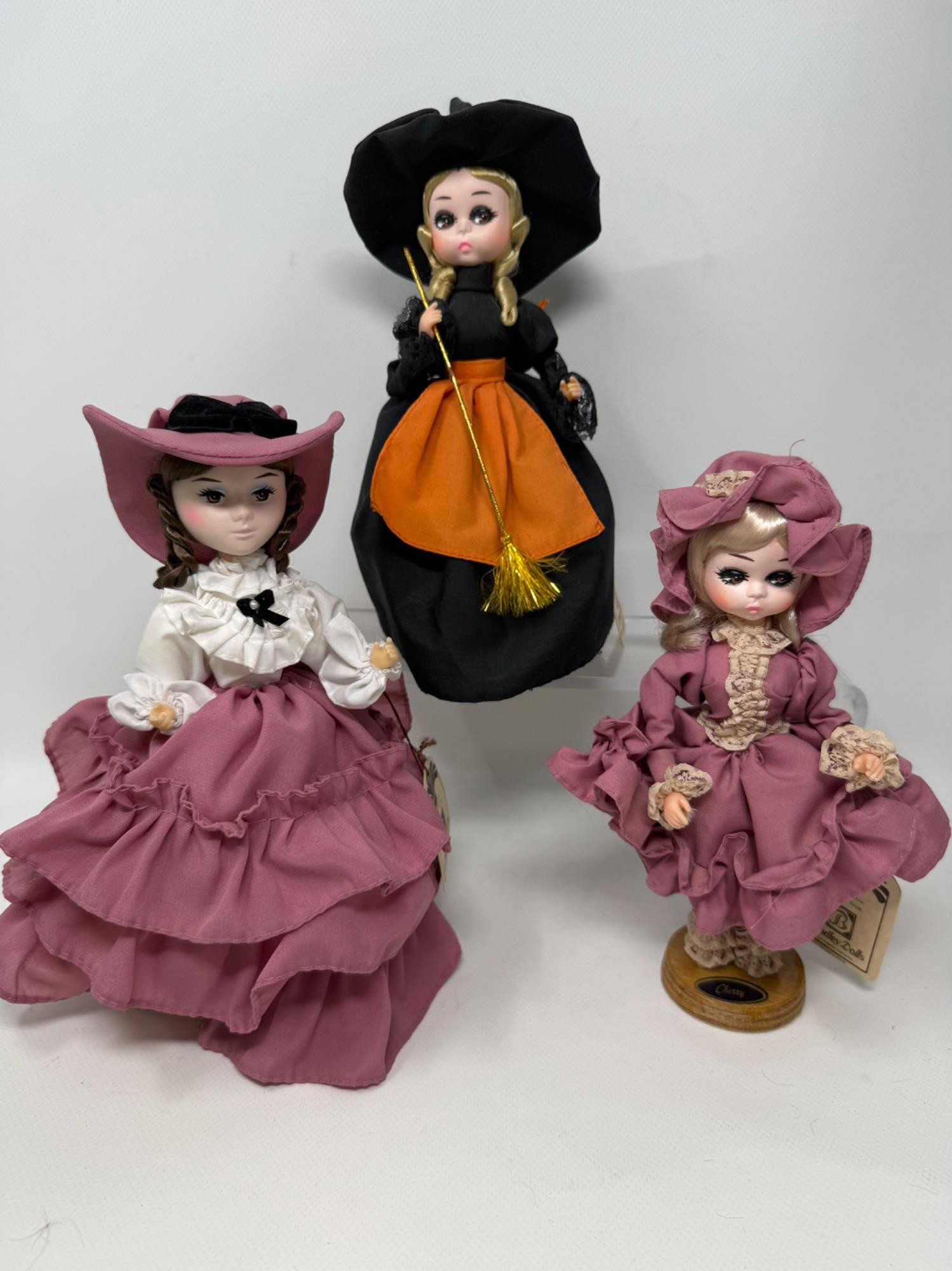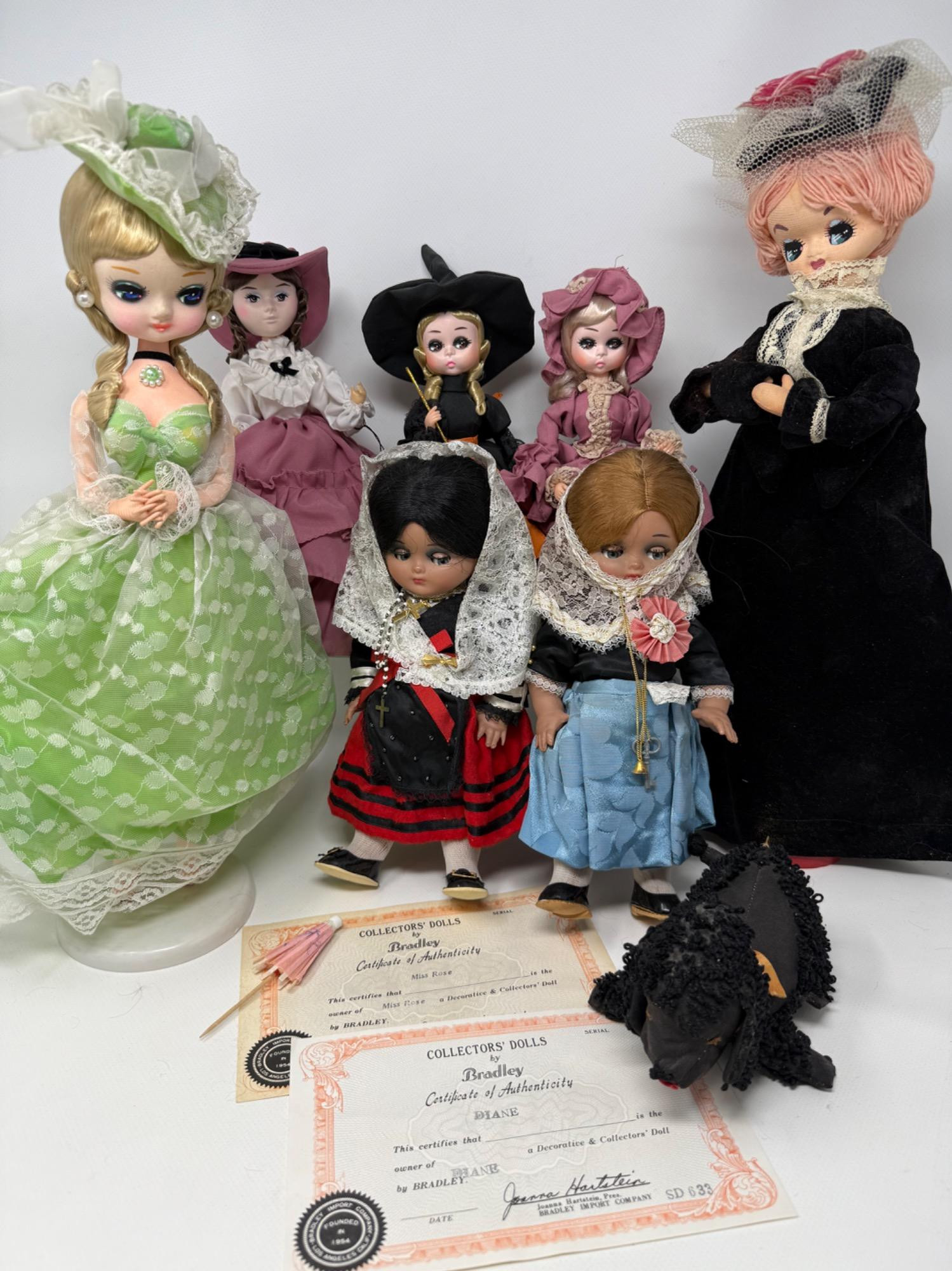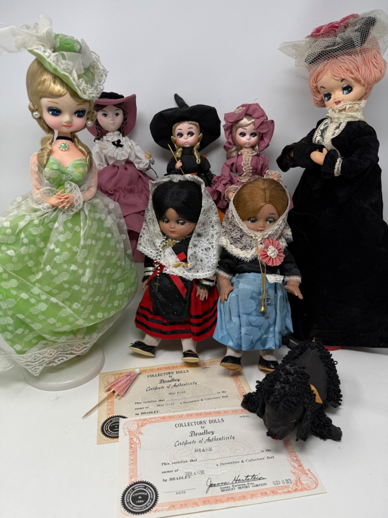 7 Bradley Dolls and 2 International Dolls. Two Madame Alexander Dolls with cultural dresses. Sleepy eye function. Bradley dolls with wood stands and certificates. Painted faces and very detailed clothing. Tallest is 17in.
