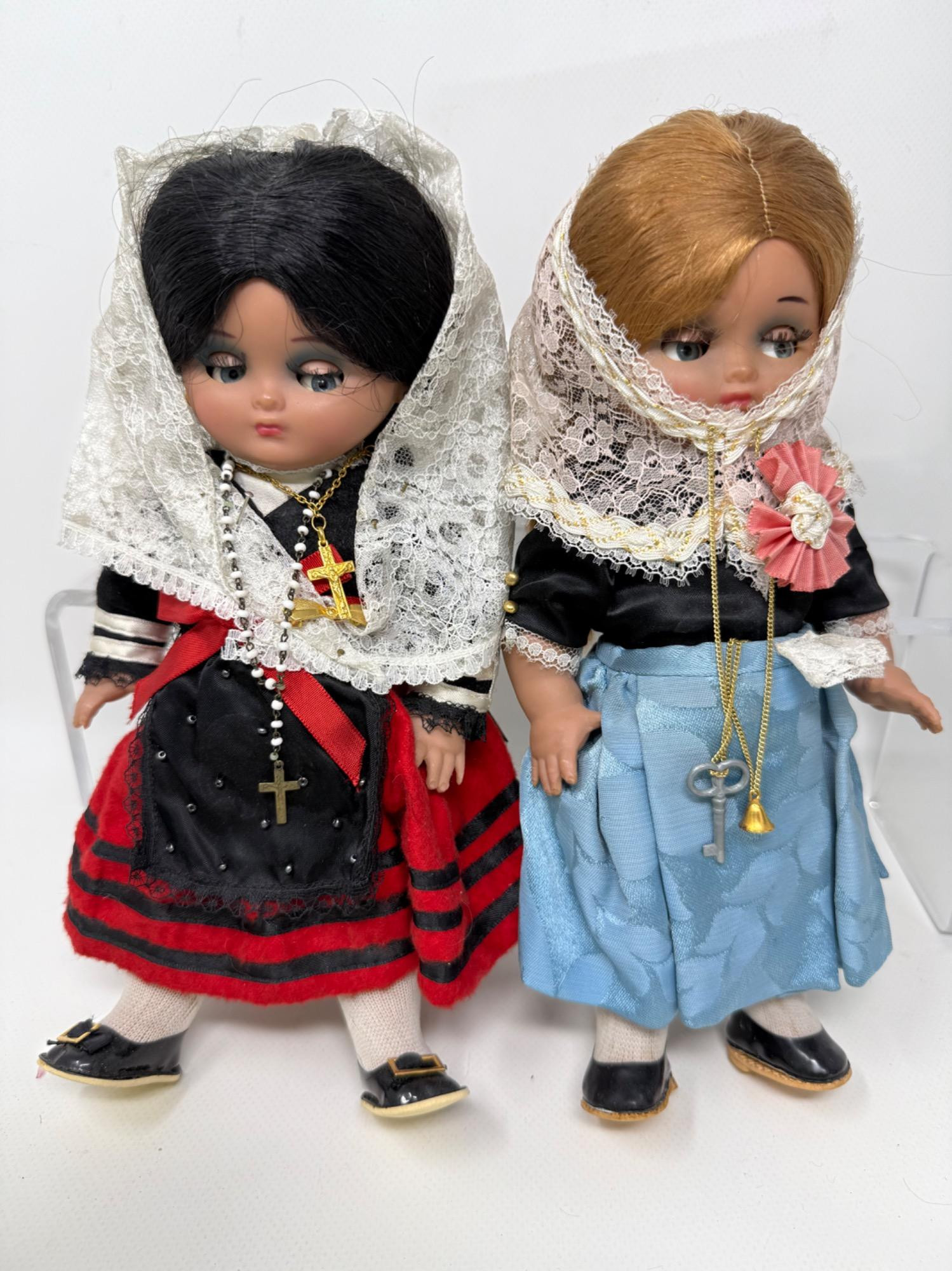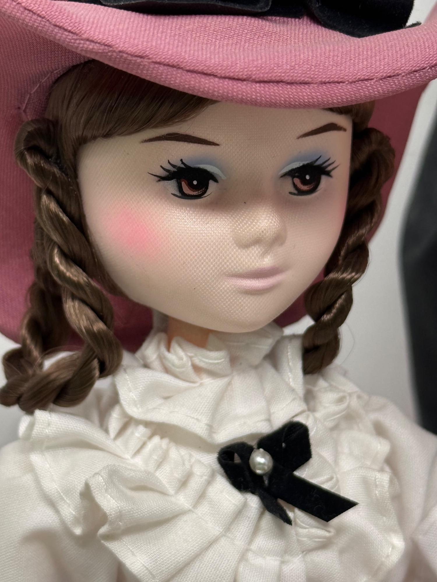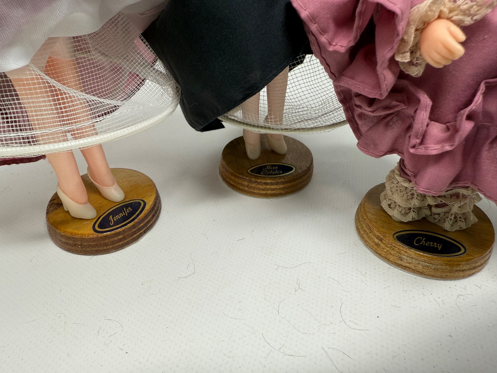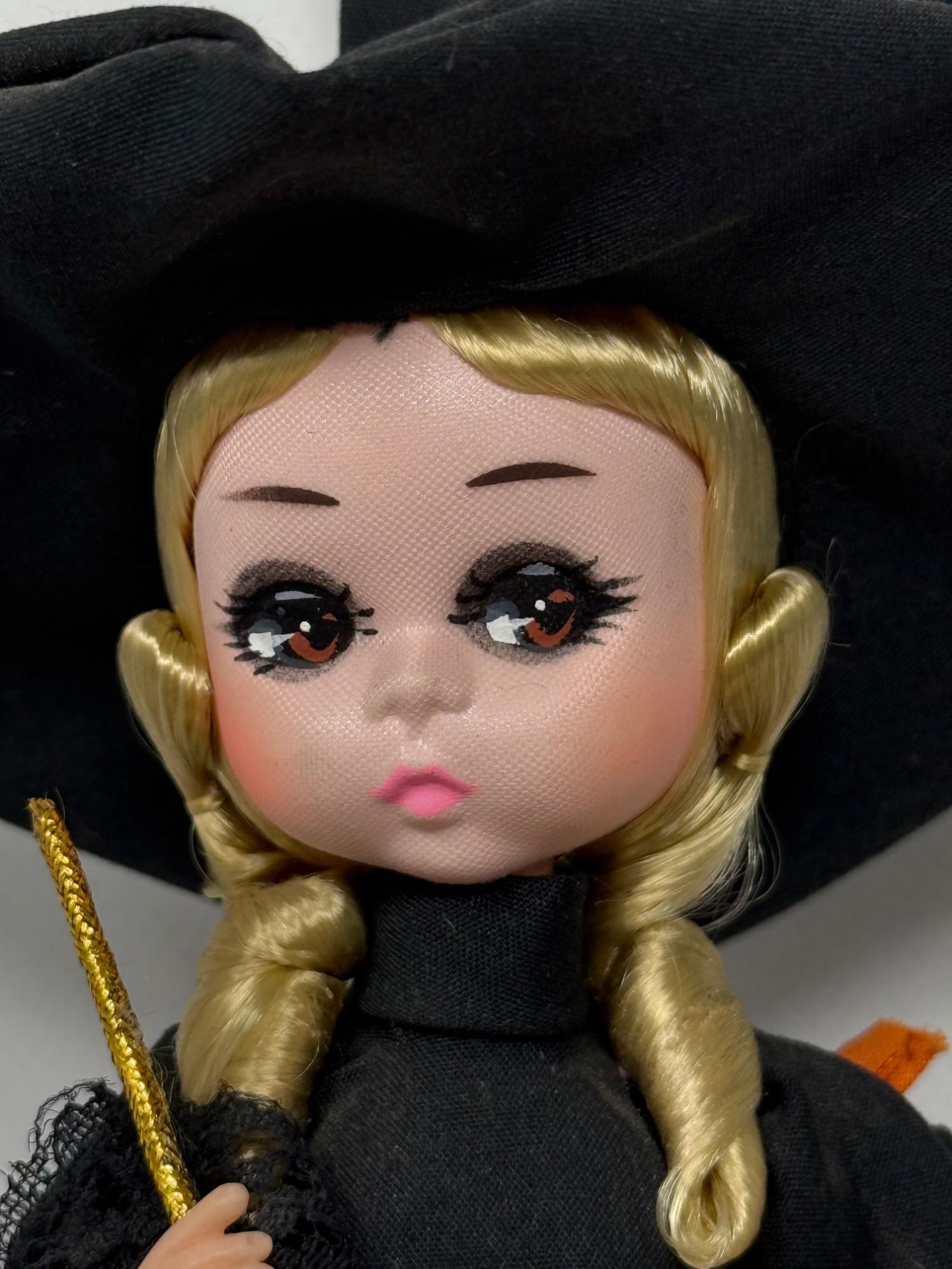 7 Bradley Dolls and 2 International Dolls. Two Madame Alexander Dolls with cultural dresses. Sleepy eye function. Bradley dolls with wood stands and certificates. Painted faces and very detailed clothing. Tallest is 17in.