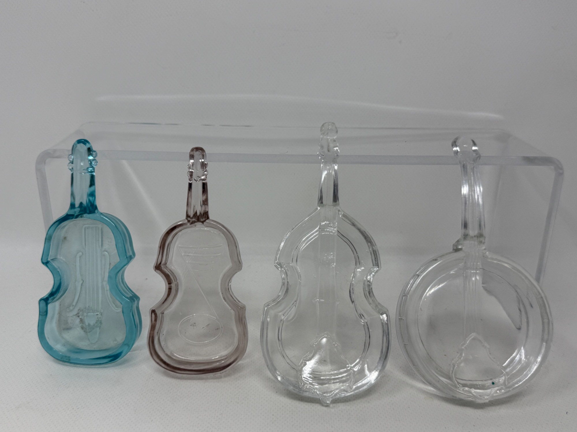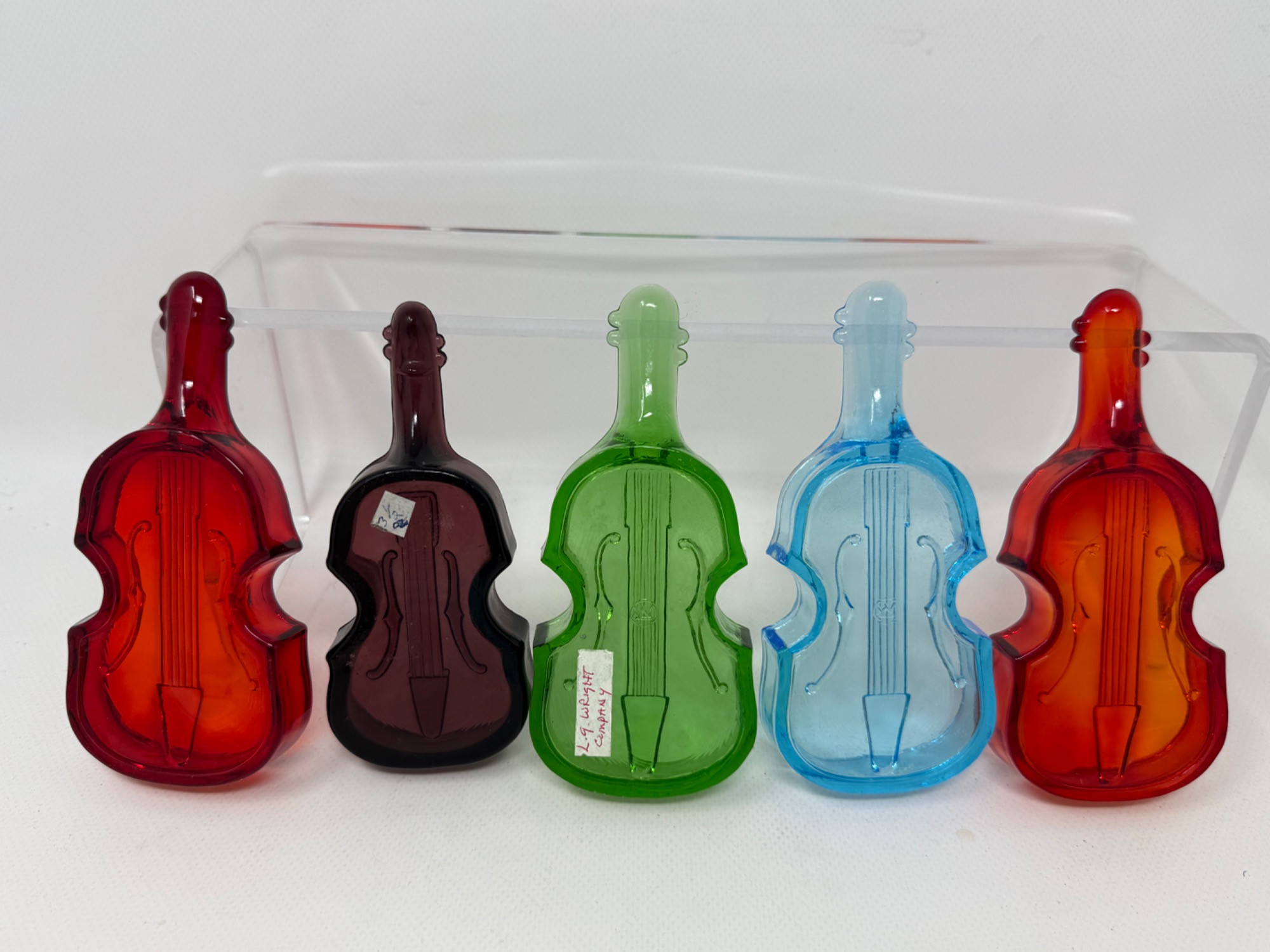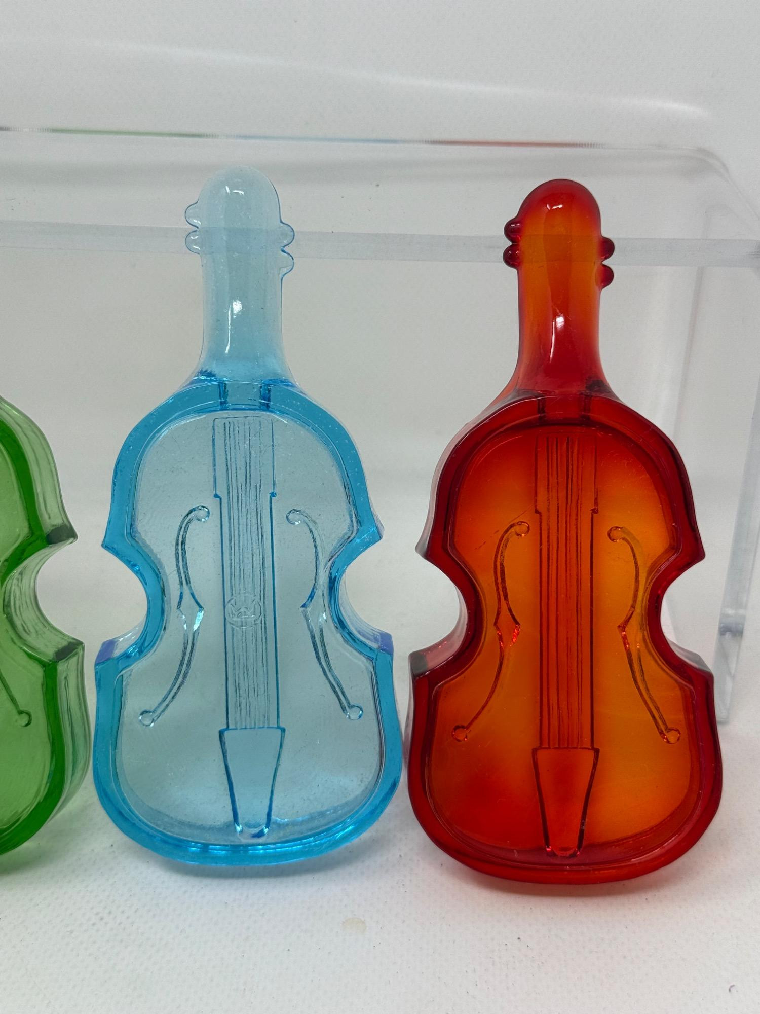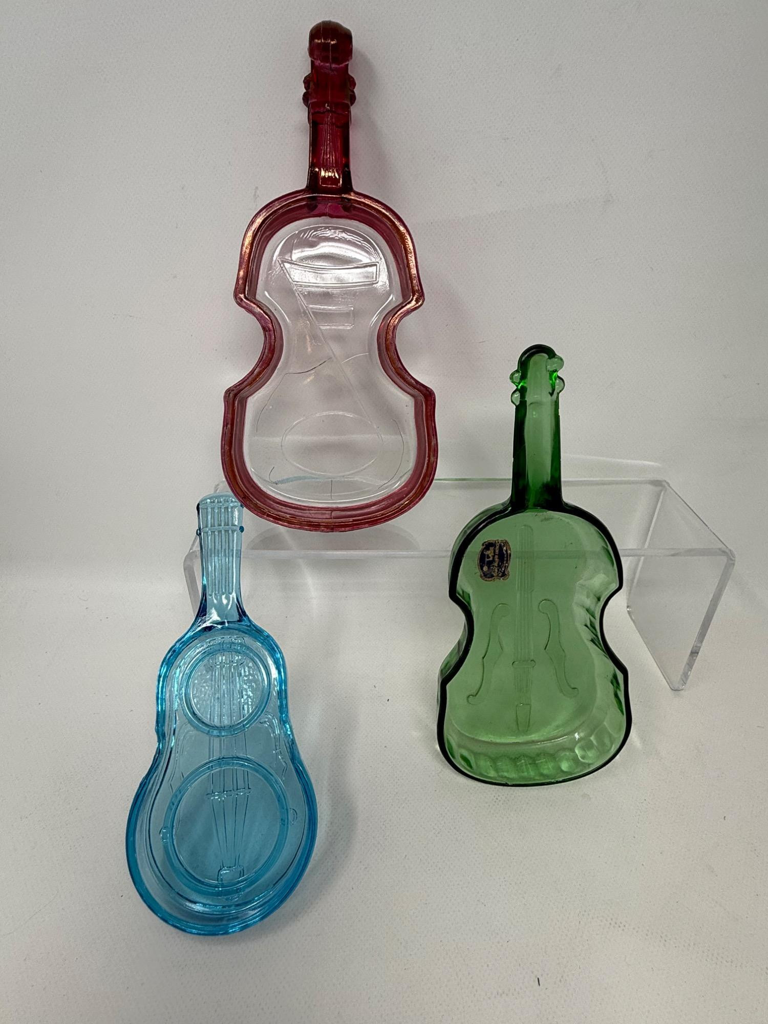 Several Violin Bottle Ashtrays and Candy Dishes Assorted styles and glass compositions. Largest size-10.5in tall, 4.5in wide