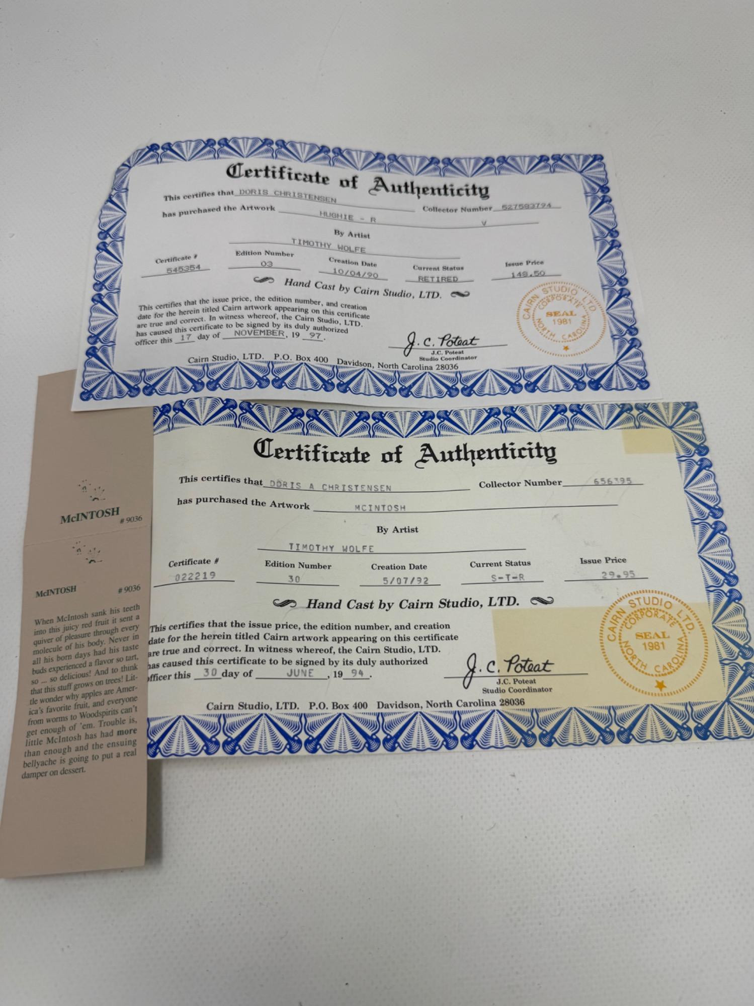 Thomas Clark hand carved resin characters. Hughie and MacIntosh. Includes certificates 7.5 and 4in tall