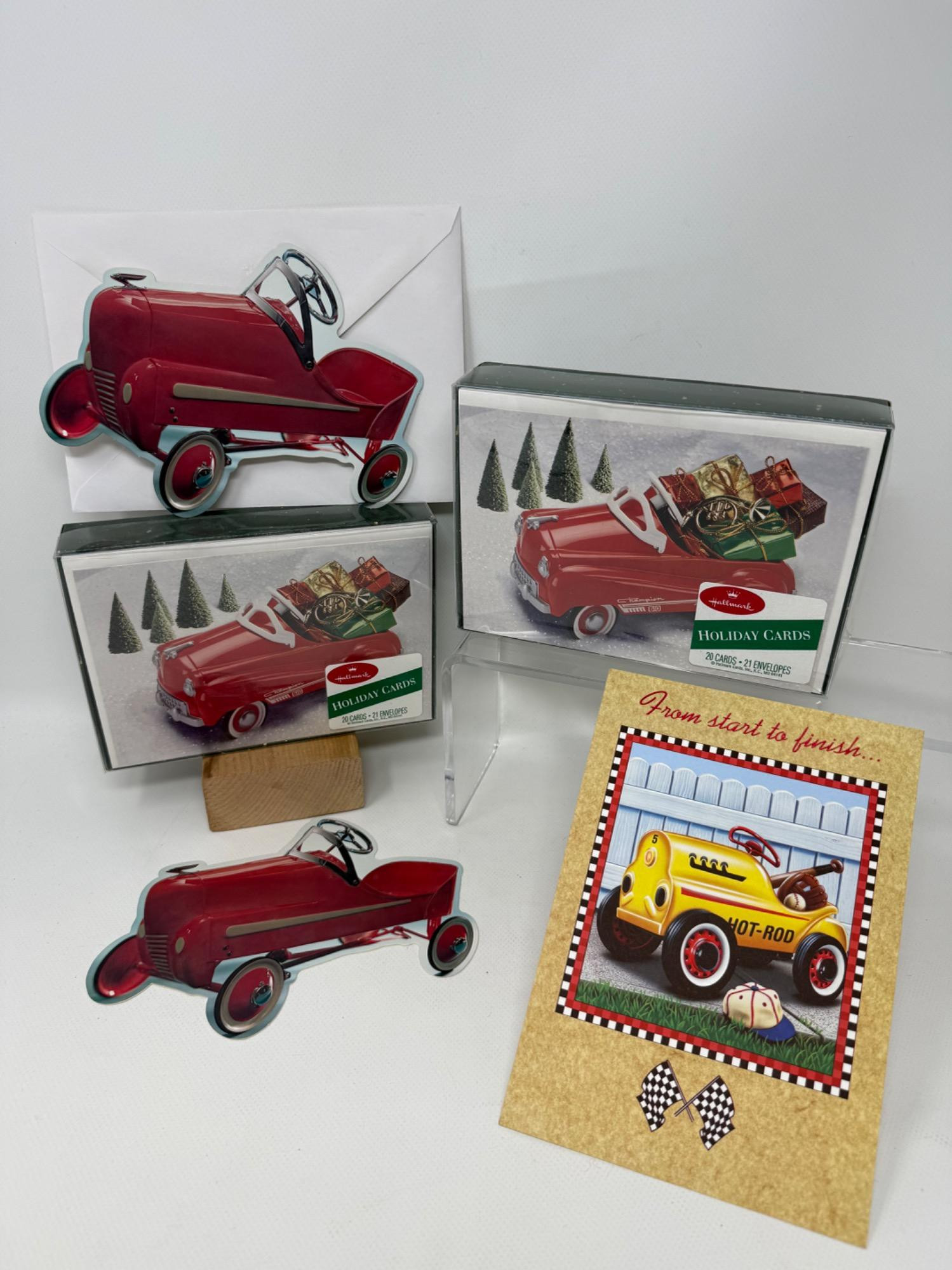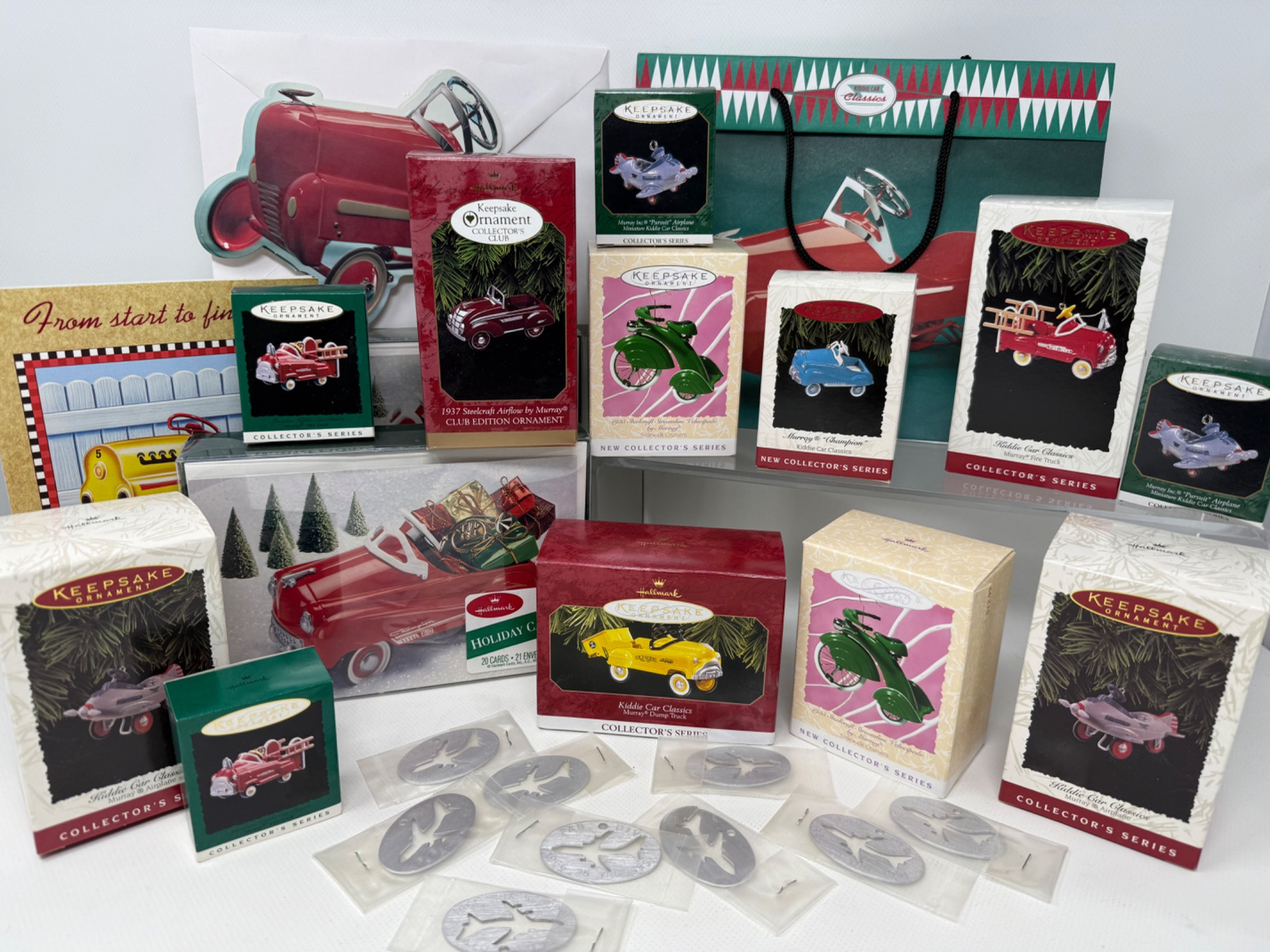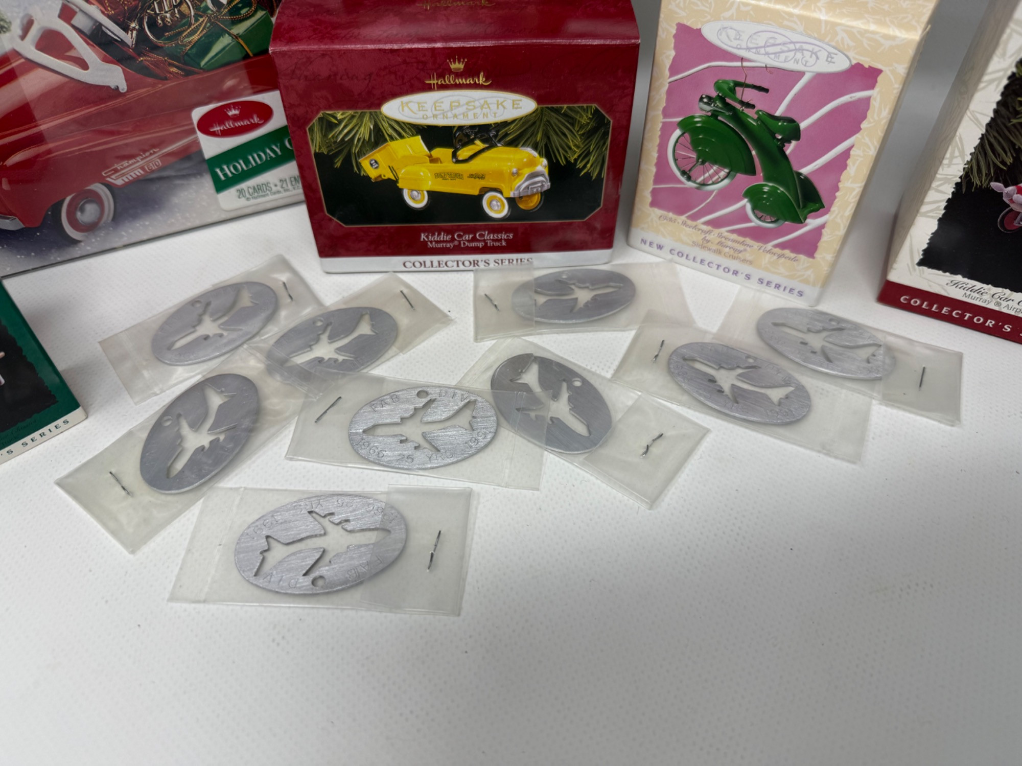 Several Vintage Hallmark Kiddie Car Ornaments. Holiday cards, cards, metal cut-outs. Metal die cast ornaments