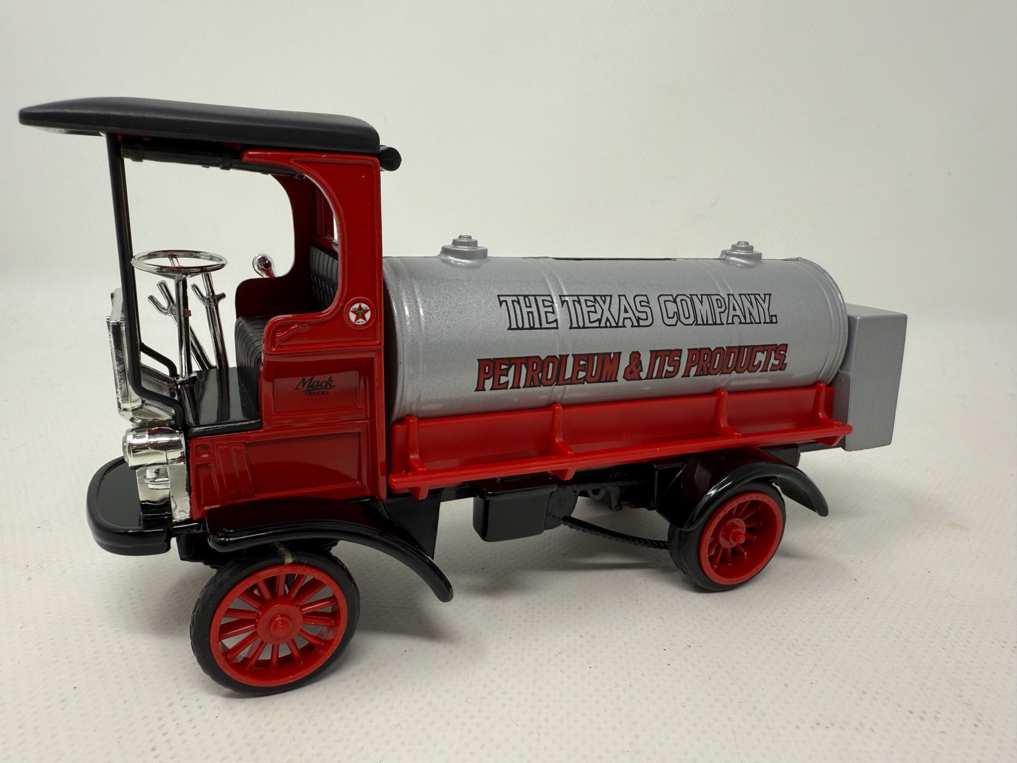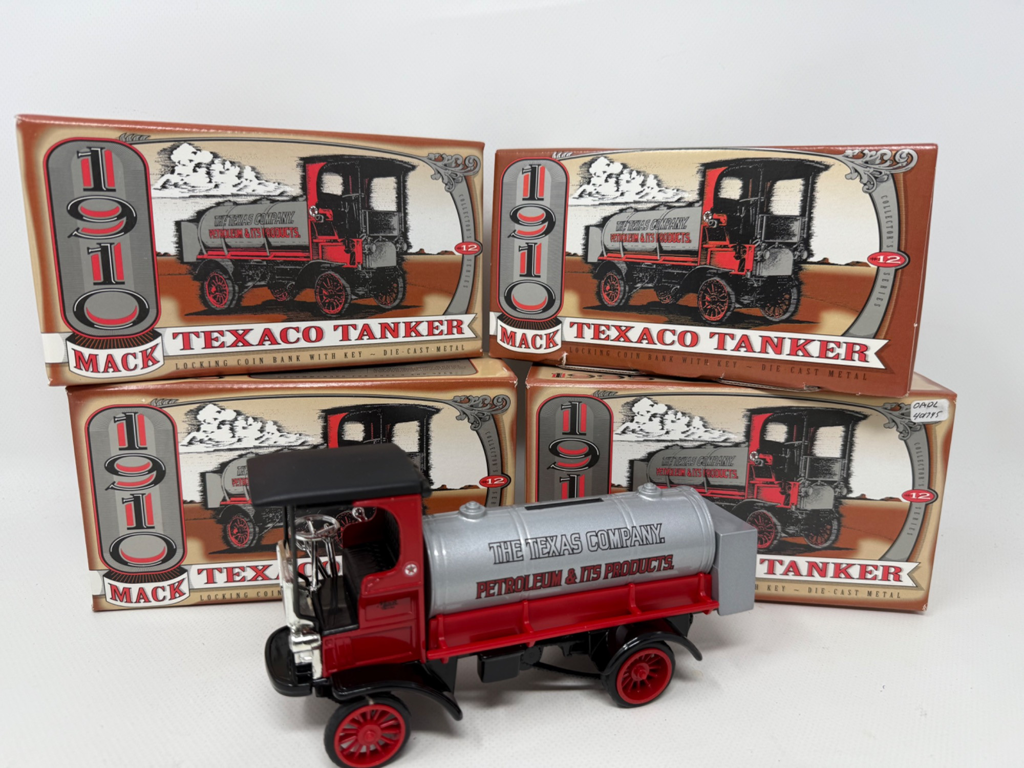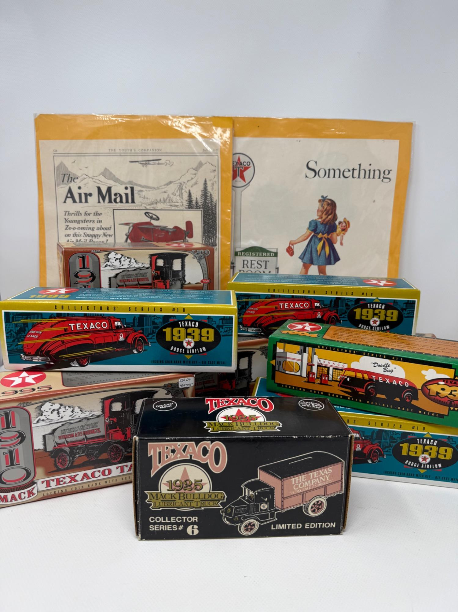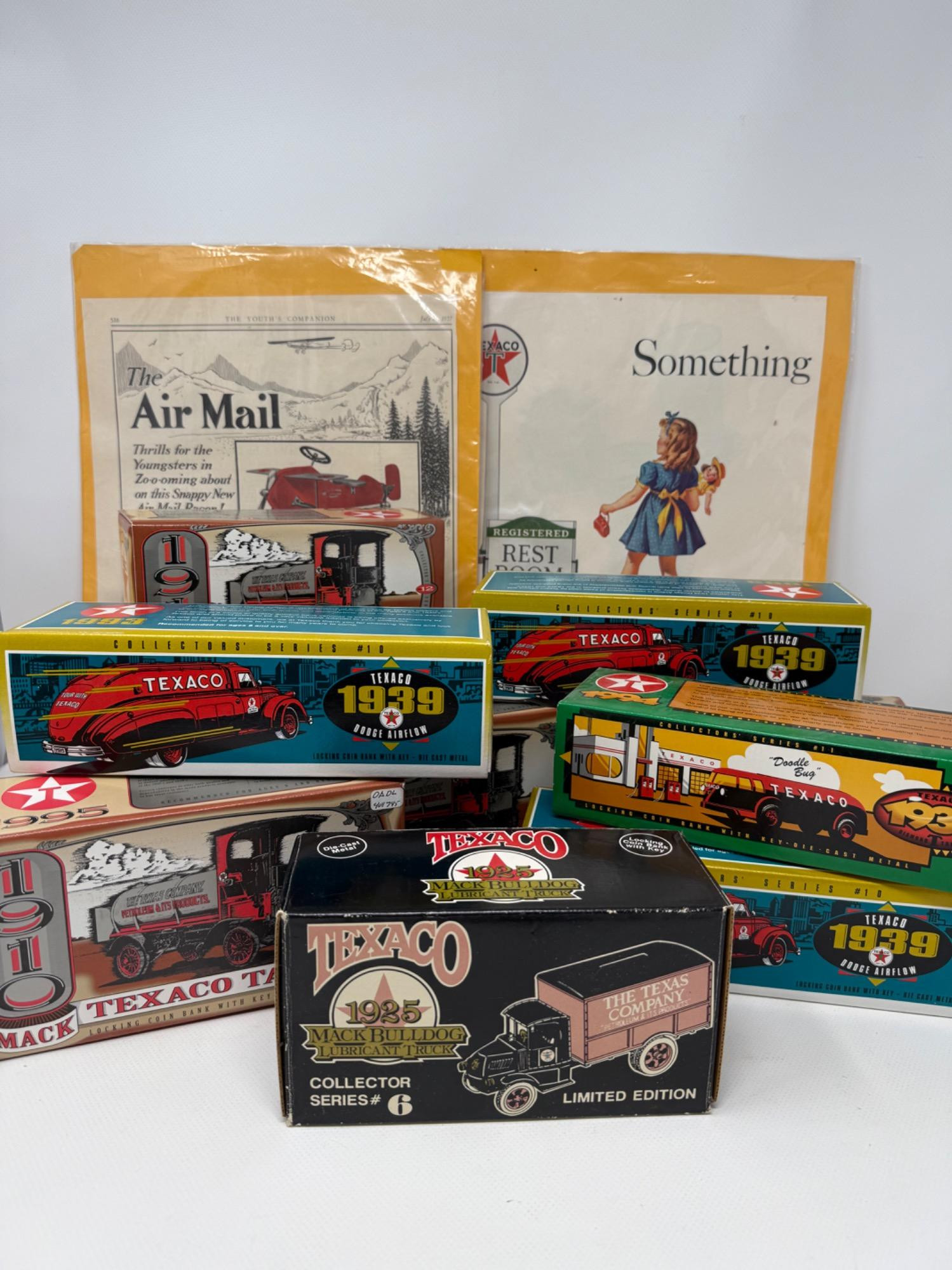 NIB collection of diecast metal trucks and tankers. Advertisement flyers. Four are identical. Some plastic components.