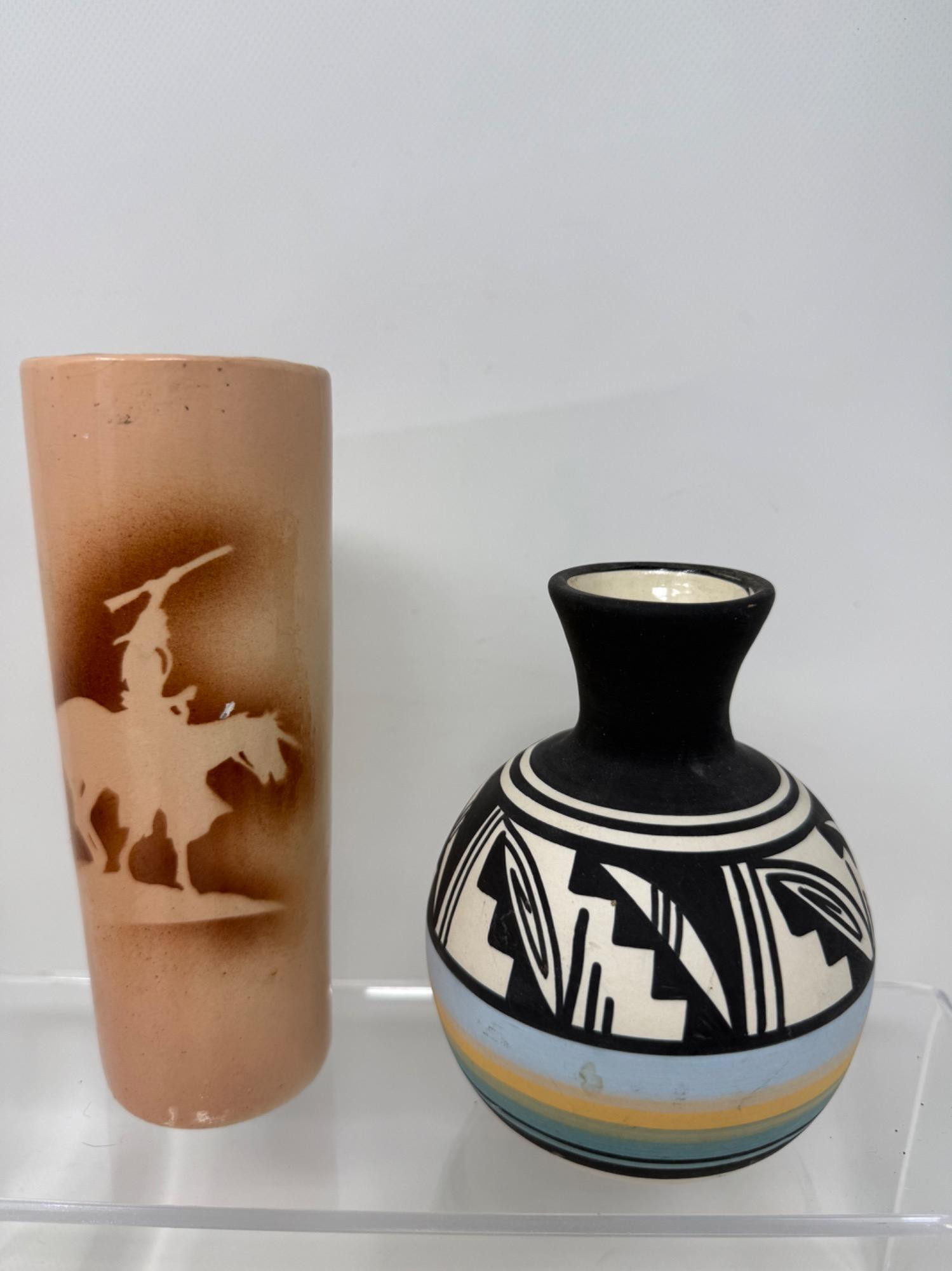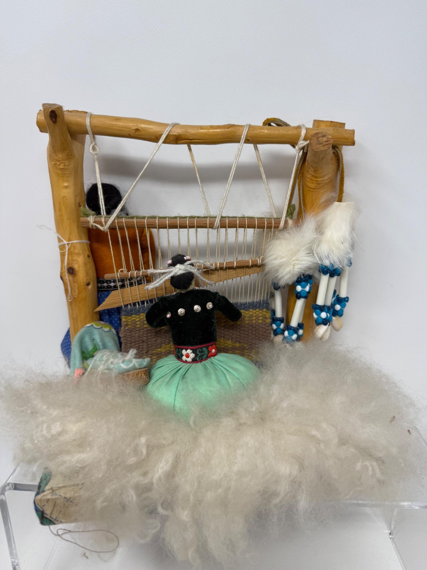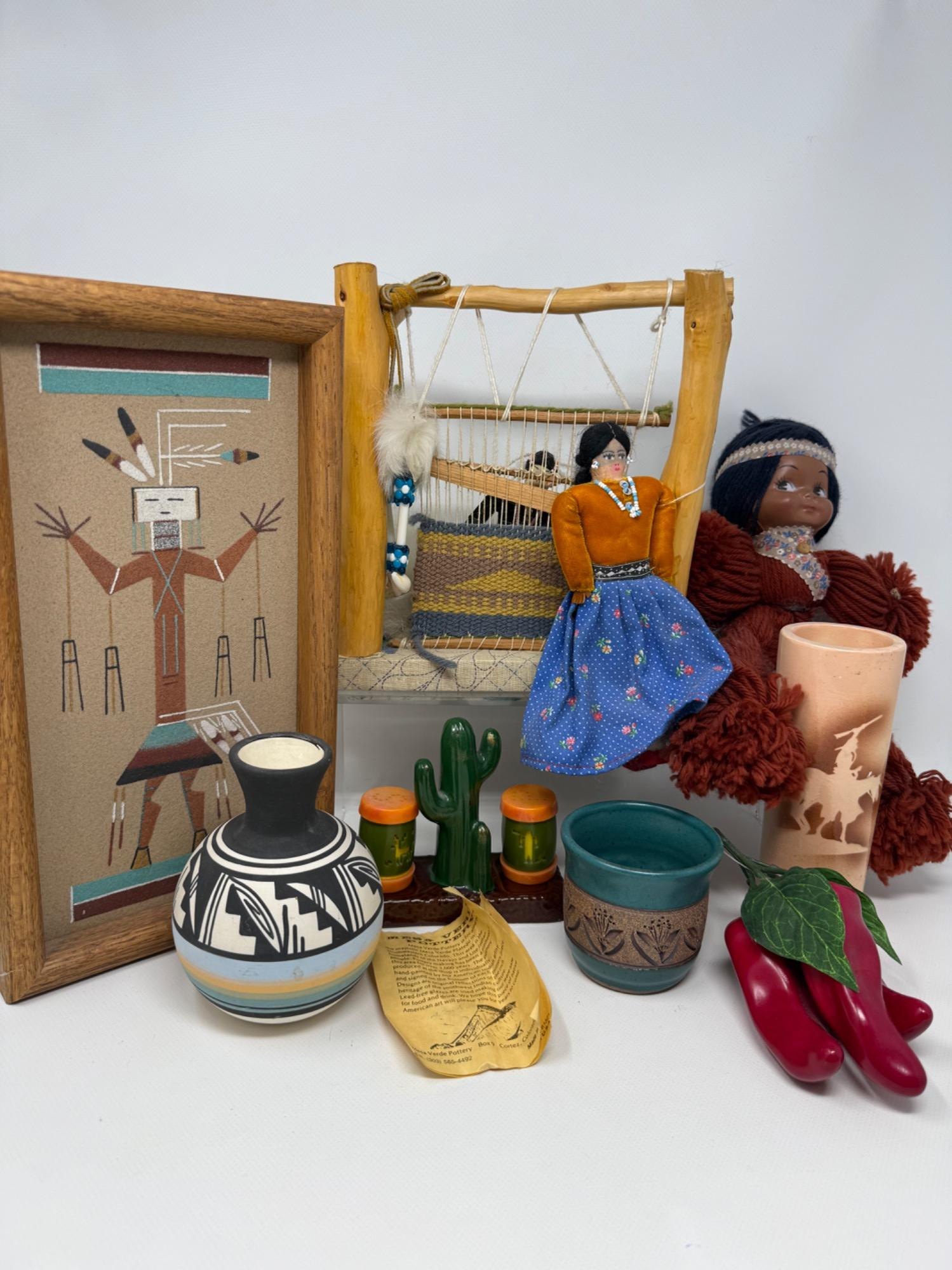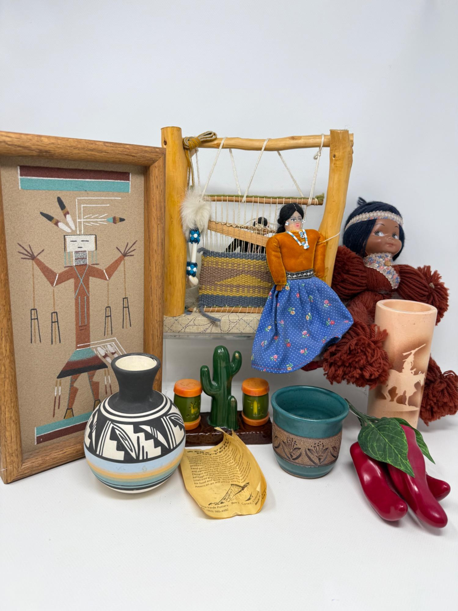 Indigenous decor and collectibles. Sand art framed Katsina doll. Pottery pot, vases. Diorama of blanket crafters. S/P shakers Tallest vase from Yakima is 7.75in tall.