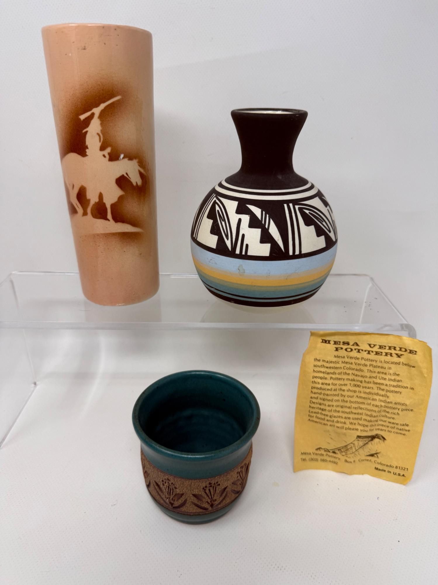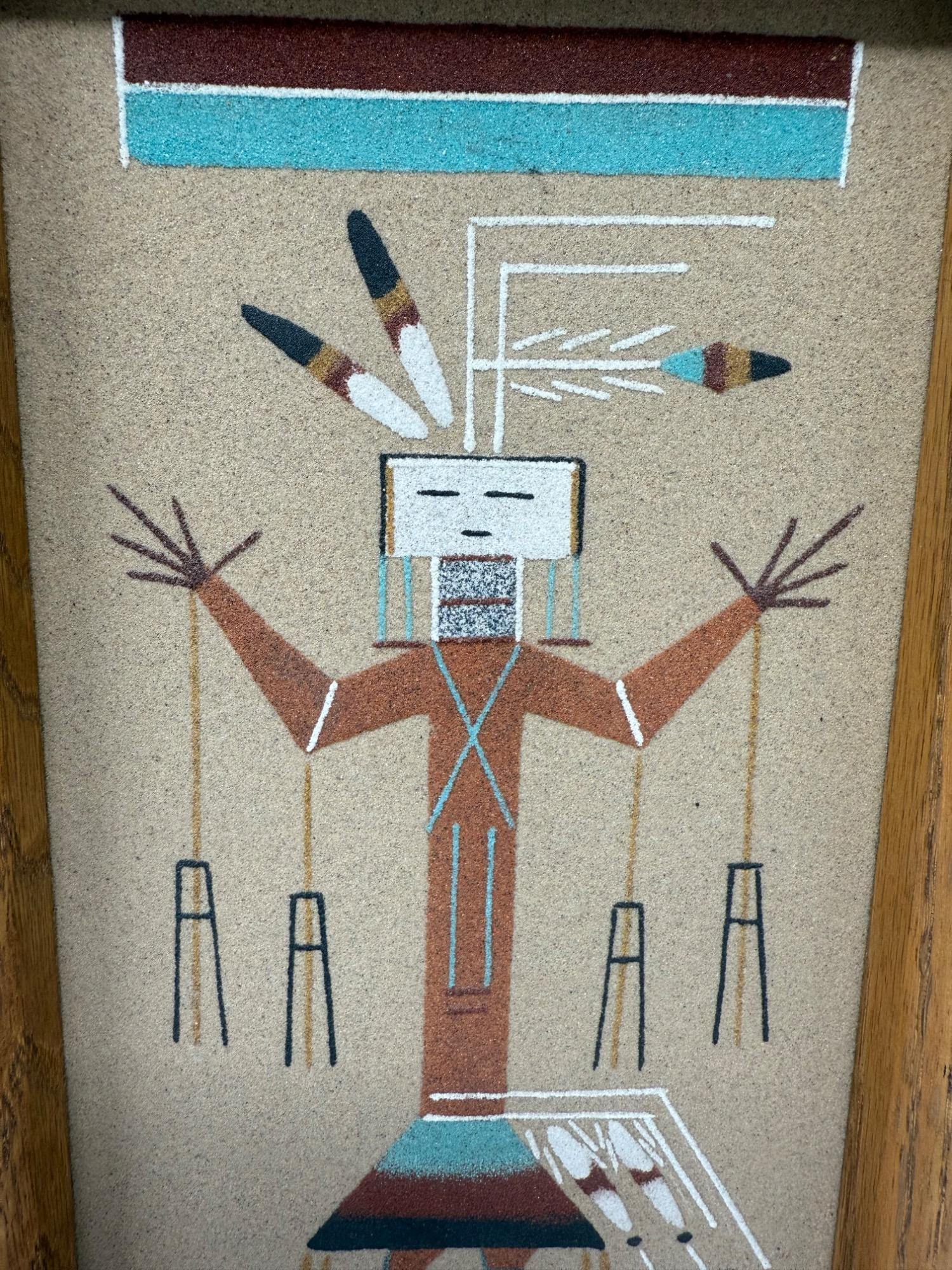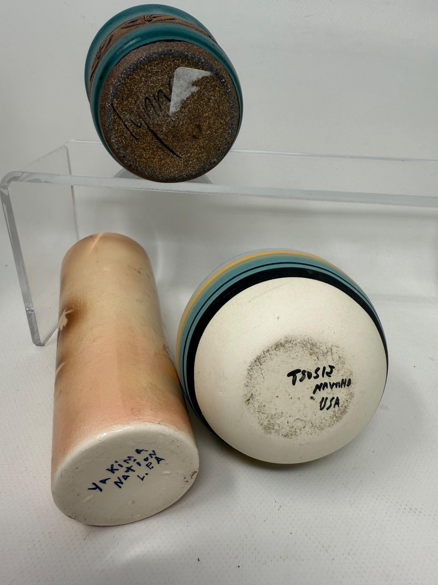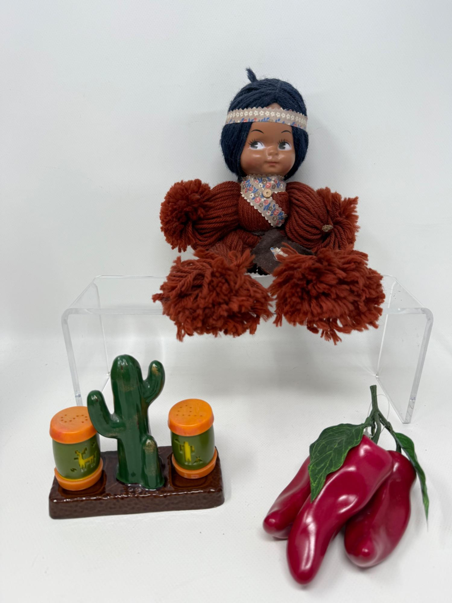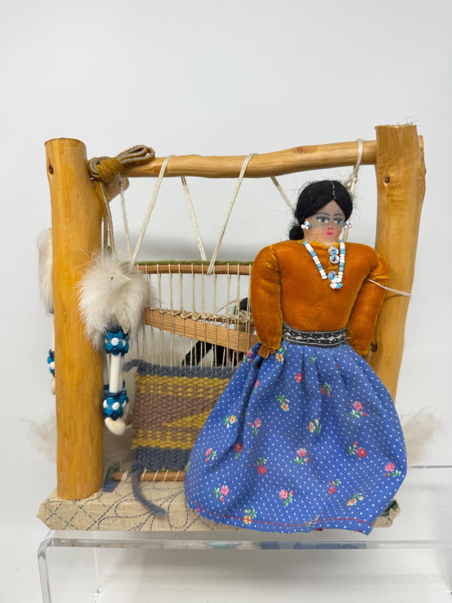 Indigenous decor and collectibles. Sand art framed Katsina doll. Pottery pot, vases. Diorama of blanket crafters. S/P shakers Tallest vase from Yakima is 7.75in tall.