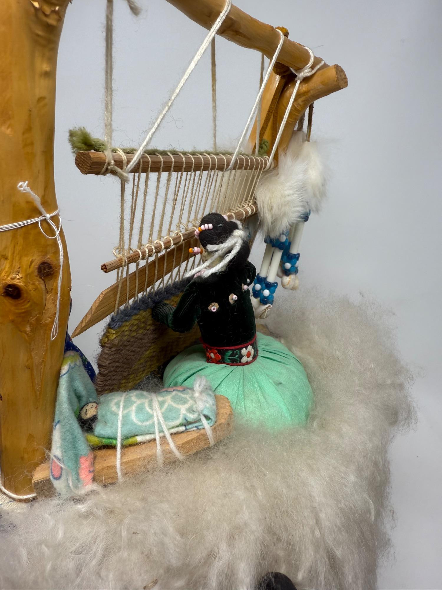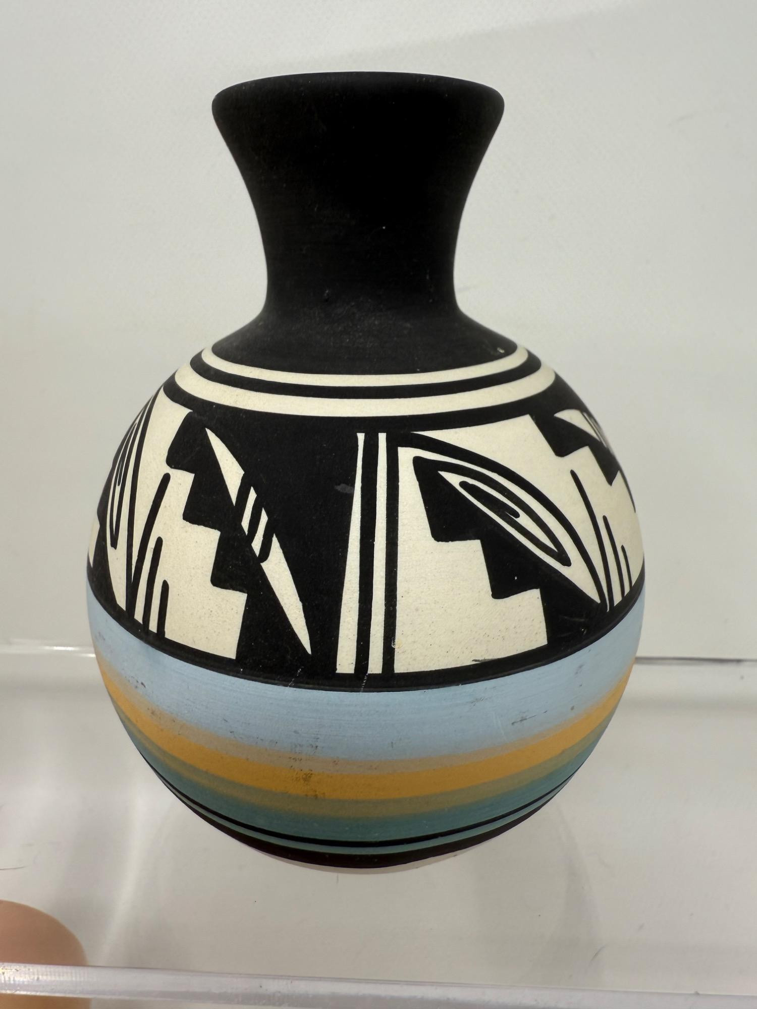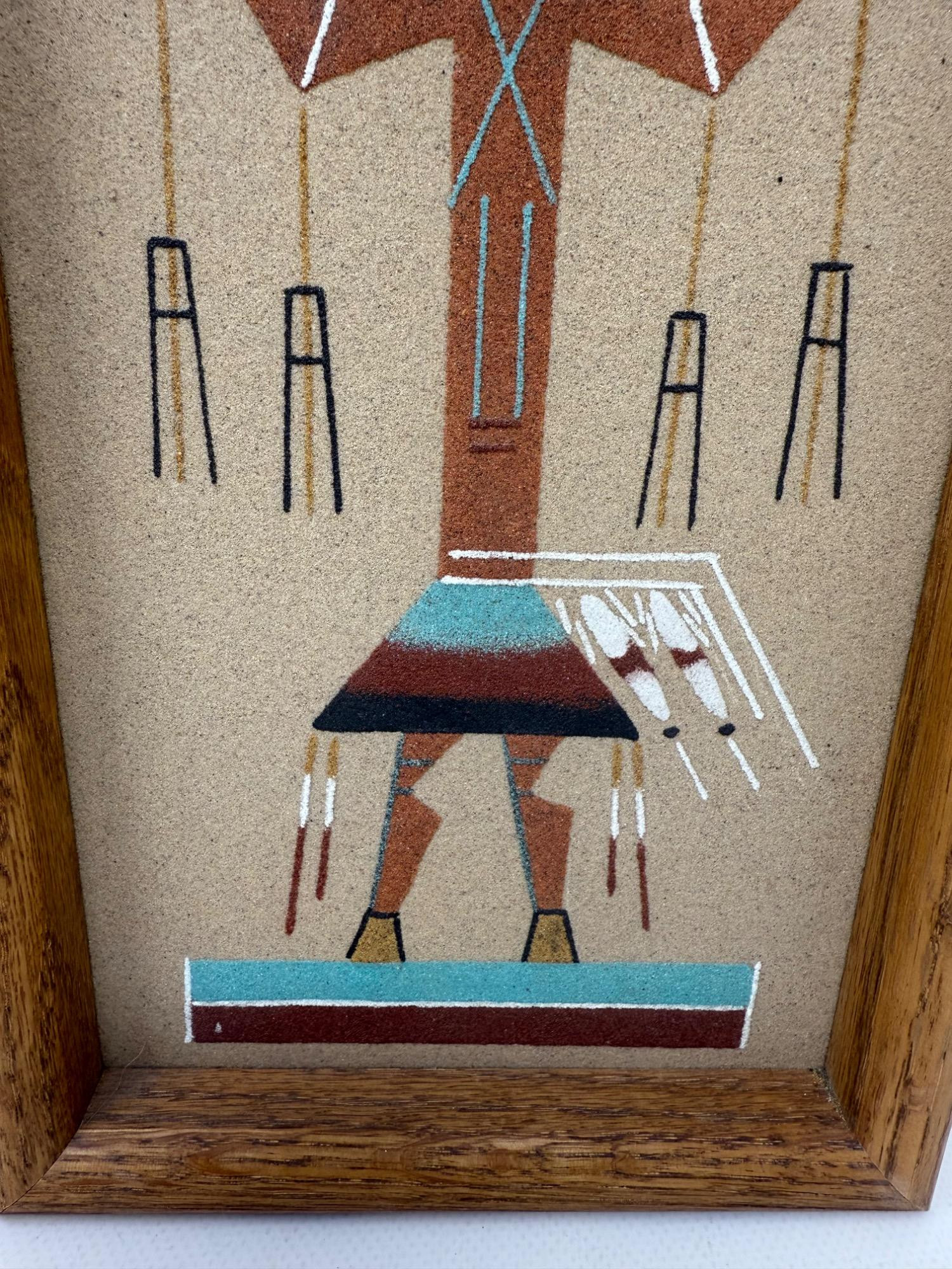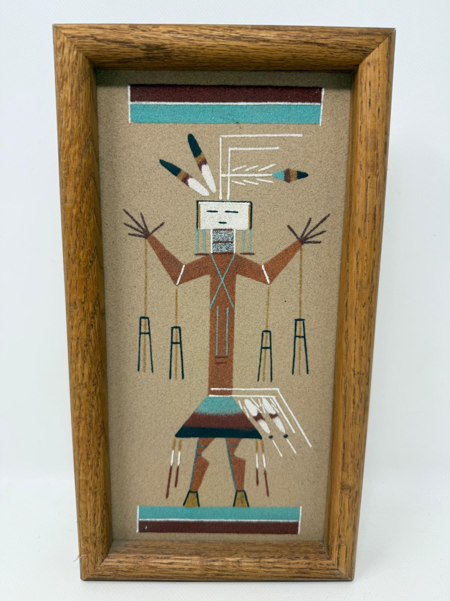 Indigenous decor and collectibles. Sand art framed Katsina doll. Pottery pot, vases. Diorama of blanket crafters. S/P shakers Tallest vase from Yakima is 7.75in tall.