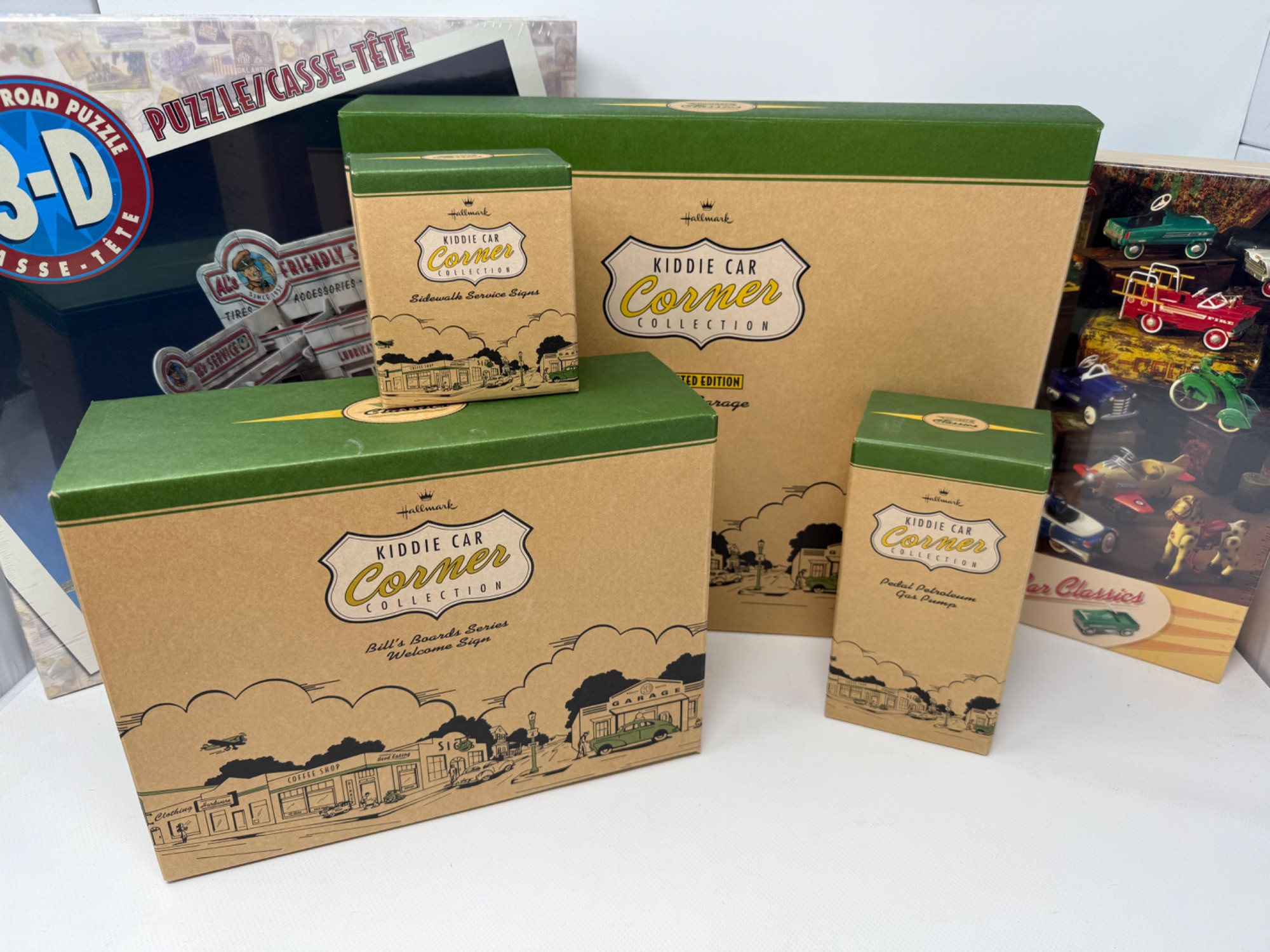 NIB Hallmark collectibles for Kiddie Classics. Same as lot #110, minus one pump. Puzzles, signage and garage for putting a village together.