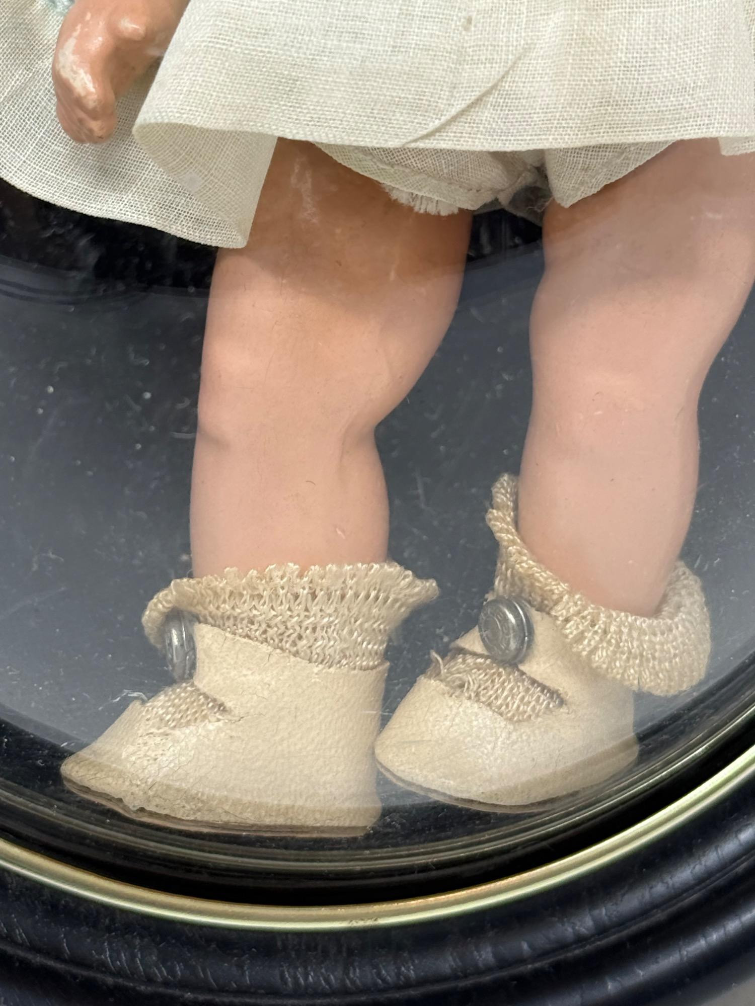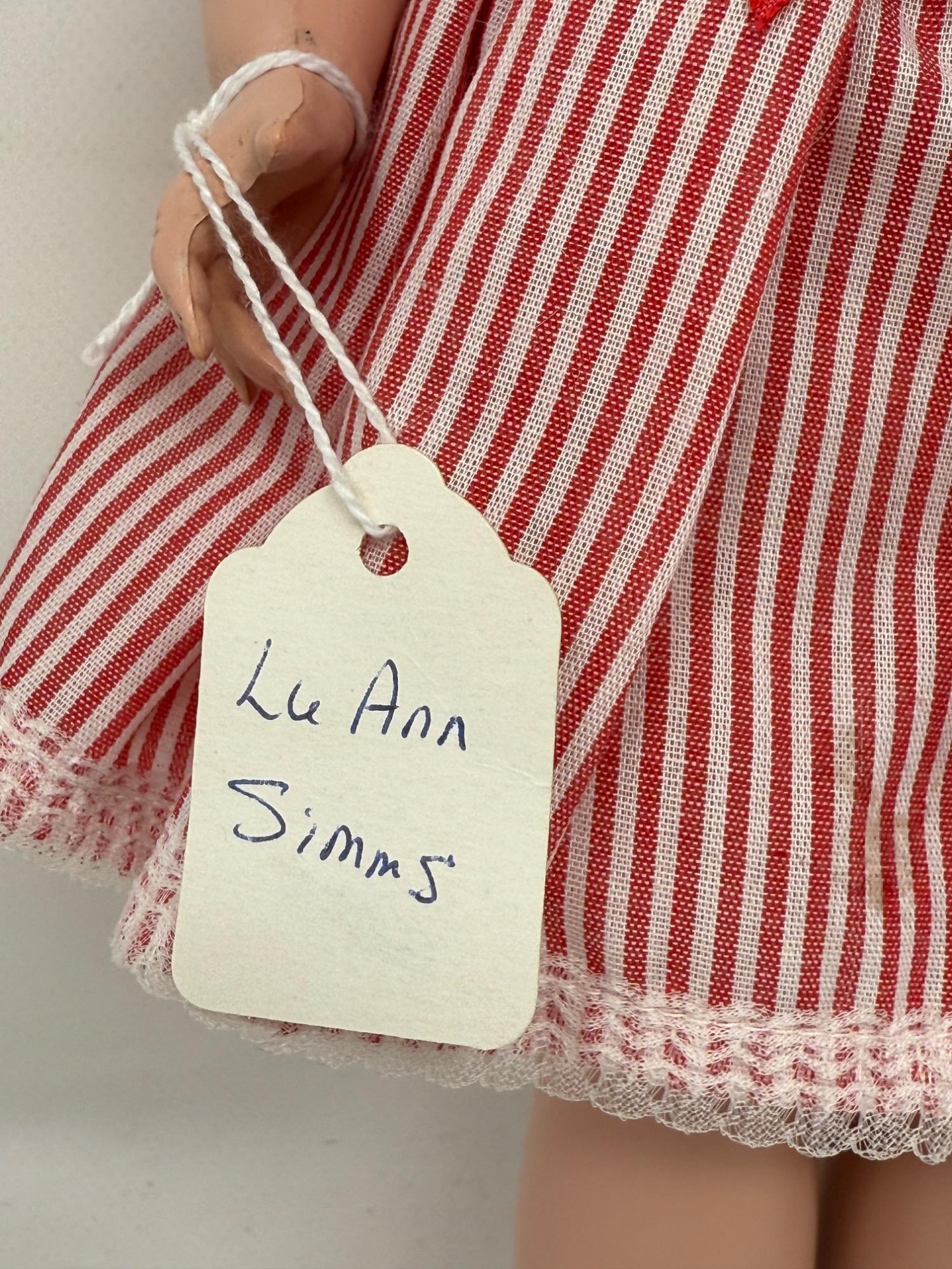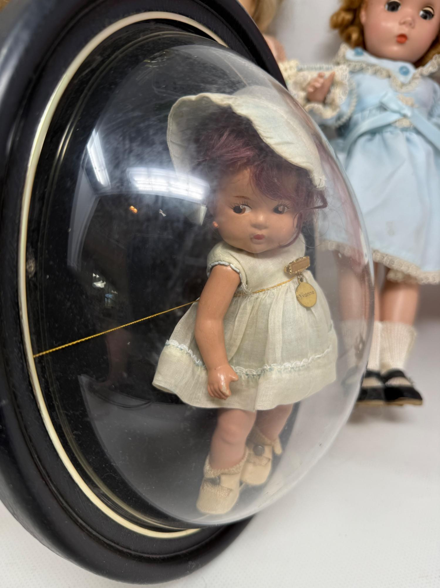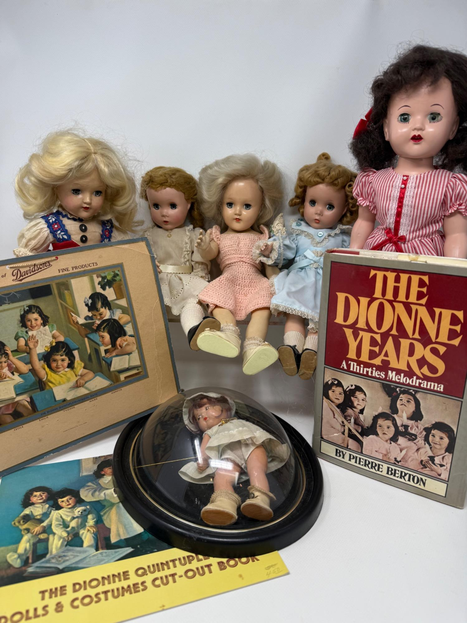 The Dionne quintuplets book and small memorabilia. Yvonne twin behind glass. Lu Ann Simms doll is 18in tall. Most are sleepy eye dolls. They are hinged hard plastic.