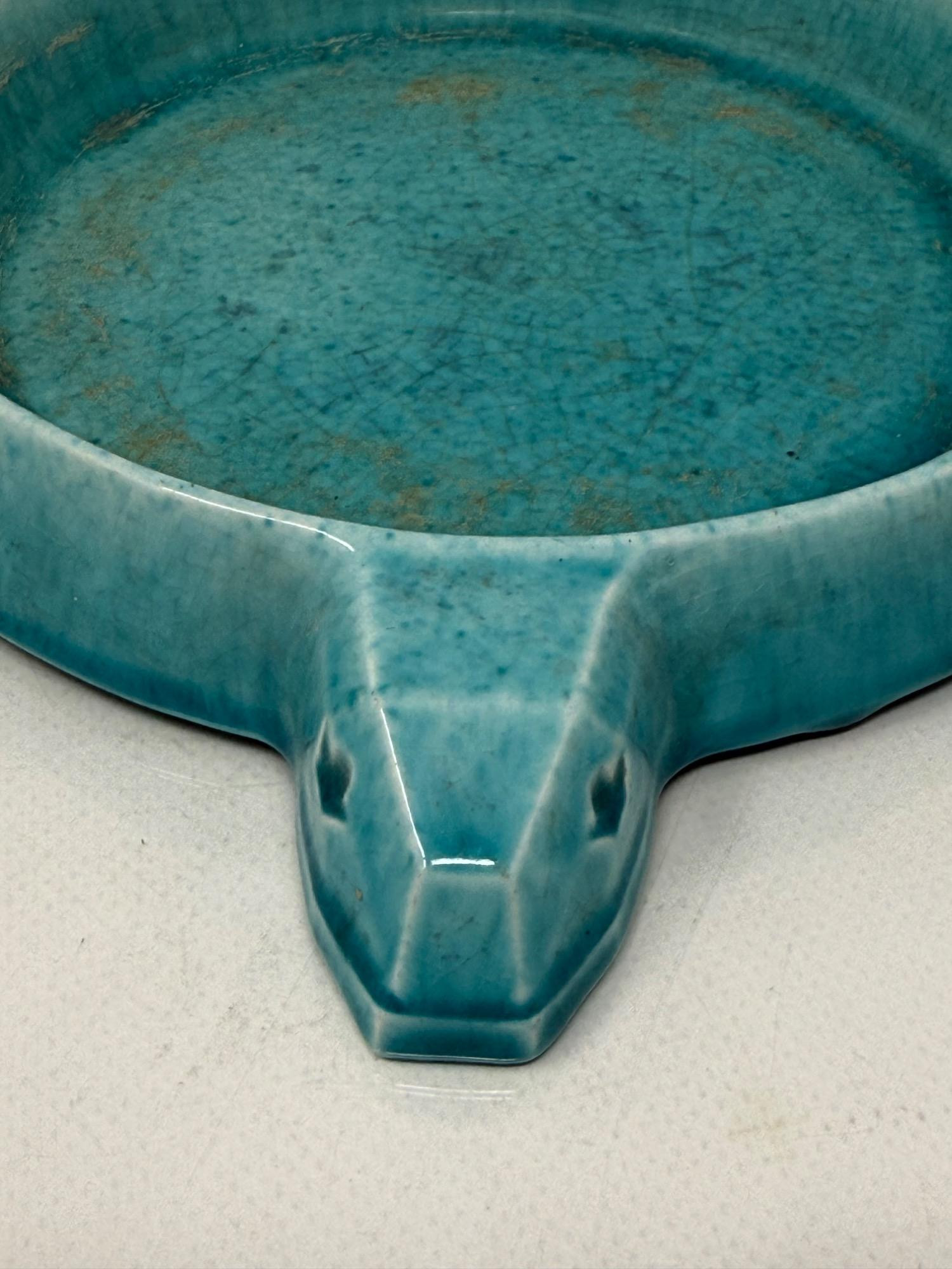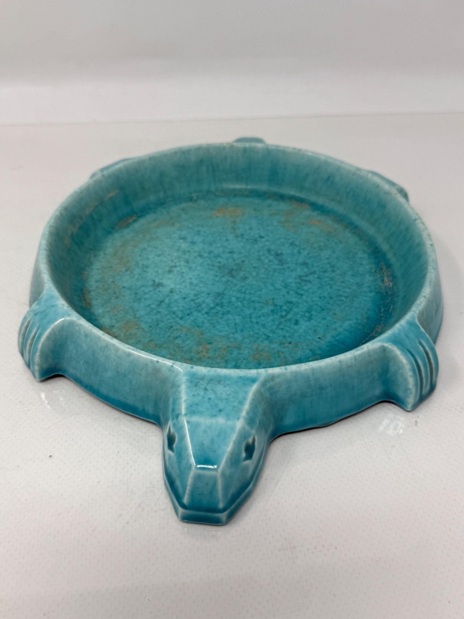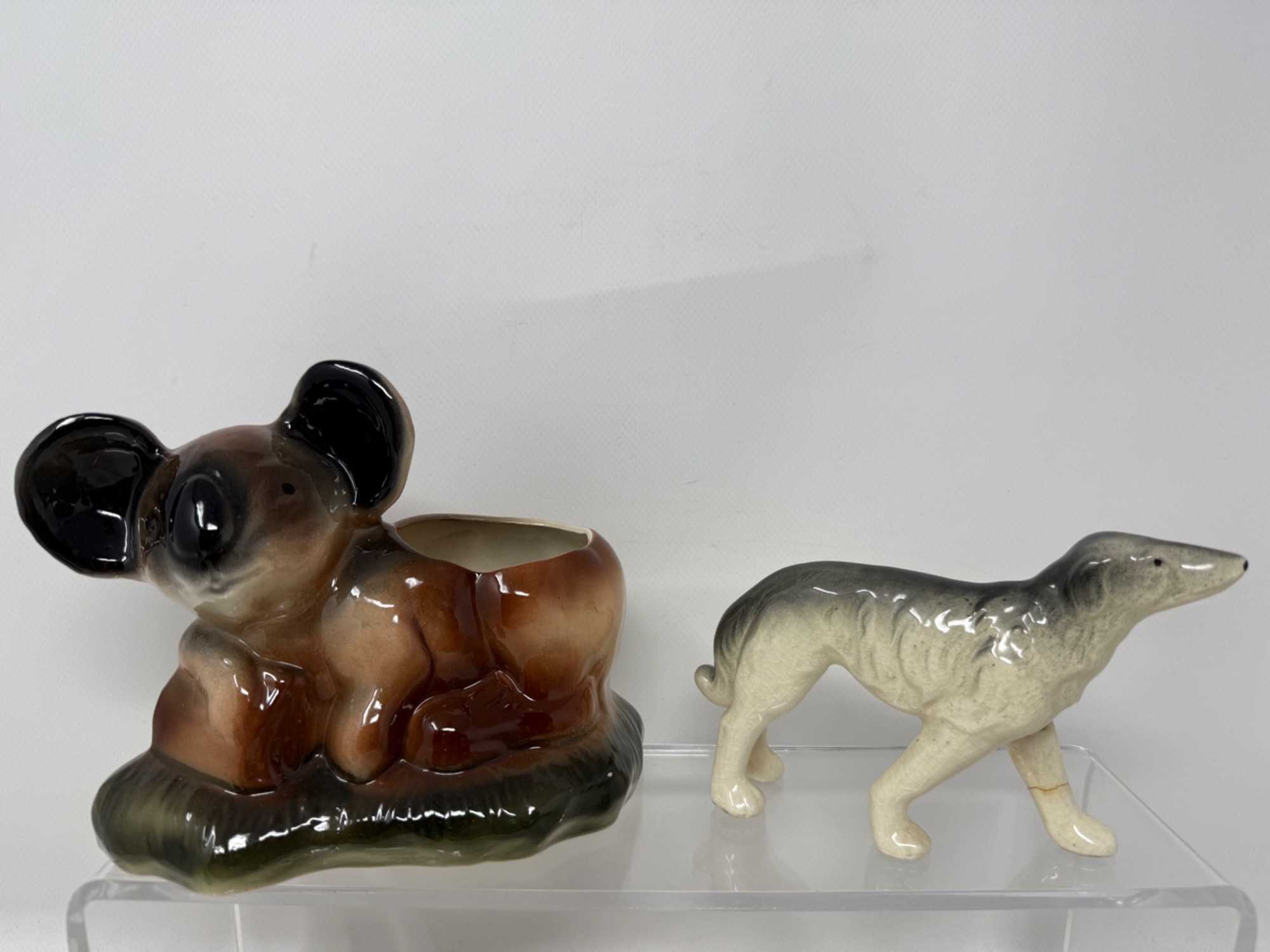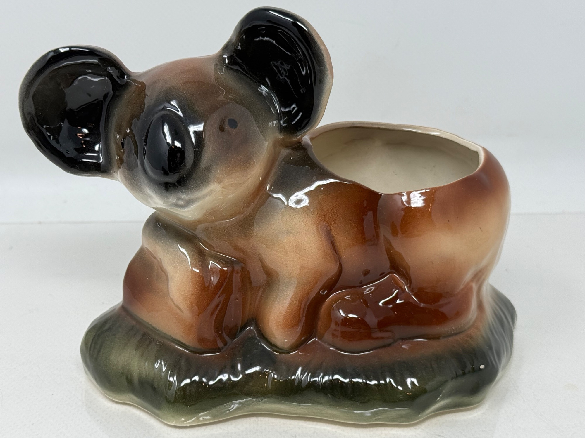 Vintage McCoy dog pot, turquoise ceramic turtle ashtray, ceramic mushroom, ceramic deer, dog and koala pot. Ceramic dog has a repaired leg. Made in Japan.