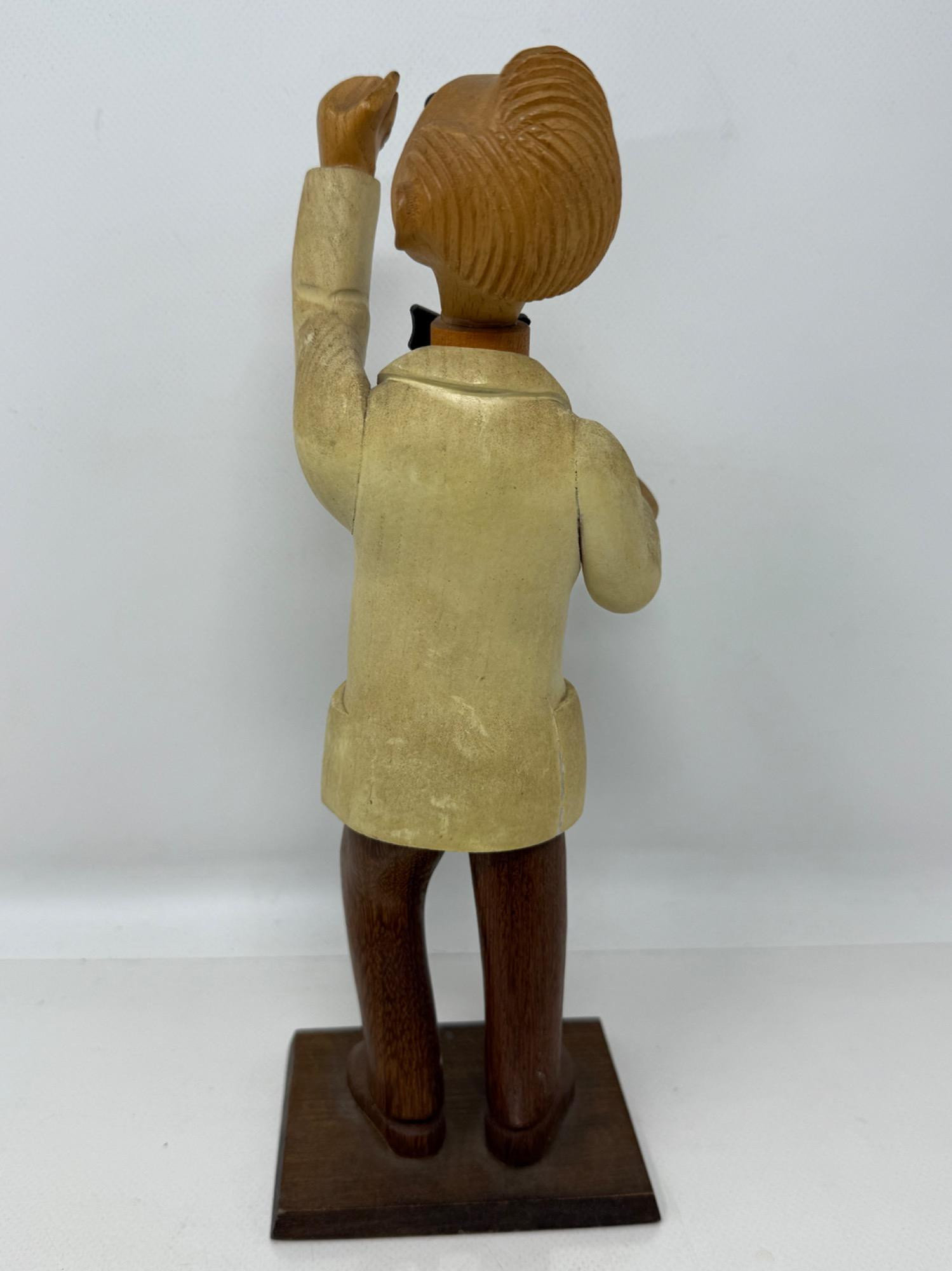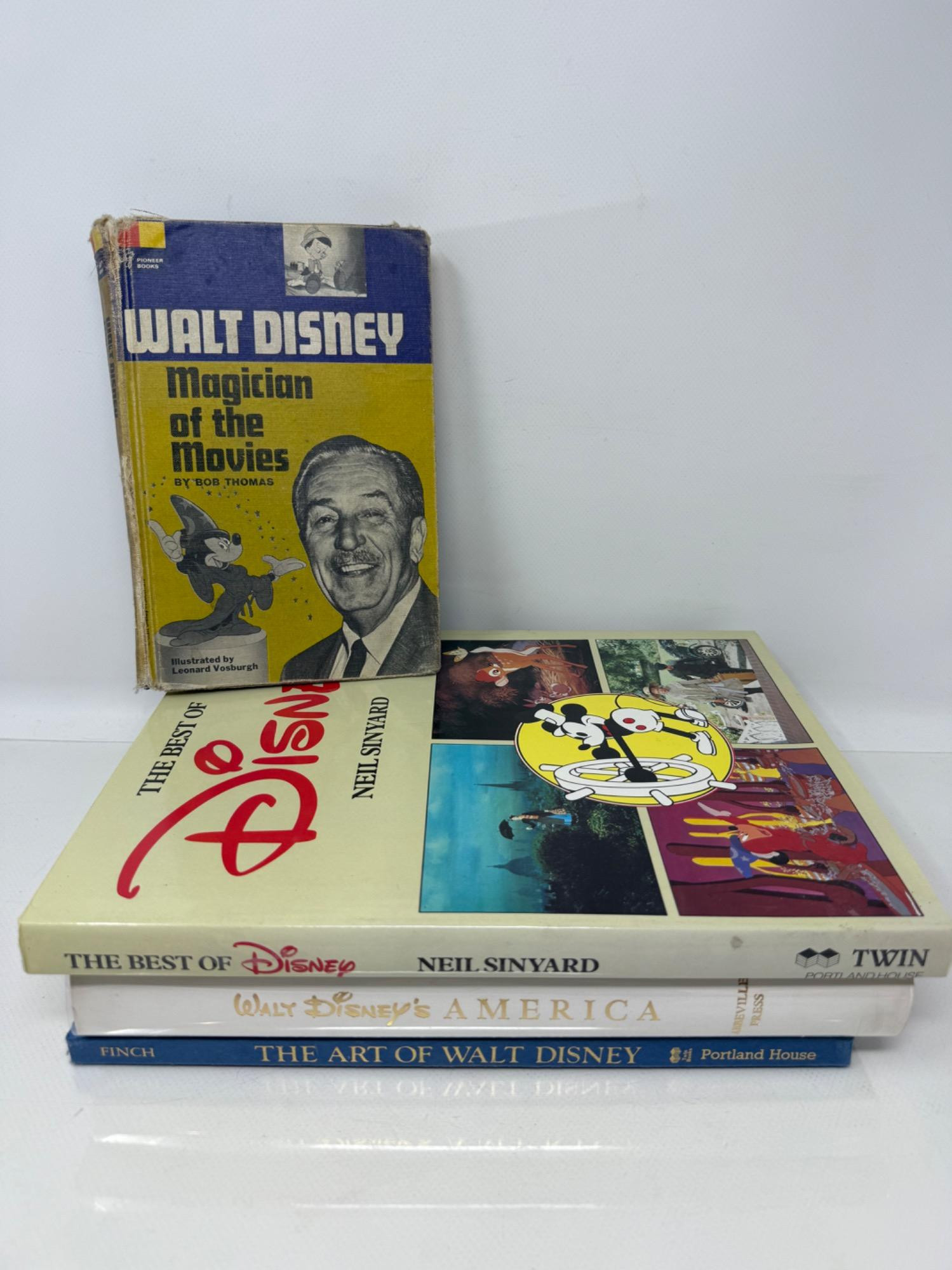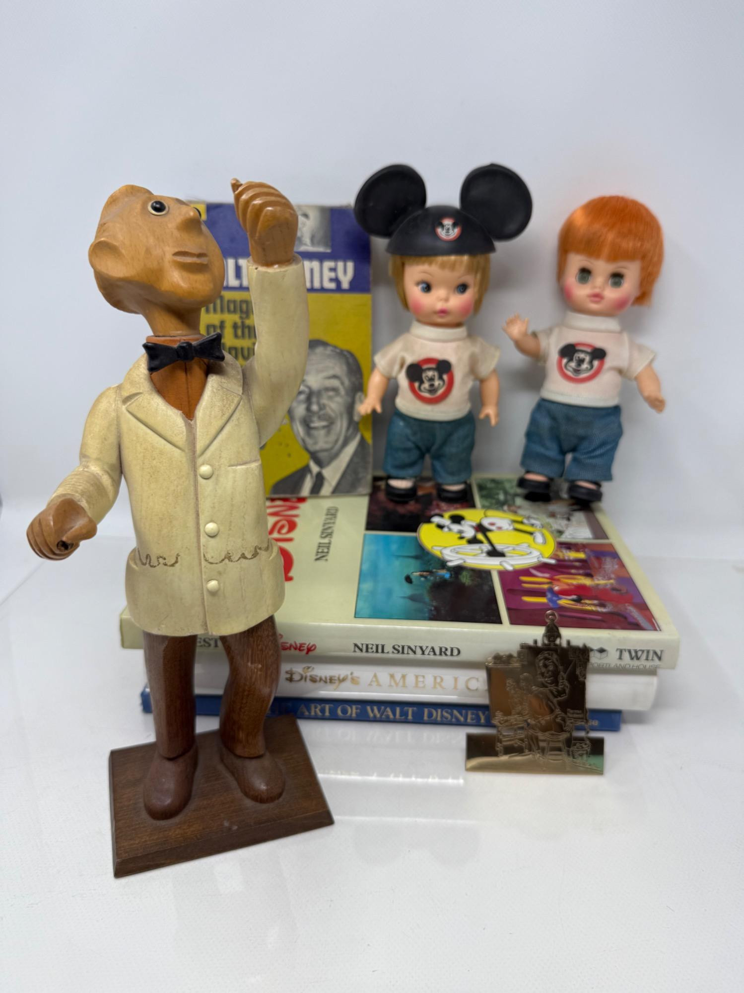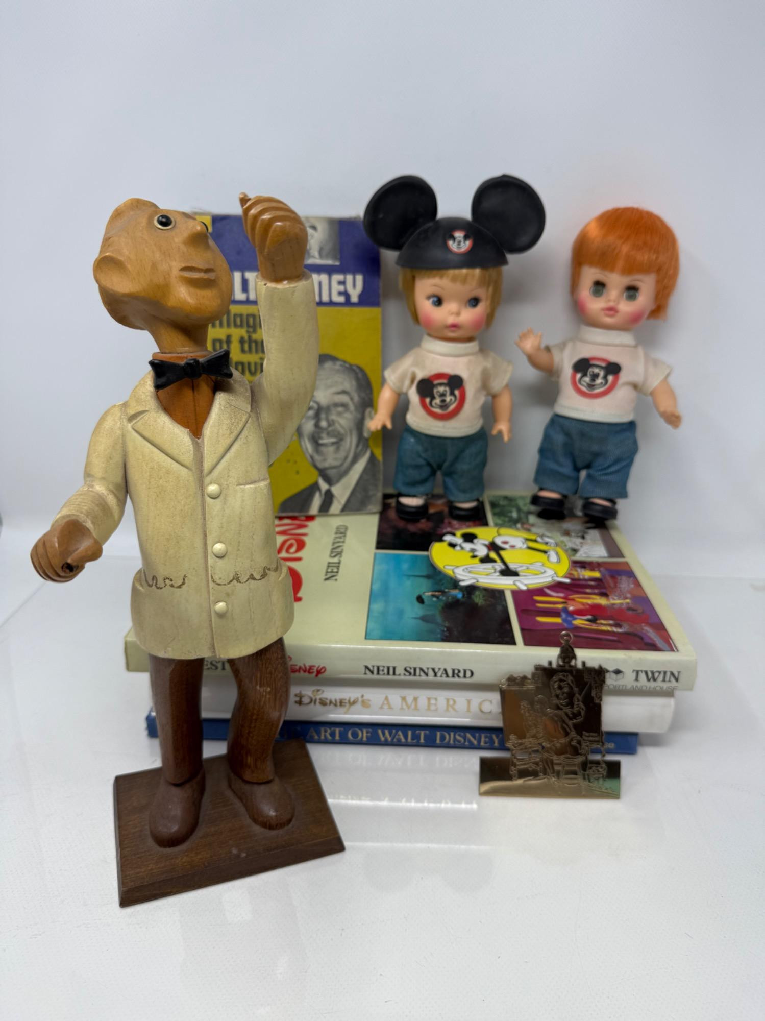 Vintage wood carved figure of Walt Disney. 12in tall Disney history books and small Norman Rockwell ornament Pair of vintage dolls in Disney clothing.