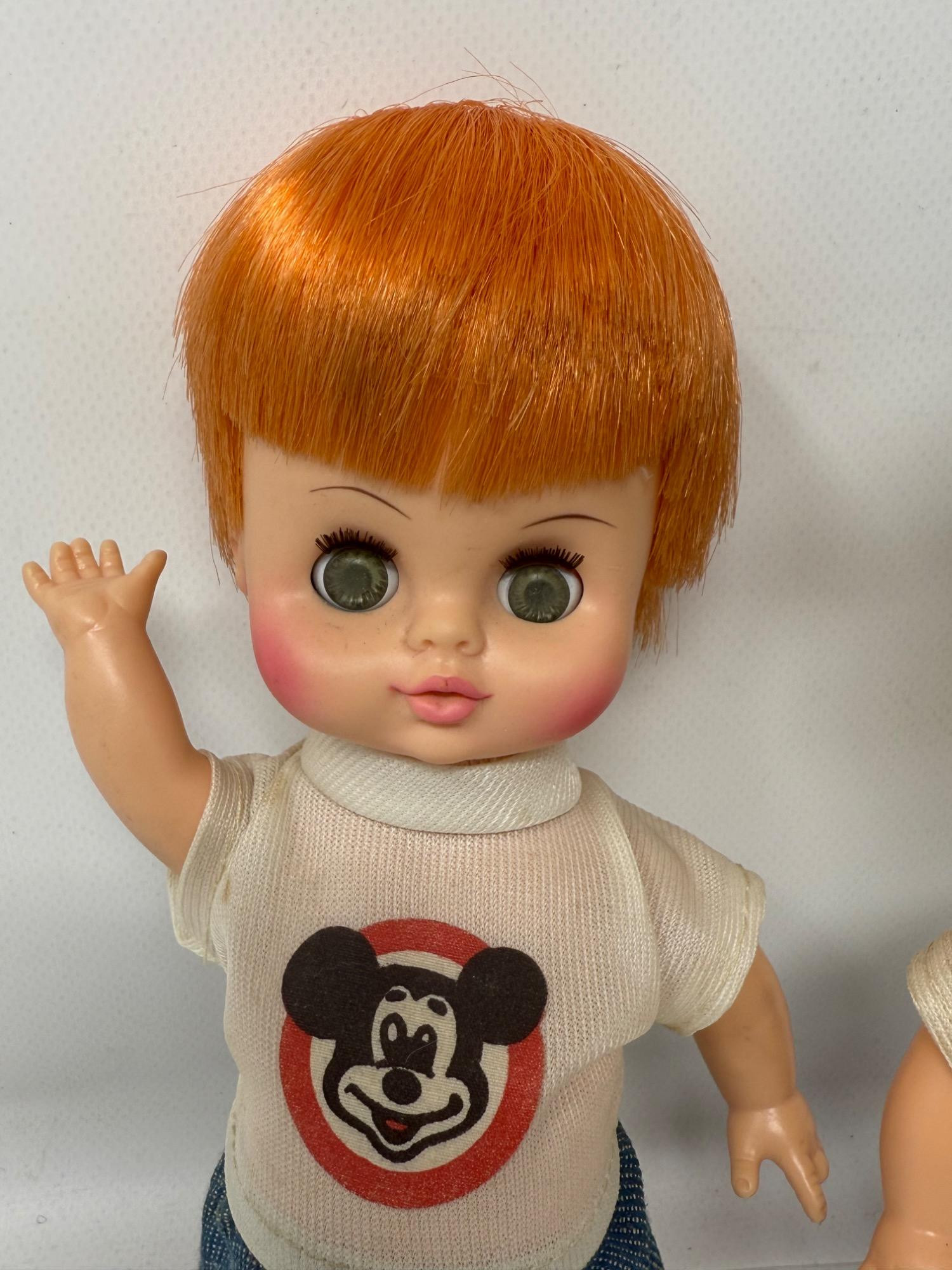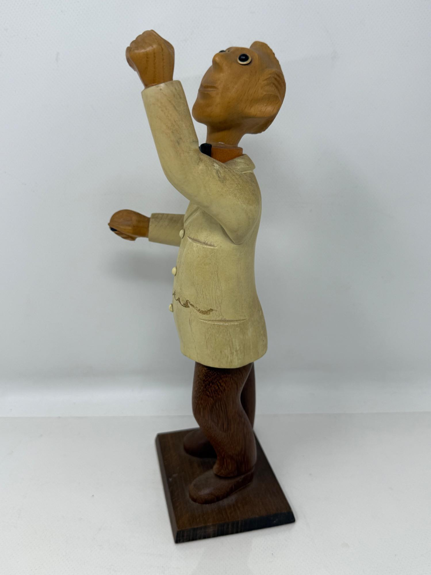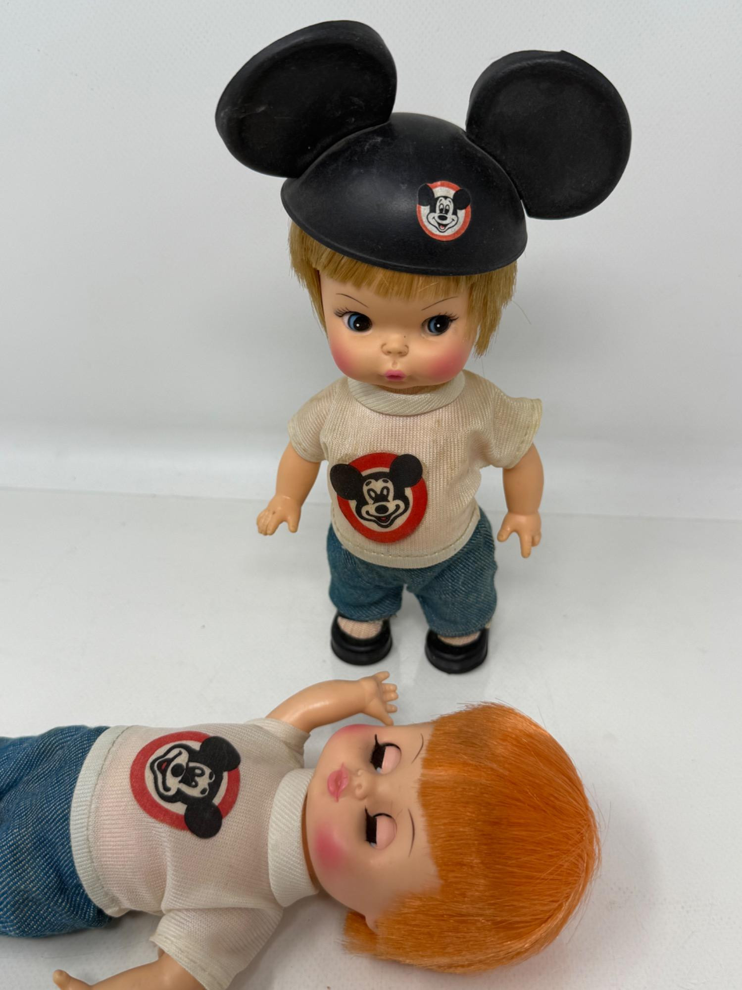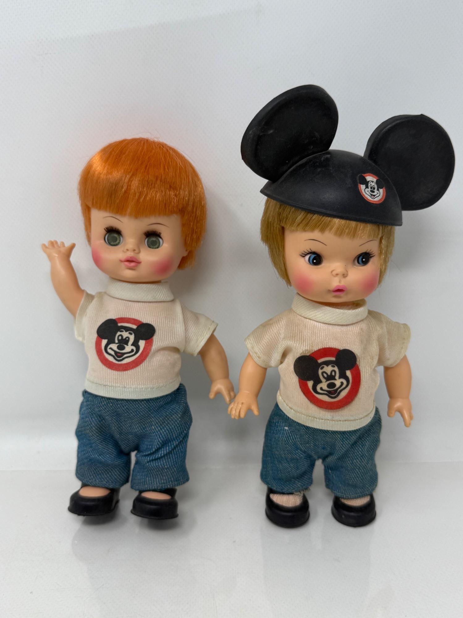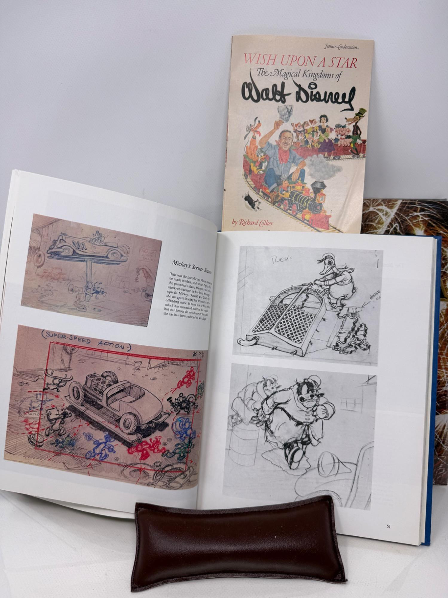 Vintage wood carved figure of Walt Disney. 12in tall Disney history books and small Norman Rockwell ornament Pair of vintage dolls in Disney clothing.