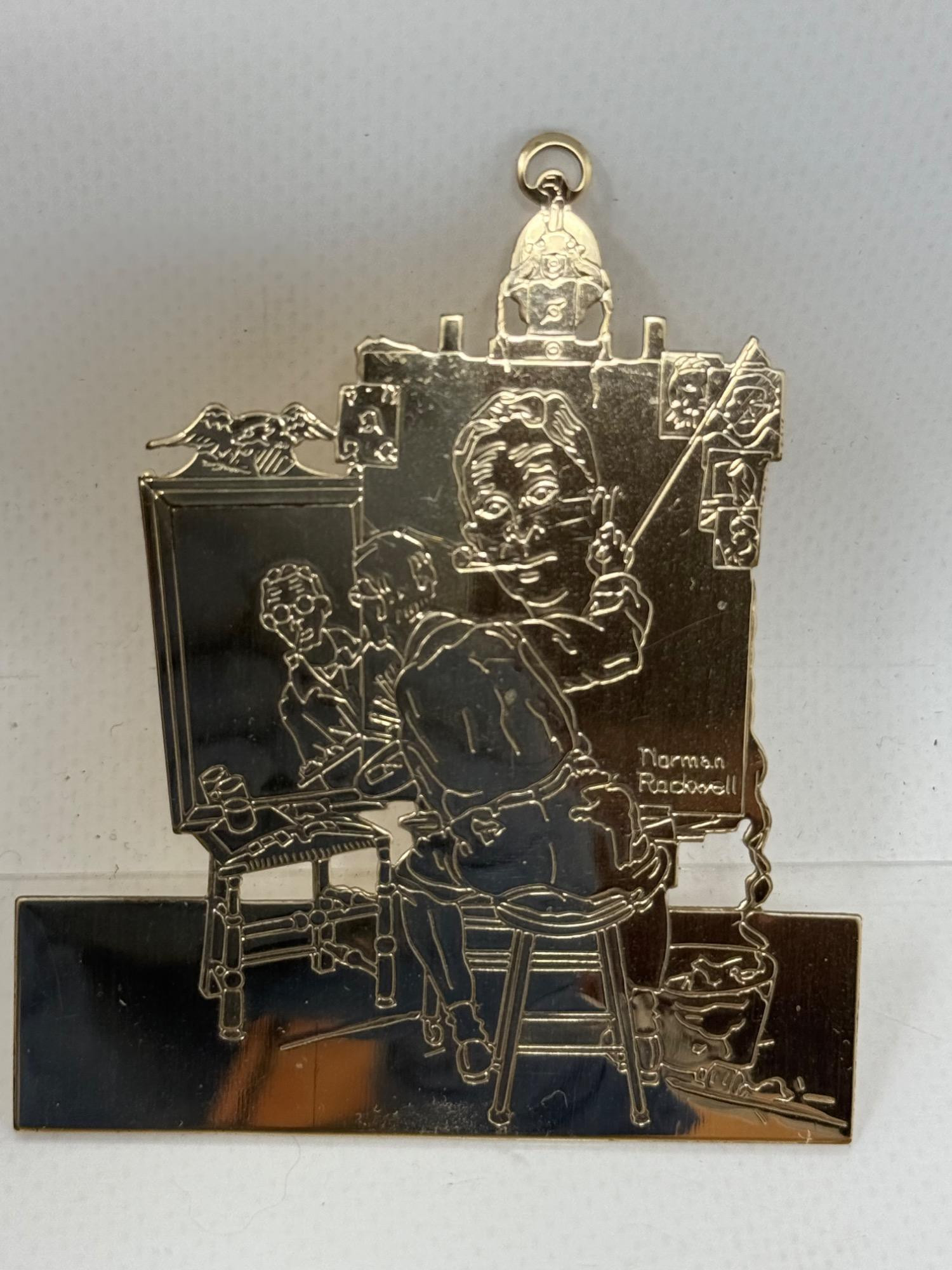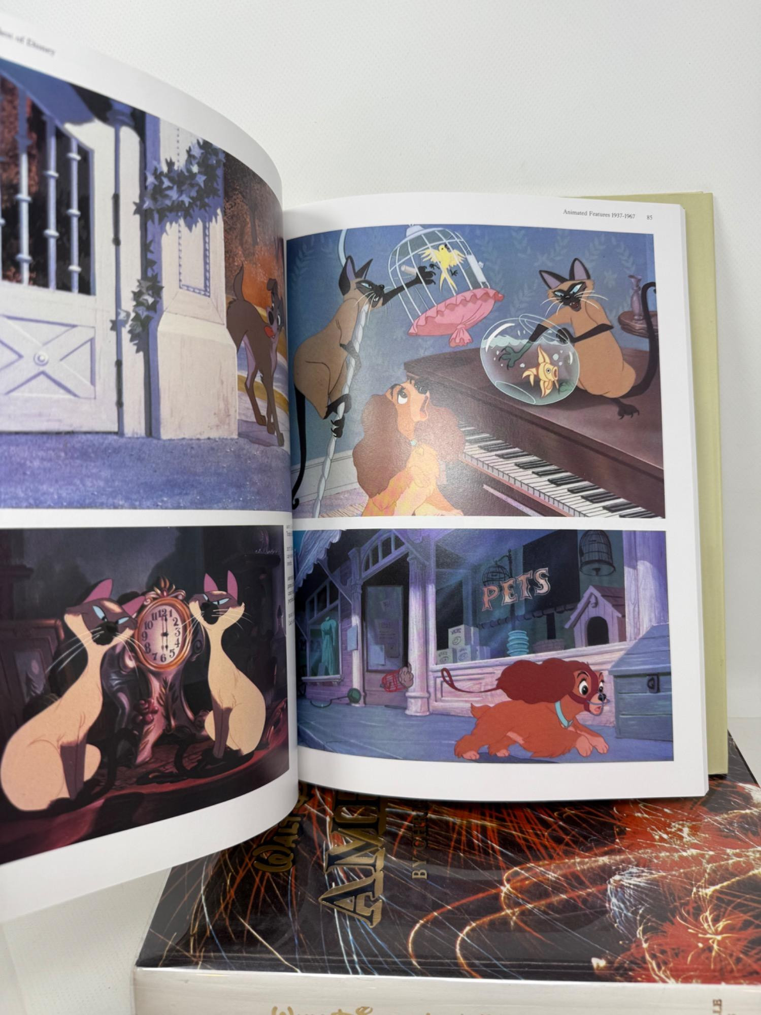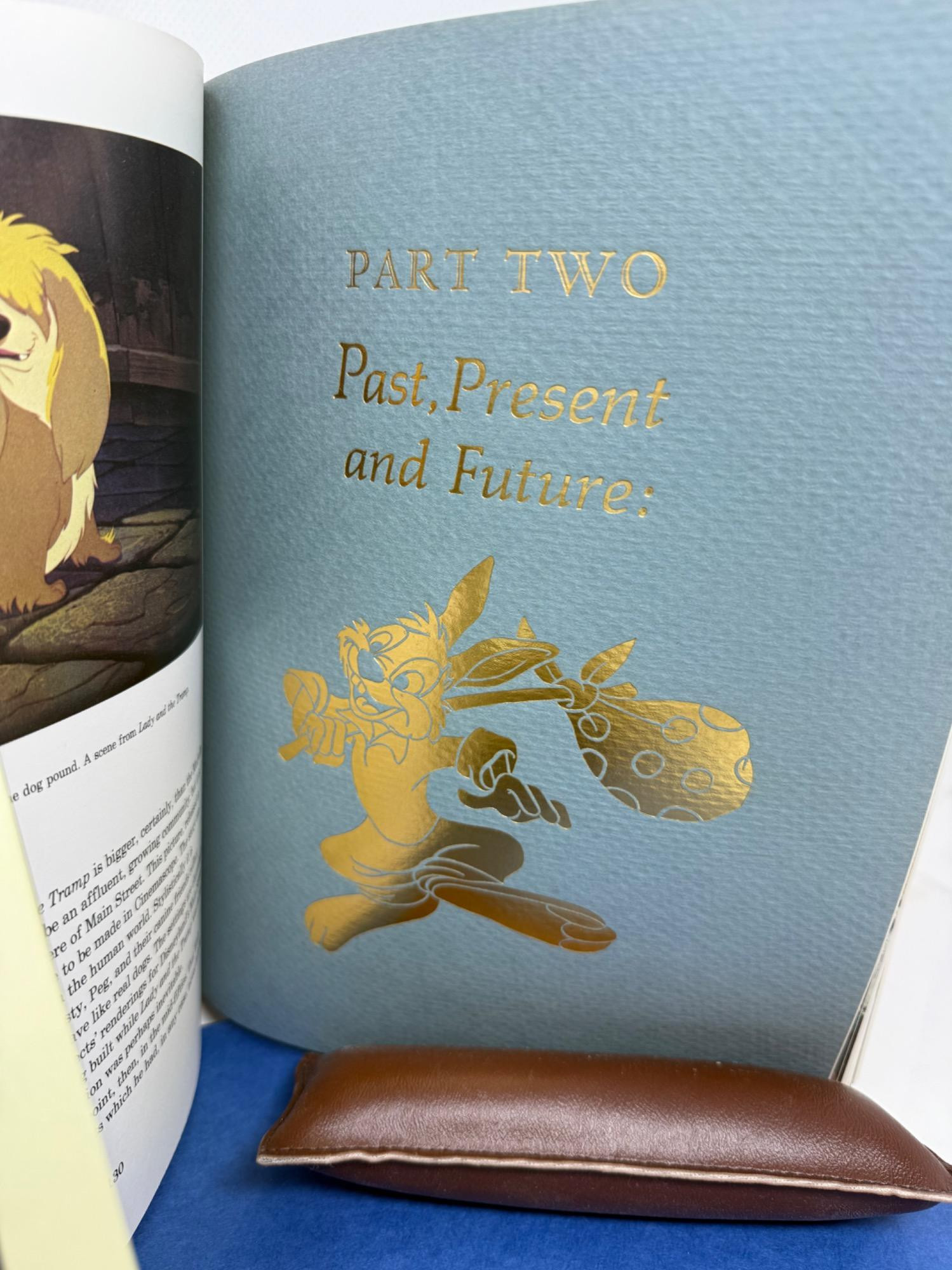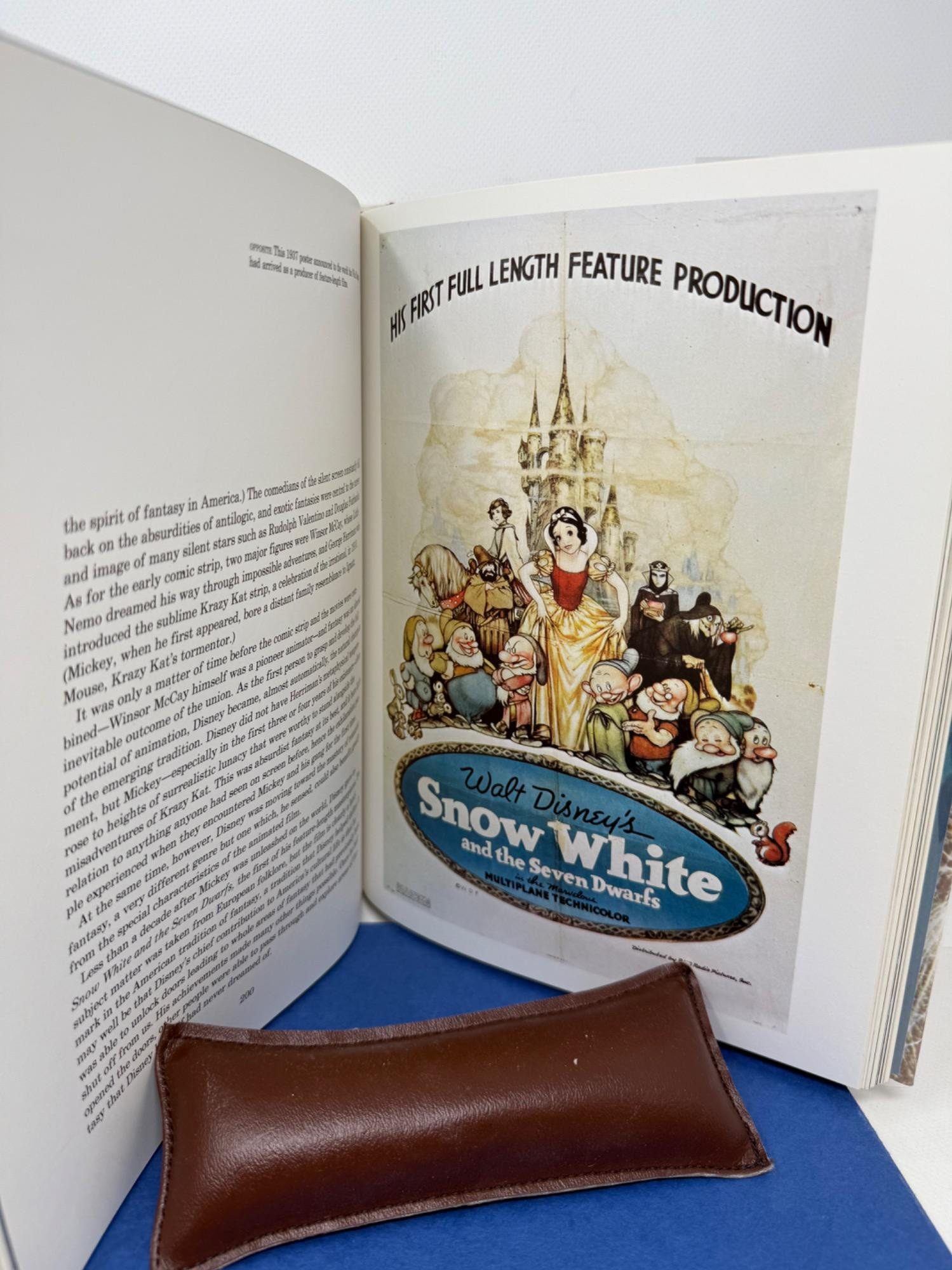 Vintage wood carved figure of Walt Disney. 12in tall Disney history books and small Norman Rockwell ornament Pair of vintage dolls in Disney clothing.
