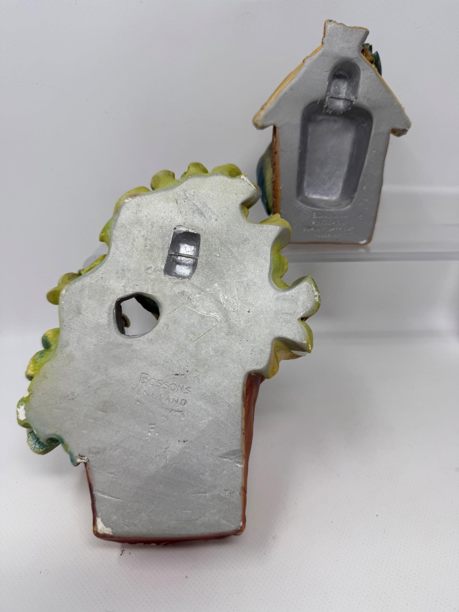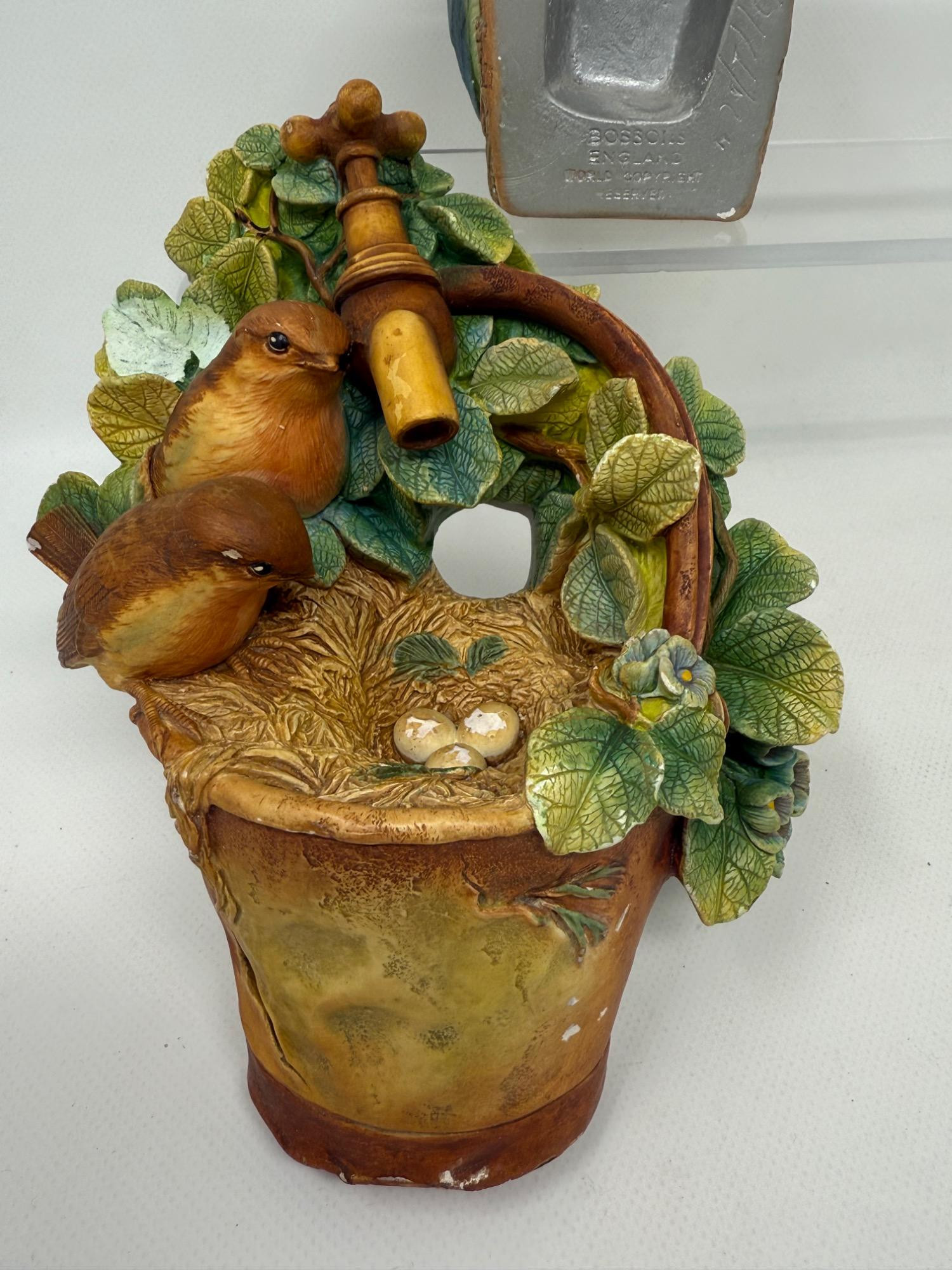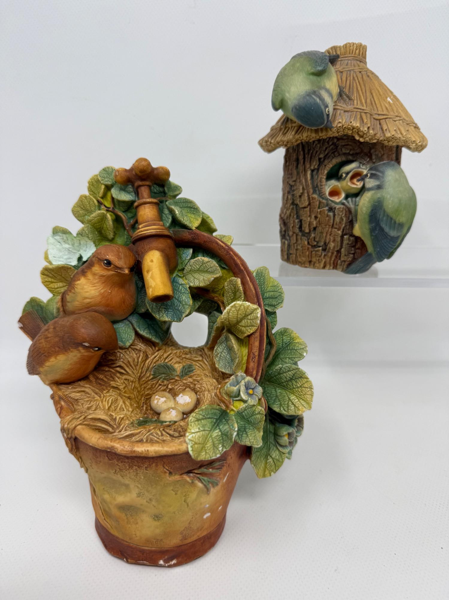 Bosson Carved resin bird and basket. Ceramic, hand painted birds. Duck is 8in tall