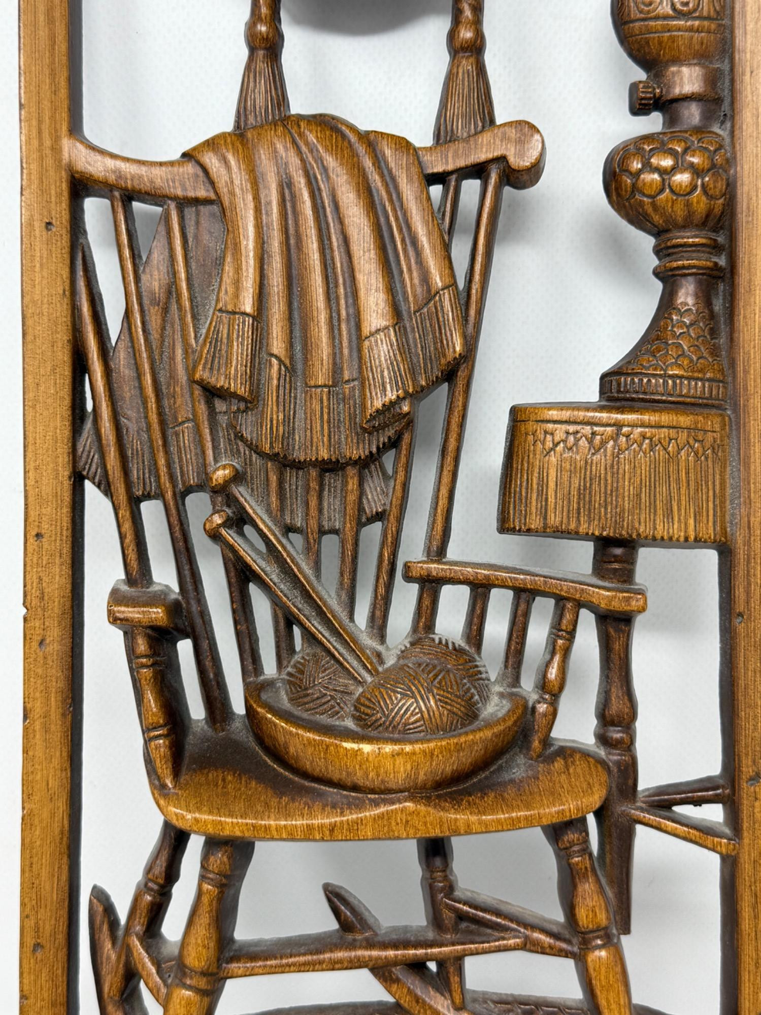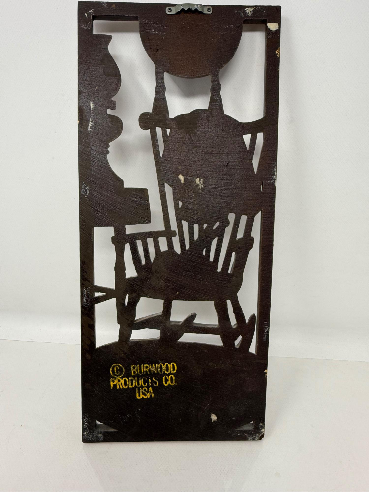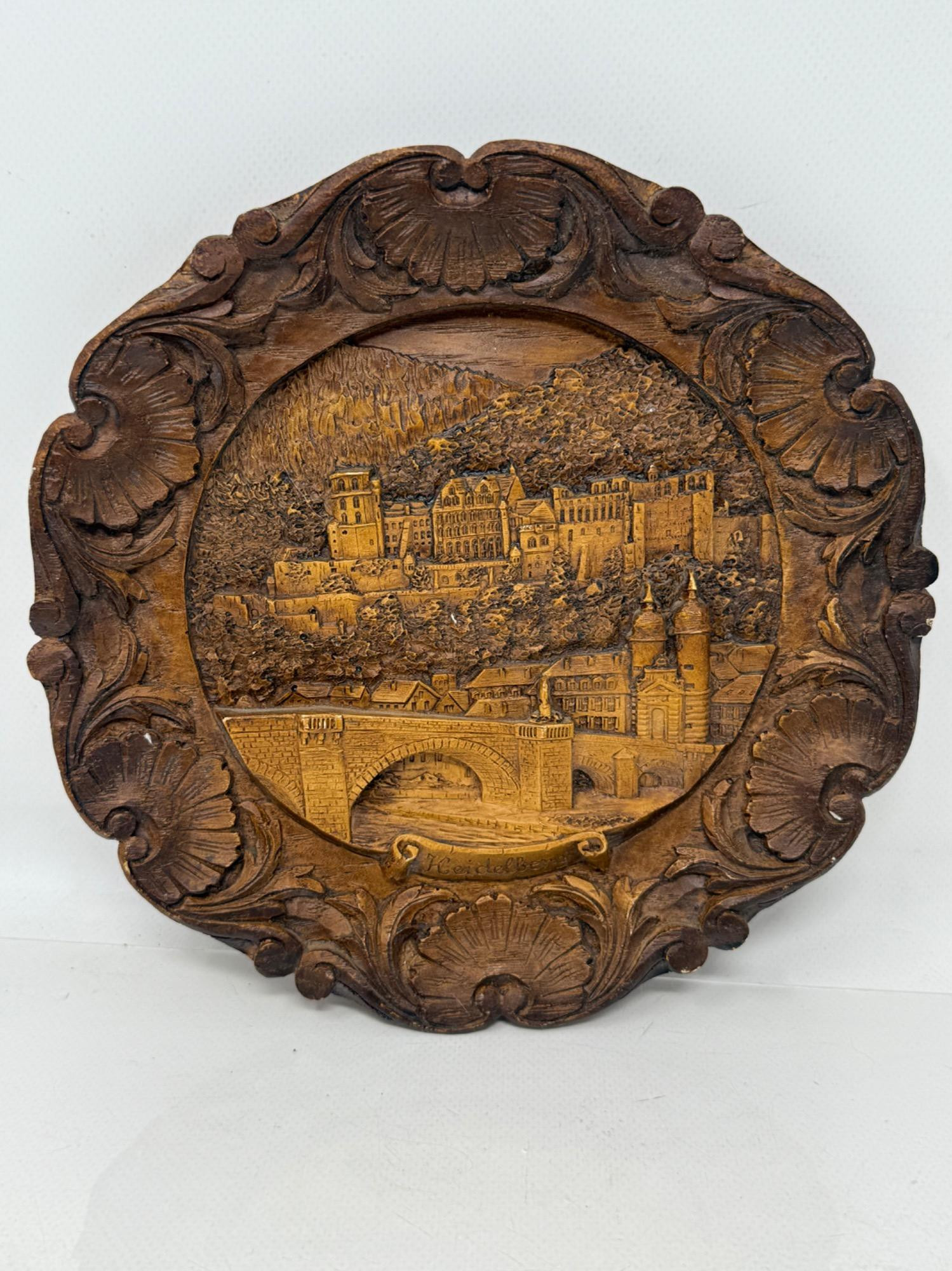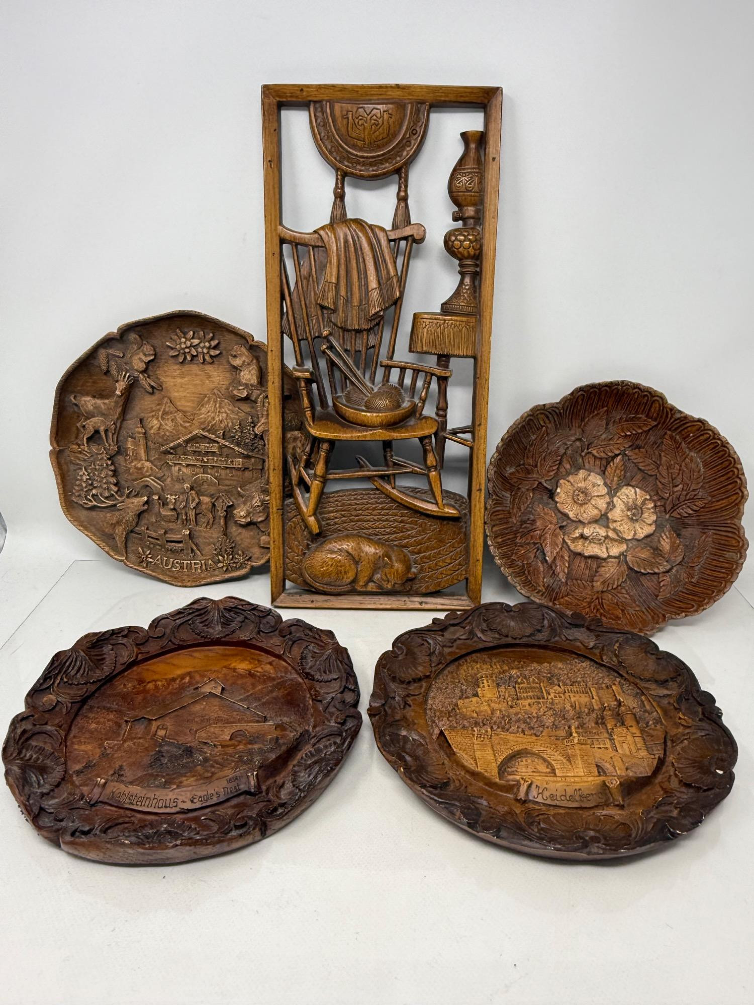 Burwood carved wall art scene-Rocking chair. 16.5in tall, 7.5in wide. Three carved discs of European landmarks. Heidelberg, Austria and the Eagles Nest. Carved plastic wood bowl.