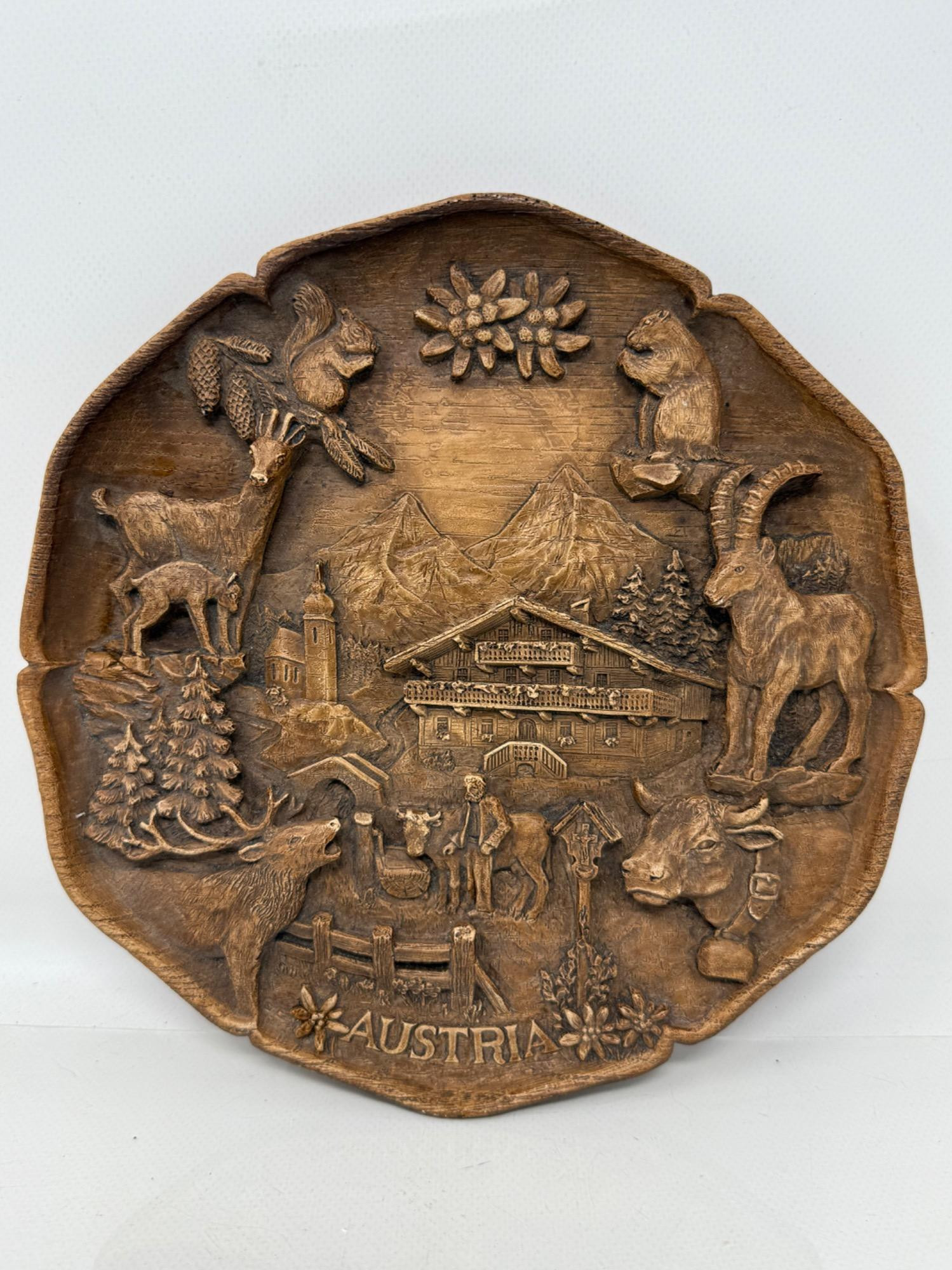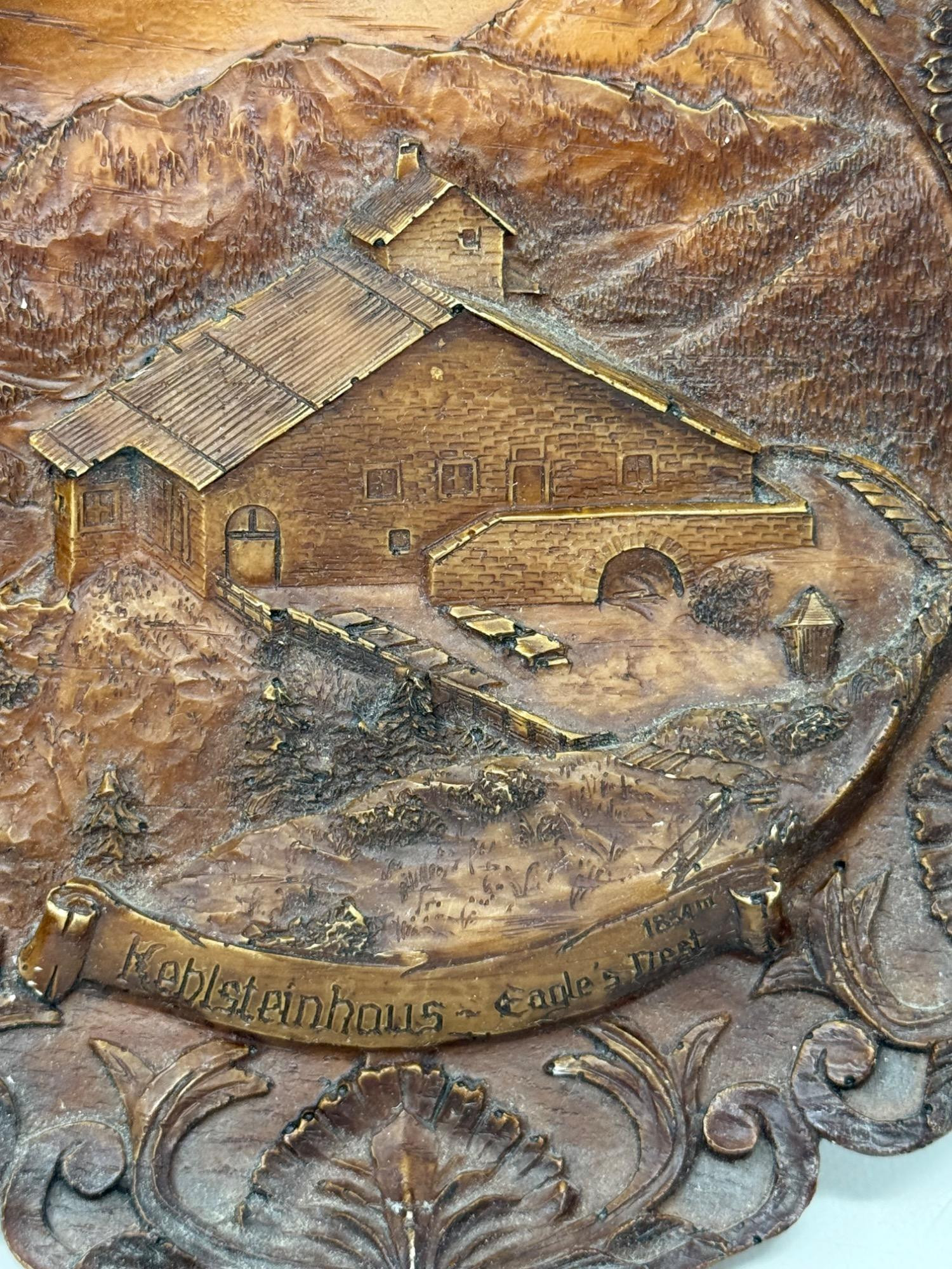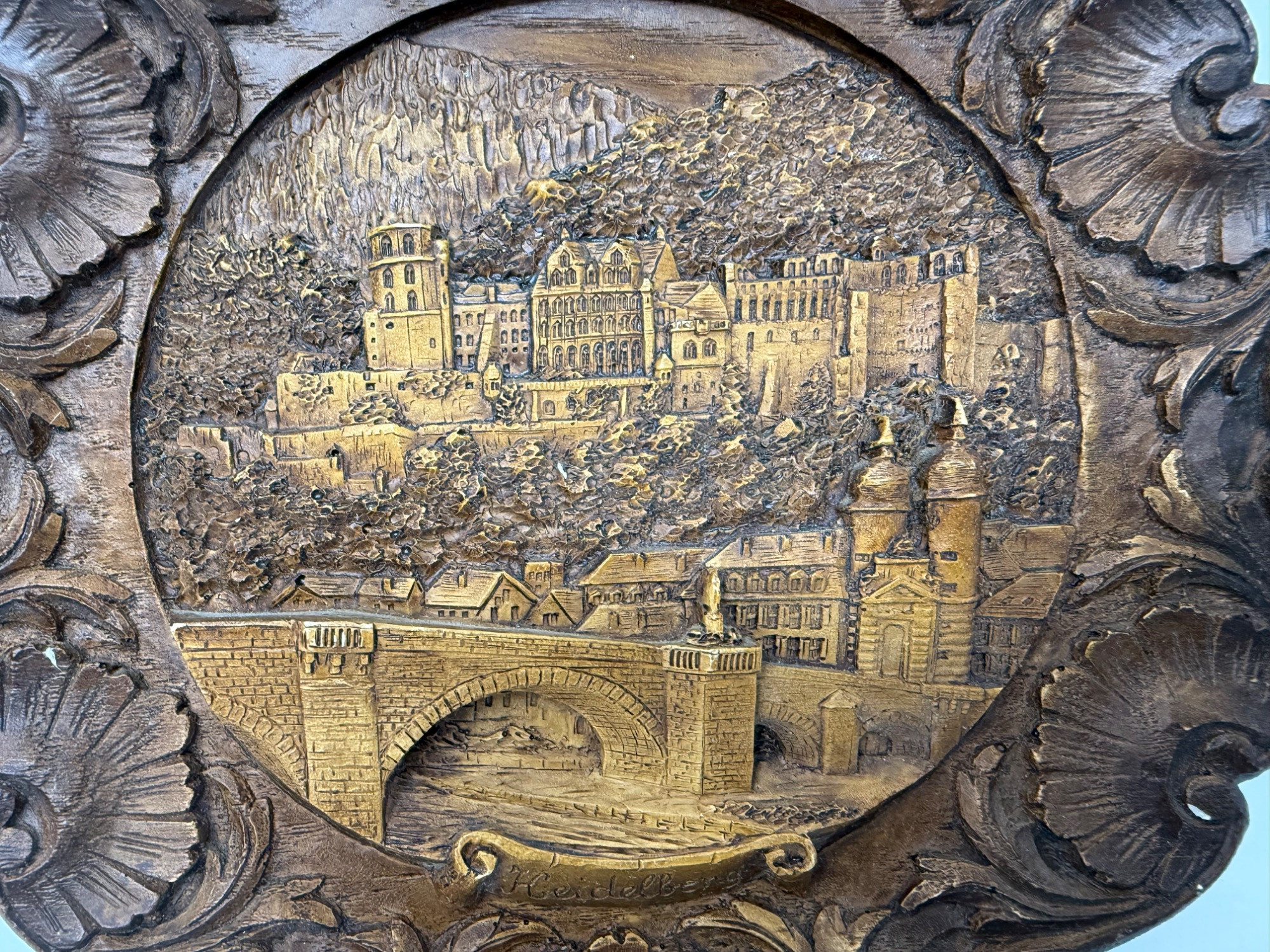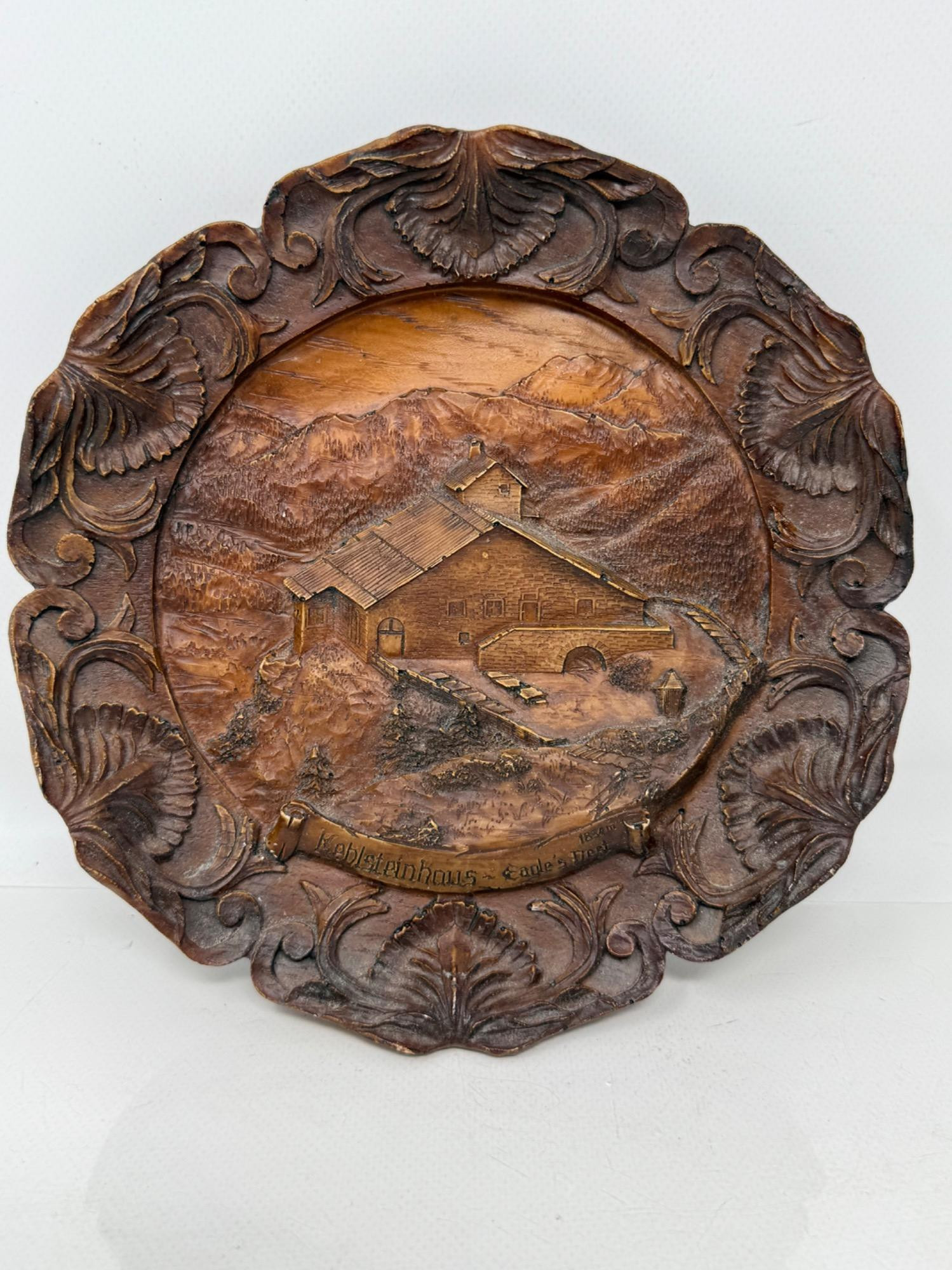 Burwood carved wall art scene-Rocking chair. 16.5in tall, 7.5in wide. Three carved discs of European landmarks. Heidelberg, Austria and the Eagles Nest. Carved plastic wood bowl.