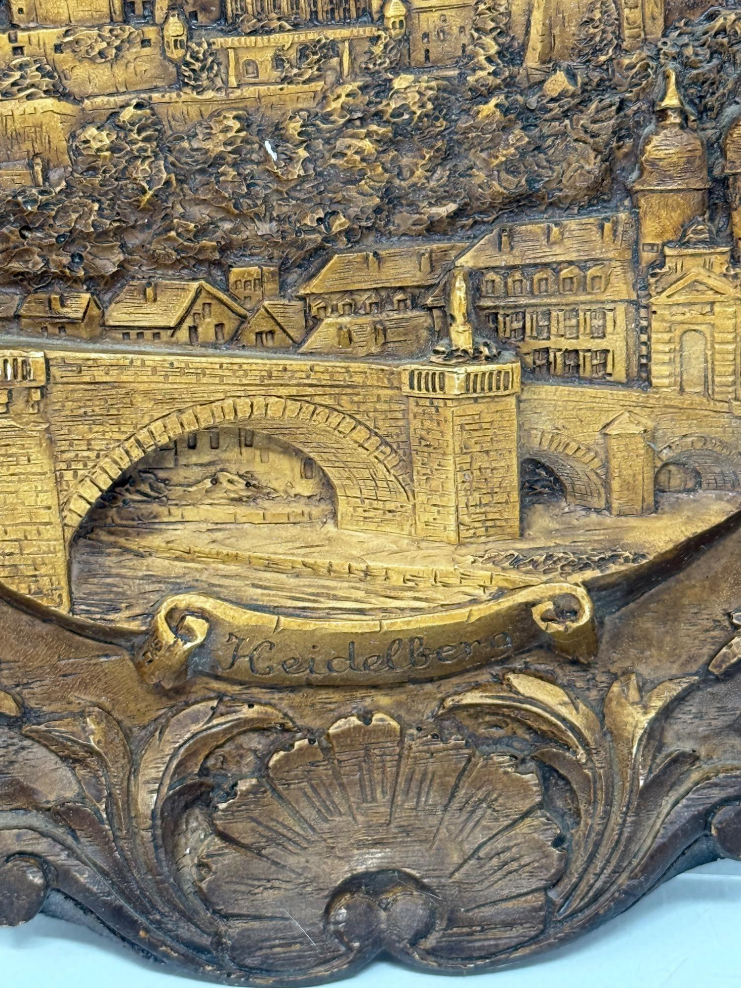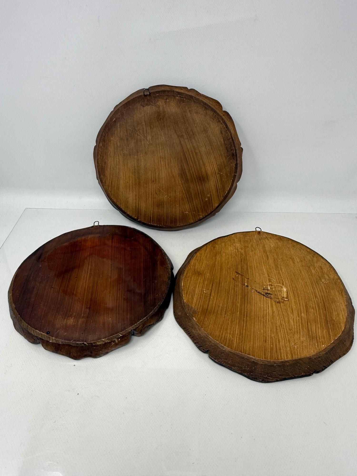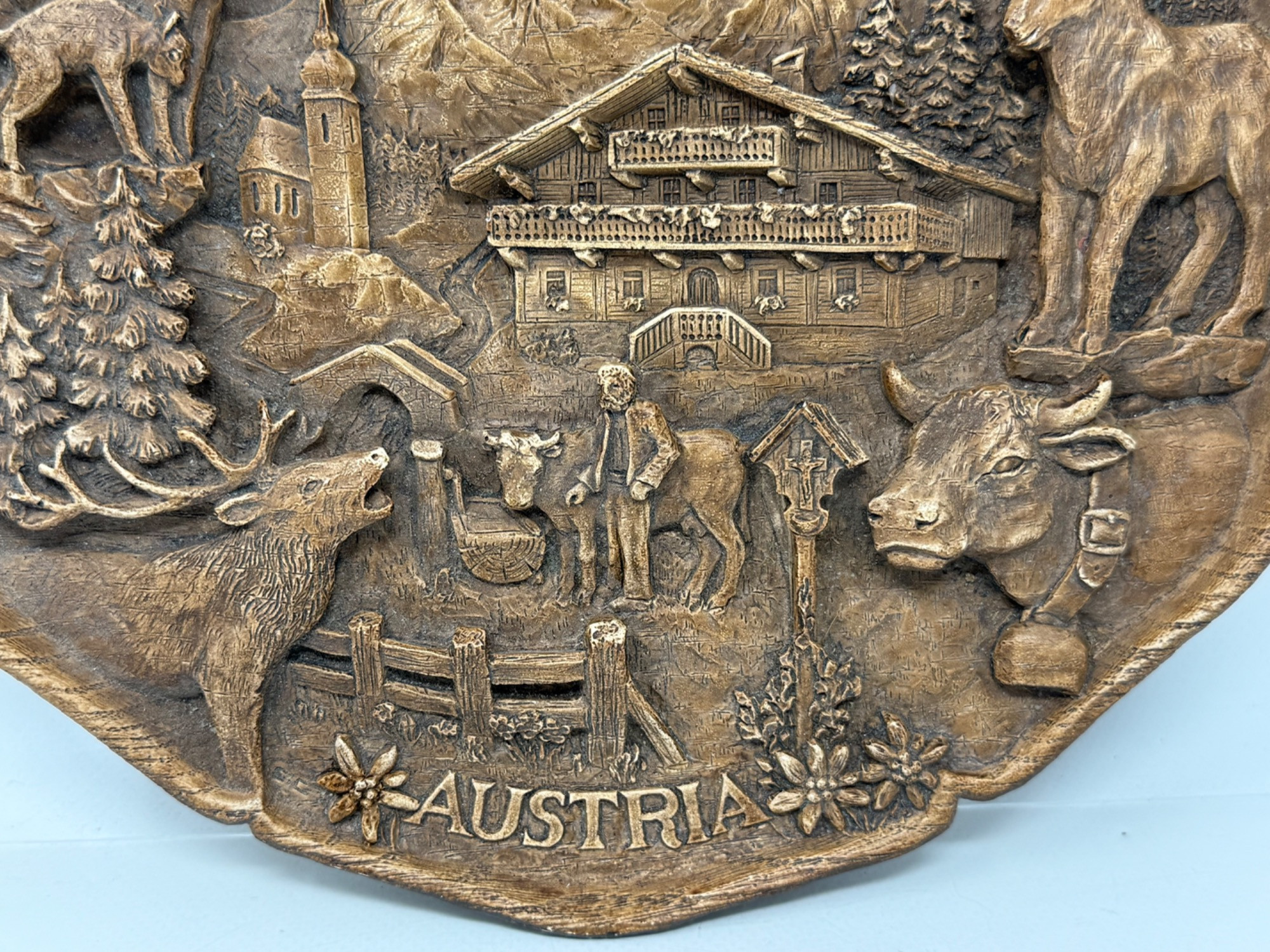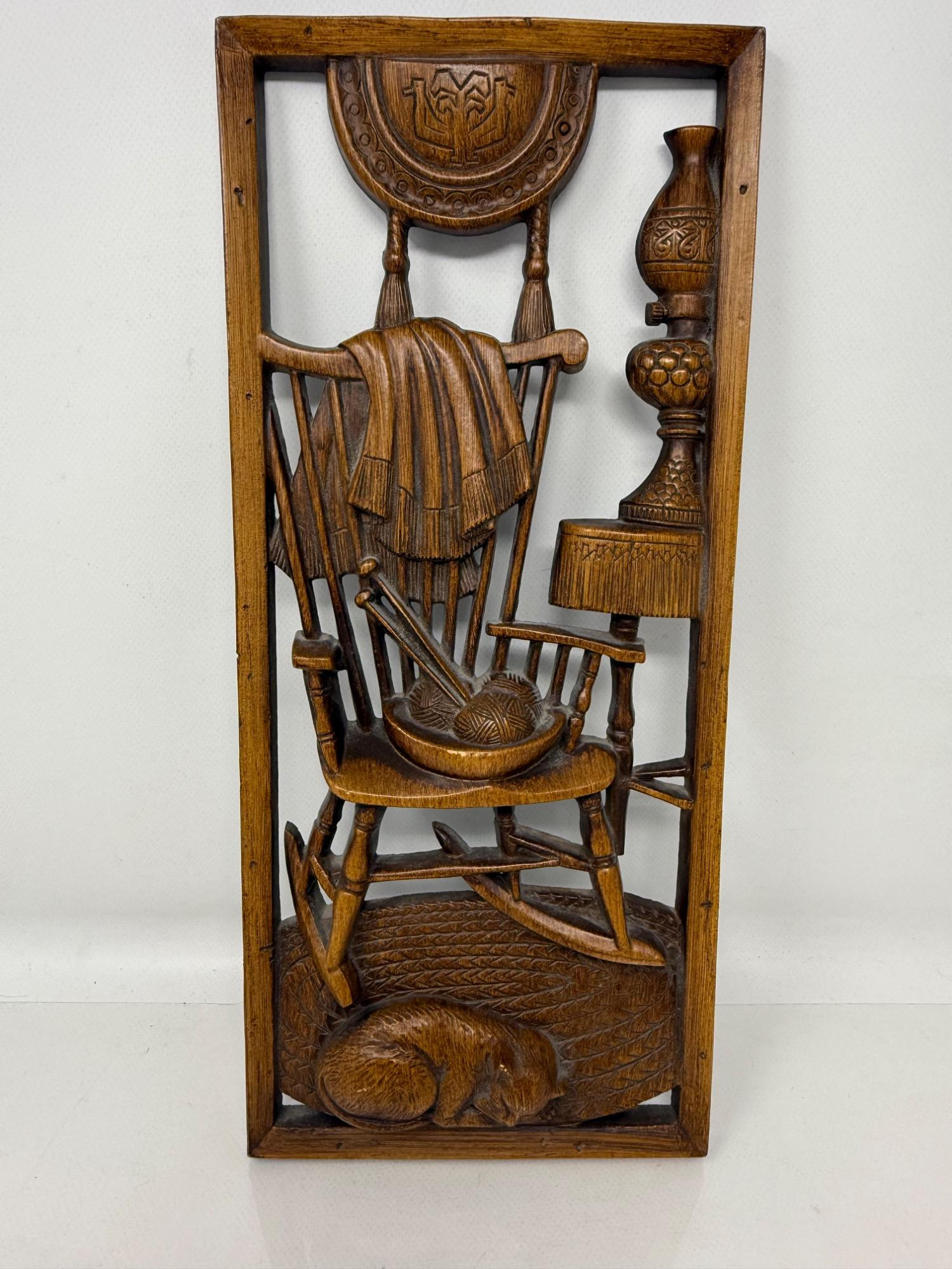 Burwood carved wall art scene-Rocking chair. 16.5in tall, 7.5in wide. Three carved discs of European landmarks. Heidelberg, Austria and the Eagles Nest. Carved plastic wood bowl.