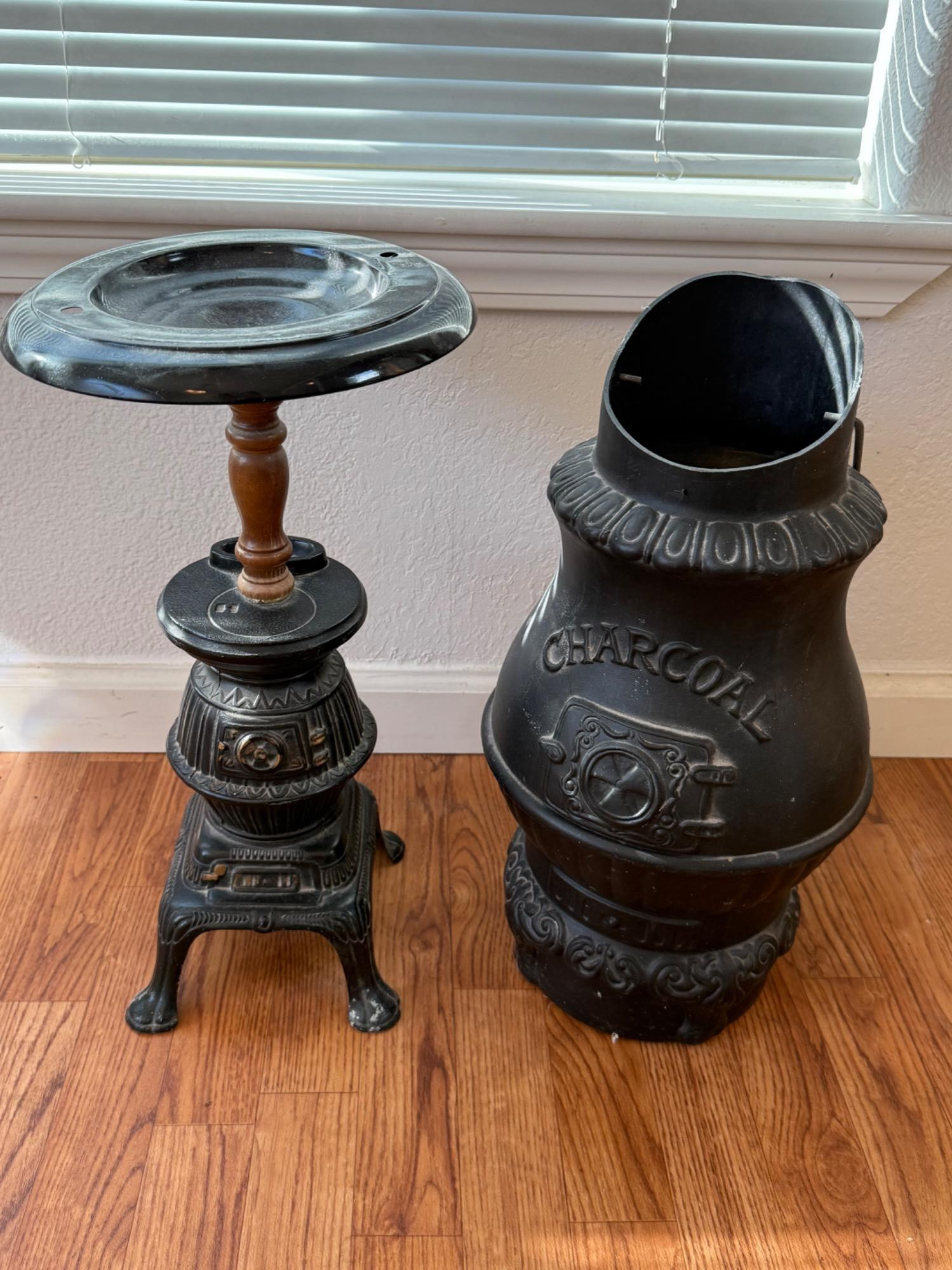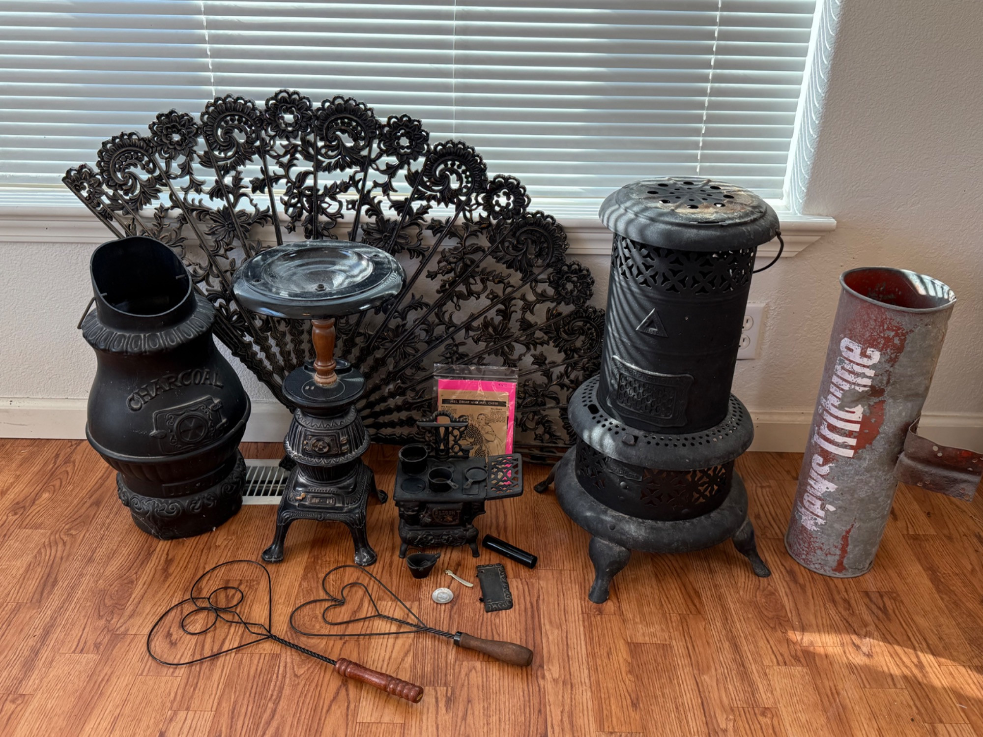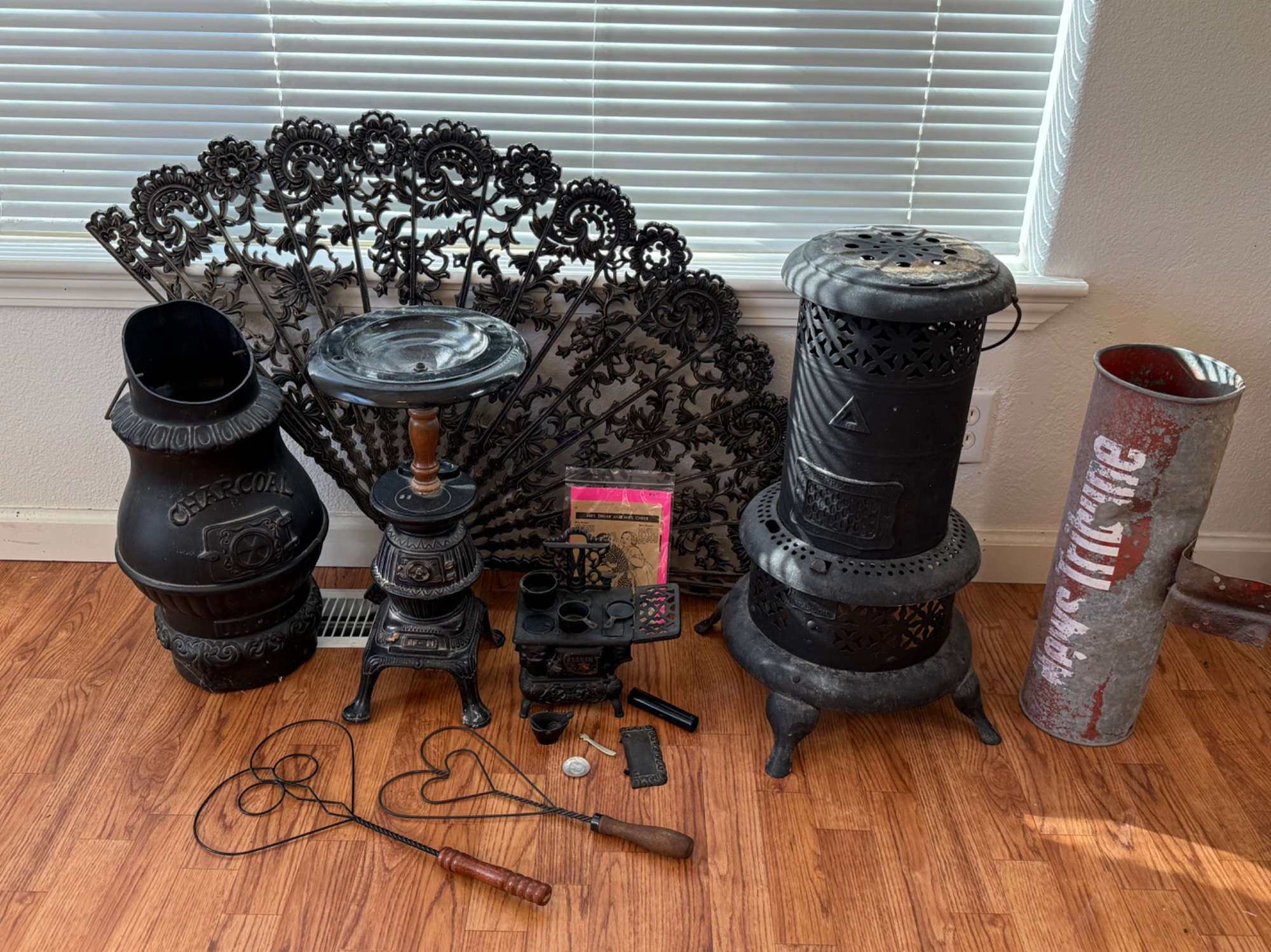 Black decor in vintage style. Plastic fireplace screen, ash bucket Metal newspaper box, wood stove ashtray, wood stove plant stand is 24in tall and merchandise model vintage cast-iron wood stove Rug swatters and accessories for small scale cast-iron wood stove.