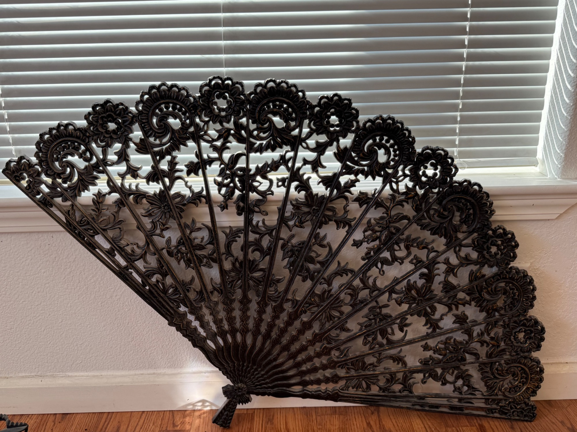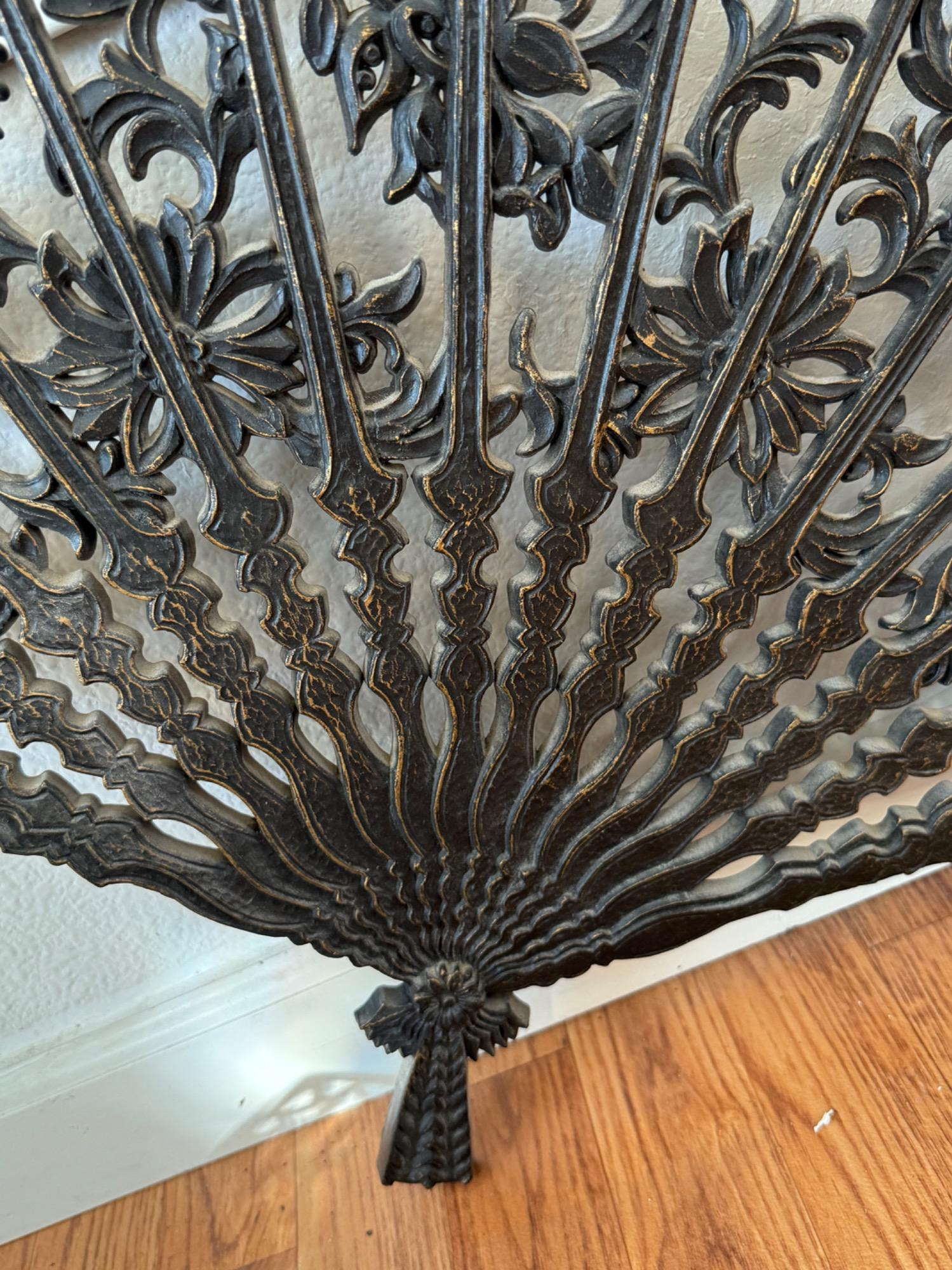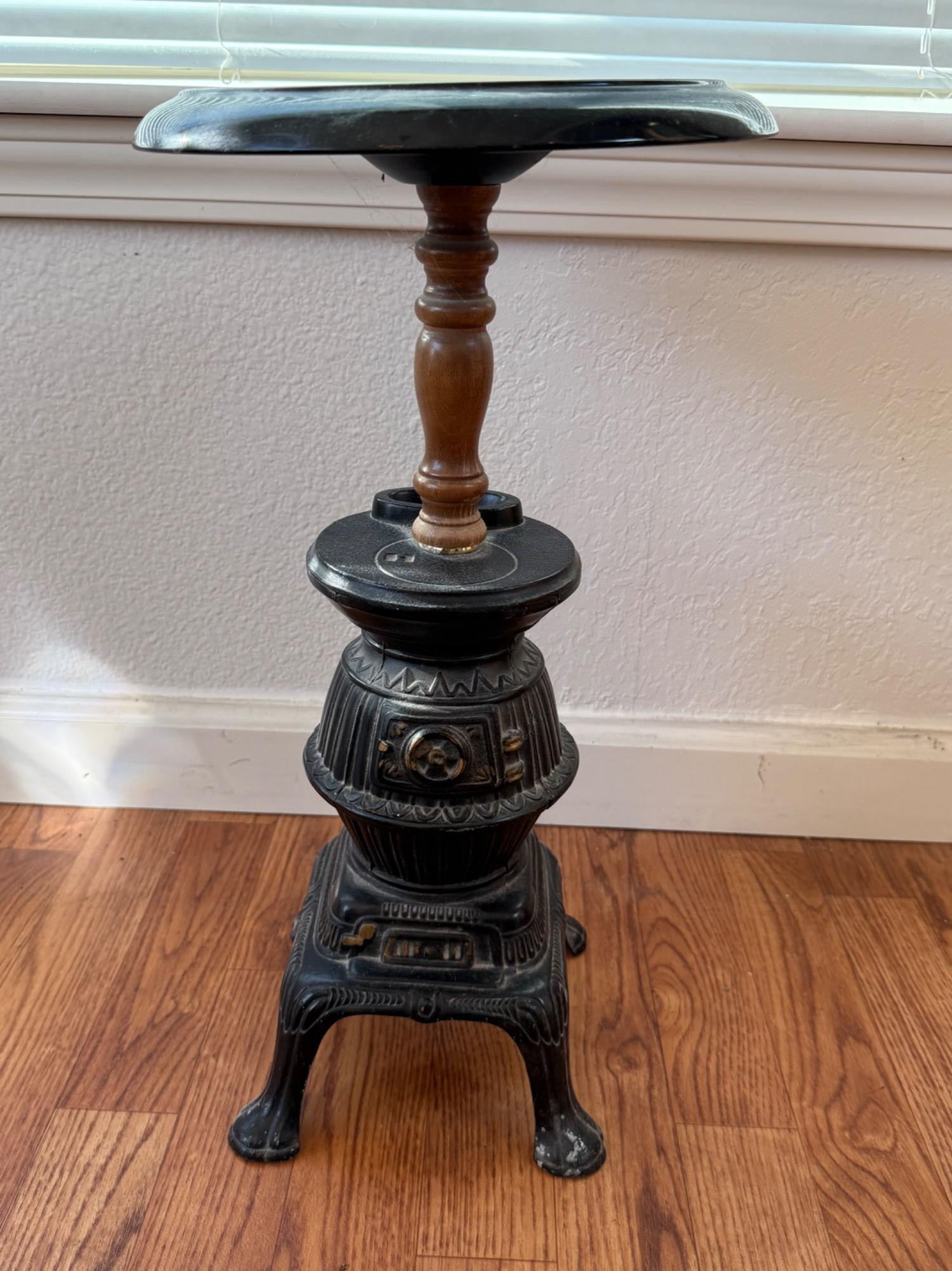 Black decor in vintage style. Plastic fireplace screen, ash bucket Metal newspaper box, wood stove ashtray, wood stove plant stand is 24in tall and merchandise model vintage cast-iron wood stove Rug swatters and accessories for small scale cast-iron wood stove.