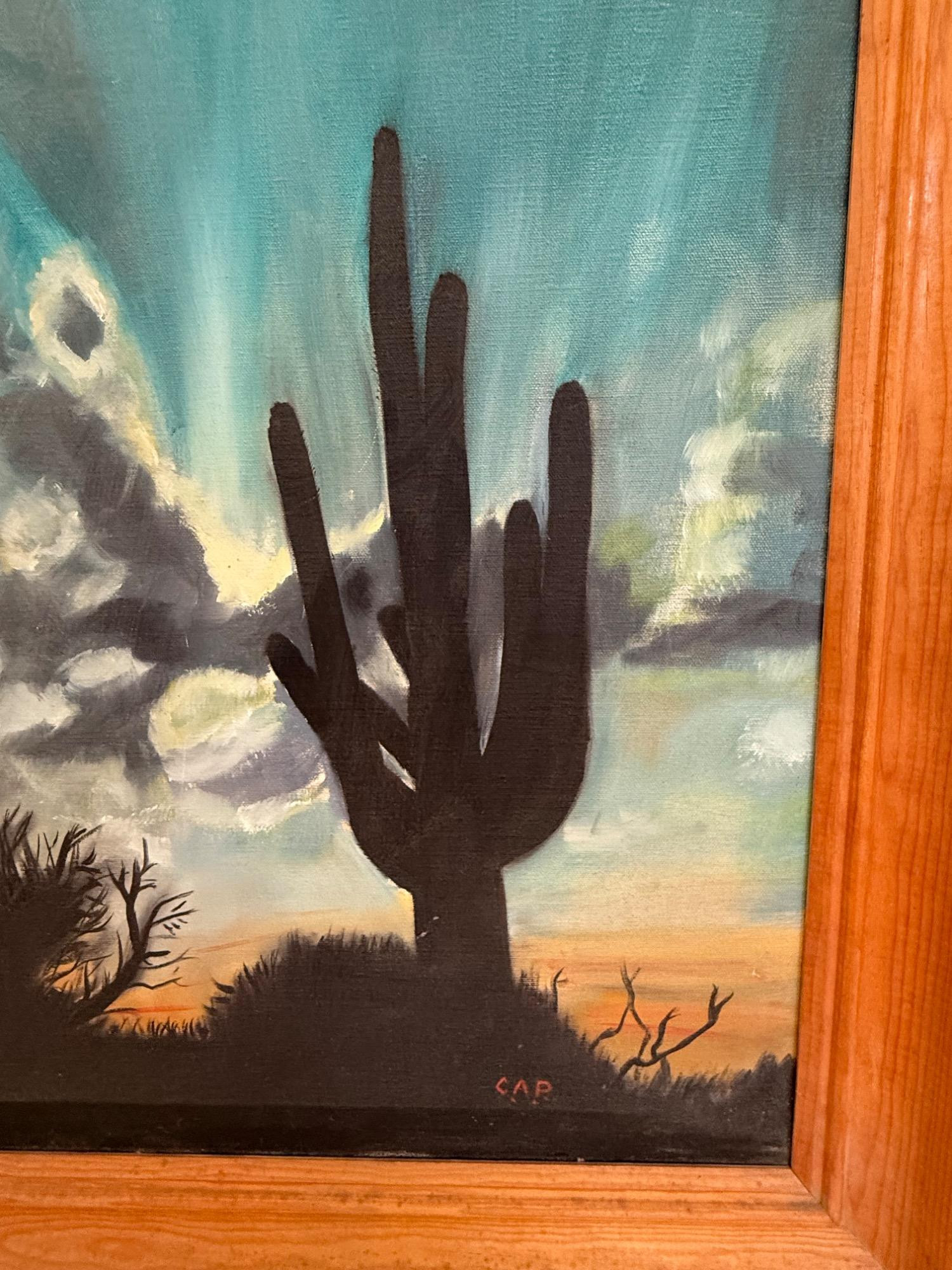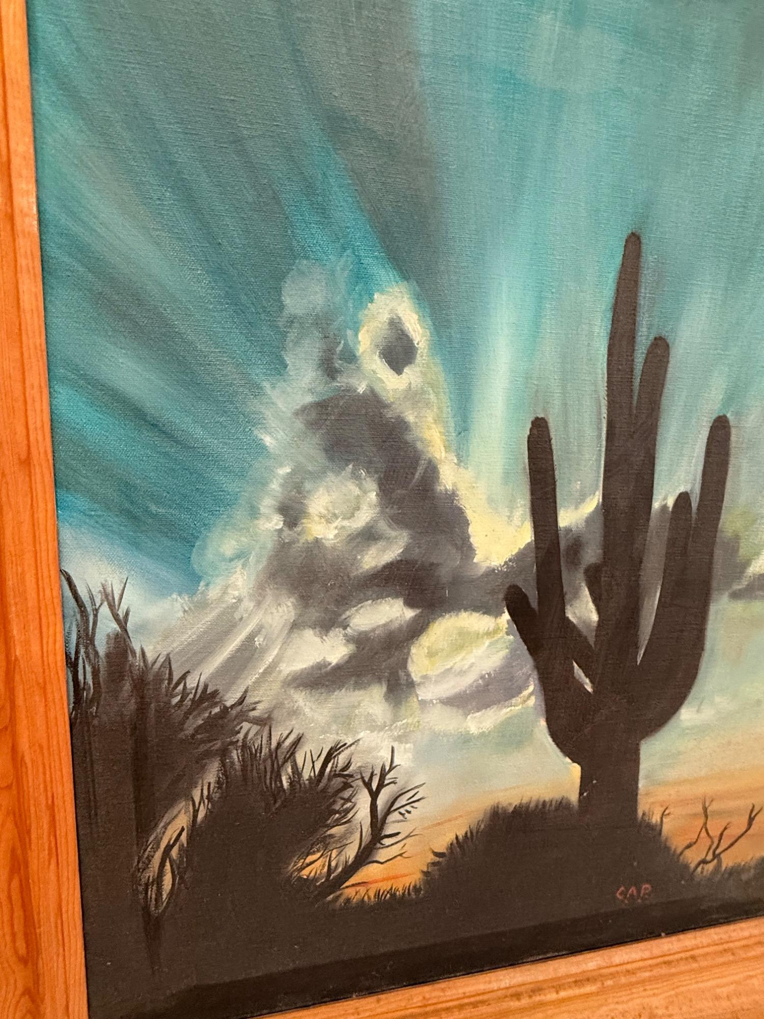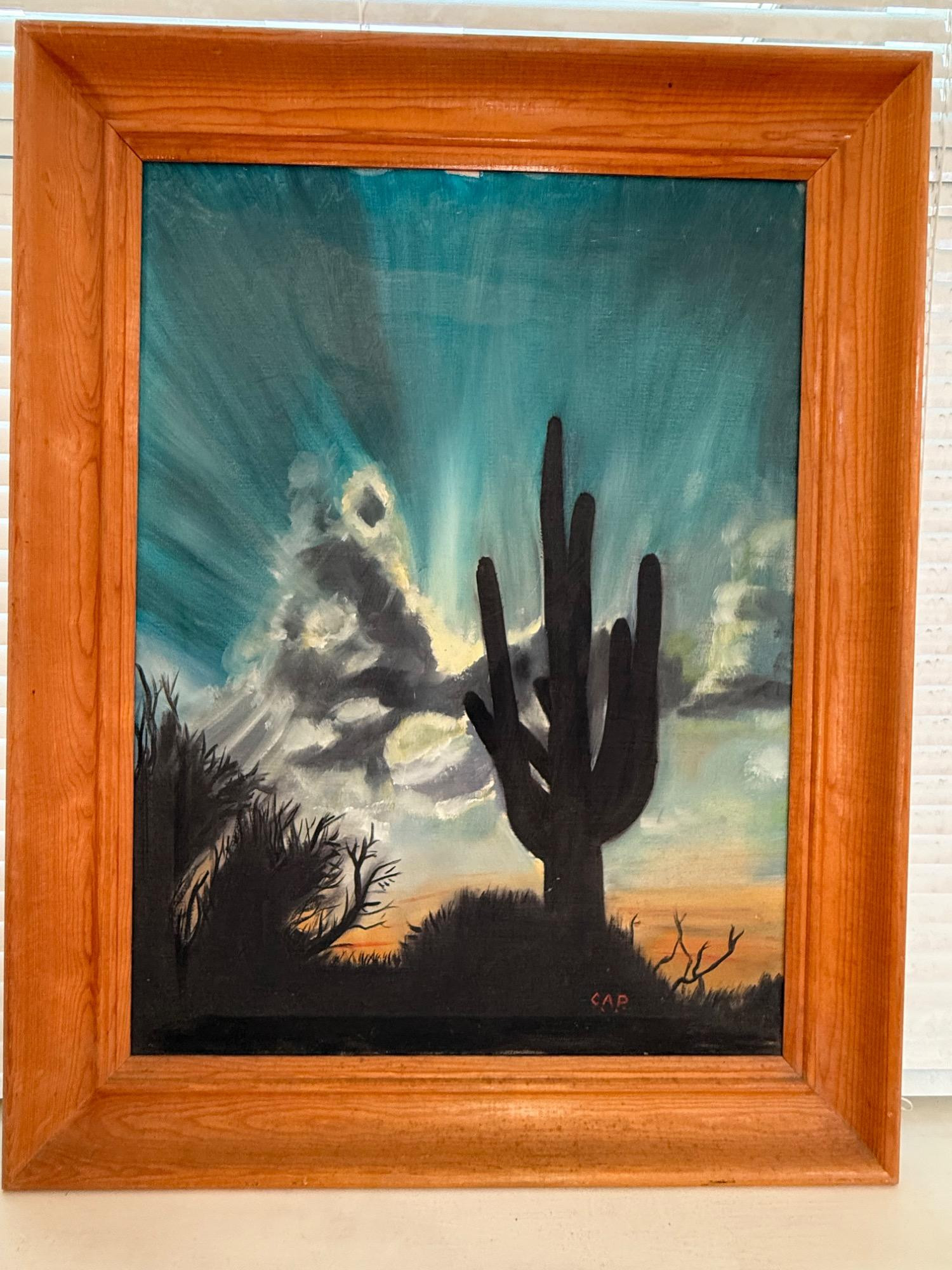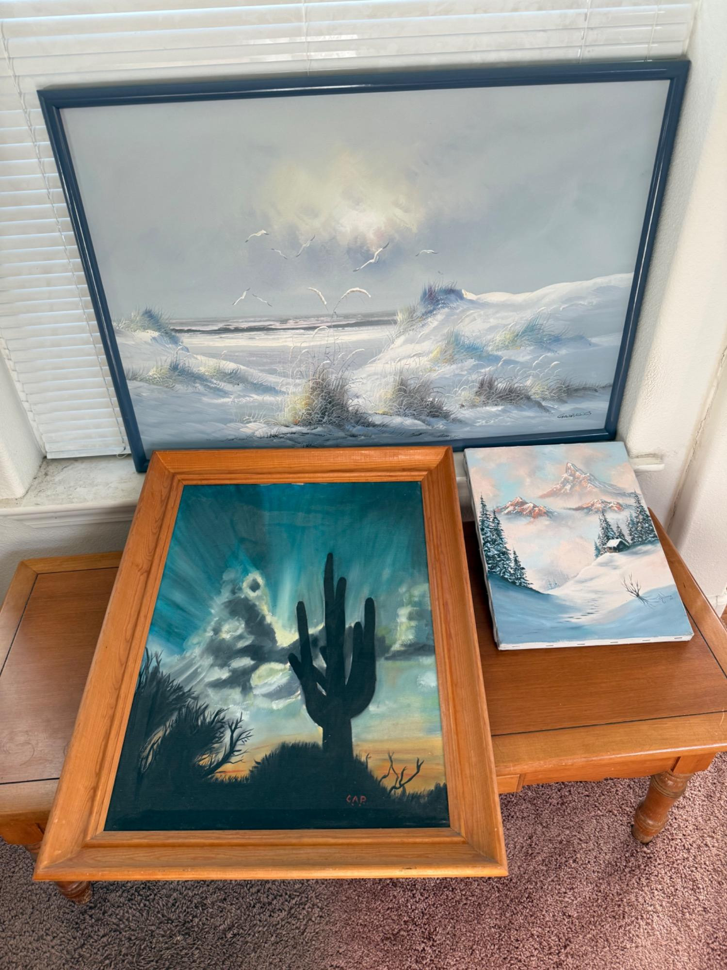 Sea, mountain, Desert all in one collection. Seascape is by Goldberg. No glass in frame. 26in tall, 37.5in long. "Nightfall" desert painting is by Claude Phillips. No Glass in frame Mountain scene is not framed and created by M. Jones