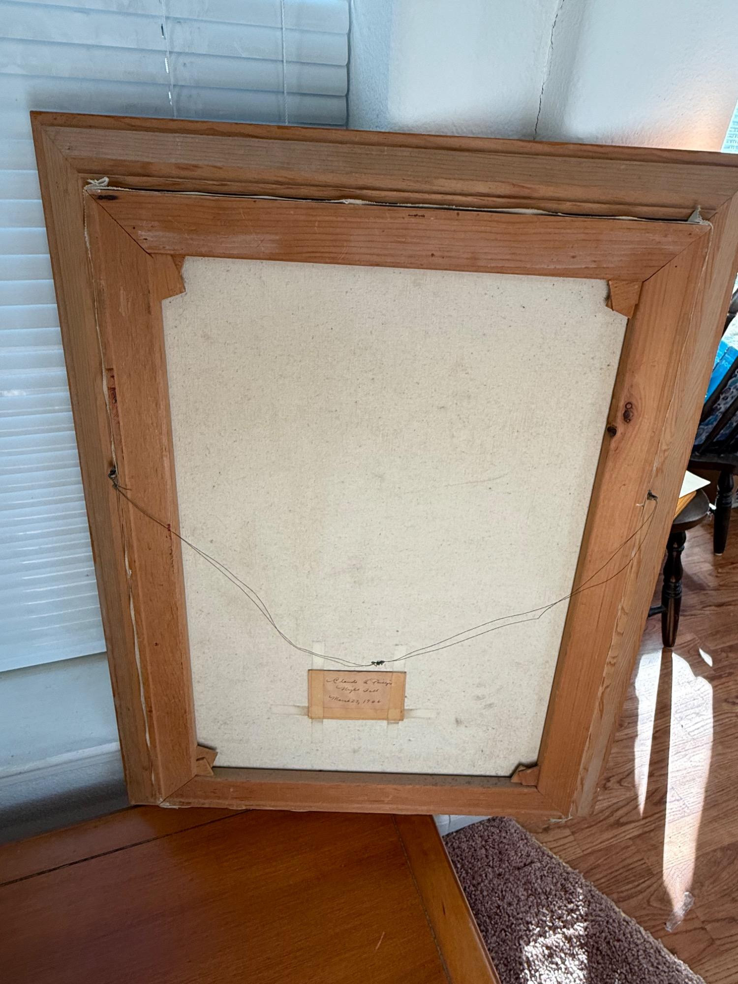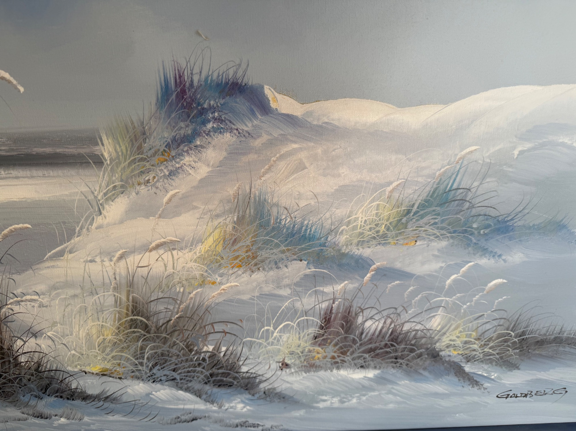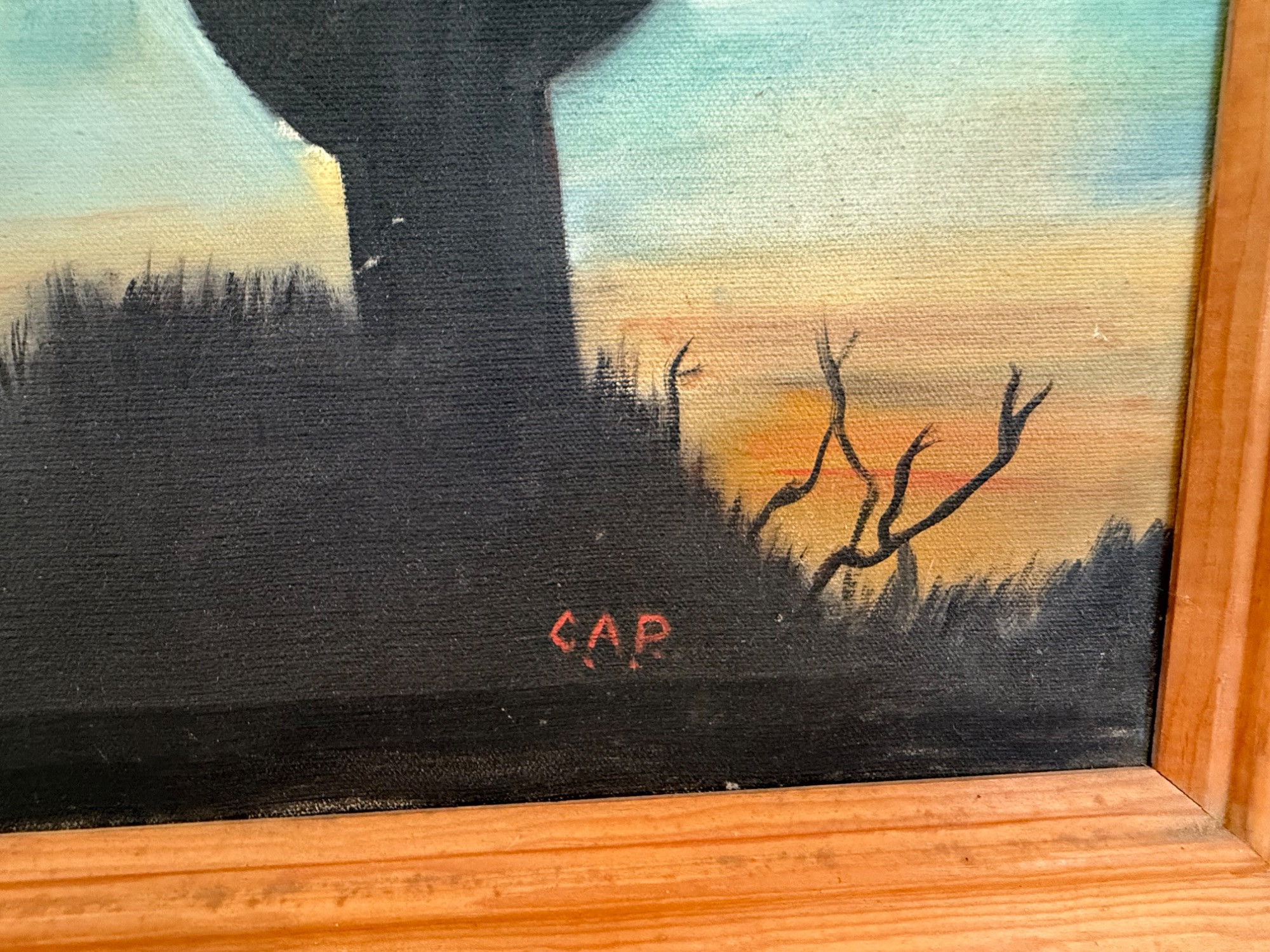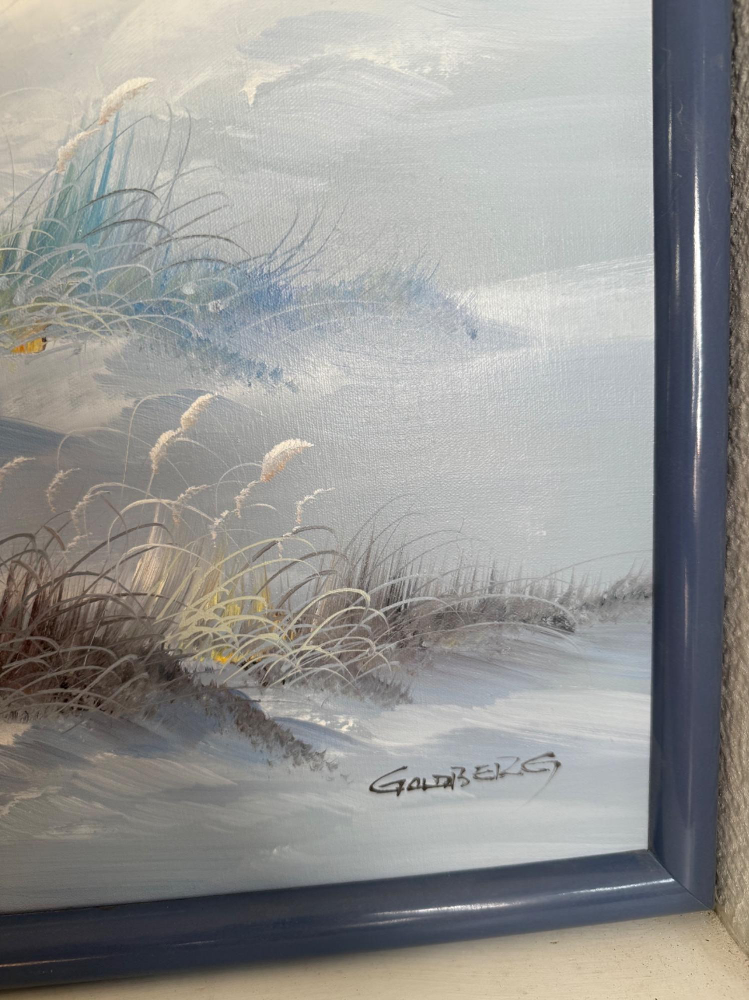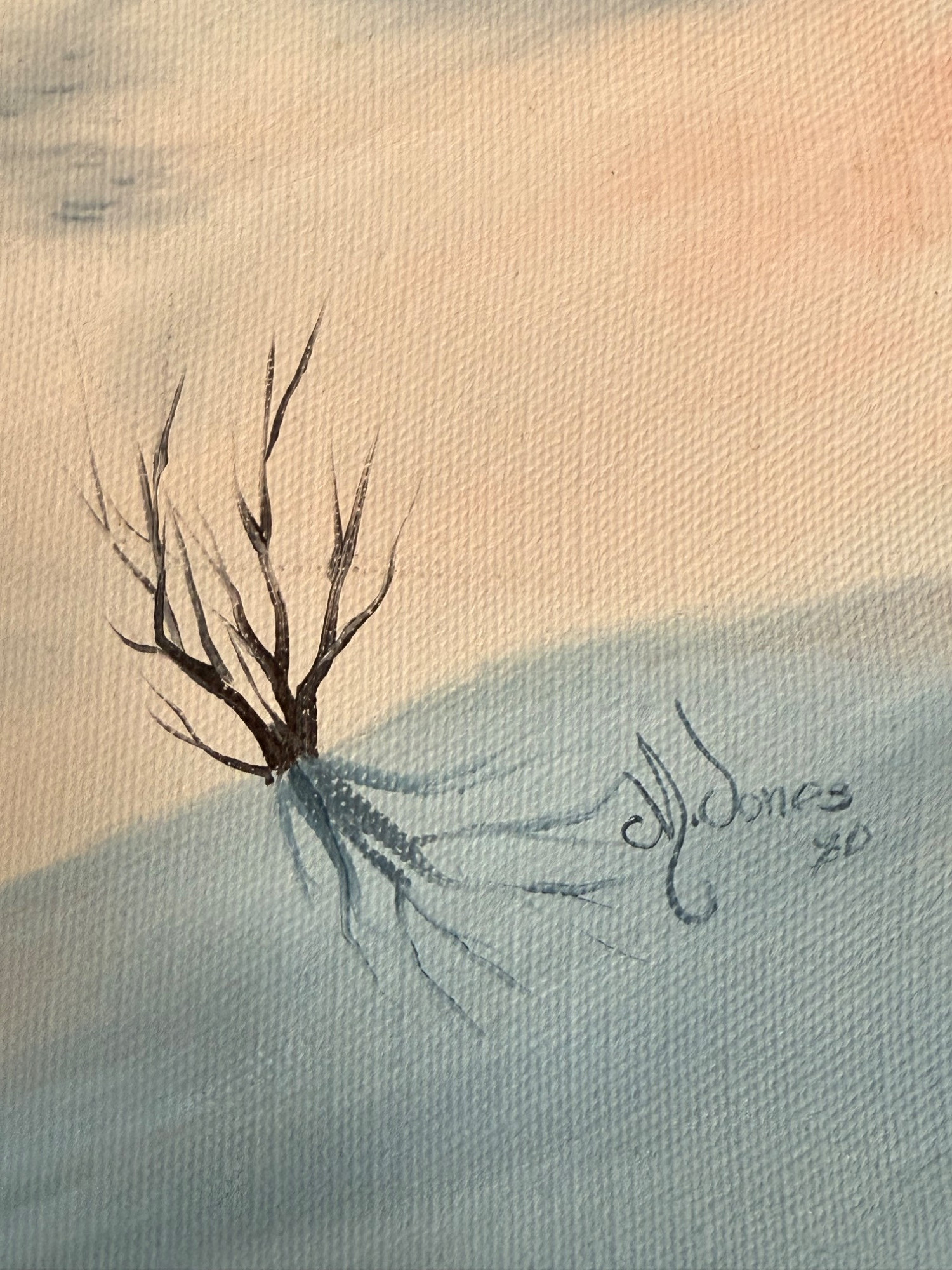 Sea, mountain, Desert all in one collection. Seascape is by Goldberg. No glass in frame. 26in tall, 37.5in long. "Nightfall" desert painting is by Claude Phillips. No Glass in frame Mountain scene is not framed and created by M. Jones