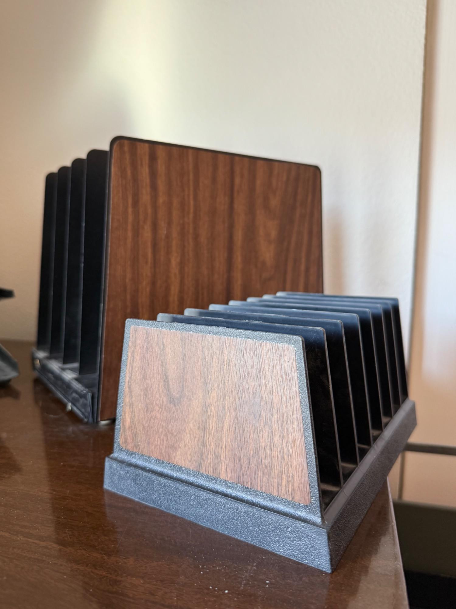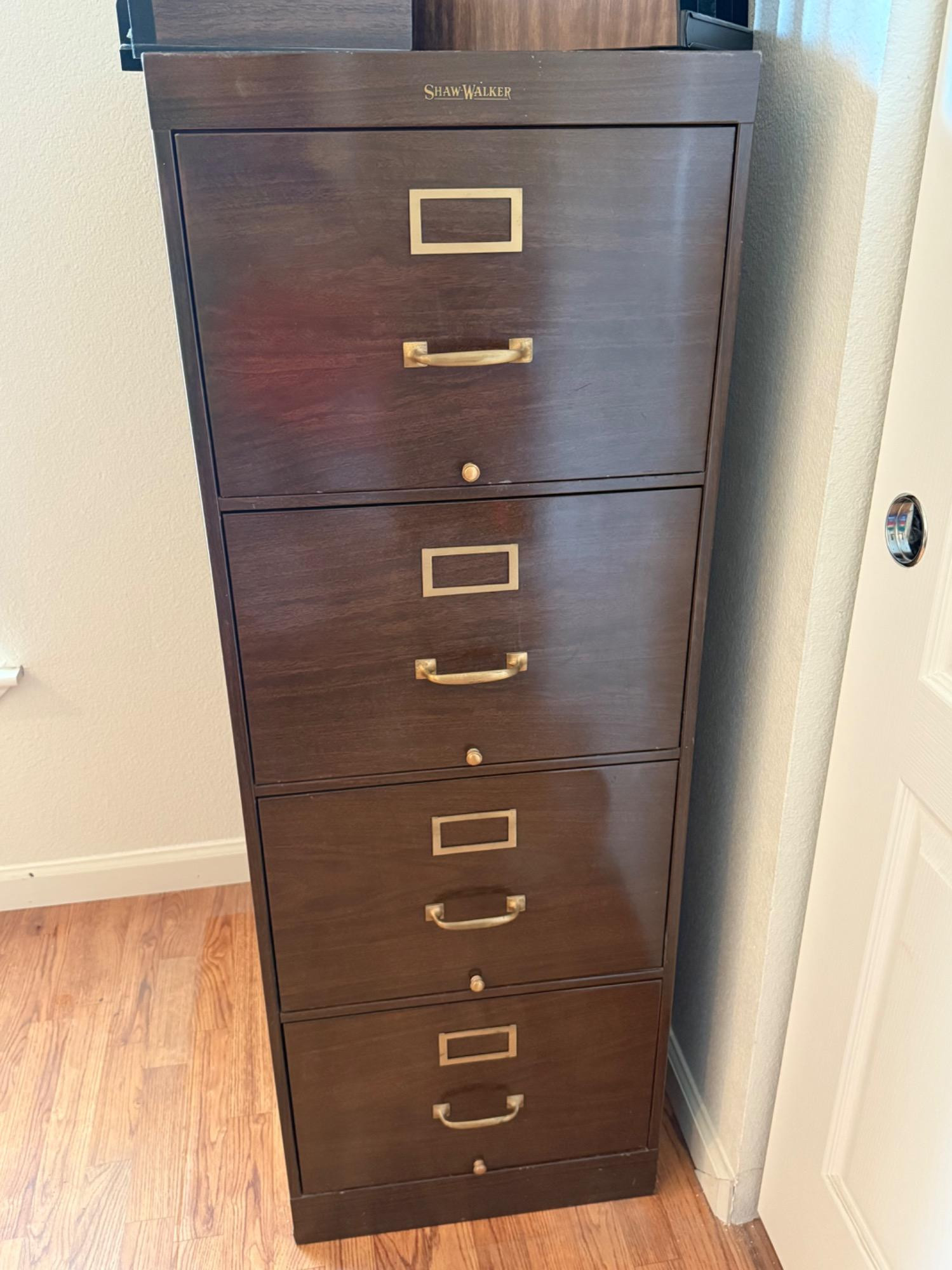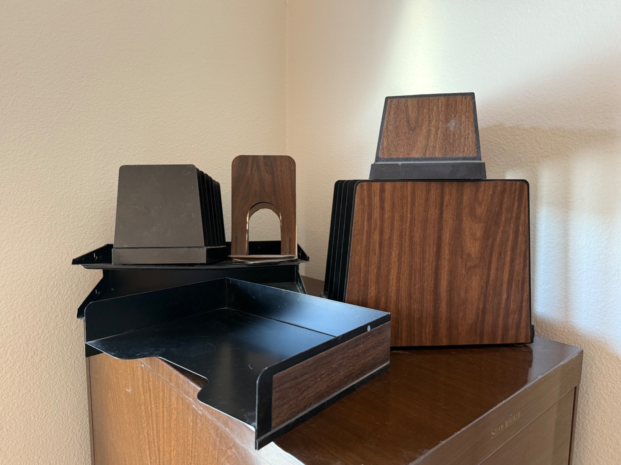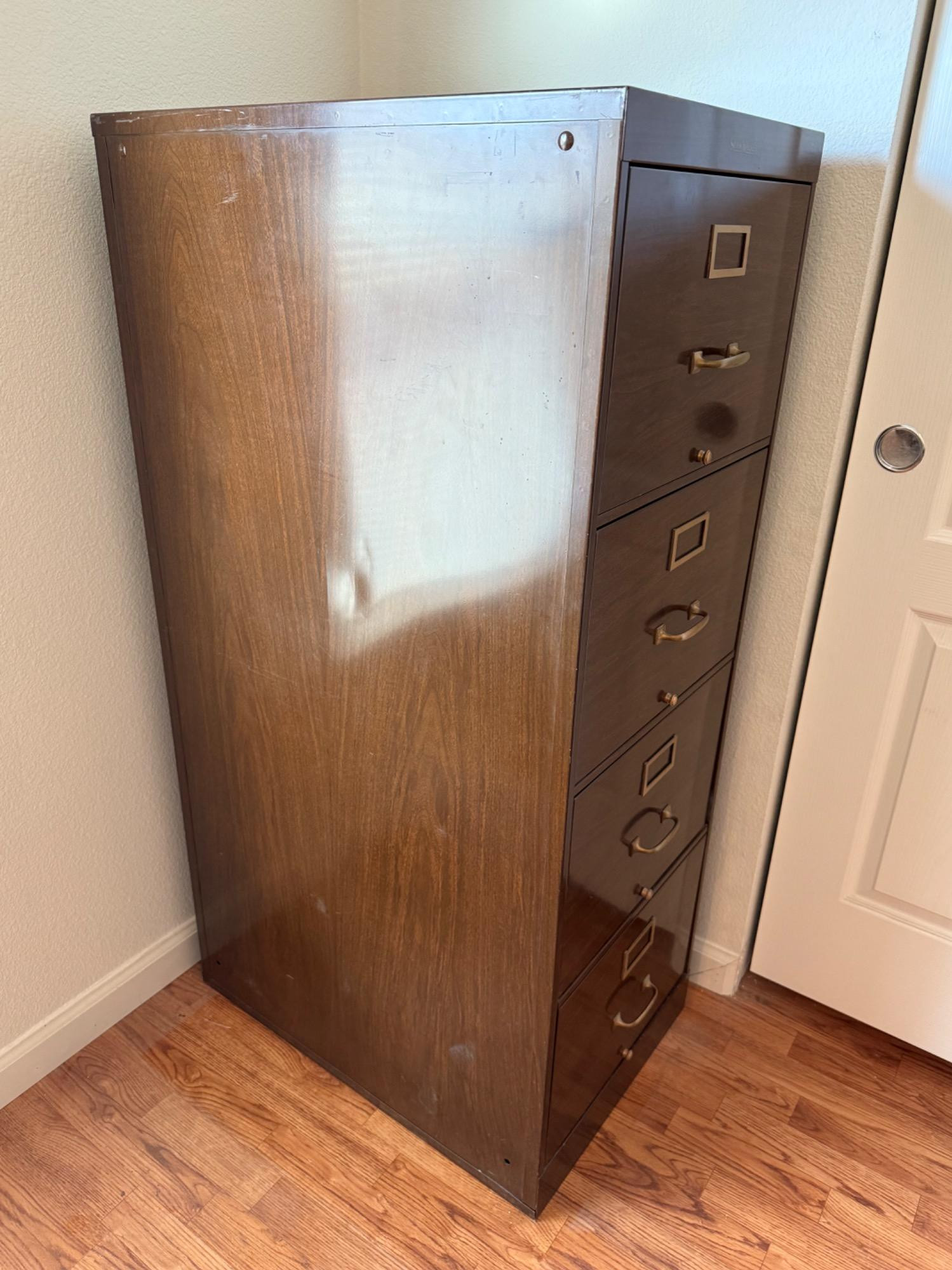 Vintage wood grain file cabinet. All metal. Brass detail Several matching wood grain desk organizers. Black and brown metal organizers. Heavy, bring help to load.