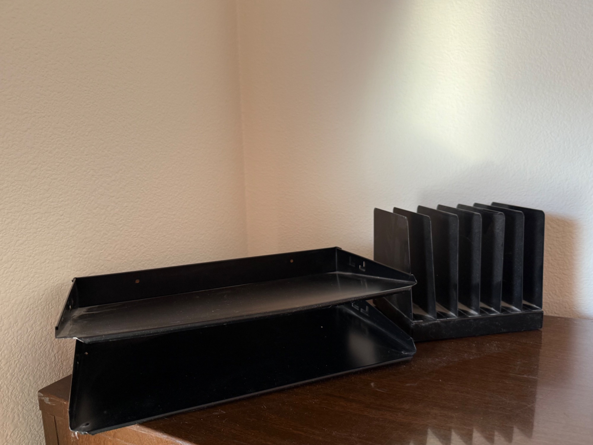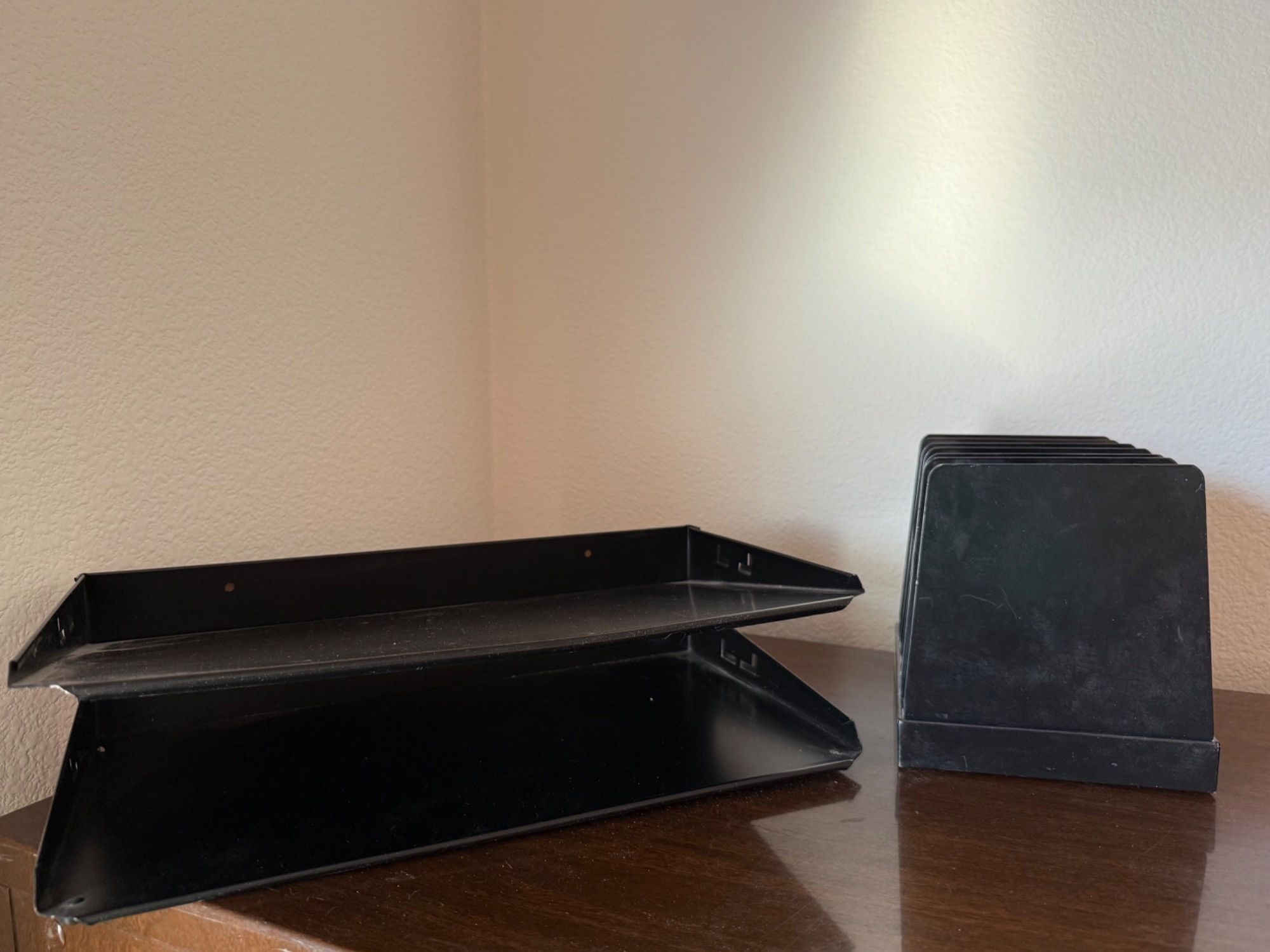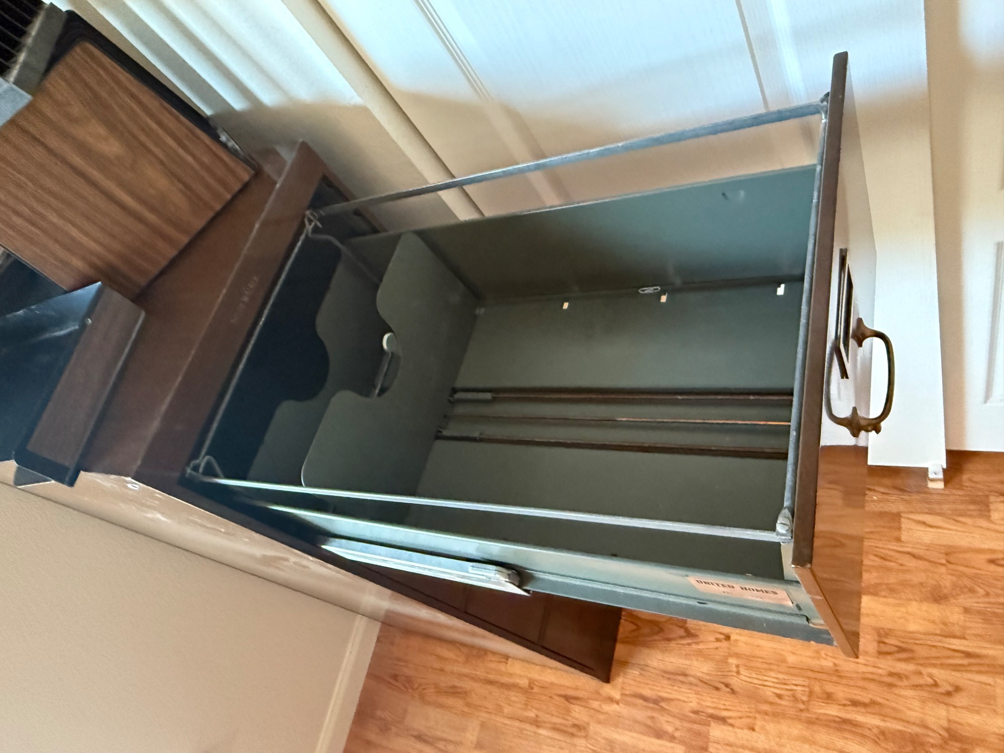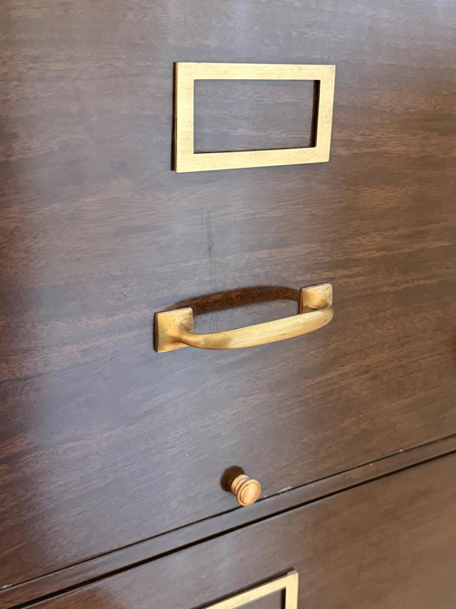 Vintage wood grain file cabinet. All metal. Brass detail Several matching wood grain desk organizers. Black and brown metal organizers. Heavy, bring help to load.