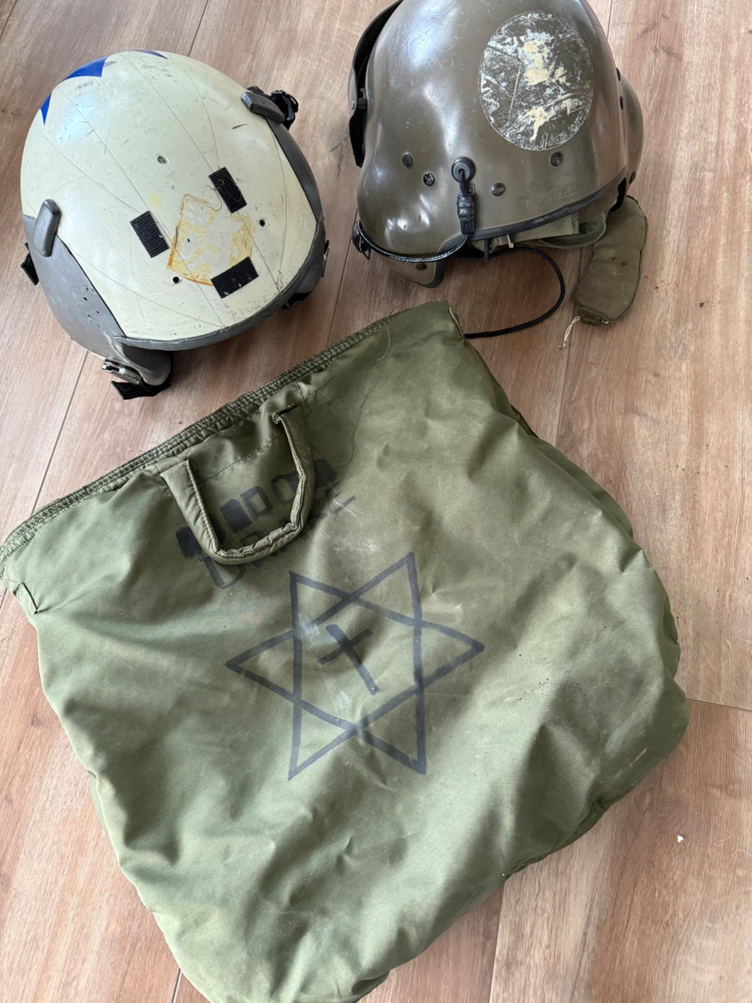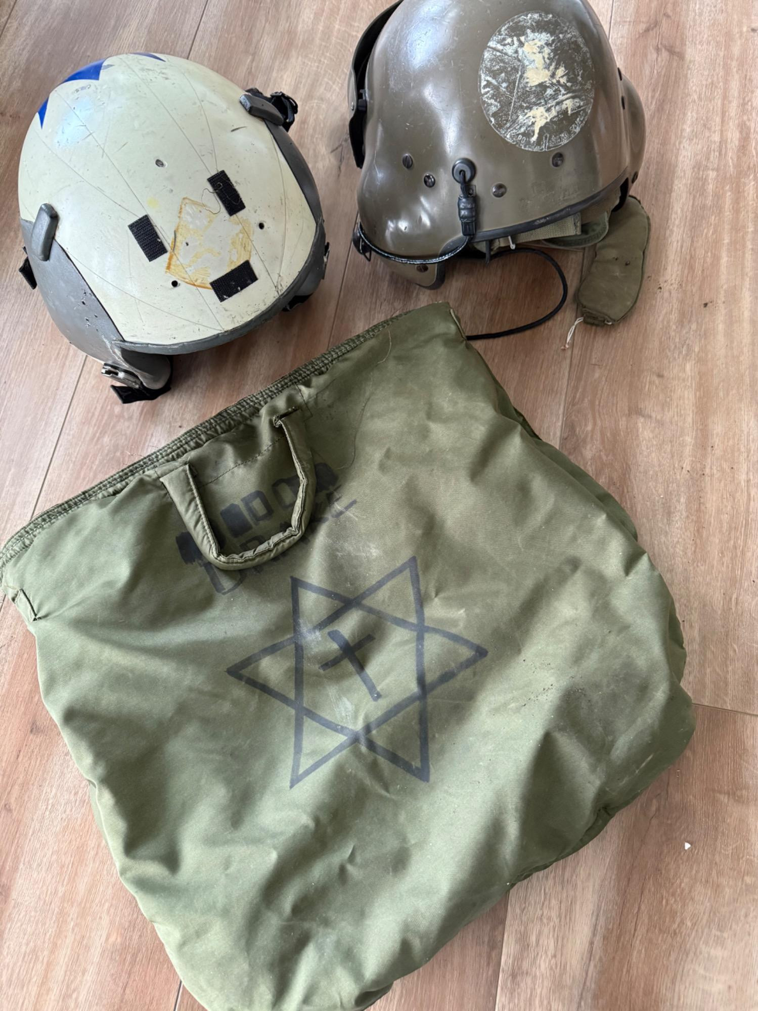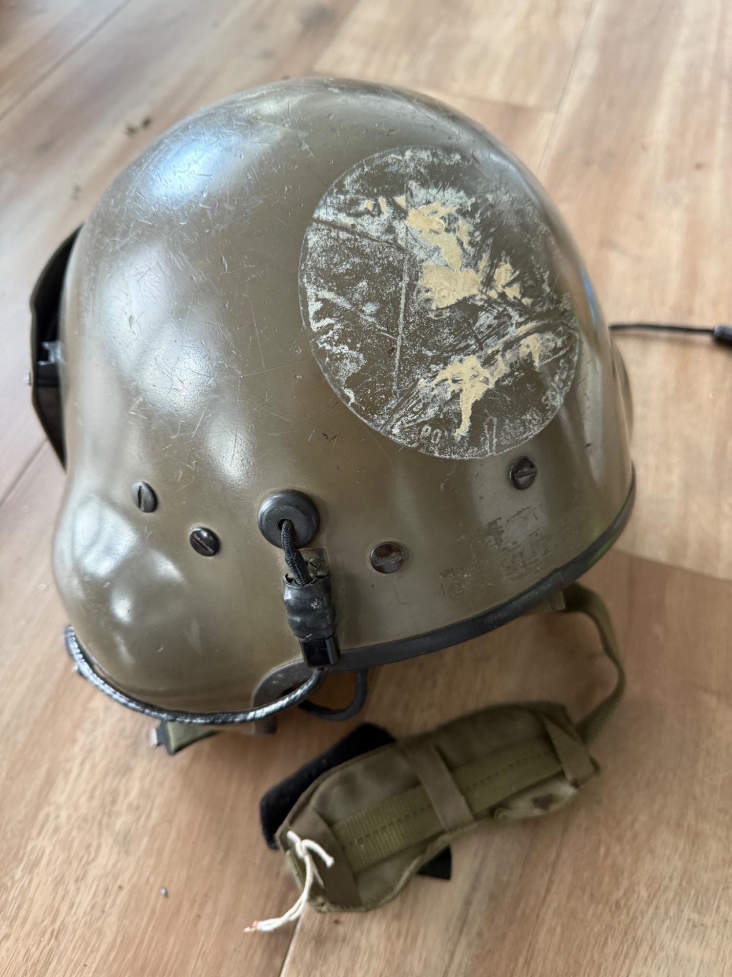 Two vintage military aviator helmets. Flight bag included. HGU-55 model Jet helmet has Poseidon's trident decal and snap-on goggles. Vietnam era SPH4 helicopter helmet with audio gear cap insert. Also has throat mic and goggles. Both helmets were used by US Forces and indicate some wear and tear.