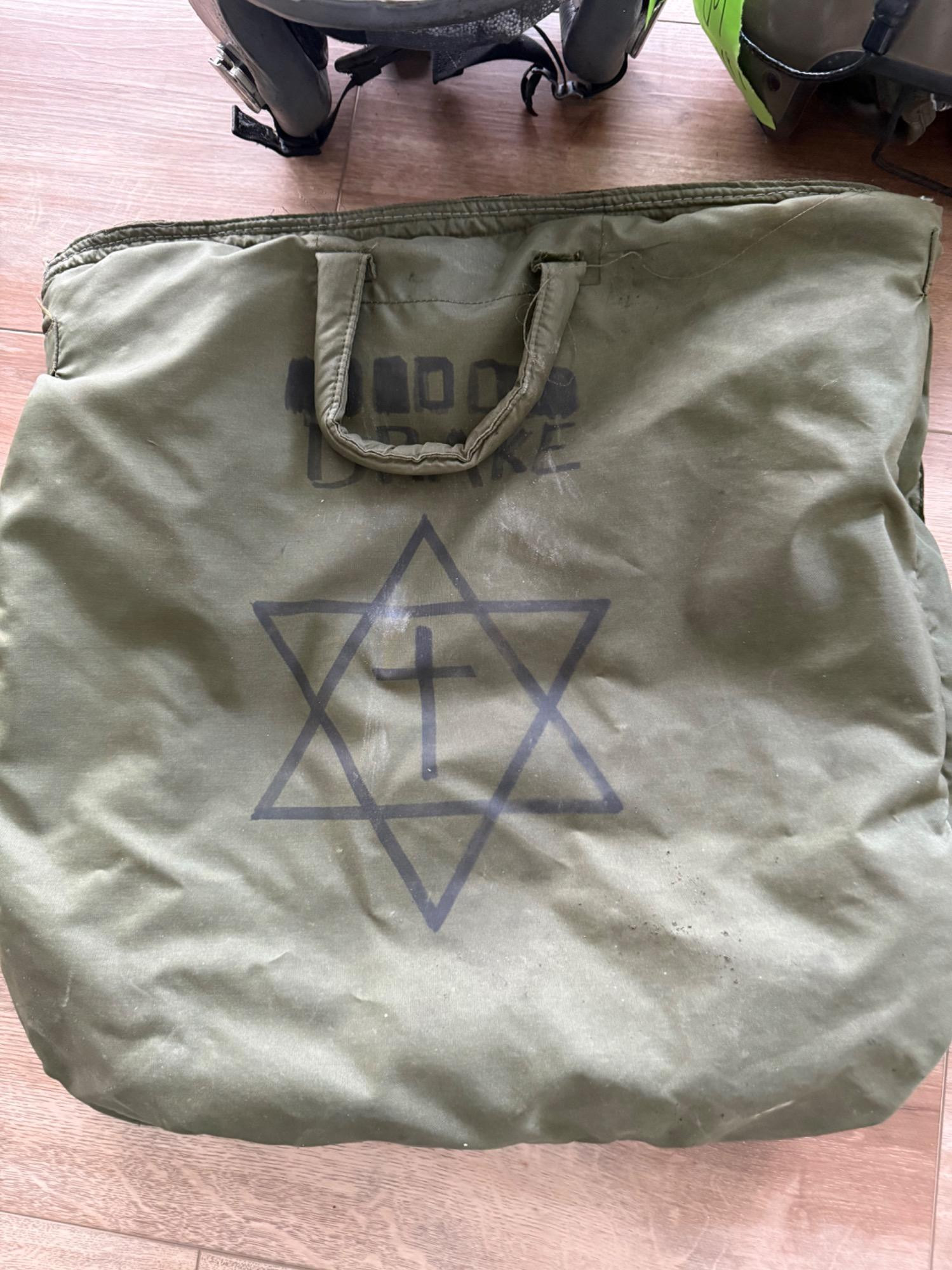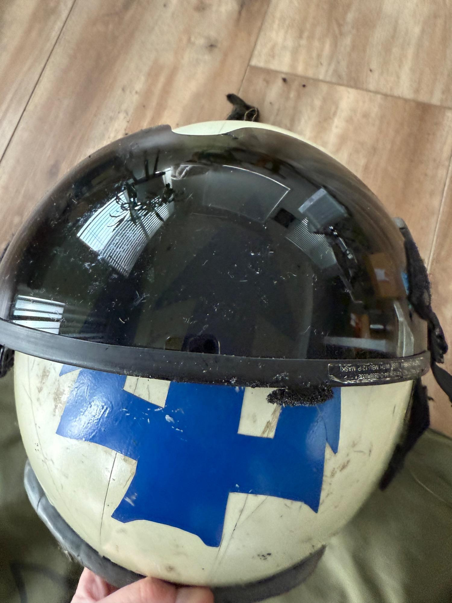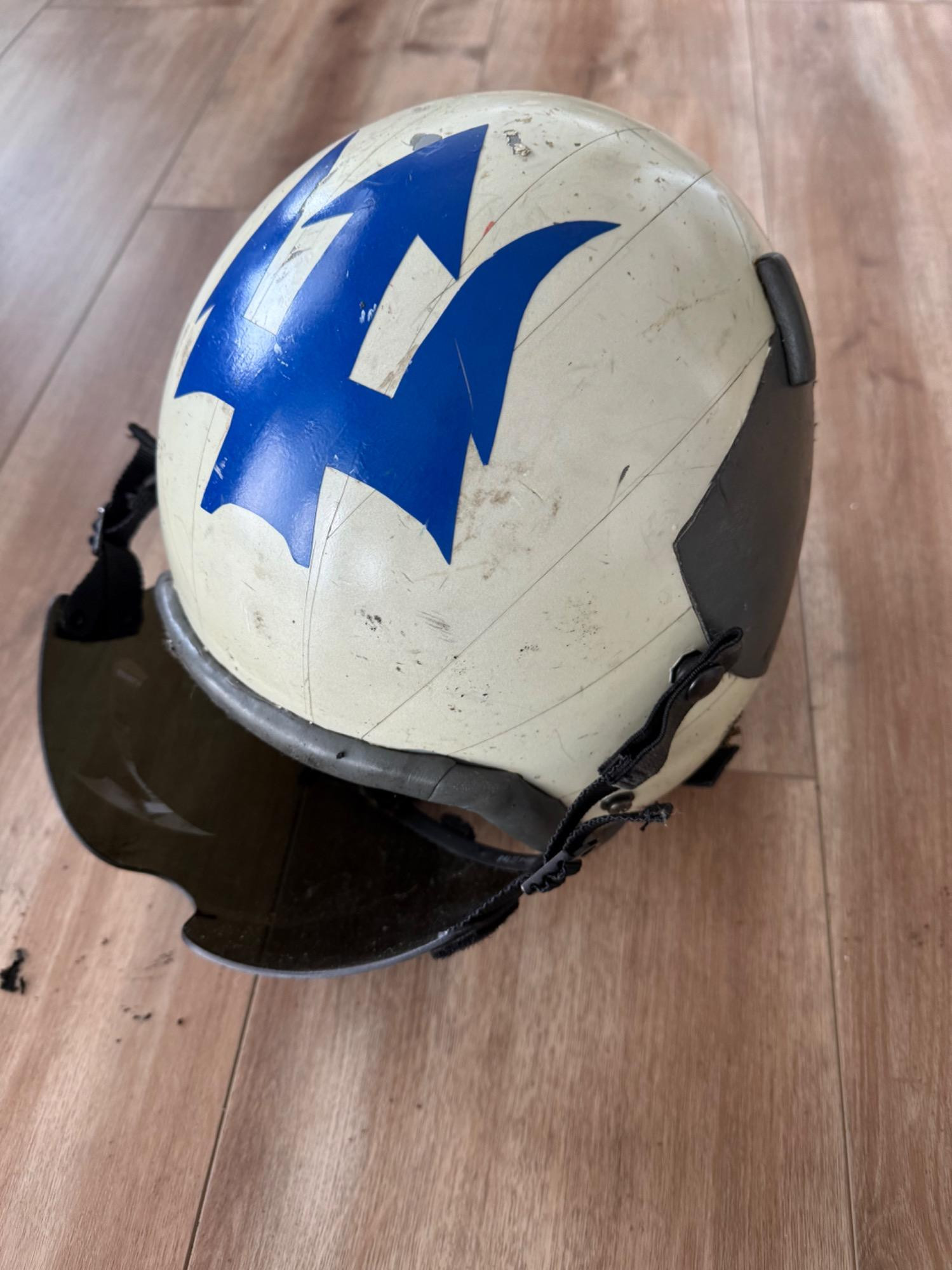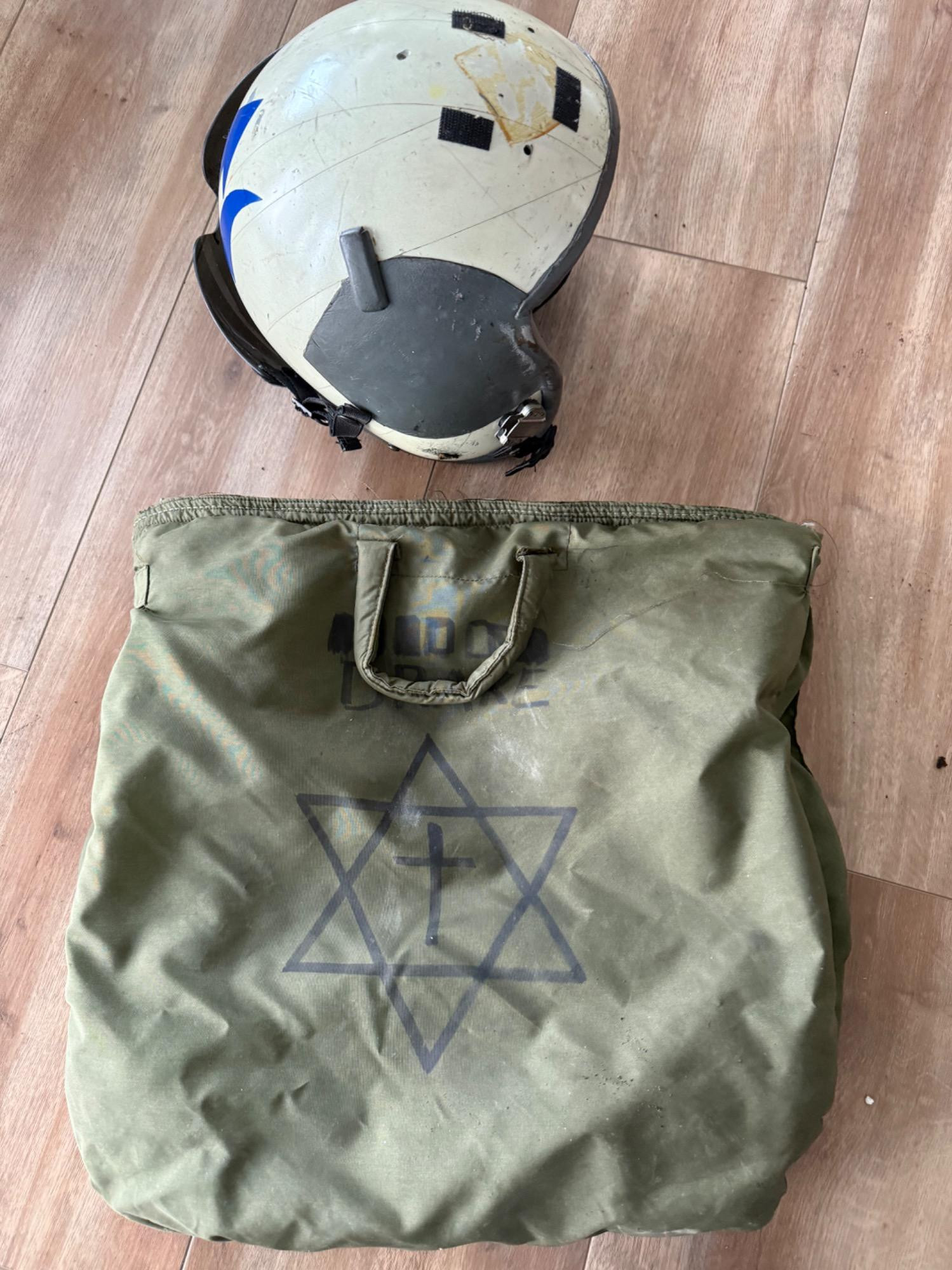 Two vintage military aviator helmets. Flight bag included. HGU-55 model Jet helmet has Poseidon's trident decal and snap-on goggles. Vietnam era SPH4 helicopter helmet with audio gear cap insert. Also has throat mic and goggles. Both helmets were used by US Forces and indicate some wear and tear.
