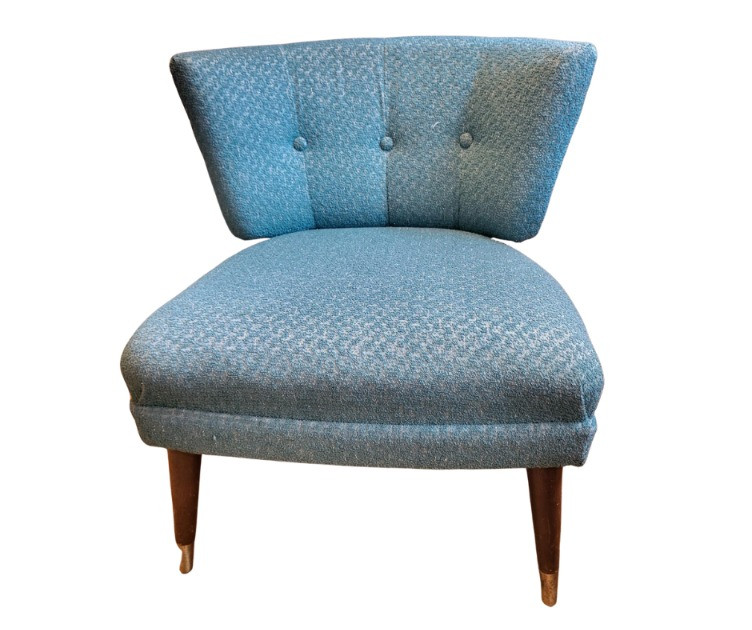 Vintage Koehler chair with a distinctive mid-century modern design. The chair is upholstered in a textured blue fabric, which adds a touch of elegance and retro charm. The backrest is slightly flared and adorned with three buttons, creating a tufted appearance. The seat is wide and cushioned, providing comfort. The chair stands on four tapered wooden legs, which are characteristic of mid-century furniture design. This piece is interesting and relevant for those who appreciate vintage furniture and mid-century modern aesthetics. Seat is 25" wide x 20" deep; 16.5" seat height Overall measures: