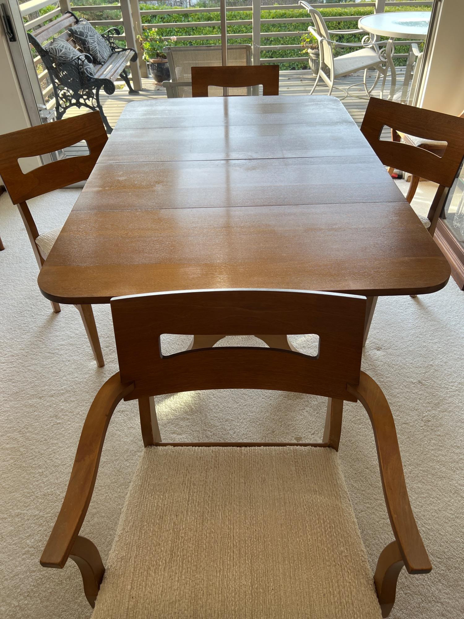 Vintage mid-century modern dining table with drop down ends and hidden leaf underside of table. Leaf is 13 inches wide expanding table to a total of 73.5 inches long. Table legs have brass feet. Several configurations for this table allowing for a variety of purposes and use. Three chairs - 31 inches tall x 18 inches wide x 16 inches deep seats One captain's chair - 31 inches tall x 18.5 inches wide x 16 inches deep seat. Bidding on this lot is an agreement that: (1.) You will have 2 capable, able-bodied persons to lift and load at a minimum. (2.) You