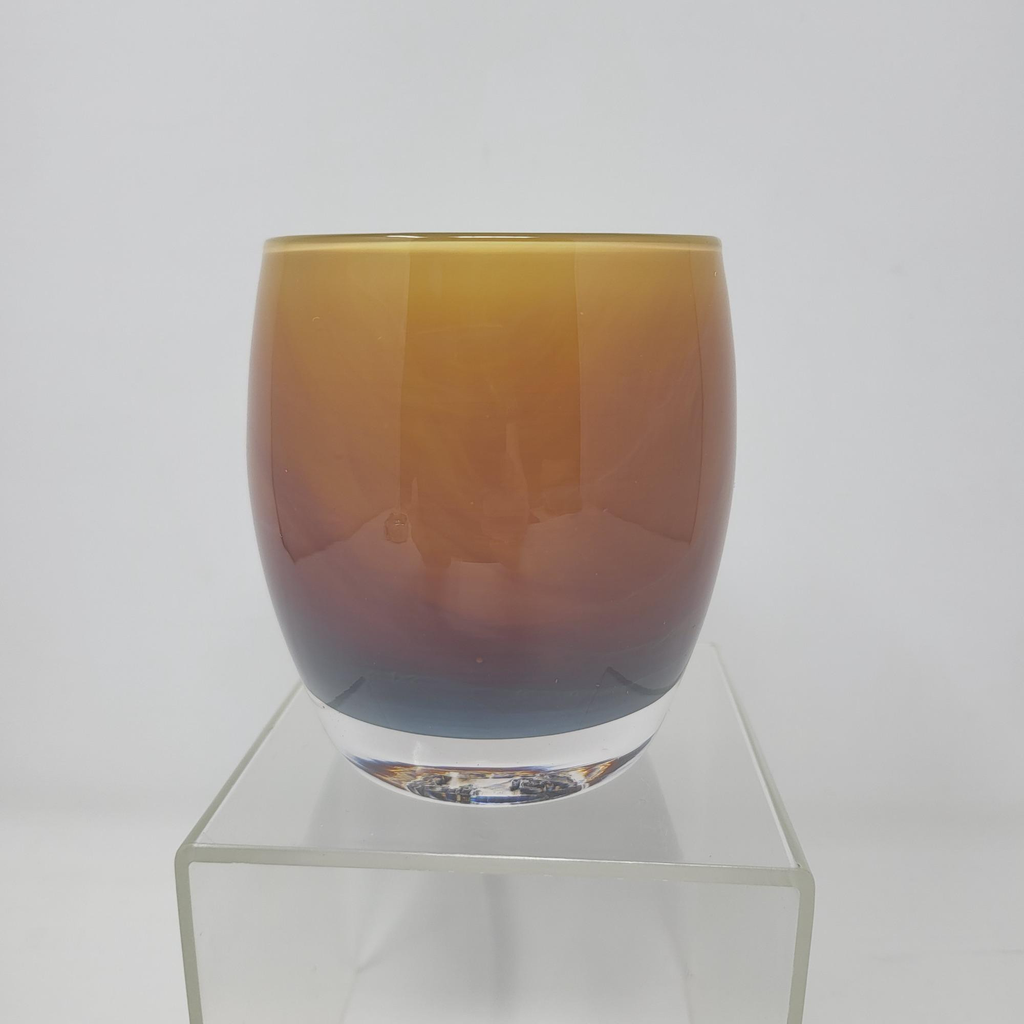 Nishino Glassybaby, specifically the "Janes Caramel" color. Hand-blown glass votive holder or drinker (small glasses). Glassybabies are known for their unique colors and the charitable mission of the company.
