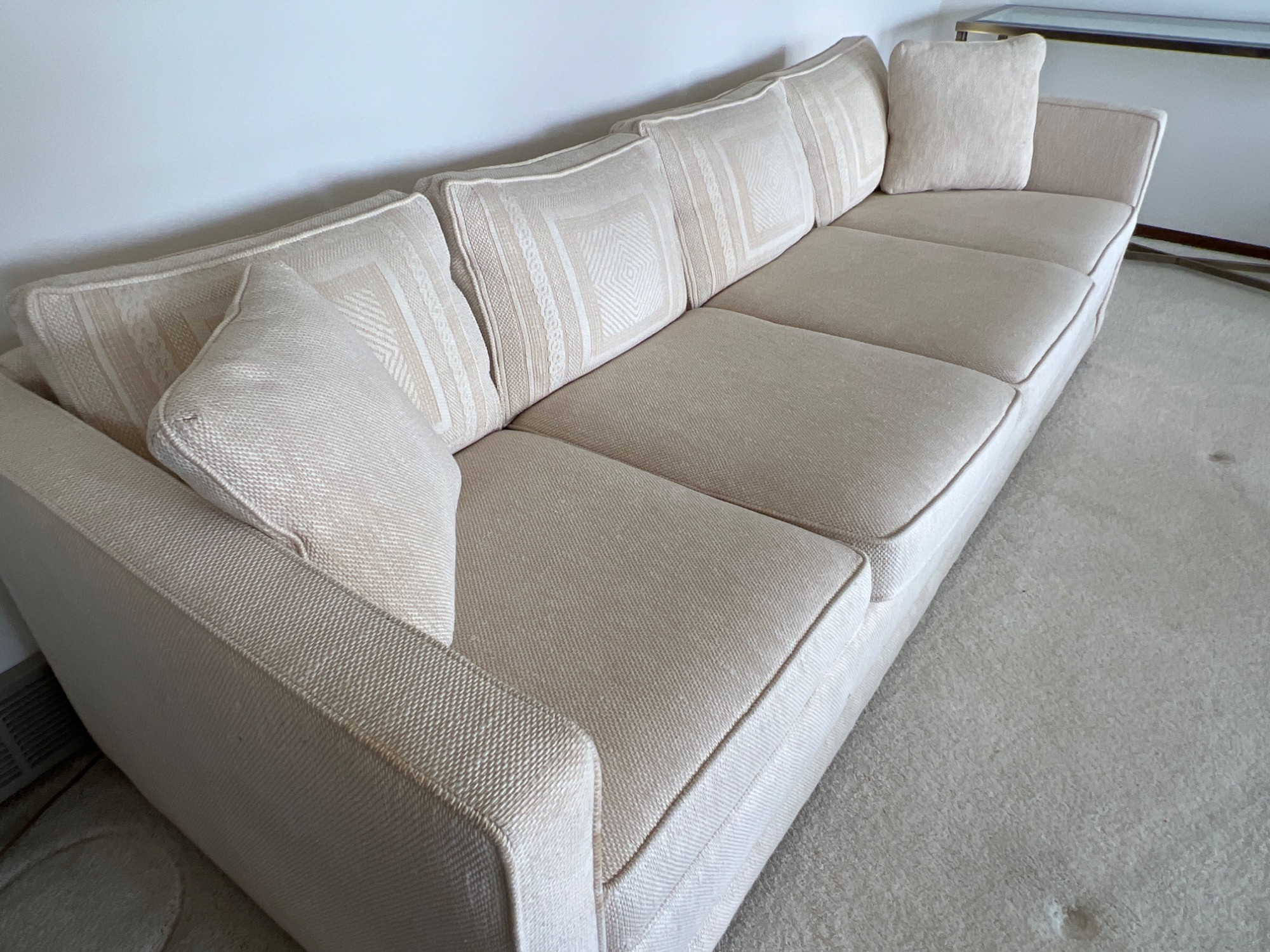 Four seat formal creamy white couch by Frederick and Nelson. Includes back cushions and side pillows. Dated mid century. Bidding on this lot is an agreement that: (1.) You will have 2 capable, able-bodied persons to lift and load at a minimum. (2.) You